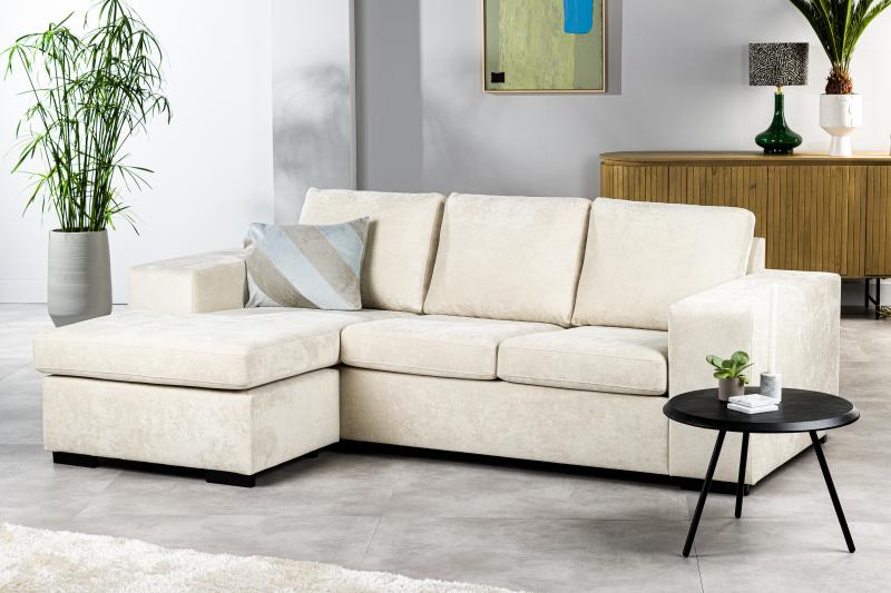 Ontdek de verfijnde elegantie van onze 3-zits bank met chaise longue, bekleed in de luxueuze stof Hotel Chique. Deze bank in warme beige tinten vormt het perfecte middelpunt voor uw woonkamer en biedt een uitnodigende sfeer die stijl en comfort moeiteloos combineert.