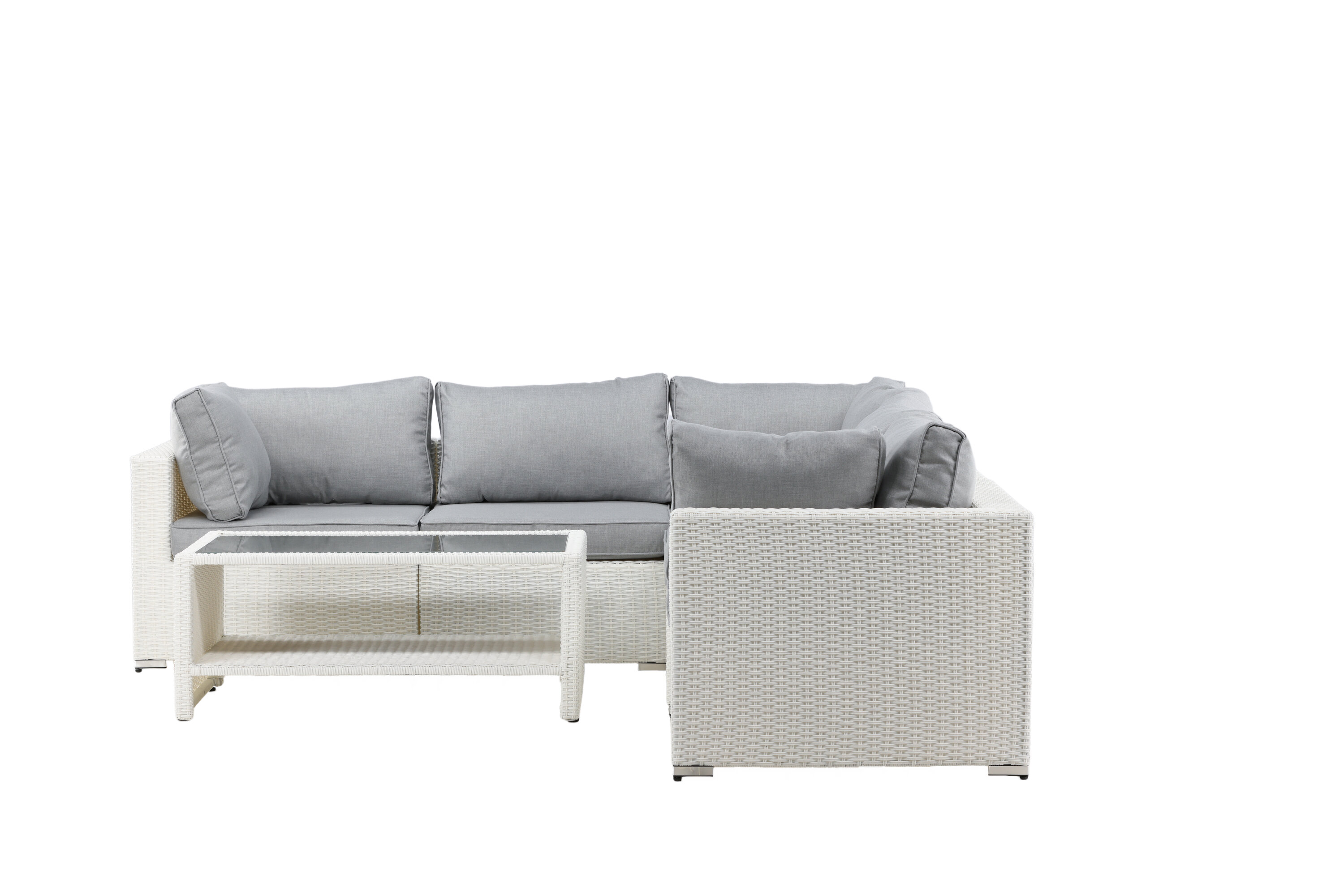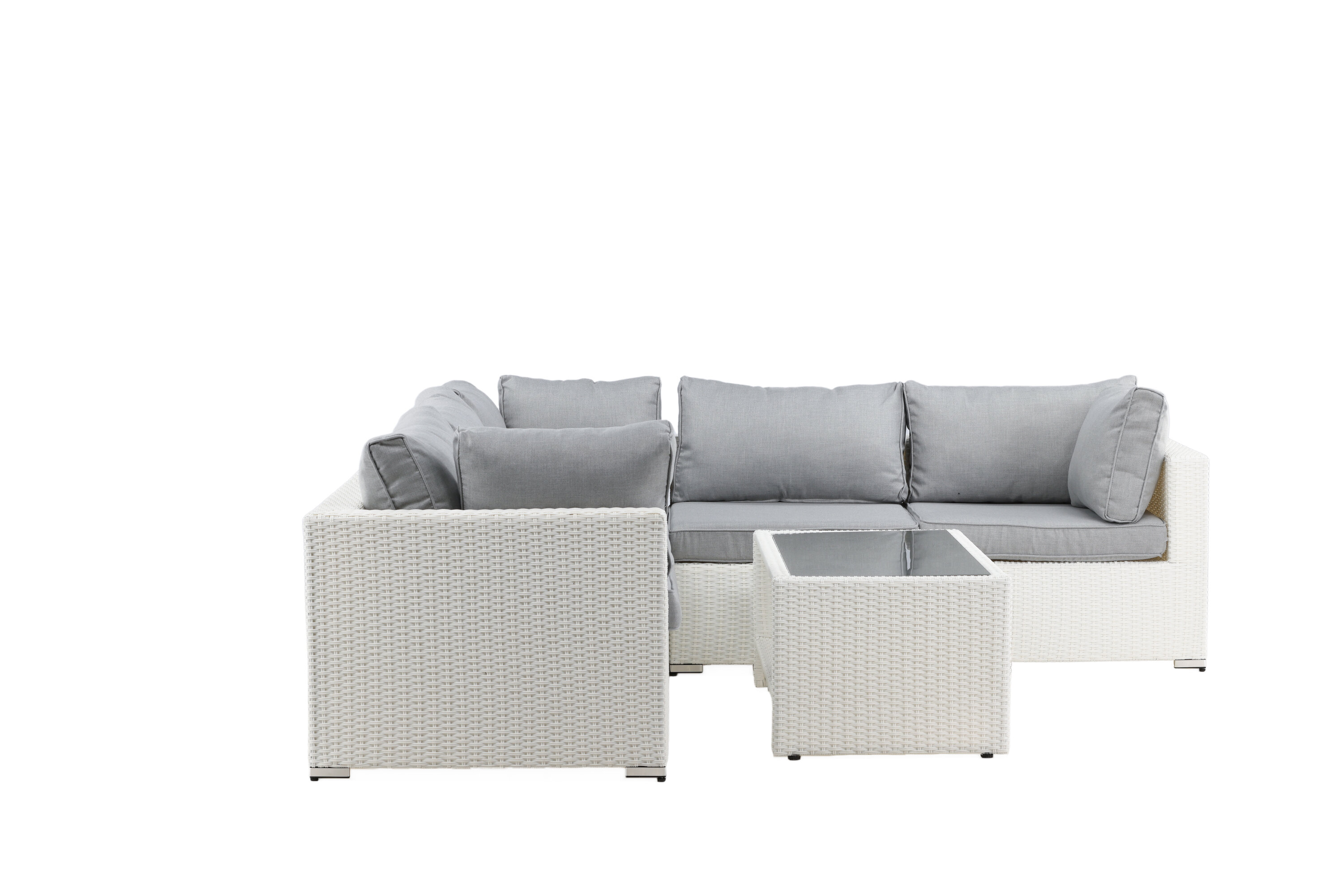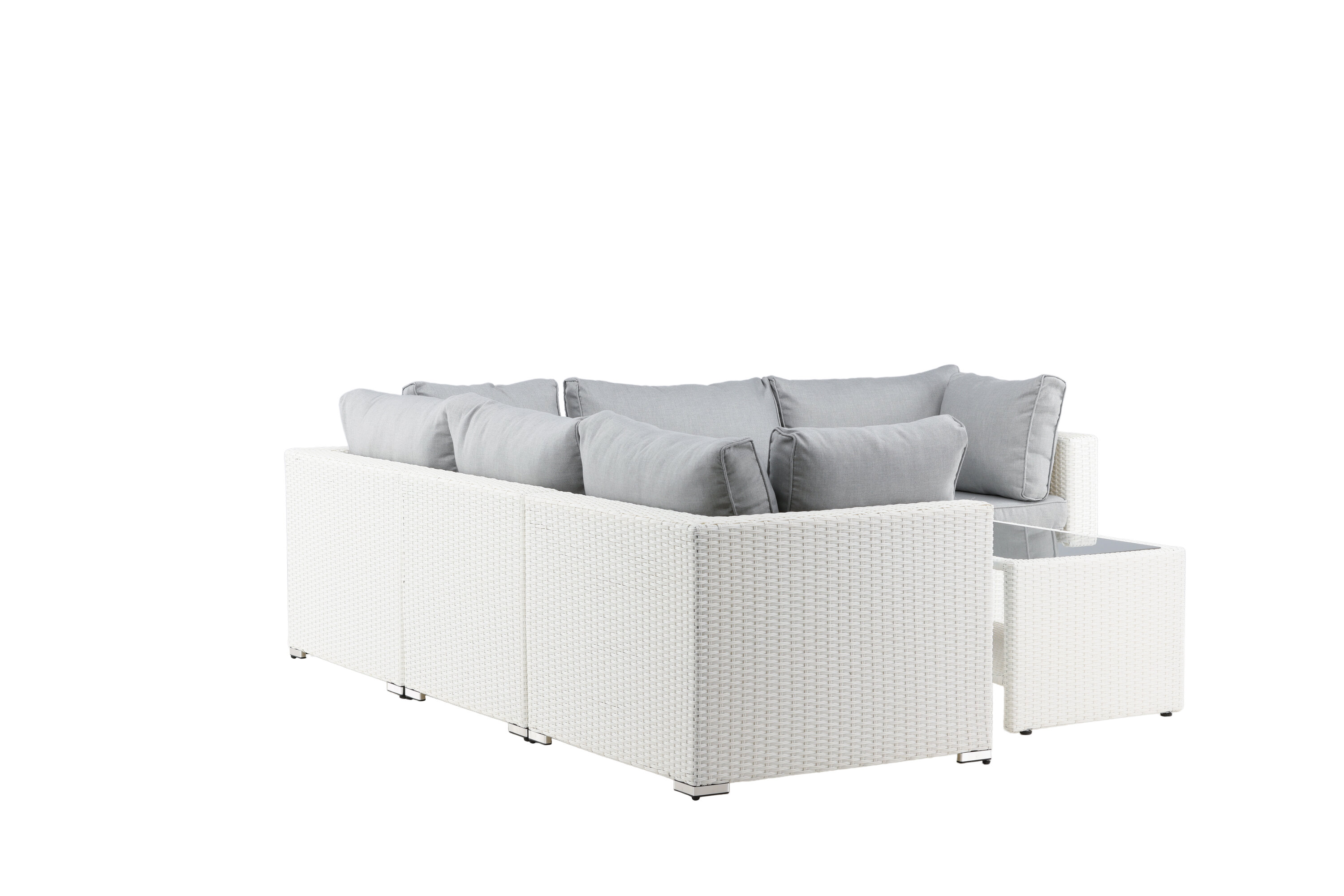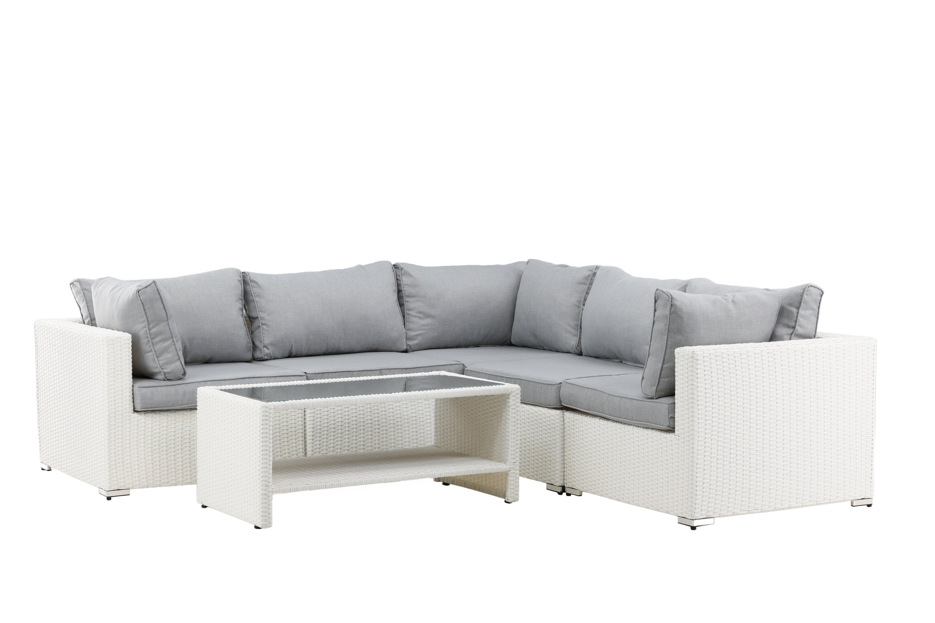 Amazon Sofa Group impresses with its modern design that focuses on good comfort to your patio or terrace. The sofa group consists of a corner sofa in modular form with four seats and a corner part that is easy to build together to suit your needs. Soft dark gray soft cushions are included as well as a matching, lower coffee table with a glass table top. Made of a metal frame and white artificial rattan - two durable materials that are excellent for outdoor use! Get ready for an outstanding nightlife this summer. Care advice: Konstrite is a plastic material that is perfect for our Scandinavian climate. The material is UV-resistant and can withstand weather and wind. The fact that it is UV-resistant means that the furniture does not fade, however, we always recommend storing the furniture under a furniture protection or otherwise dry and cool-to extend the service life.