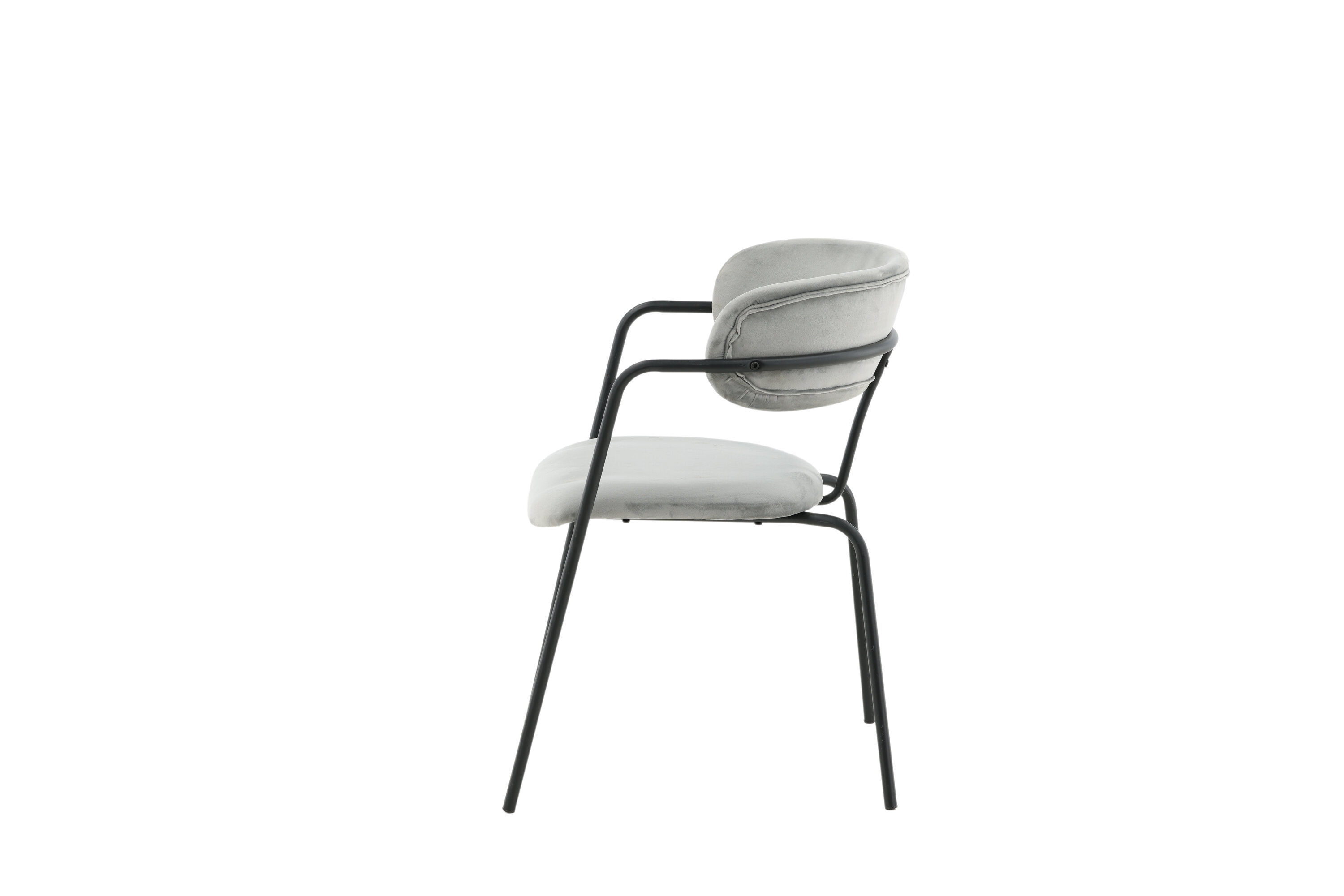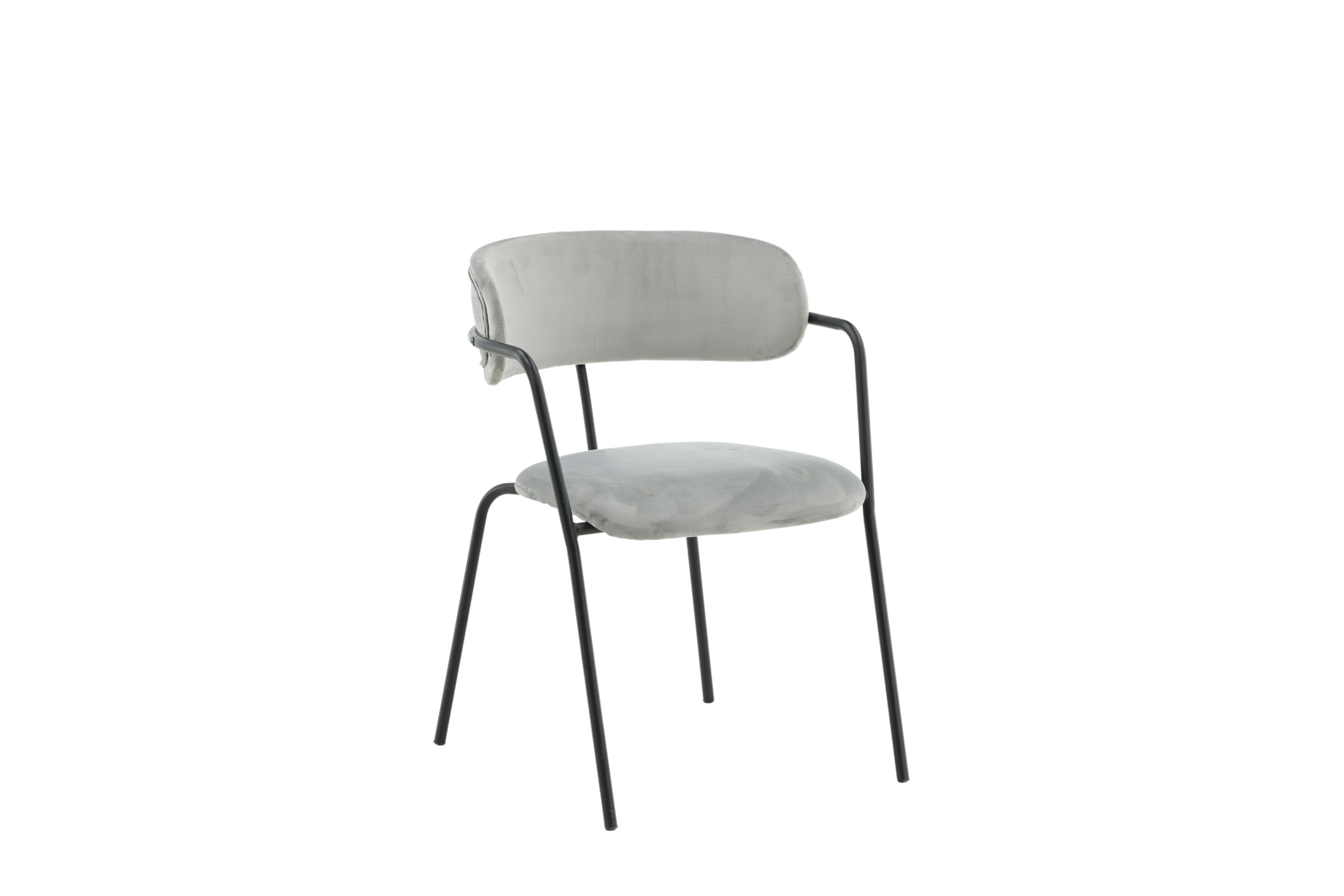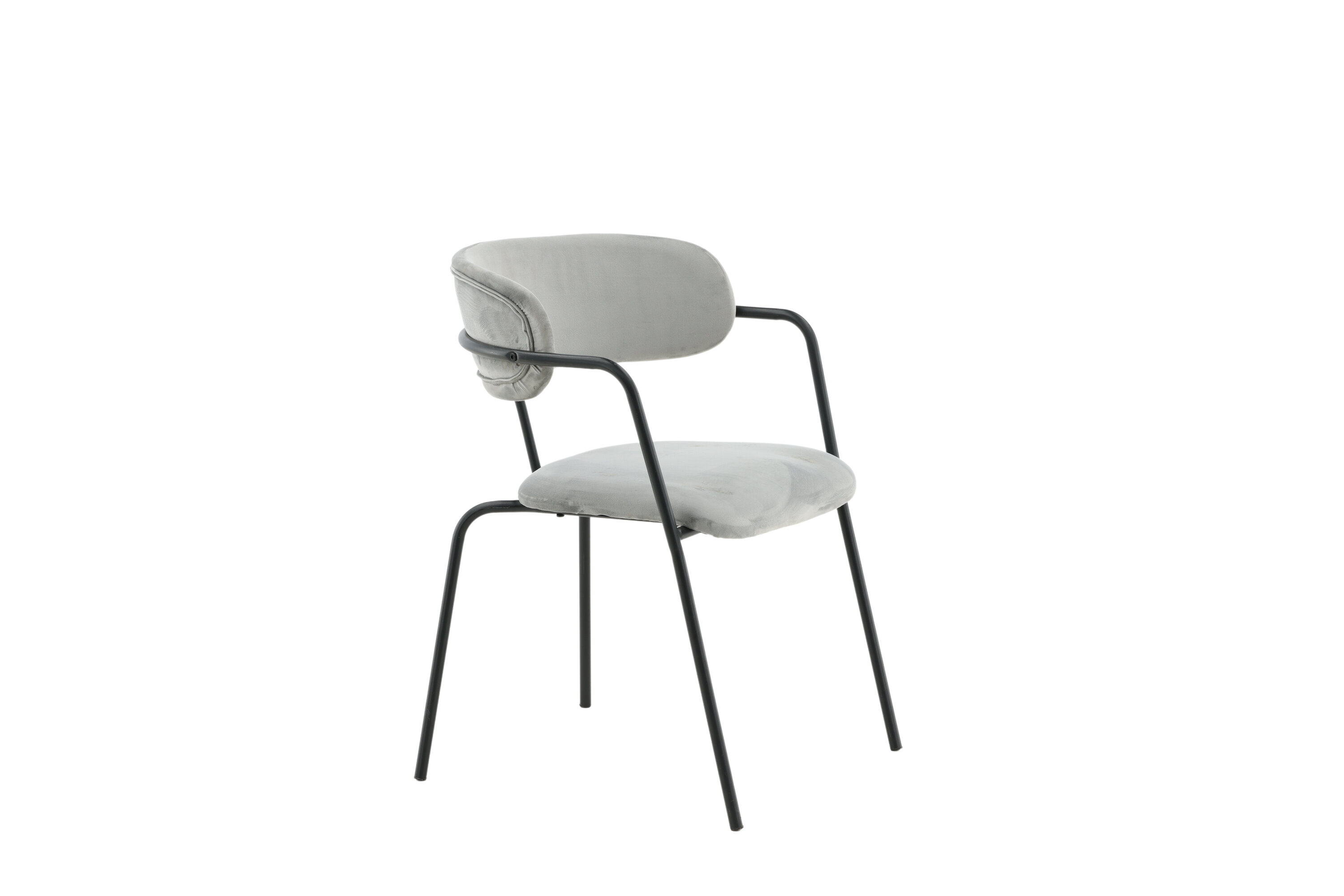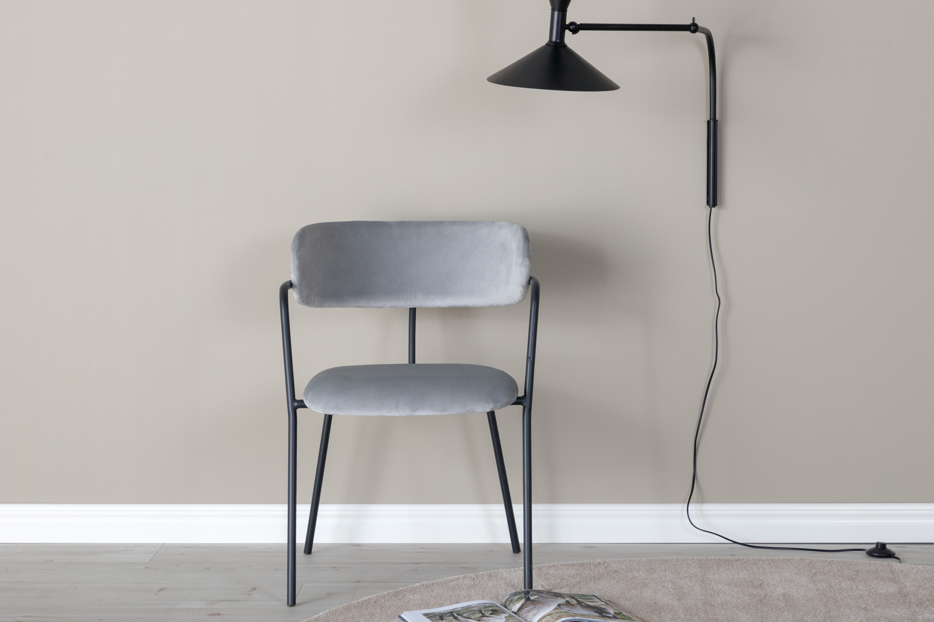 As comfortable as it is eye-catching! This stylish dining chair from the Arrow series features a modern frame with legs and integrated armrests in black powder-coated metal. The backrest is gently rounded in the same material as the seat, in padded gray velvet fabric. Create a pleasant focal point in the heart of your home! Some assembly required. Care instructions: Use fabric spray to impregnate the fabric before using it, which will also make it easier to remove any dirt and stains in the future. Remove stains immediately, do not rub, but try to gently soak up with a cloth.