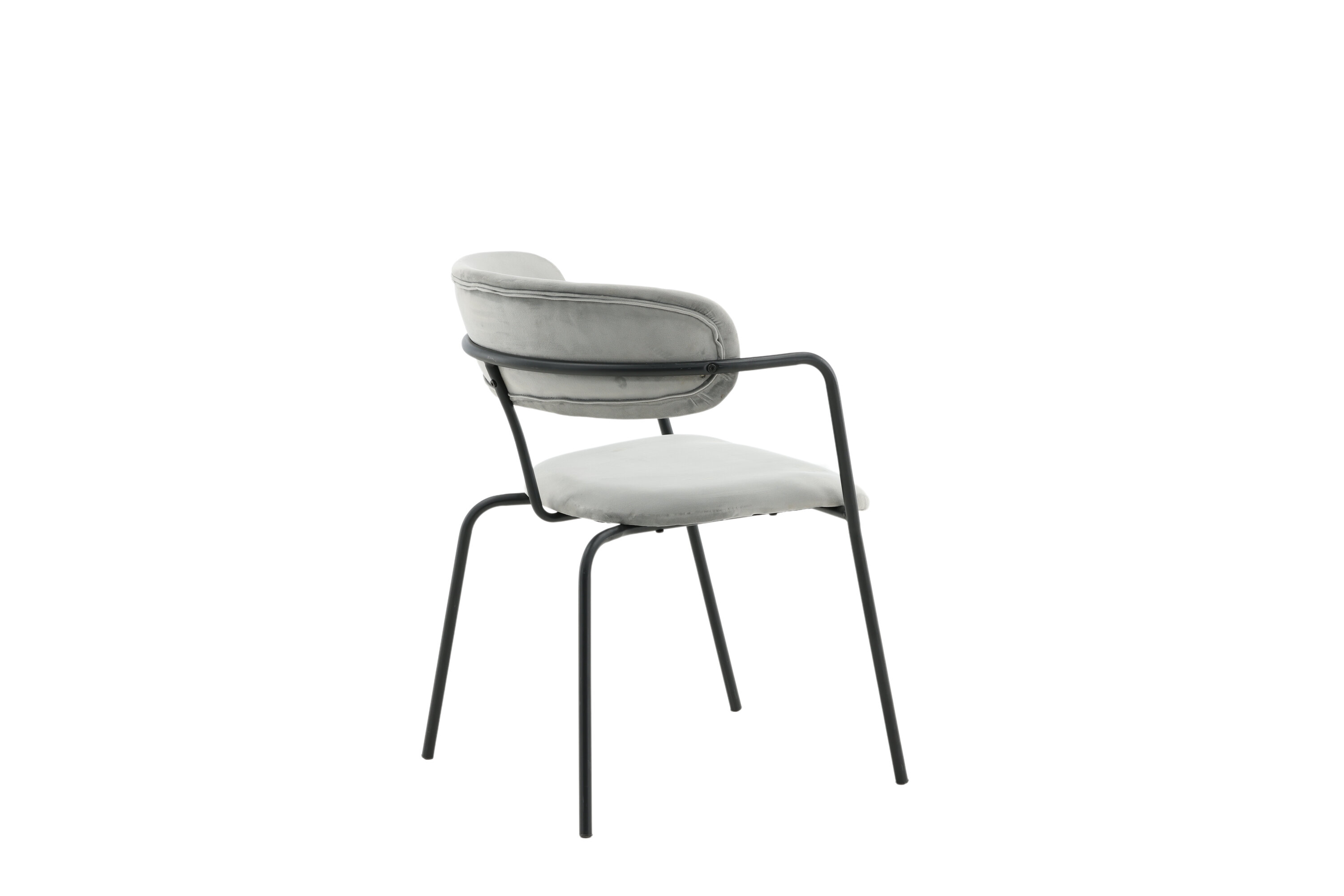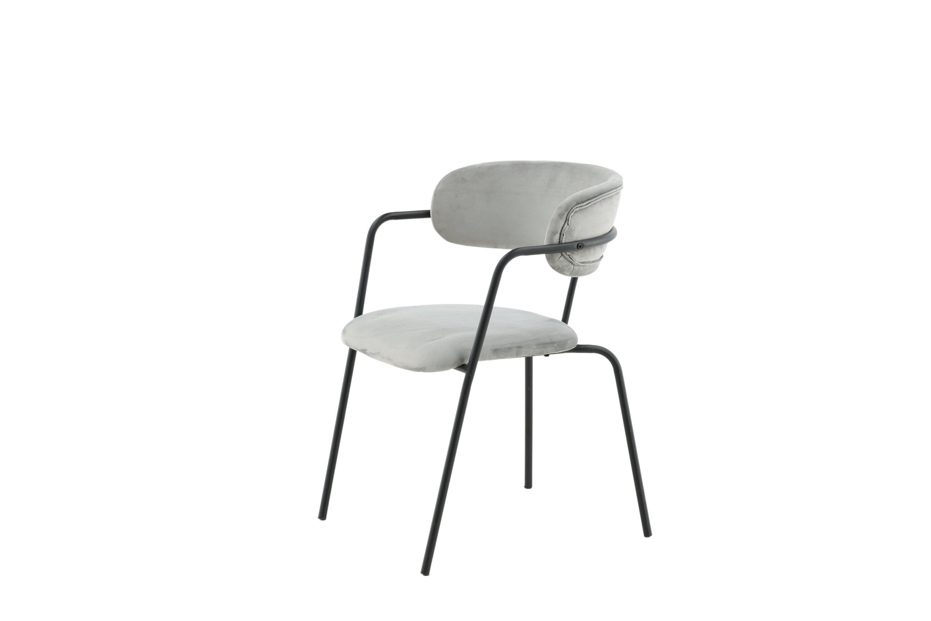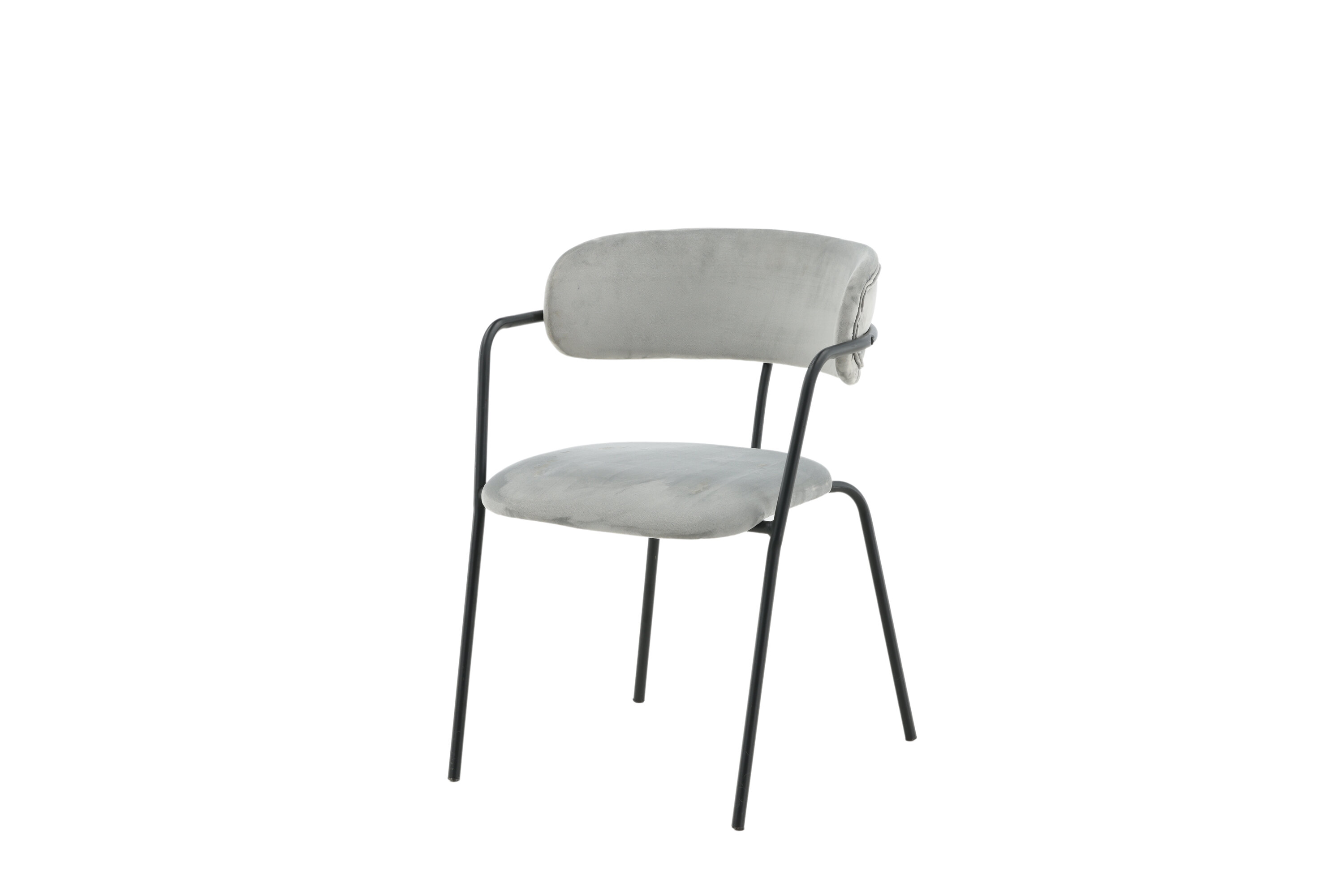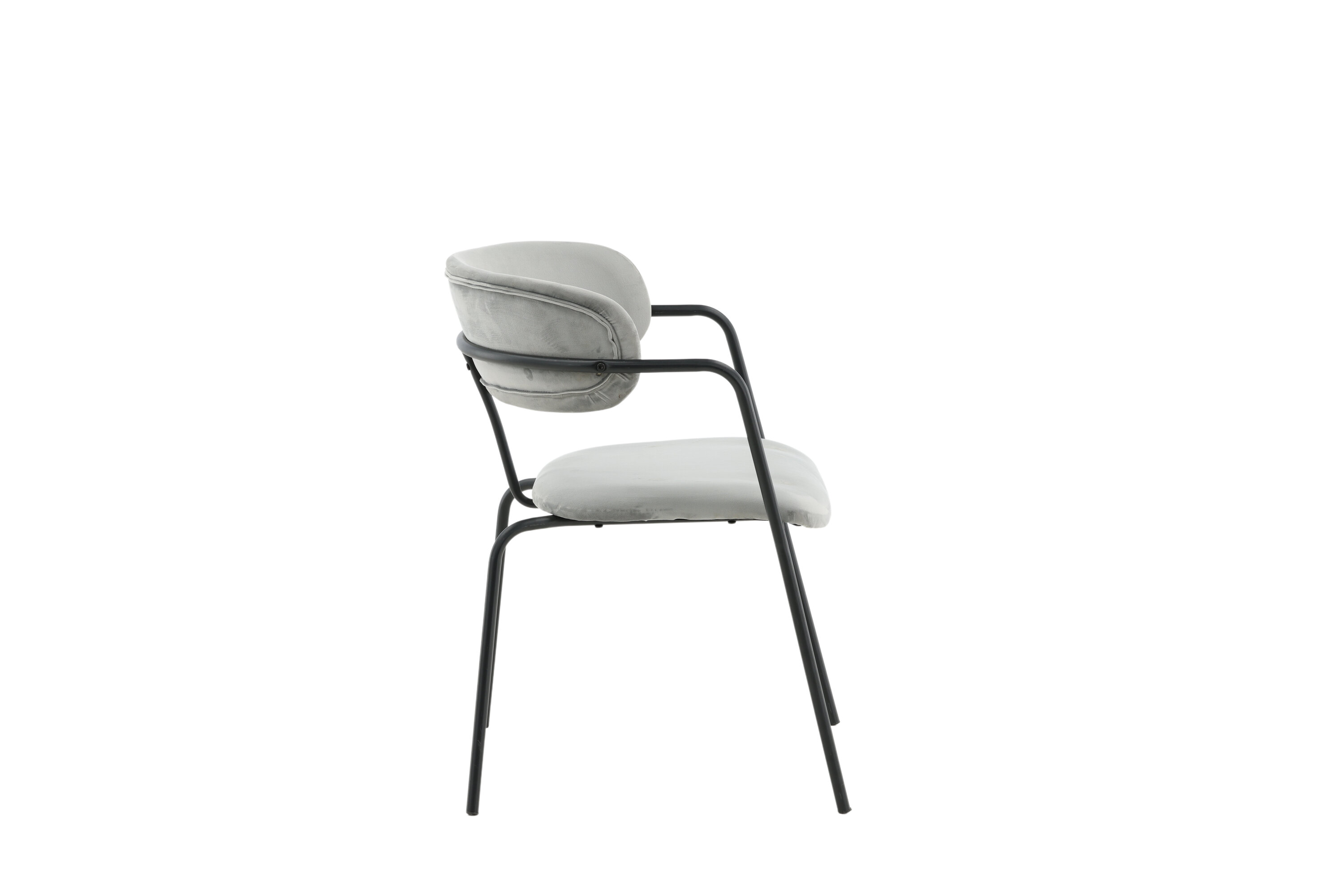 As comfortable as it is eye-catching! This stylish dining chair from the Arrow series features a modern frame with legs and integrated armrests in black powder-coated metal. The backrest is gently rounded in the same material as the seat, in padded gray velvet fabric. Create a pleasant focal point in the heart of your home! Some assembly required. Care instructions: Use fabric spray to impregnate the fabric before using it, which will also make it easier to remove any dirt and stains in the future. Remove stains immediately, do not rub, but try to gently soak up with a cloth.