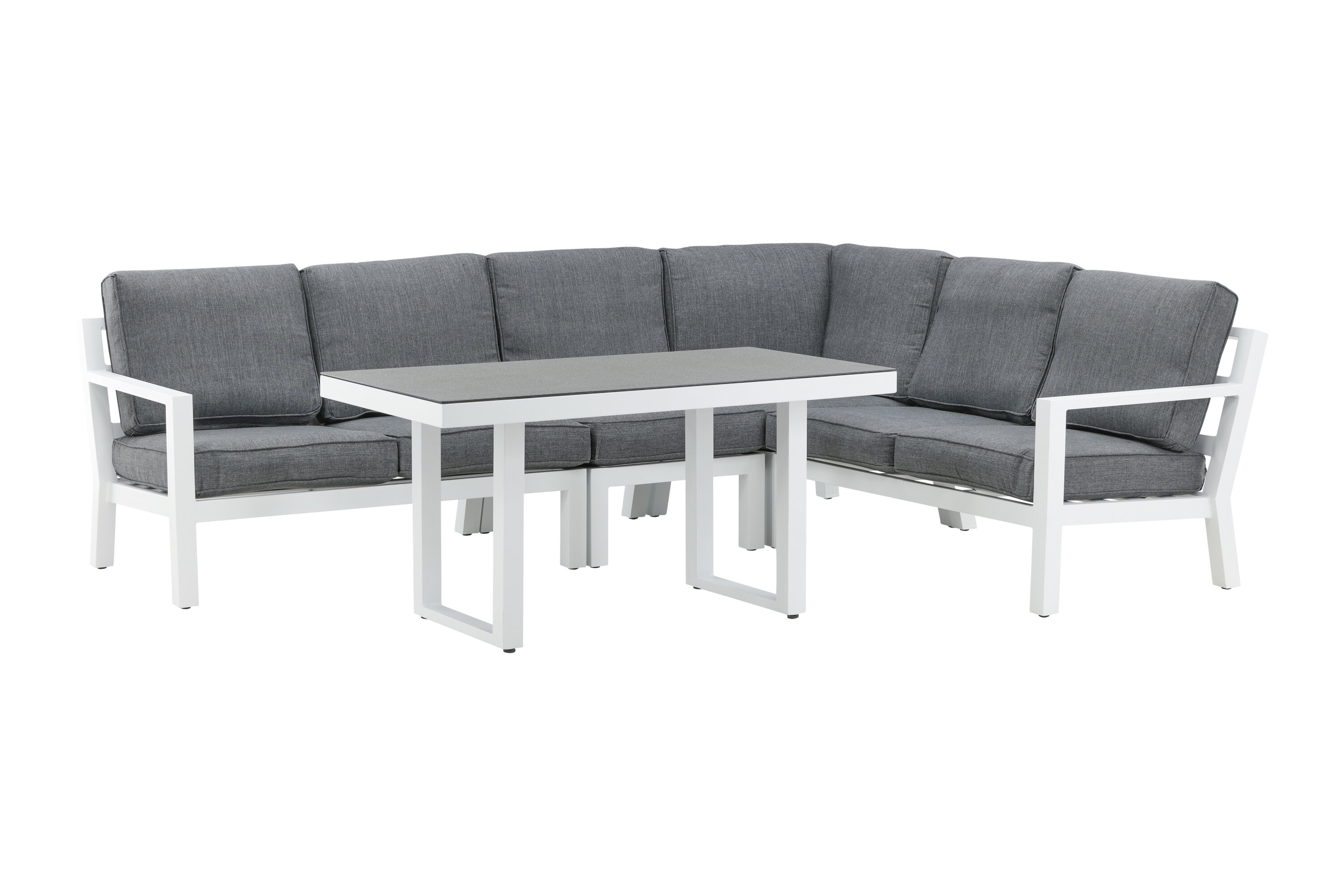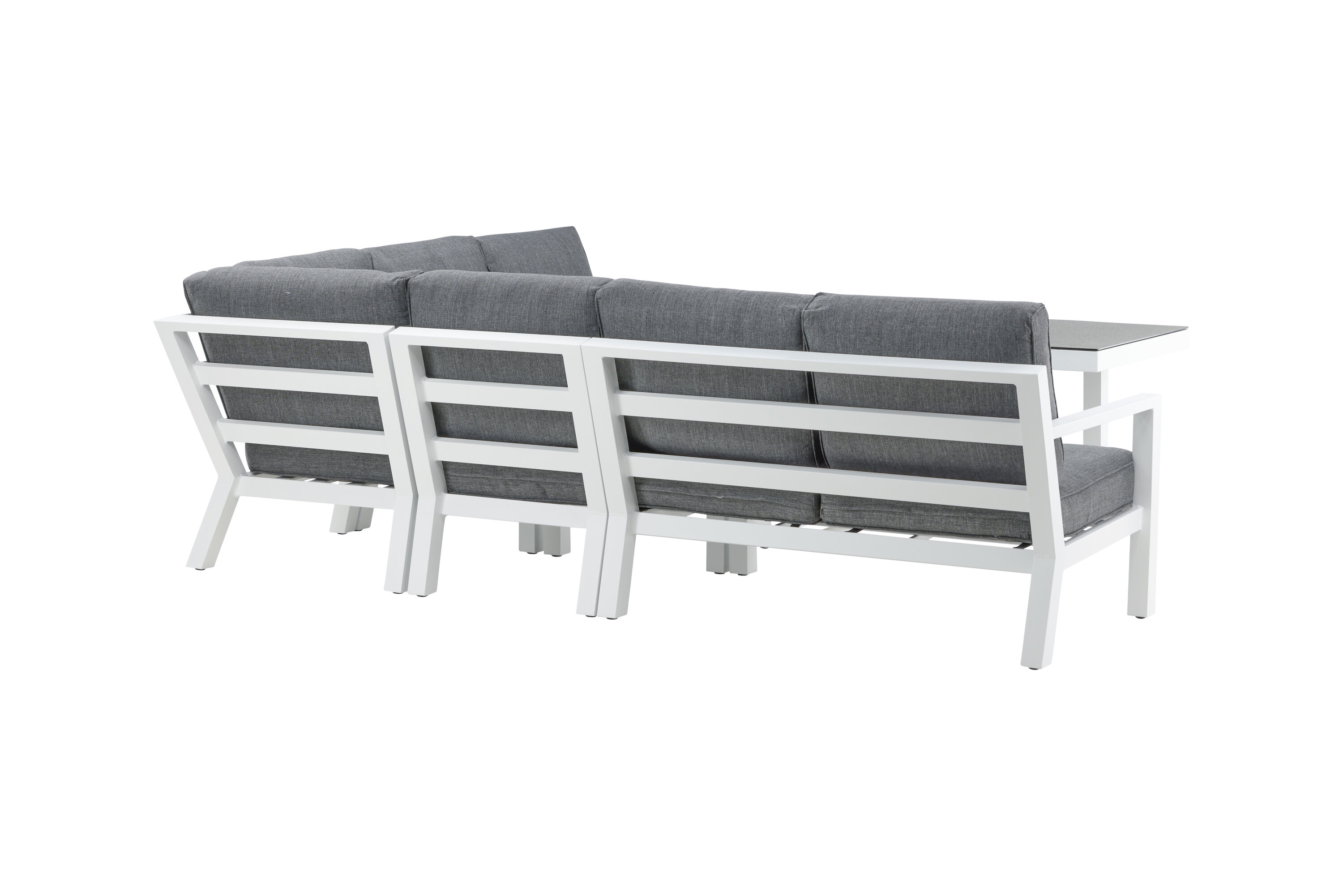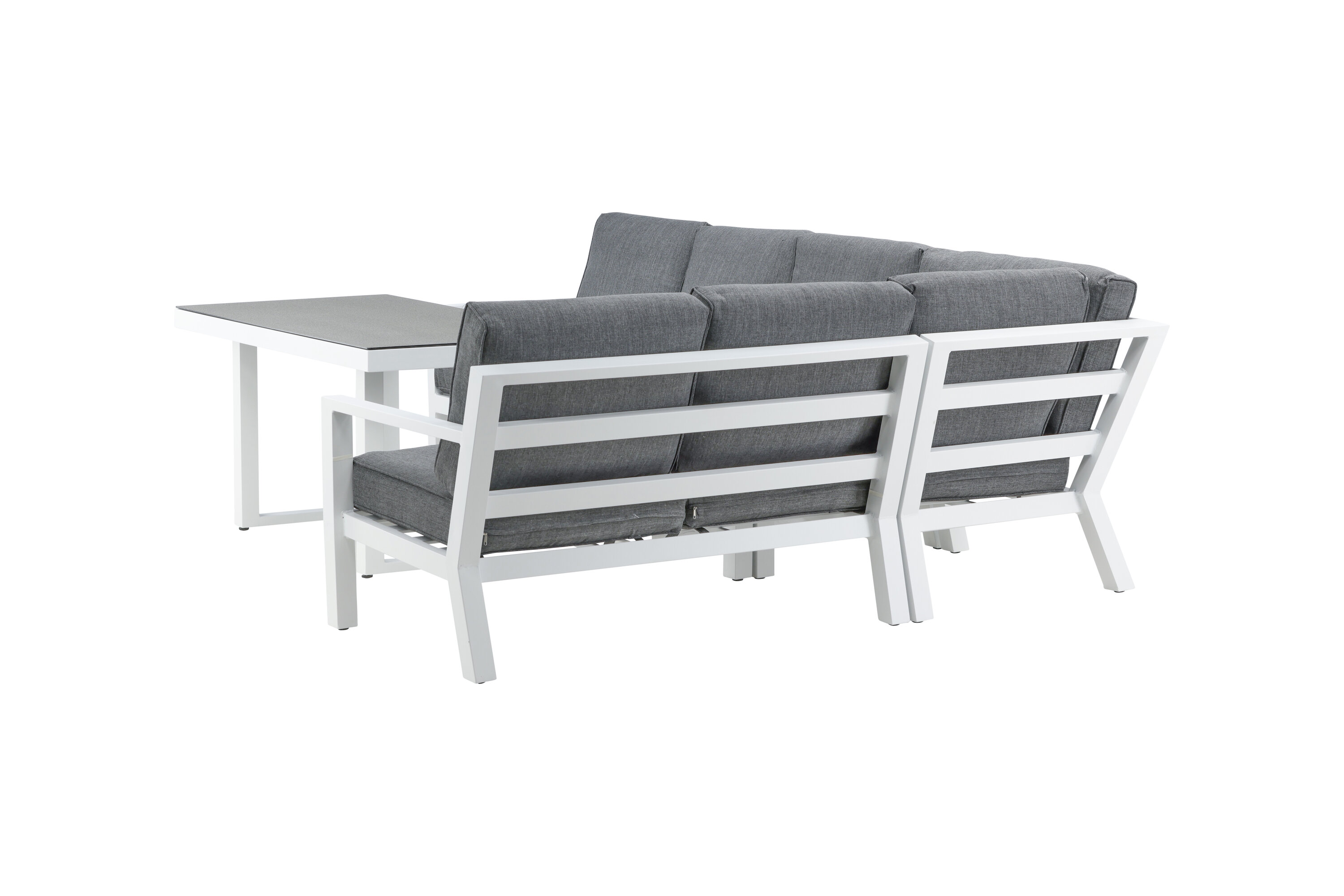 Create a charming centerpiece to gather family and friends around the patio this summer! Barcelona sofa group is a nice and stylish group in white aluminum with associated tables that match with a glass top plate. Durable cushions in black color are included. Table Dimensions: 140x75x68.5 cm. Sofa Dimensions: 267x254 cm. SITTING: 254x55x31 cm. No assembly required. Dispose afternoon coffee and enjoy - here you sit comfortably and relax for hours! Care advice: Outdoor furniture in aluminum and stainless steel should be cleaned regularly with water and mild soap. Always rinse thoroughly with plenty of water, which becomes extra important if the furniture is placed at a sea -close distance where salt can be transported through the air. The salt can lead to corrosion that can cause flaking or bubbles in the varnish.