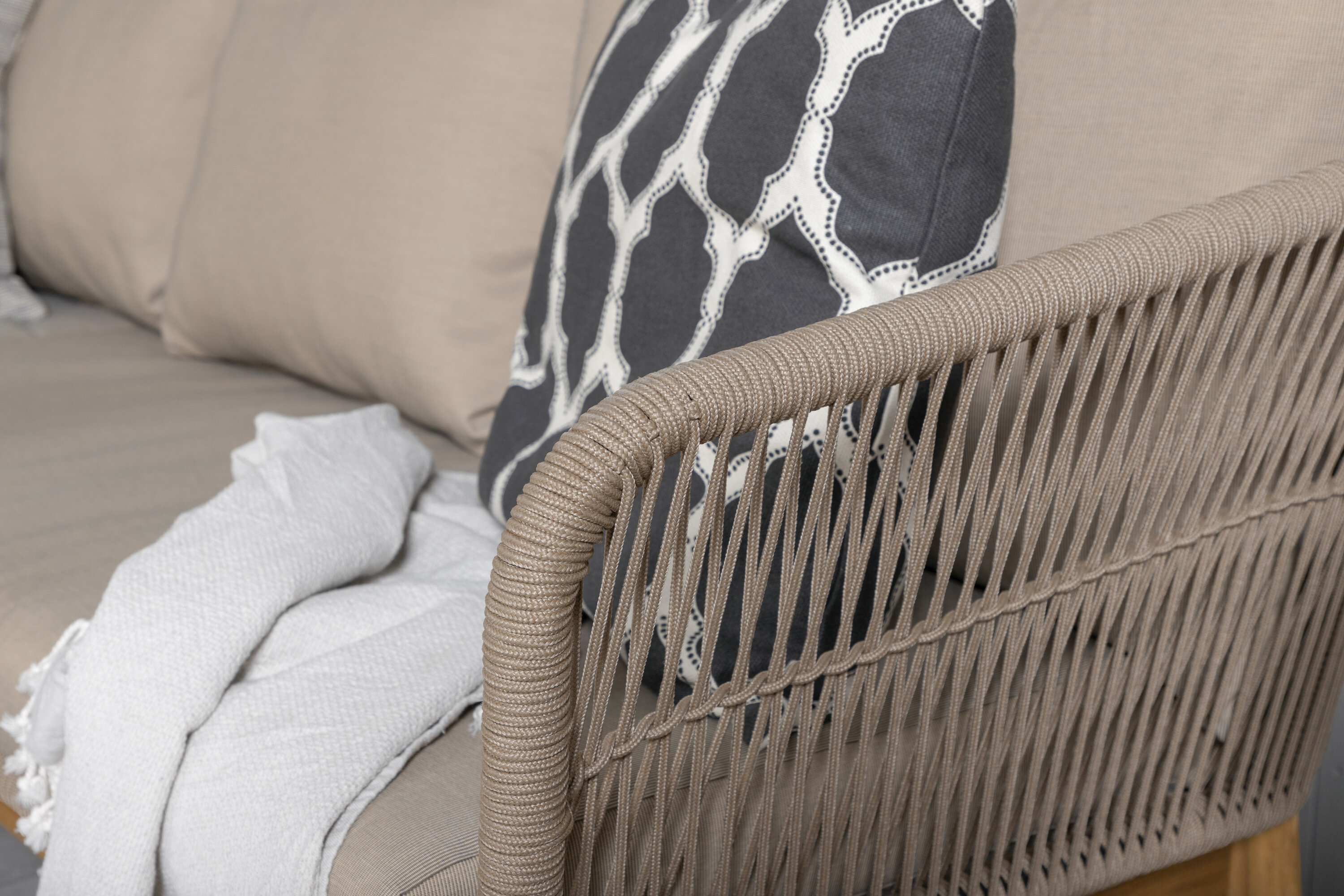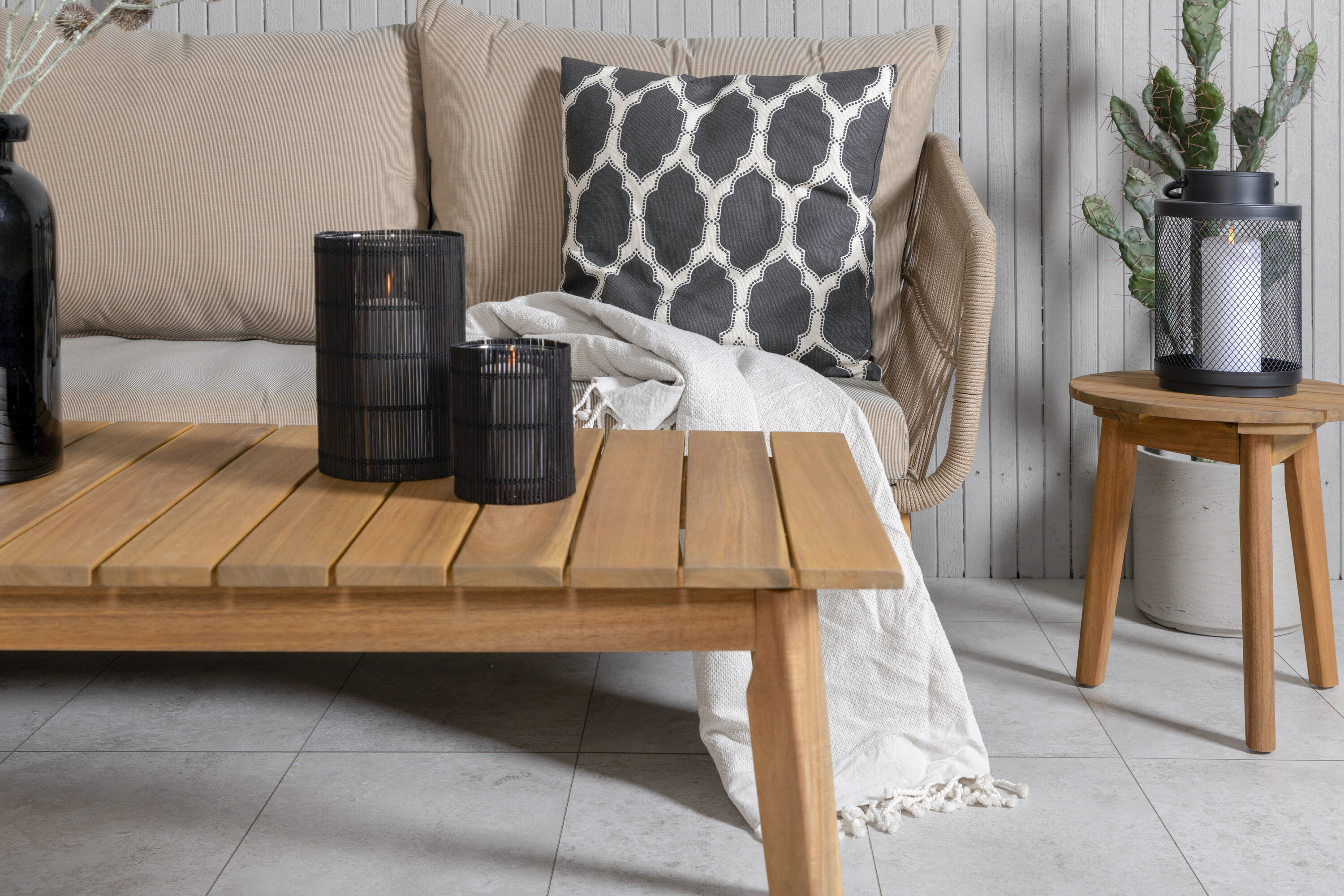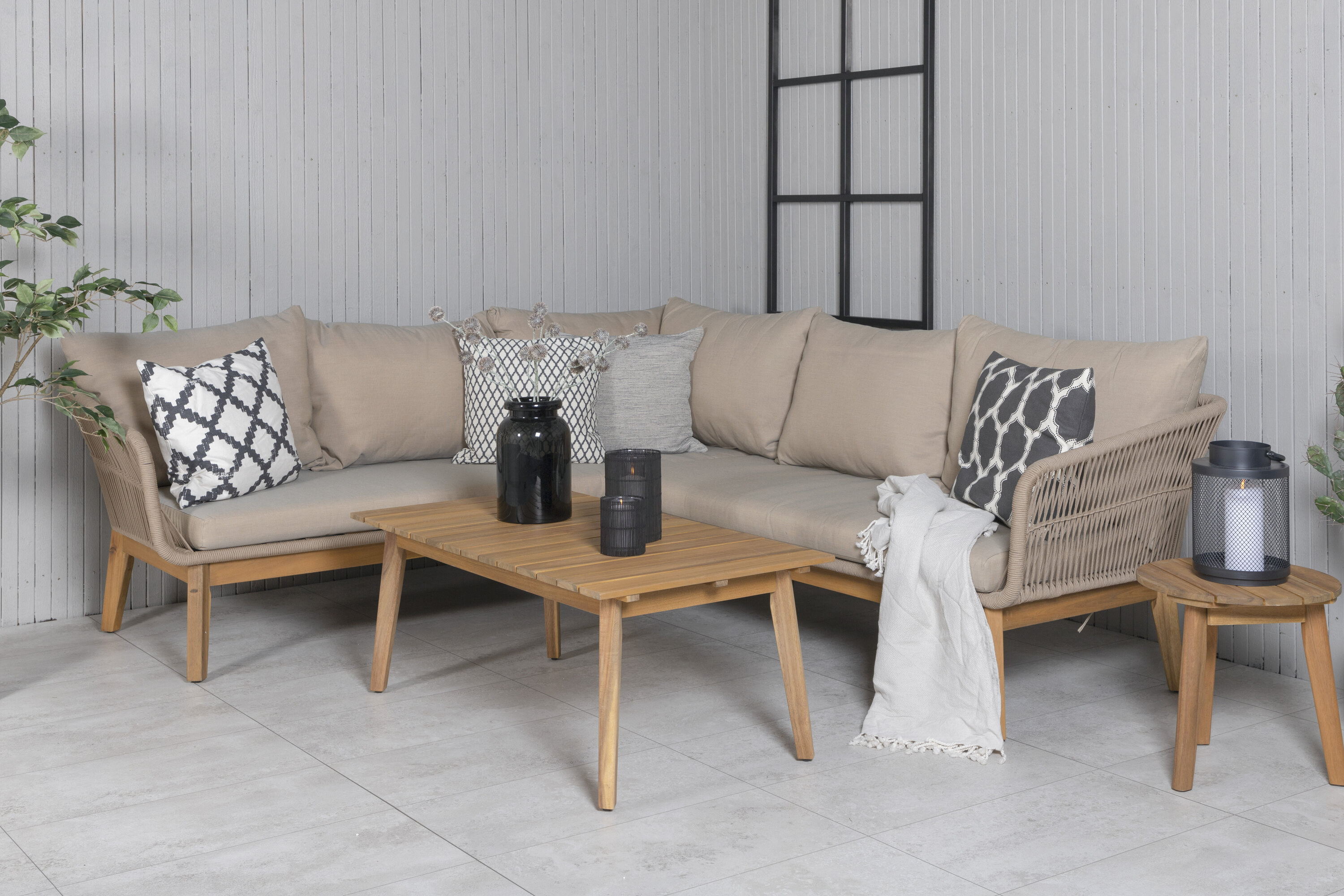 Chania sofa group is a nice and stylish group made of beautiful acacia, latte colored/brown steel and braided rope in a natural color. The associated table is consistently in acacia which creates a nice whole. Durable cushions in beige are included and the group holds a total of 5 sitting guests. Table Dimensions: 110x60x45 cm. Sofa Dimensions: 213x75x76 cm. SITTING: 186x65x33 cm. Invite to many pleasant moments this summer! Care advice: In order for your outdoor furniture in acacia/hardwood to maintain their finish, they should be treated oil. Since the woods in themselves are not as obese by nature, they need to be oiled a little now and then, even during the season. Newly purchased furniture should be saturated with oil, apply several layers in succession so the maximum with oil is absorbed.