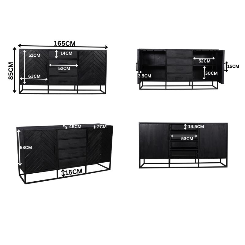 Dressoir 'New York' is uitgevoerd in het mangohout met visgraatpatroon. Het frame en de handgrepen zijn gemaakt van metaal en zijn afgewerkt met een zwarte lak. Dit model is gemaakt van gezandstraald mangohout en is afgewerkt met een zwarte lak. Het dressoir is voorzien van twee deuren en vier laden en maakt deel uit van de 'New York serie'.