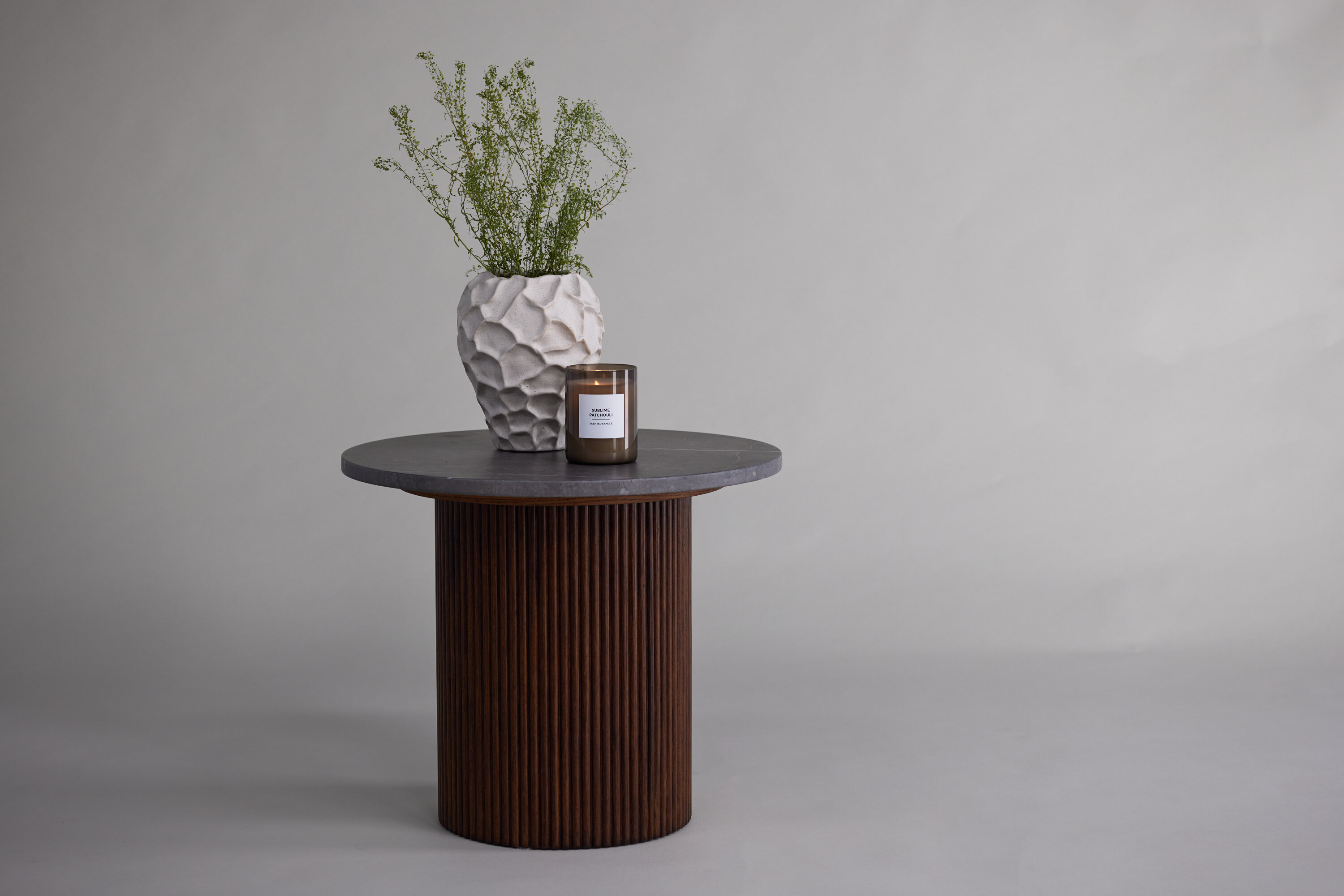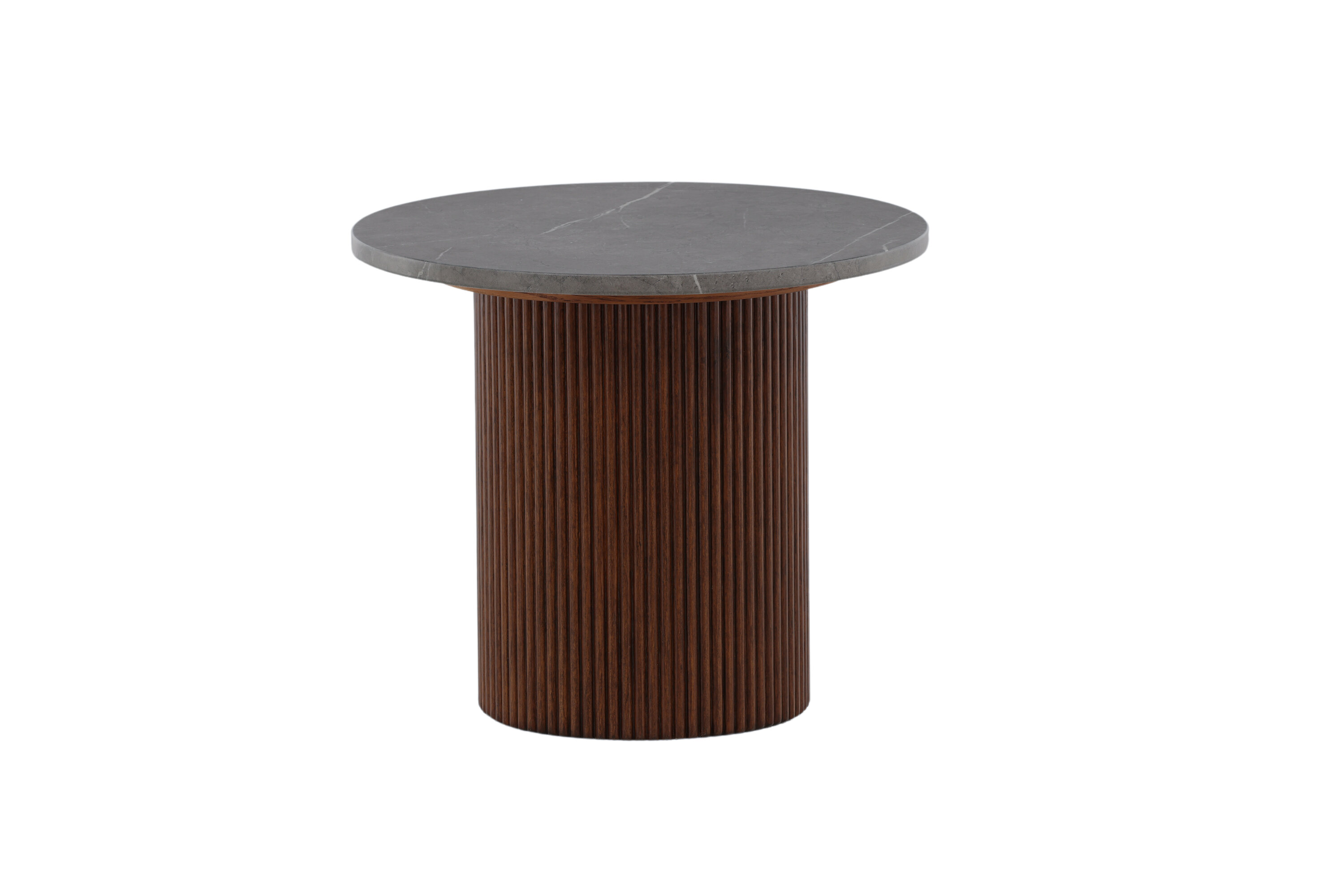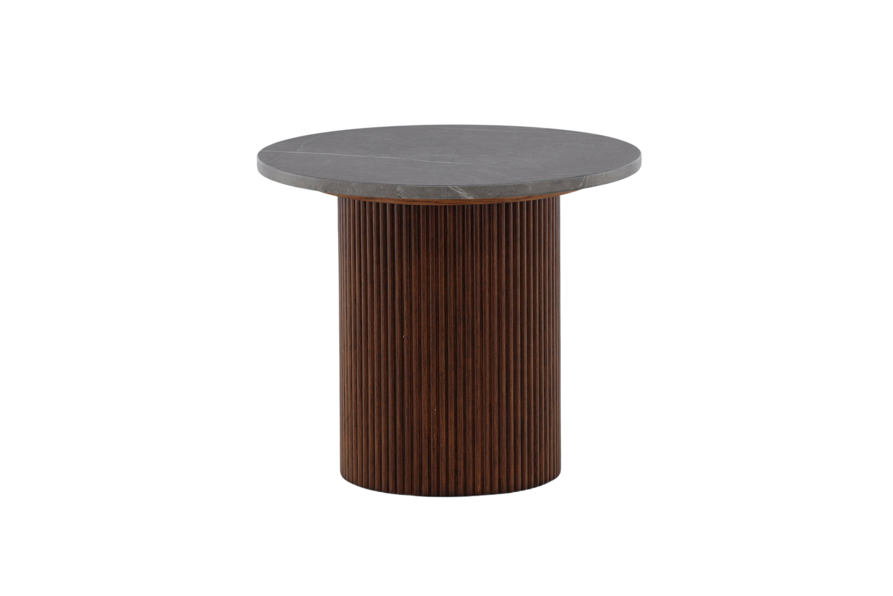 Härön side table has a unique design with delicious combination of MDF and ash! This side table belongs to the Vind collection and has a cylinder -shaped frame in ribbed, dark brown wood and a round table top in grey MDF which gives a wonderful life to the eye. Use as a side table, relief surface or pedestal - you decide in your home!