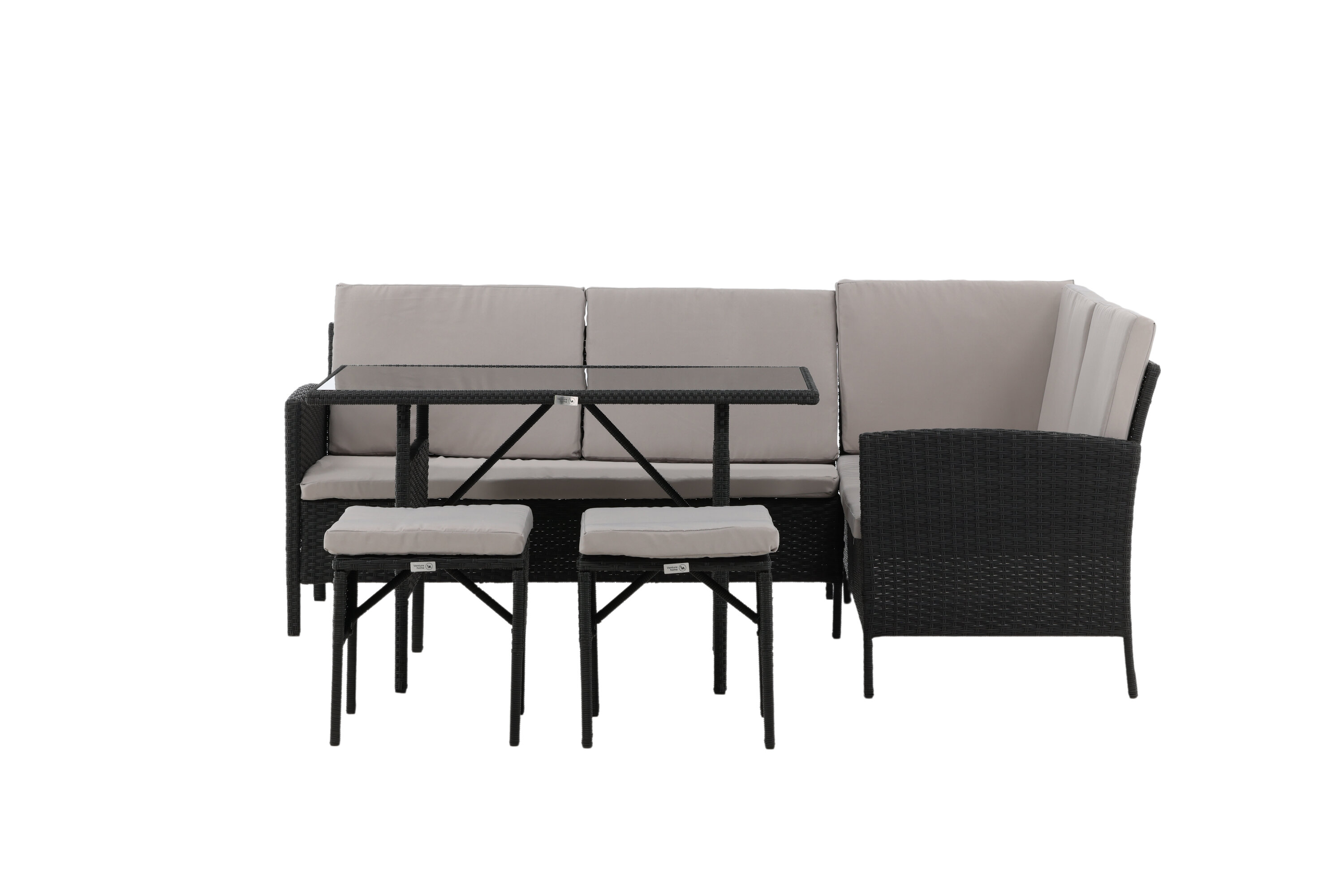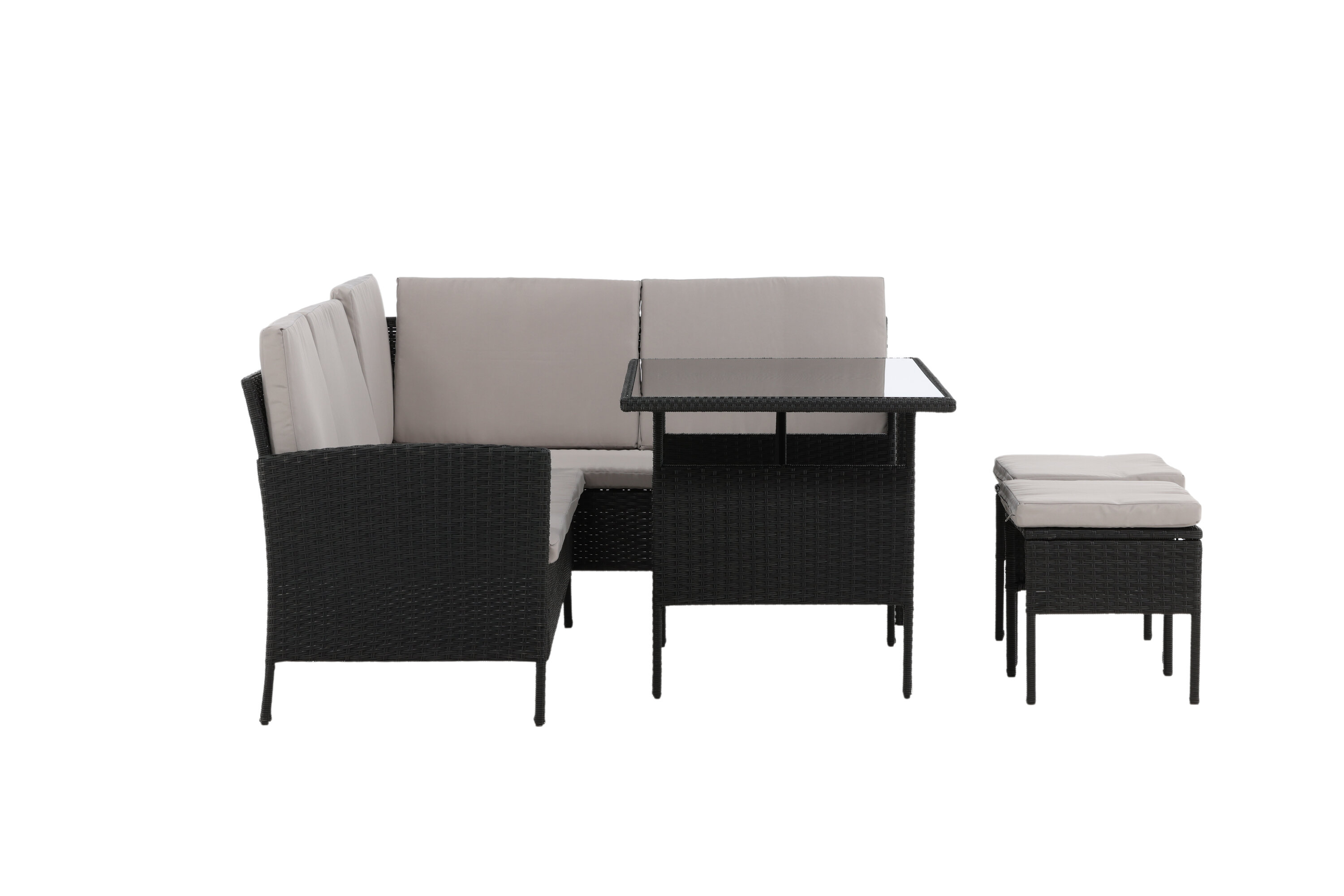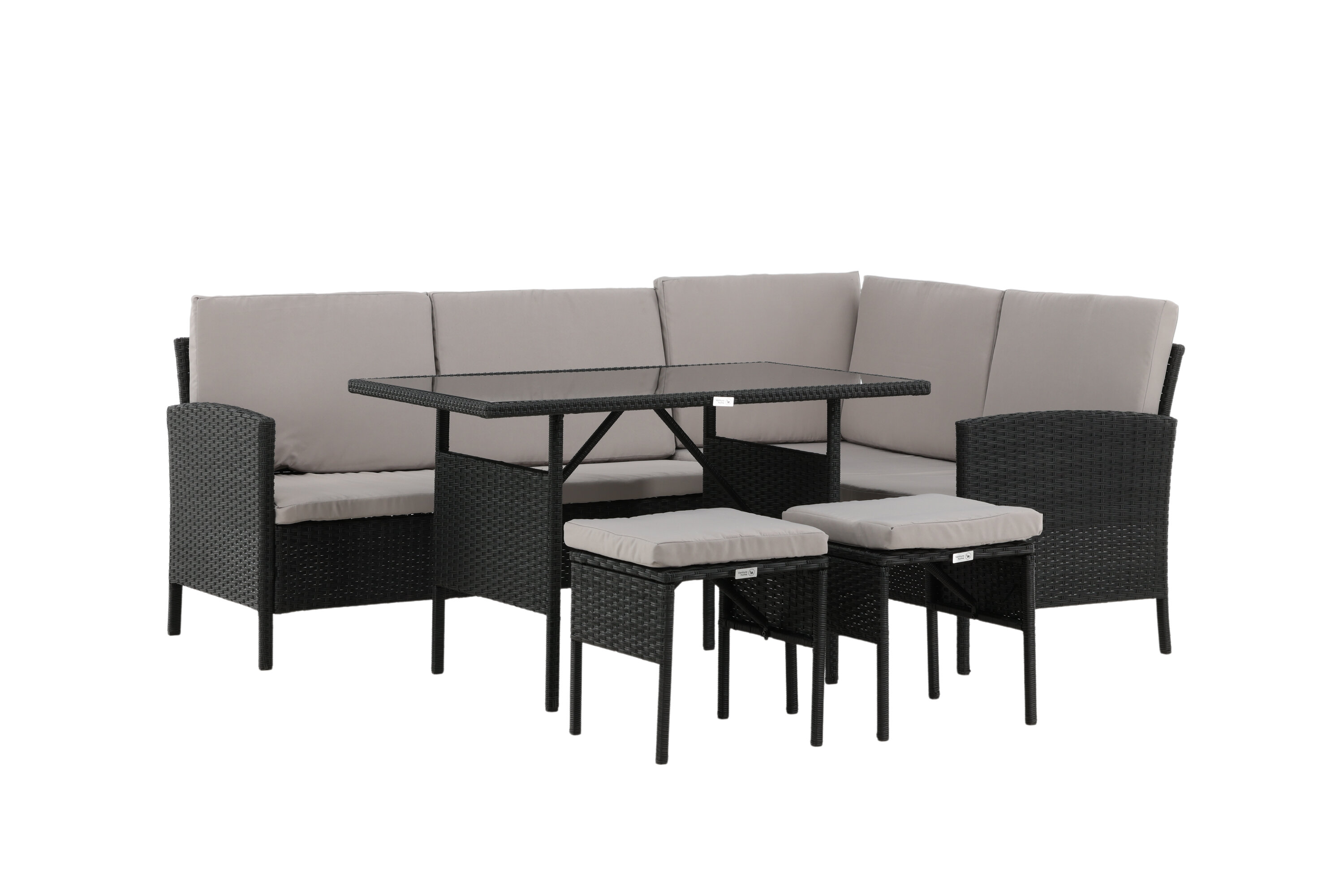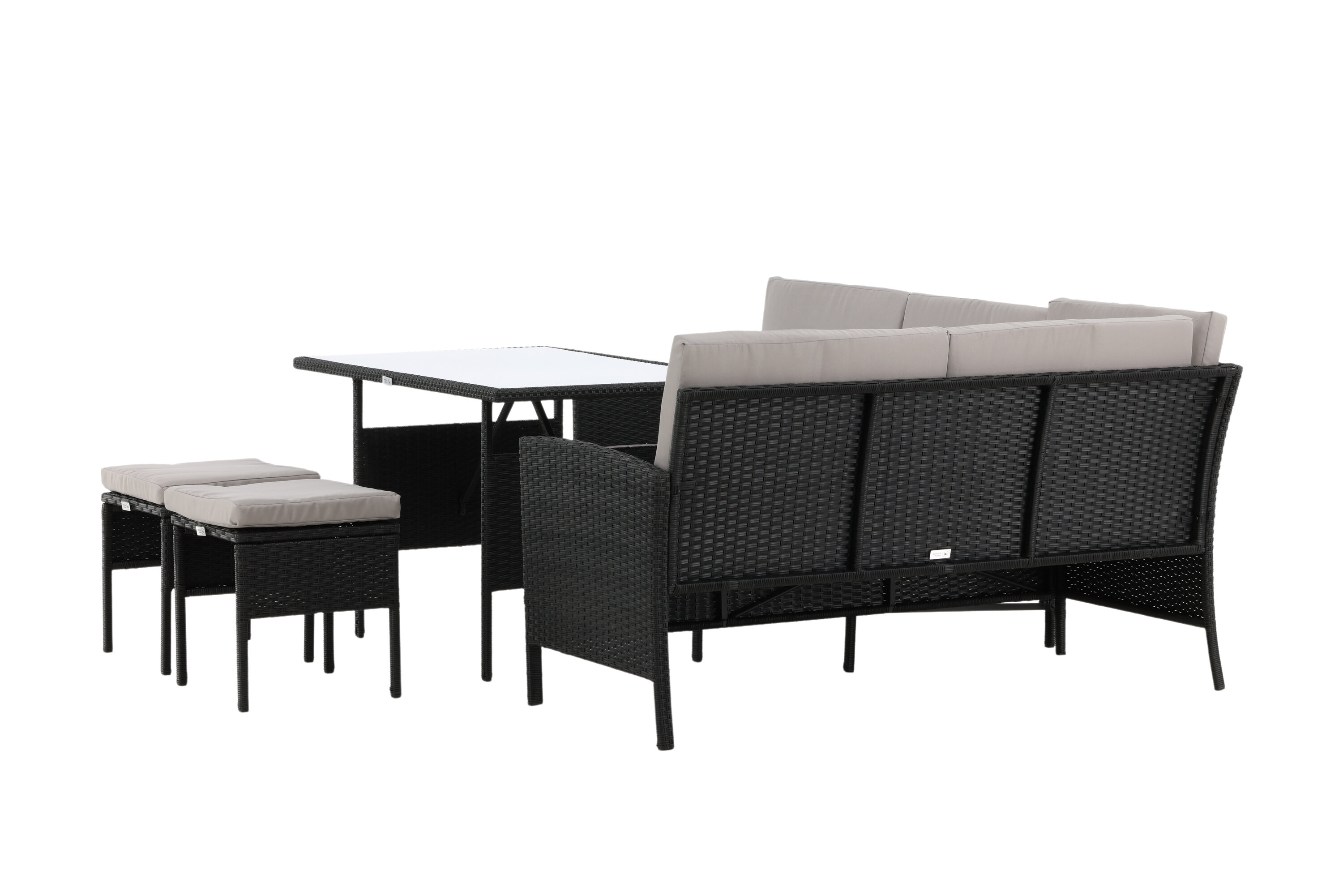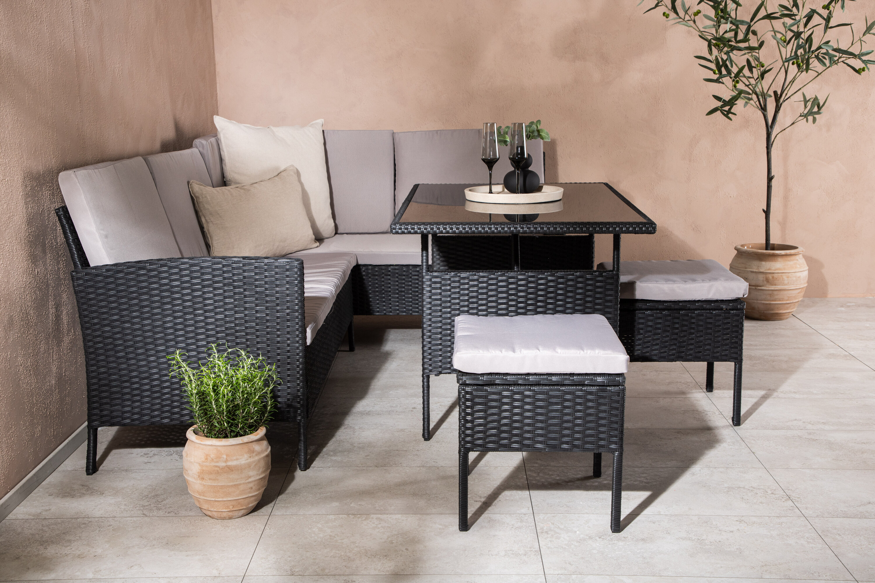 Knock sofa group is great for your patio or patio and is created with a focus on comfort and timeless deis. The sofa group consists of a corner sofa in black artificial rattan with four seats and one corner part, two cocks and a higher table in artificial rattan with a glass table. Gray cushions are included to the sofa group and contribute to an inviting feeling! Care advice: Konstriteting is a plastic material that is perfect for our Scandinavian climate. The material is UV-resistant and can withstand weather and wind. The fact that it is UV-resistant means that the furniture does not fade, however, we always recommend storing the furniture under a furniture protection or otherwise dry and cool-to extend the service life. Also, make sure to regularly clean the furniture with mild detergent, suggested soap and water, to keep dust and dirt away from the fiber fabric in the material.