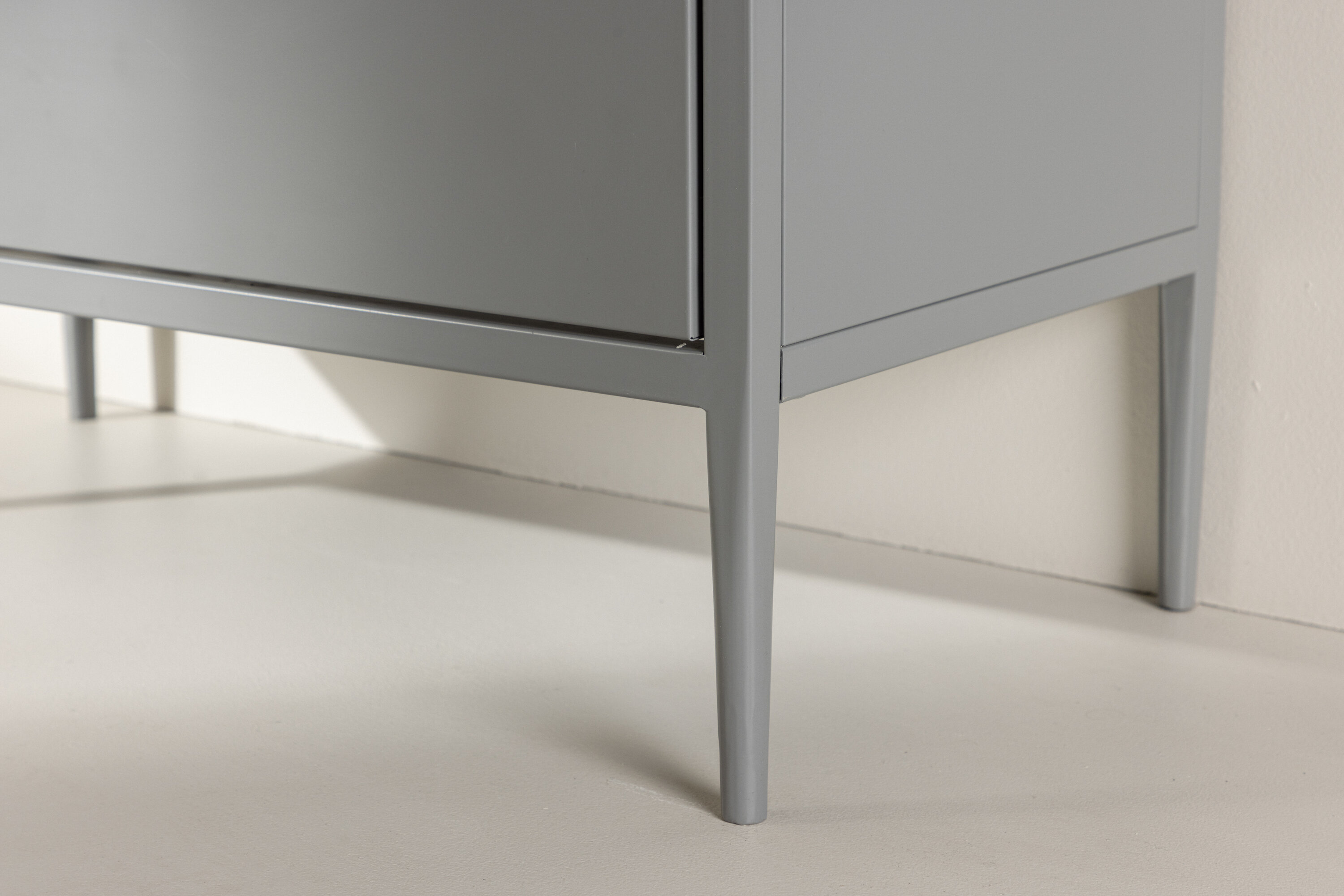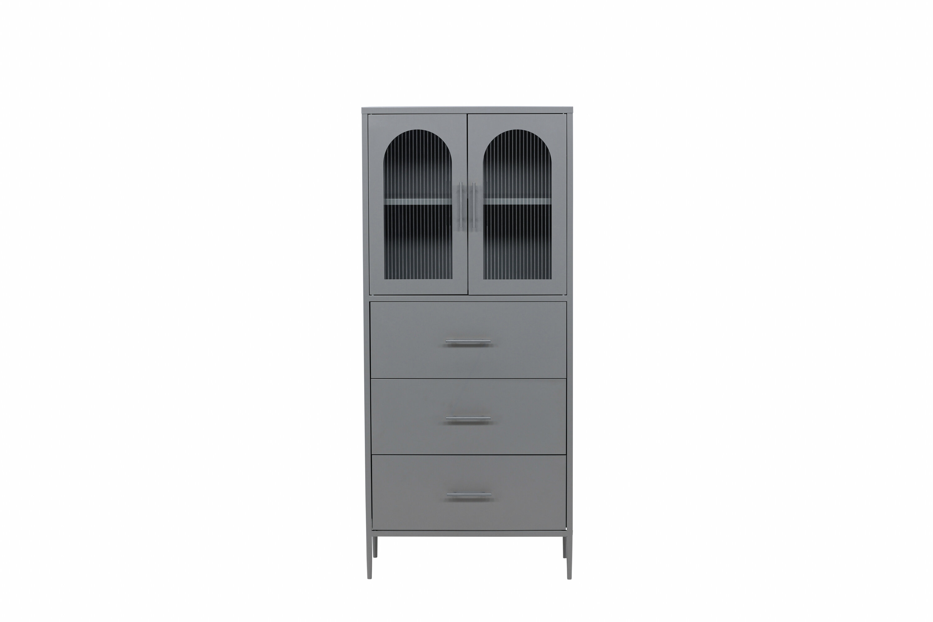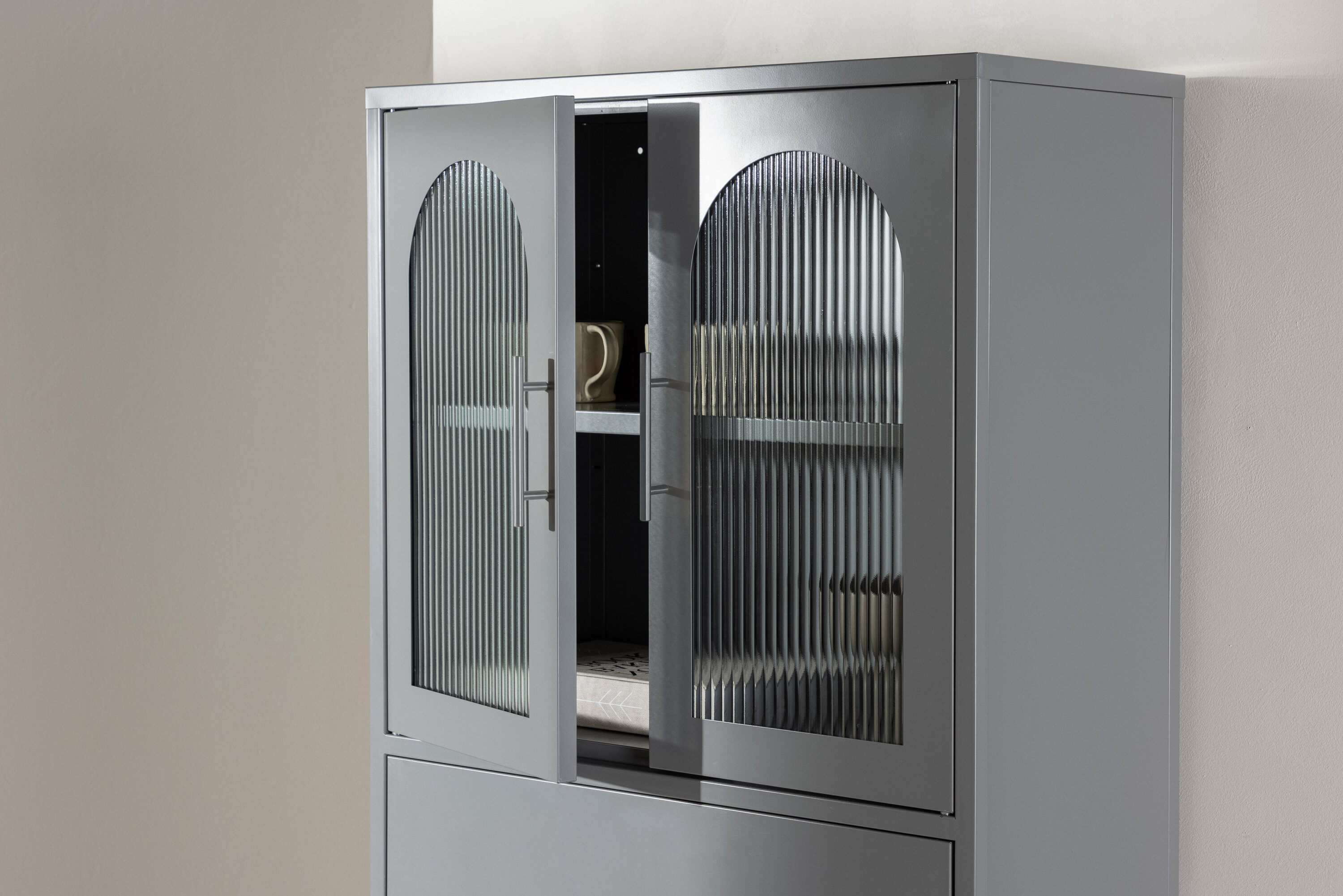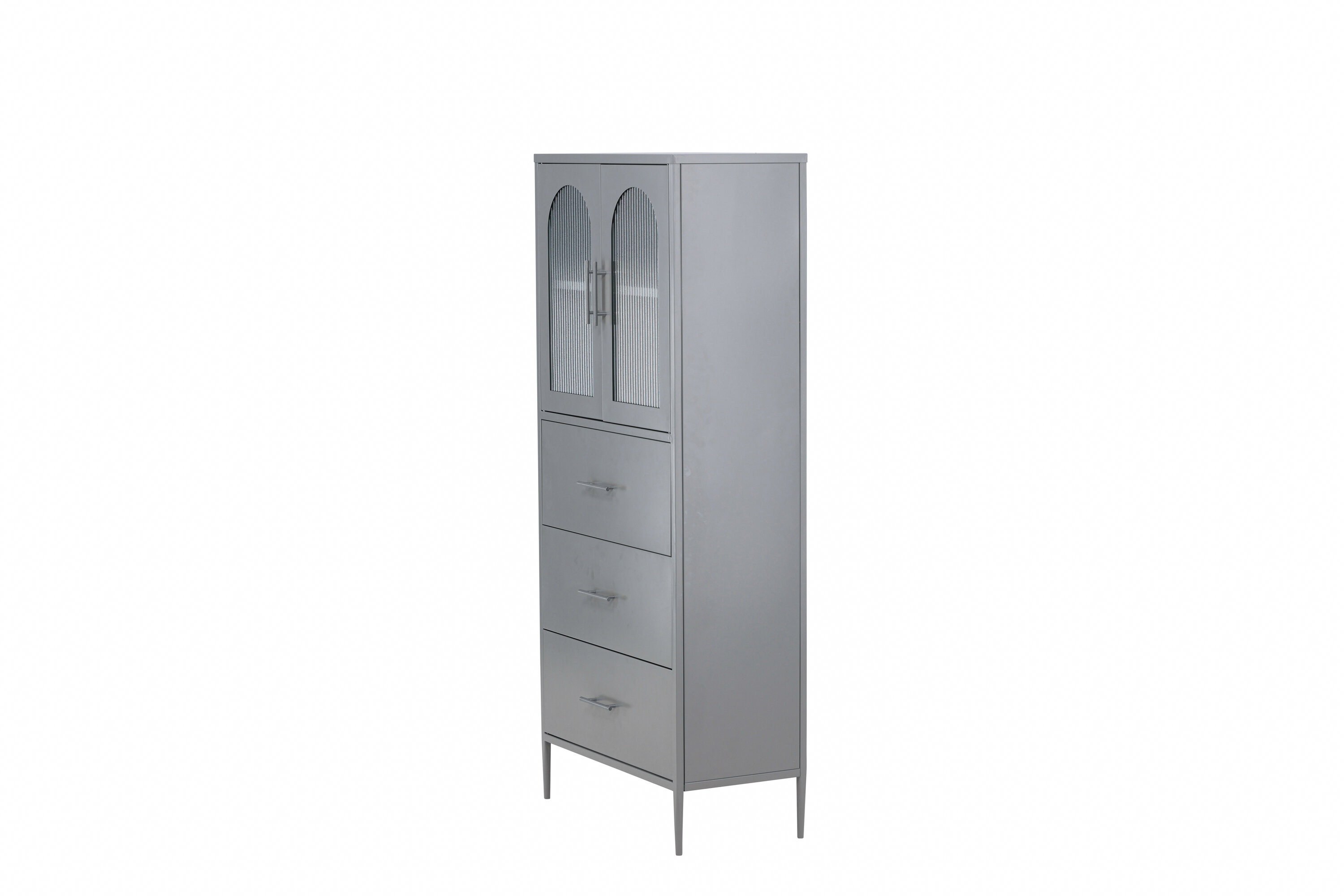 Welcome to a grand level of storage with our magnificent storage cabinet in a beautiful light gray shade – La Paz! This cabinet is not just a cabinet; it combines stylish elegance and functionality perfectly and will likely change your perception of storage solutions. This light gray cabinet is thoughtfully designed down to the smallest detail. The brass-colored handles provide a luxurious touch to the centerpiece. Their subtle shine captures your attention and gives an enchanting aura to the whole. The cabinet is crafted in powder-coated metal in a pleasant light gray hue that seamlessly blends into numerous interior design styles. It's supported by four slender legs that not only create an airier impression but also make vacuuming easier. At the bottom, there are three spacious drawers, which are your secret weapon against a cluttered home. Here, you can easily and smoothly conceal things, keeping your space neat and organized. On top, there are two cabinet doors framed by an arched design in textured glass, discreetly revealing a glimpse of your beautiful storage. Place your fine china or luxurious glasses on top and let them become a part of your decor!