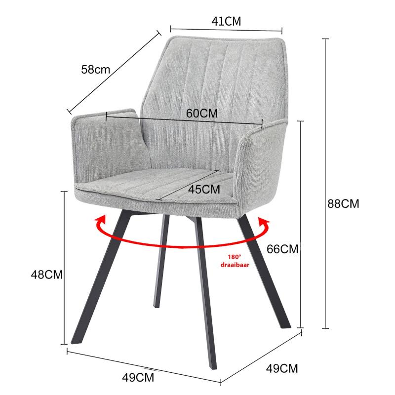 Ontdek de Livingfurn Eetkamerstoel Louise Grey, een stijlvolle toevoeging aan elke moderne eetkamer. Deze stoel combineert comfort met een eigentijds design, perfect voor lange diners en gezellige avonden. De zachte stoffen bekleding in een chique grijstint nodigt uit om plaats te nemen, terwijl de speelse lijnen van de zitschaal een uniek visueel accent geven.De Louise stoel is niet alleen een lust voor het oog, maar ook ontworpen met functionaliteit in gedachten. Het stevige onderstel van gecoat staal garandeert stabiliteit en duurzaamheid. Dankzij het handige draaiplateau is deze eetkamerstoel draaibaar, wat zorgt voor extra gemak en flexibiliteit aan uw eettafel. Of u nu een modern interieur heeft of op zoek bent naar een comfortabele stoel met een vleugje elegantie, de Louise past naadloos in diverse woonstijlen.Hoogte88 cmBreedte60 cmDiepte58 cmMateriaalStof, Gecoat staalKleurGrijsGewicht10.2 kgZithoogte48 cmZitbreedte60 cmZitdiepte45 cmArmleuninghoogte66