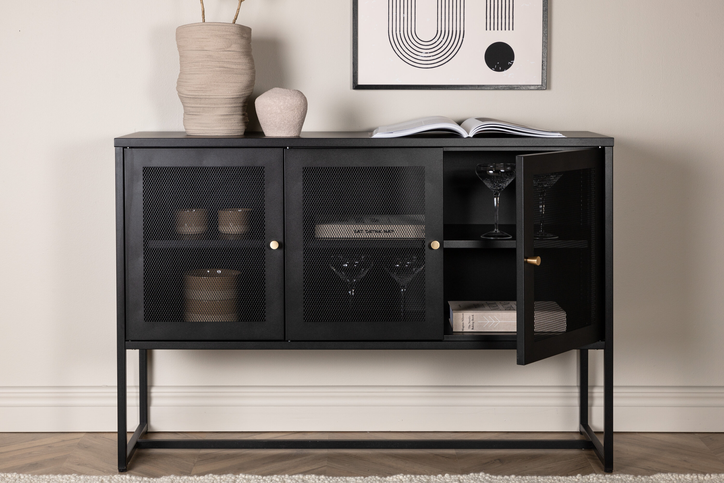 Malla - a modern cabinet in a tough industrial design with delicious mesh doors and legs made of black powder coated steel with 2 smart shelves for relief. The cabinet is lifted by narrow, high legs that create an airy feel and also facilitate the vacuum cleaner. The perfect storage furniture for everything you want - fill with porcelain, books or beautiful decorations. The flexible size and elegant outside of the cabinet make it easy to place and fit well into most rooms in the home, so furnish according to your own needs and wishes!
