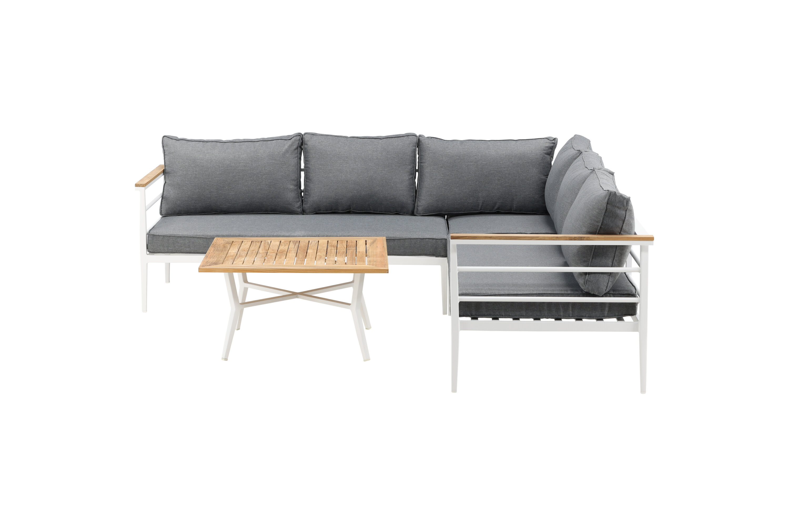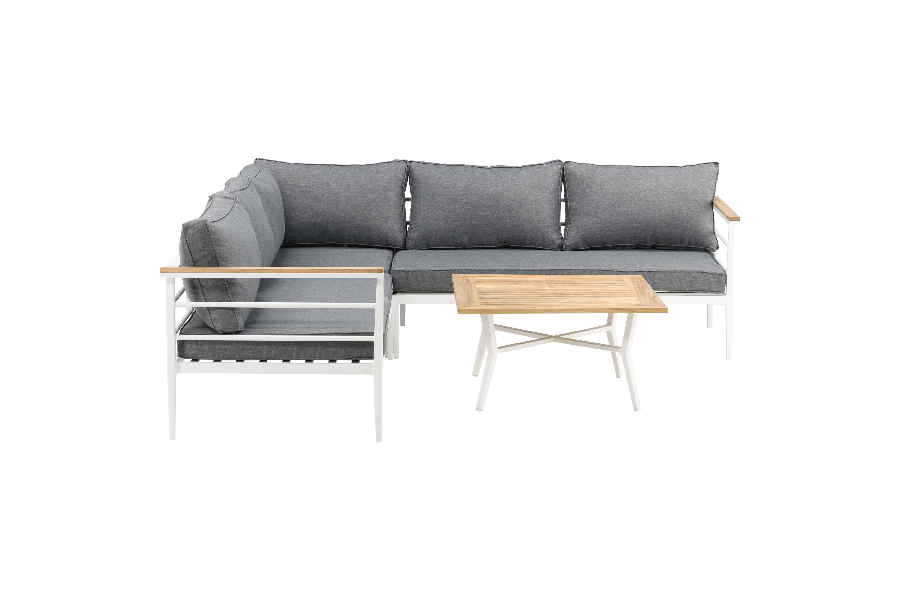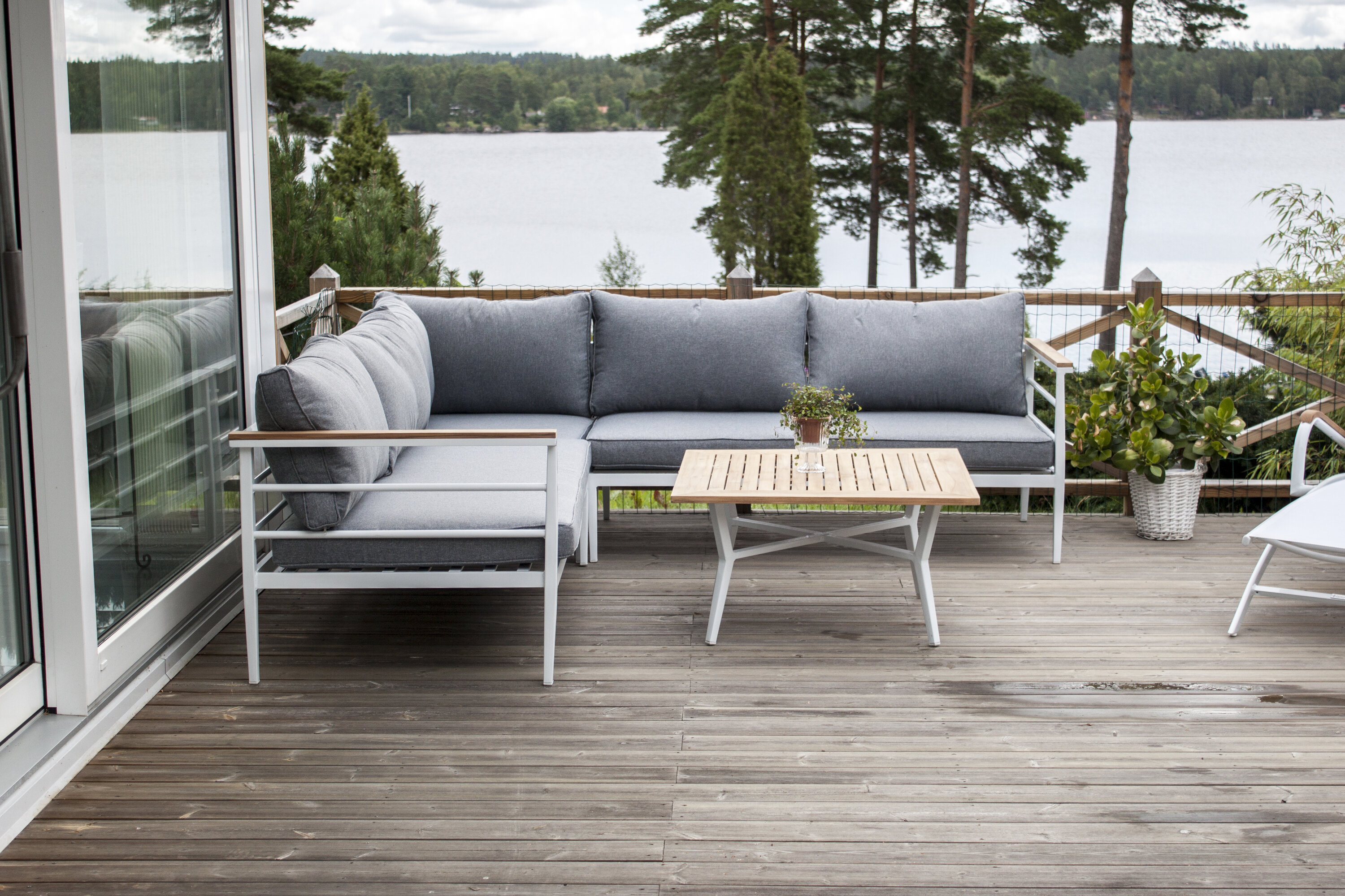 Create a charming centerpiece on the patio to gather loved ones around this summer! Mexico is a beautiful matching, modern sofa group in stylish design and eye -catching design. The corner sofa is made of white powder coated metal frame and has integrated armrests with delicious teak details. Soft gray cushions are included as well as a low coffee table with an undercarriage in white powder coated metal and a teak table top. A sofa group that is guaranteed to make success hot summer evenings! Care advice: Our teak furniture is produced by certified teak that is grown for the purpose and not devastated from delicate rainforest. As one of the most durable woods, teak contains a lot of oil that is usual needed so that the material does not crack. Because the type of wood contains naturally a lot, the furniture does not need to be impregnated as often.