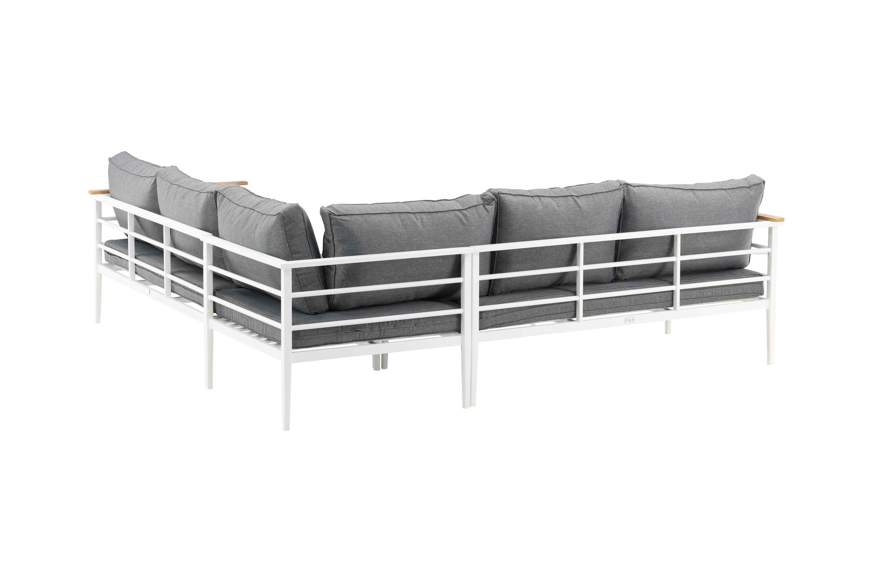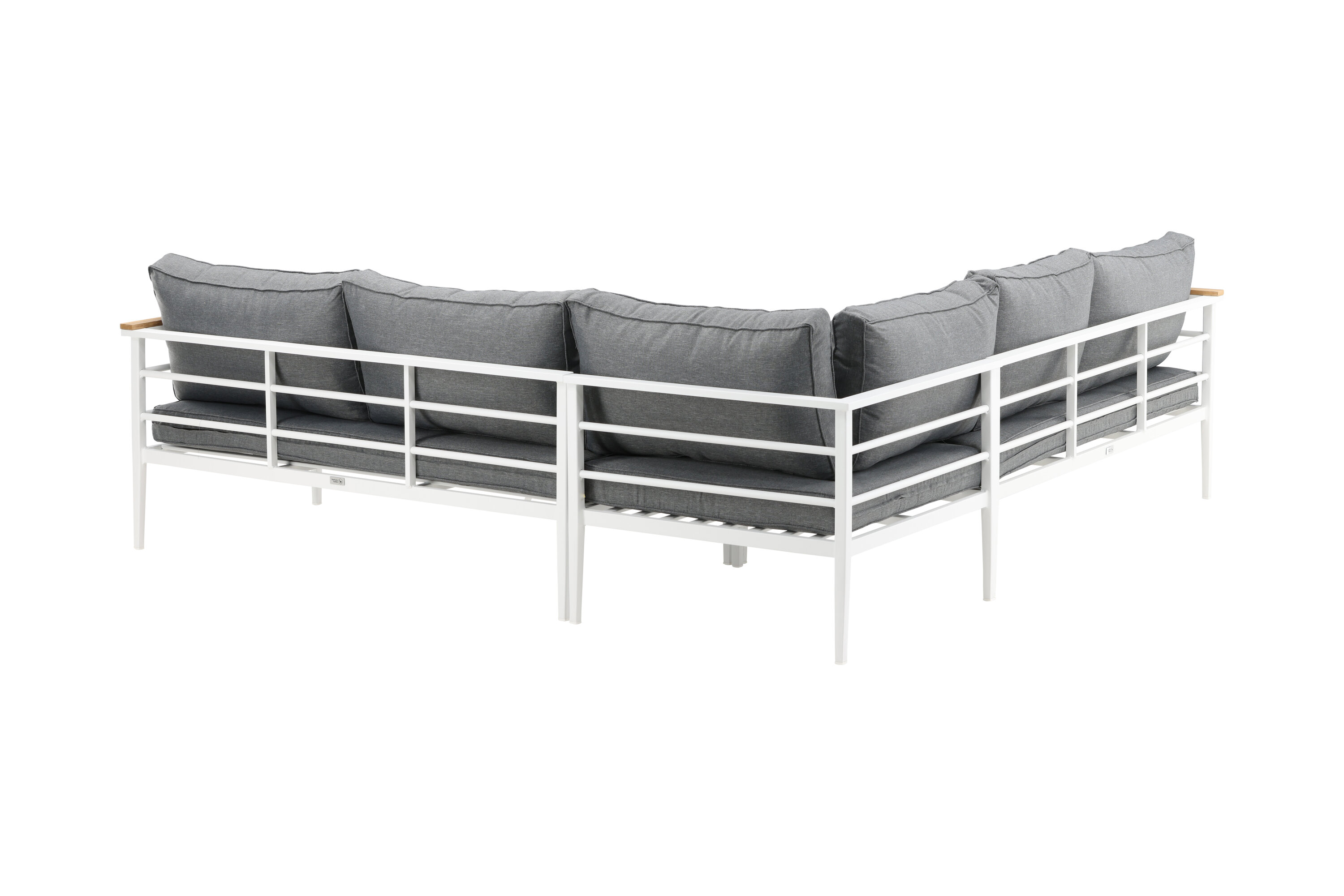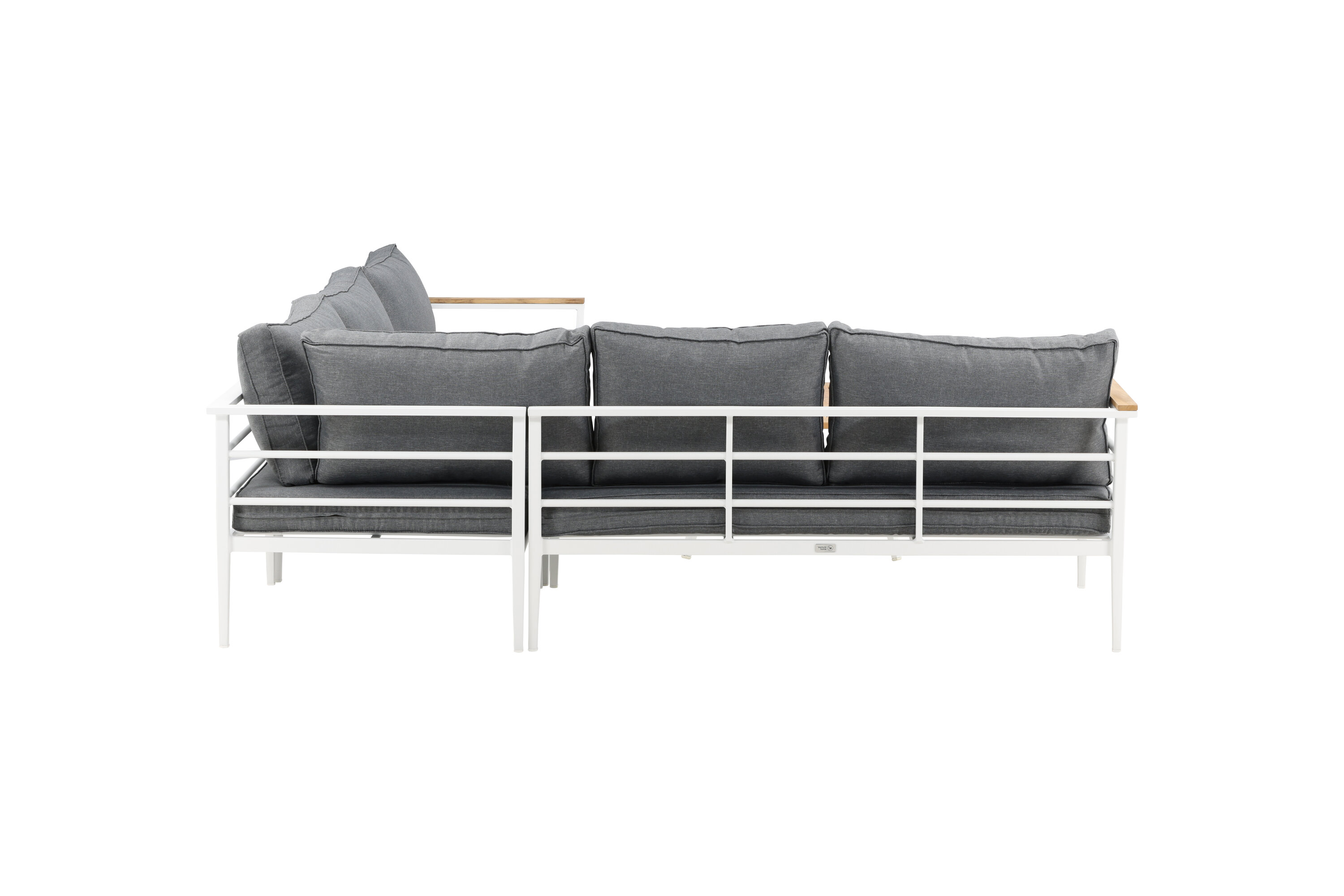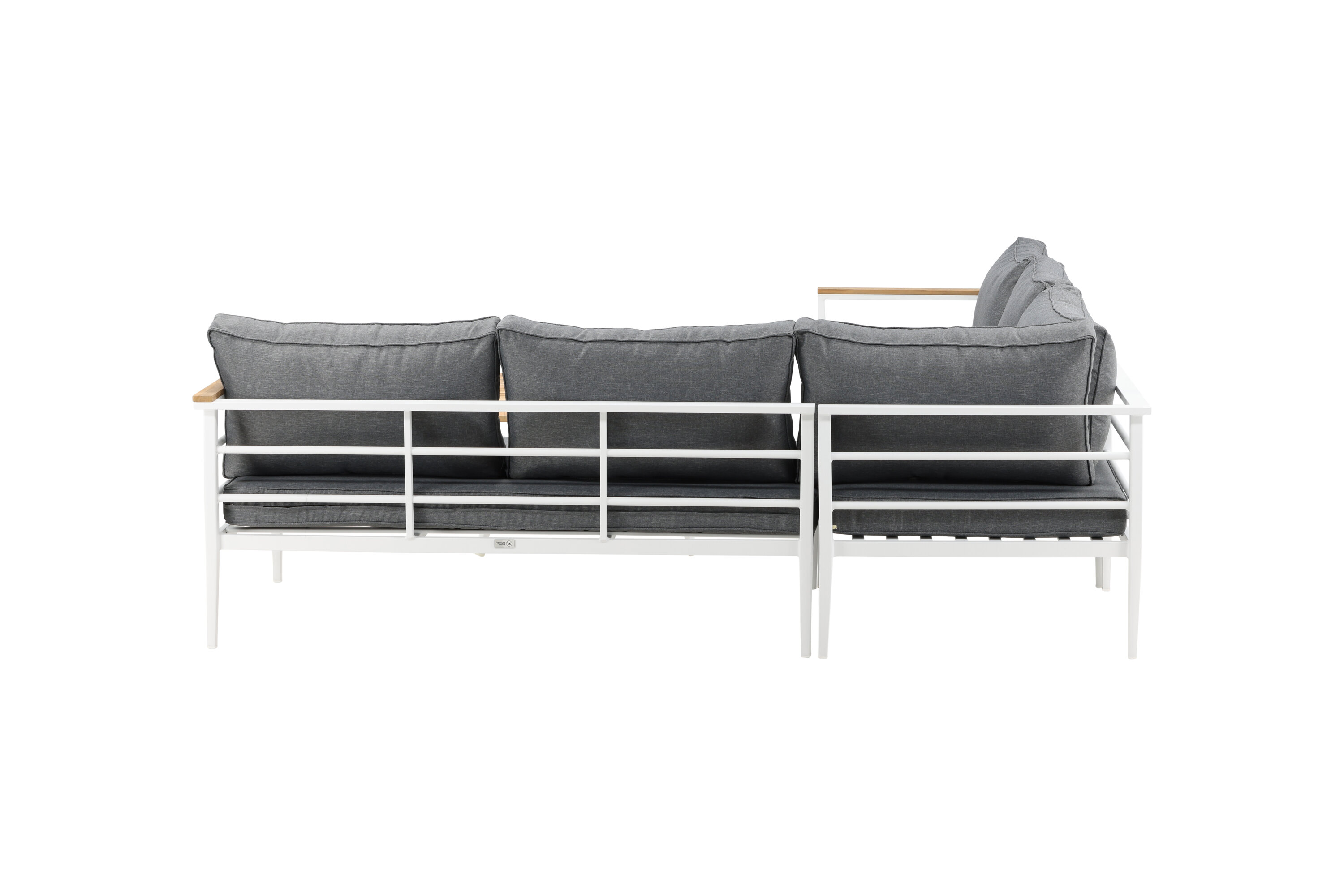 Create a charming centerpiece on the patio to gather loved ones around this summer! Mexico is a beautiful matching, modern sofa group in stylish design and eye -catching design. The corner sofa is made of white powder coated metal frame and has integrated armrests with delicious teak details. Soft gray cushions are included as well as a low coffee table with an undercarriage in white powder coated metal and a teak table top. A sofa group that is guaranteed to make success hot summer evenings! Care advice: Our teak furniture is produced by certified teak that is grown for the purpose and not devastated from delicate rainforest. As one of the most durable woods, teak contains a lot of oil that is usual needed so that the material does not crack. Because the type of wood contains naturally a lot, the furniture does not need to be impregnated as often.