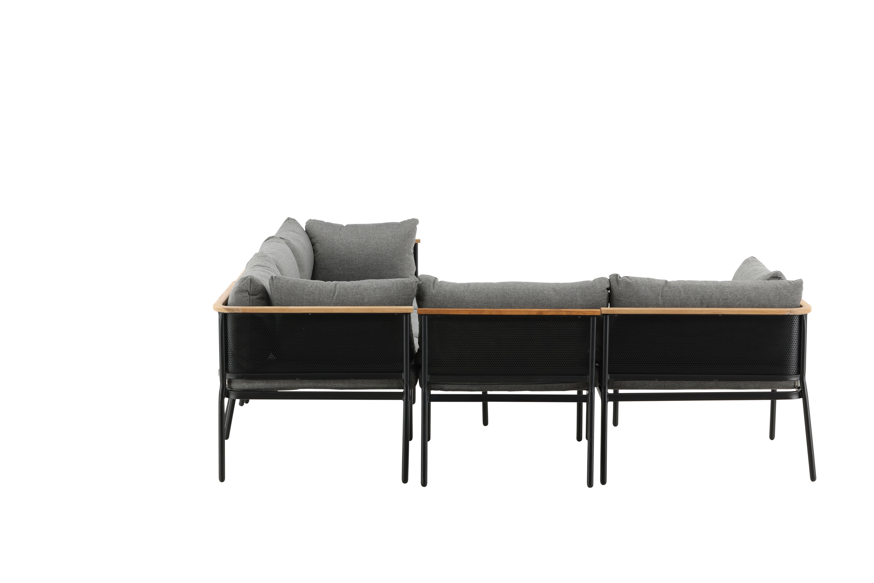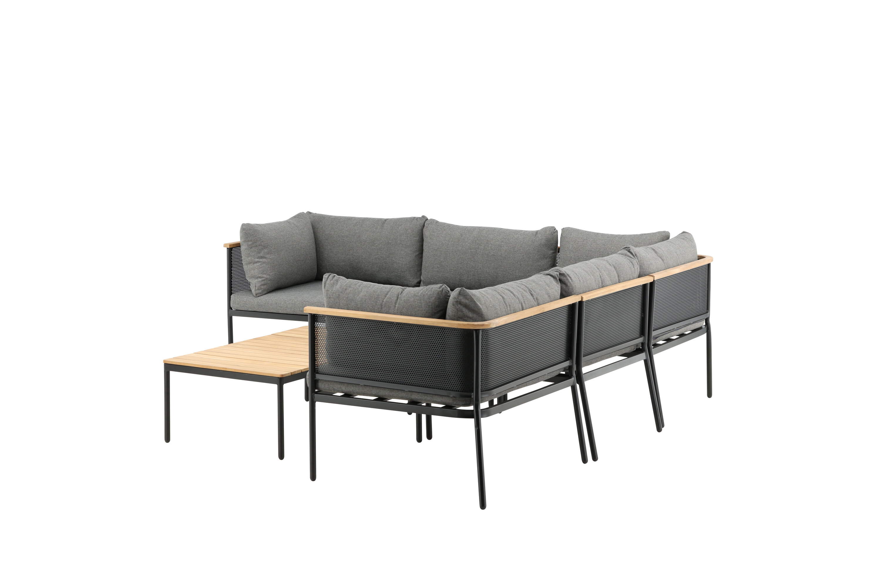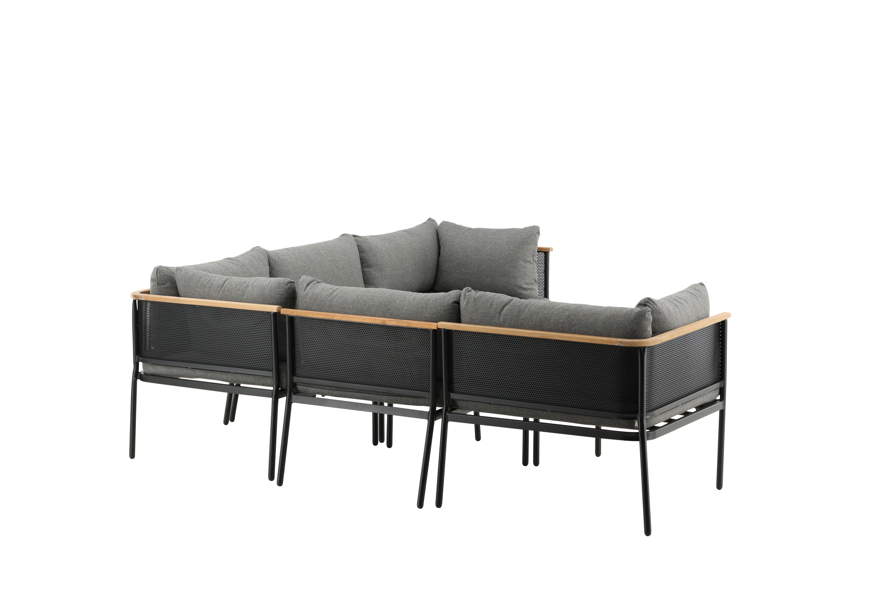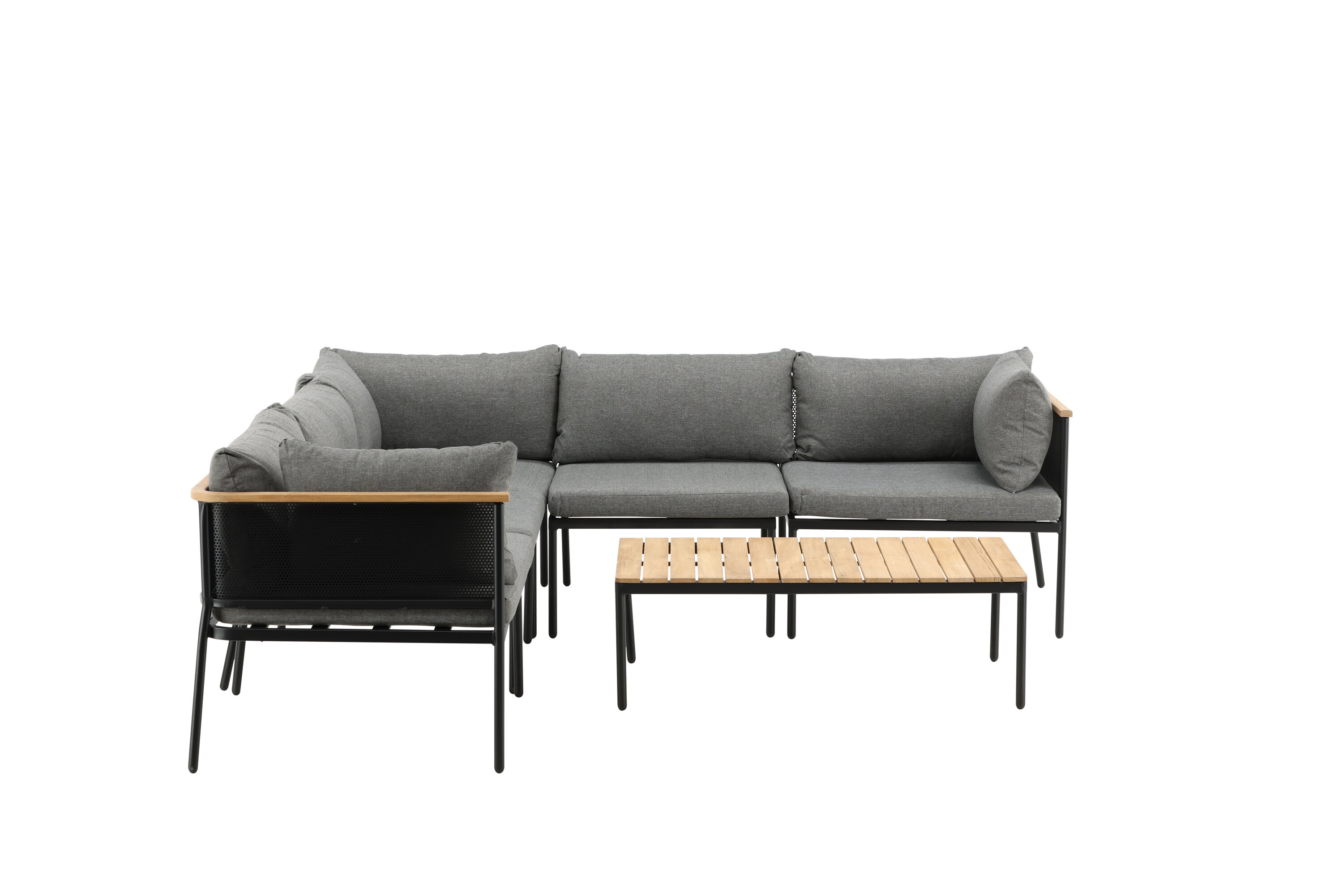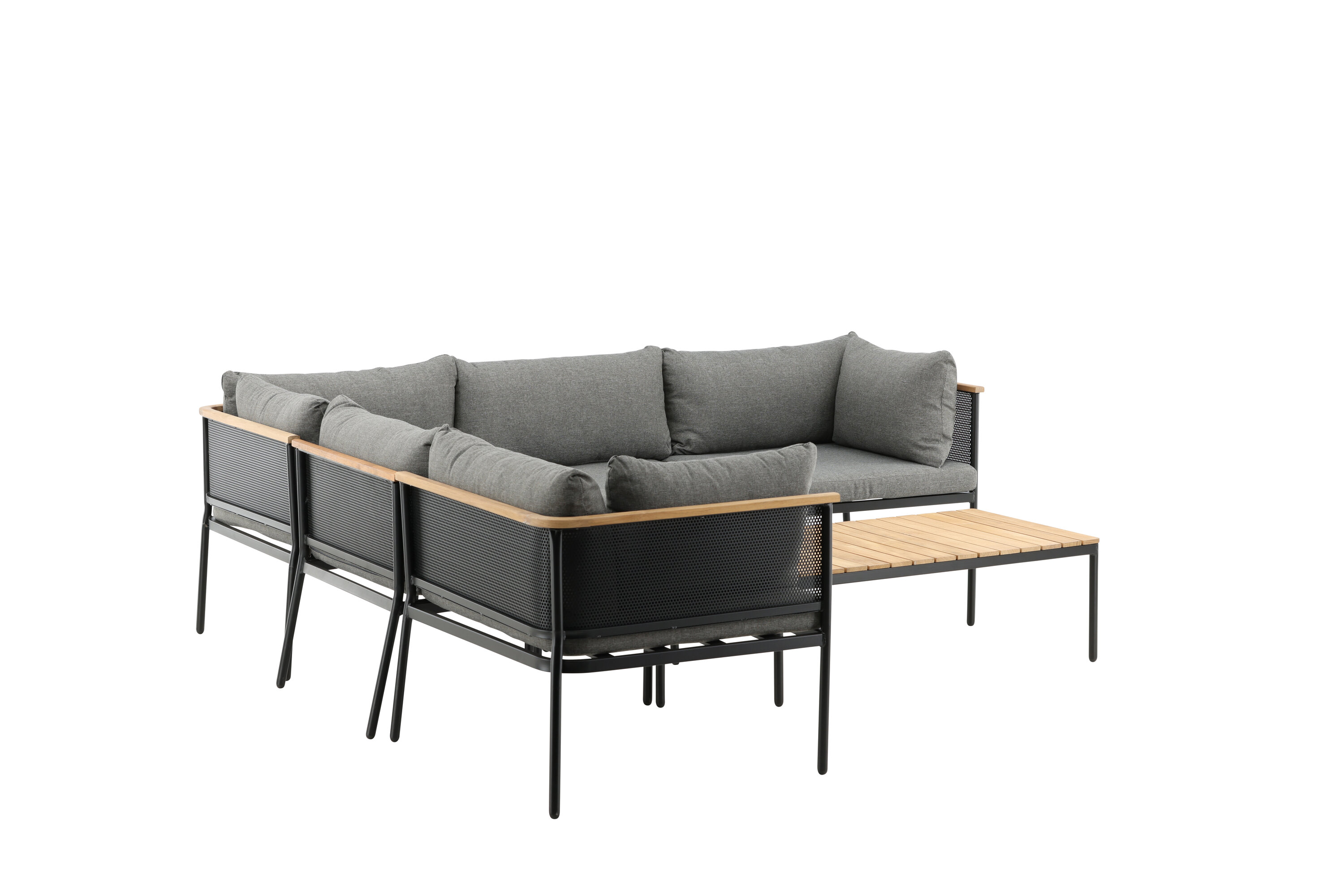 Sofa group in modern stylish design for your patio or patio. The sofa group consists of a corner sofa that is module -based, so you can place it in several ways just as you want it with 3 seats and a corner part. Made of black powder coated metal and details in black metal nets and teak including soft gray cushions as well as a rectangular coffee table with a teak table top. Lighter assembly is required.