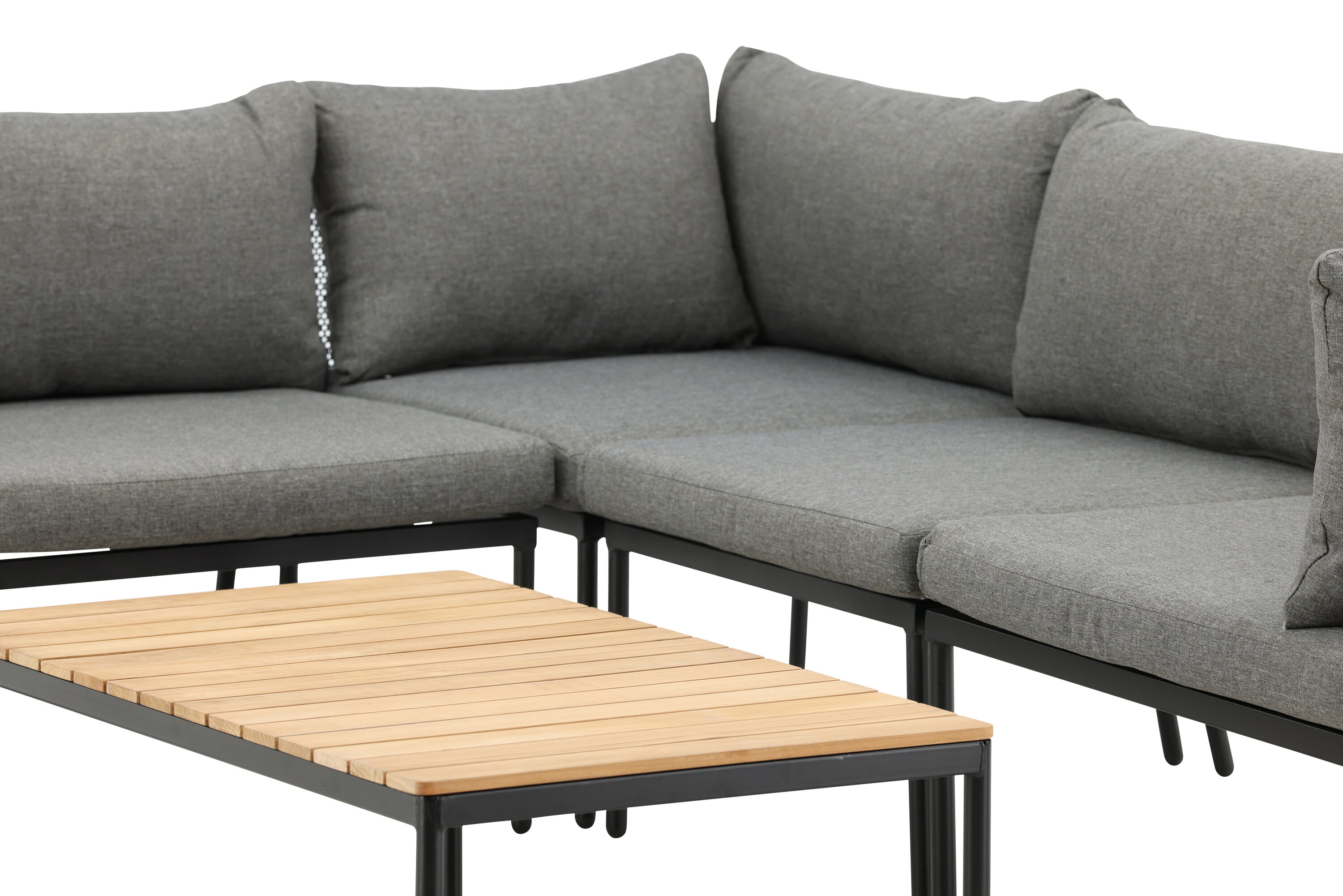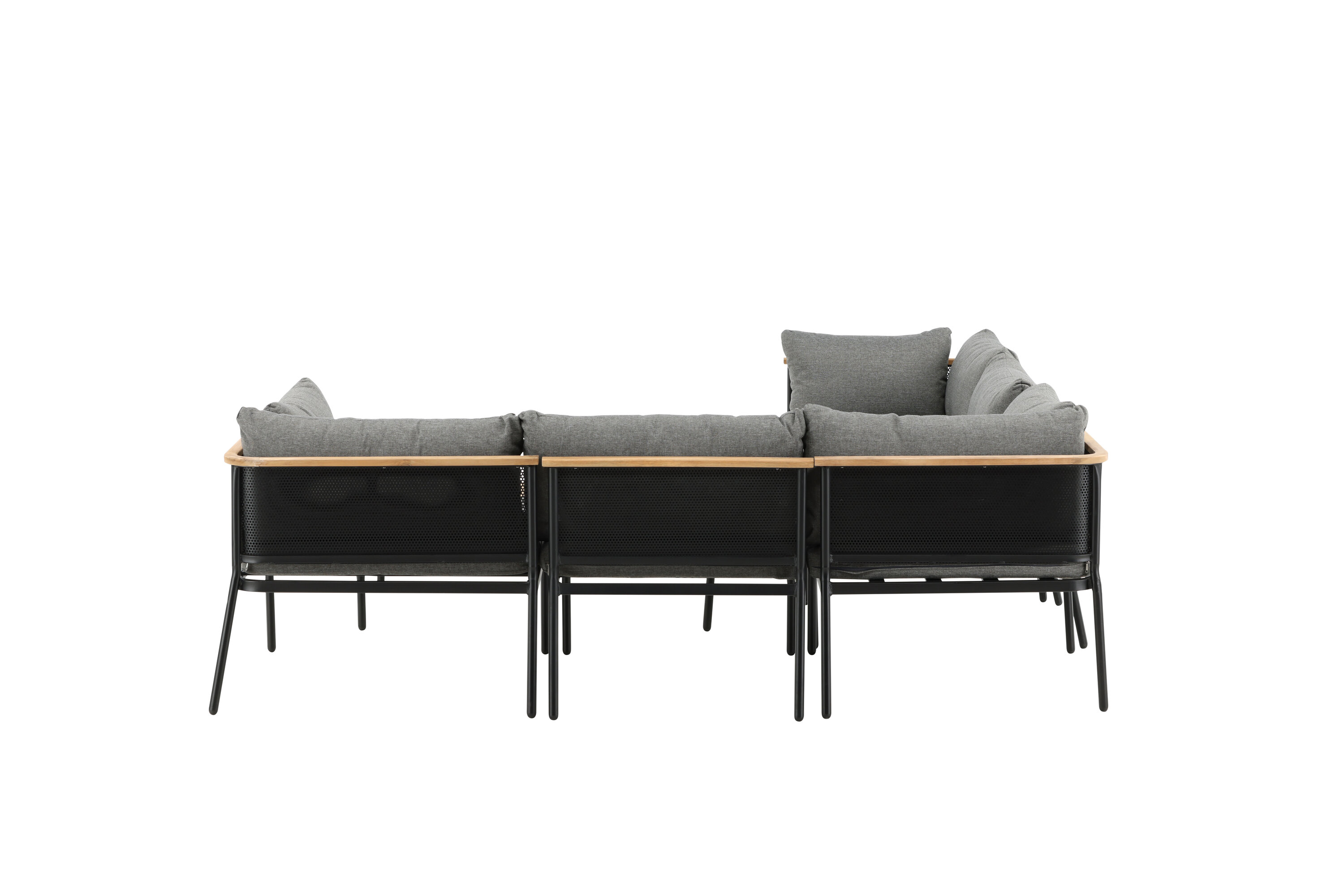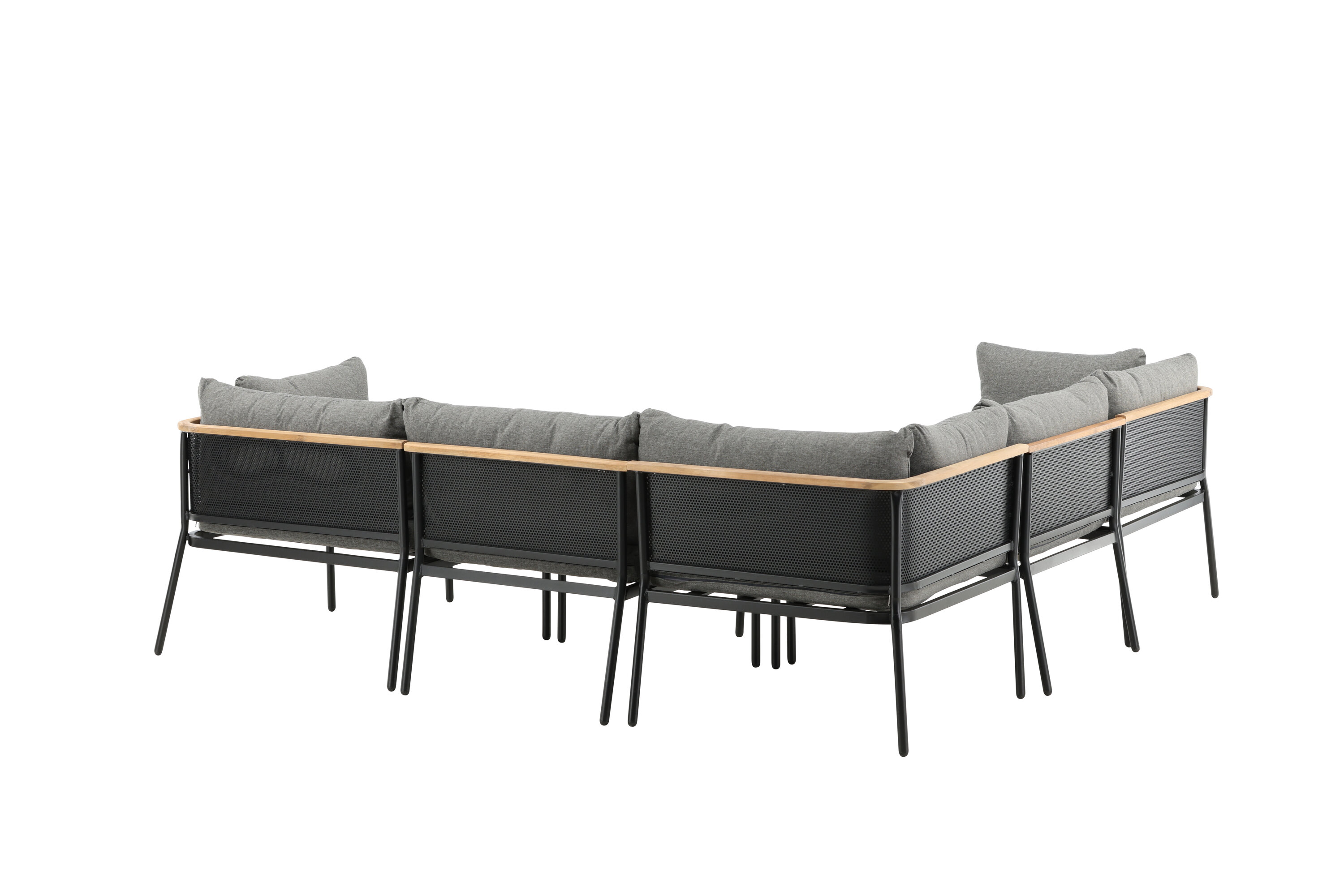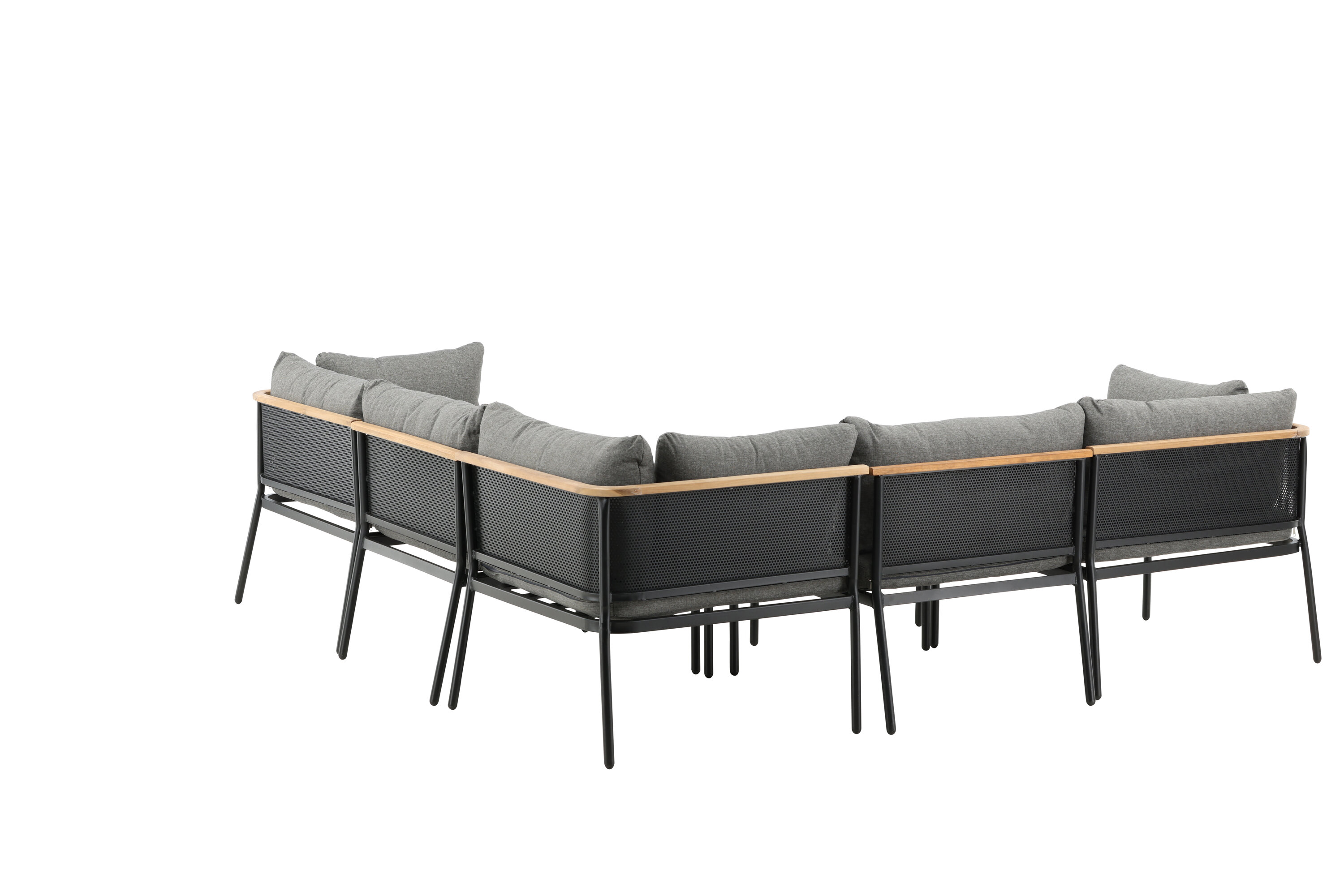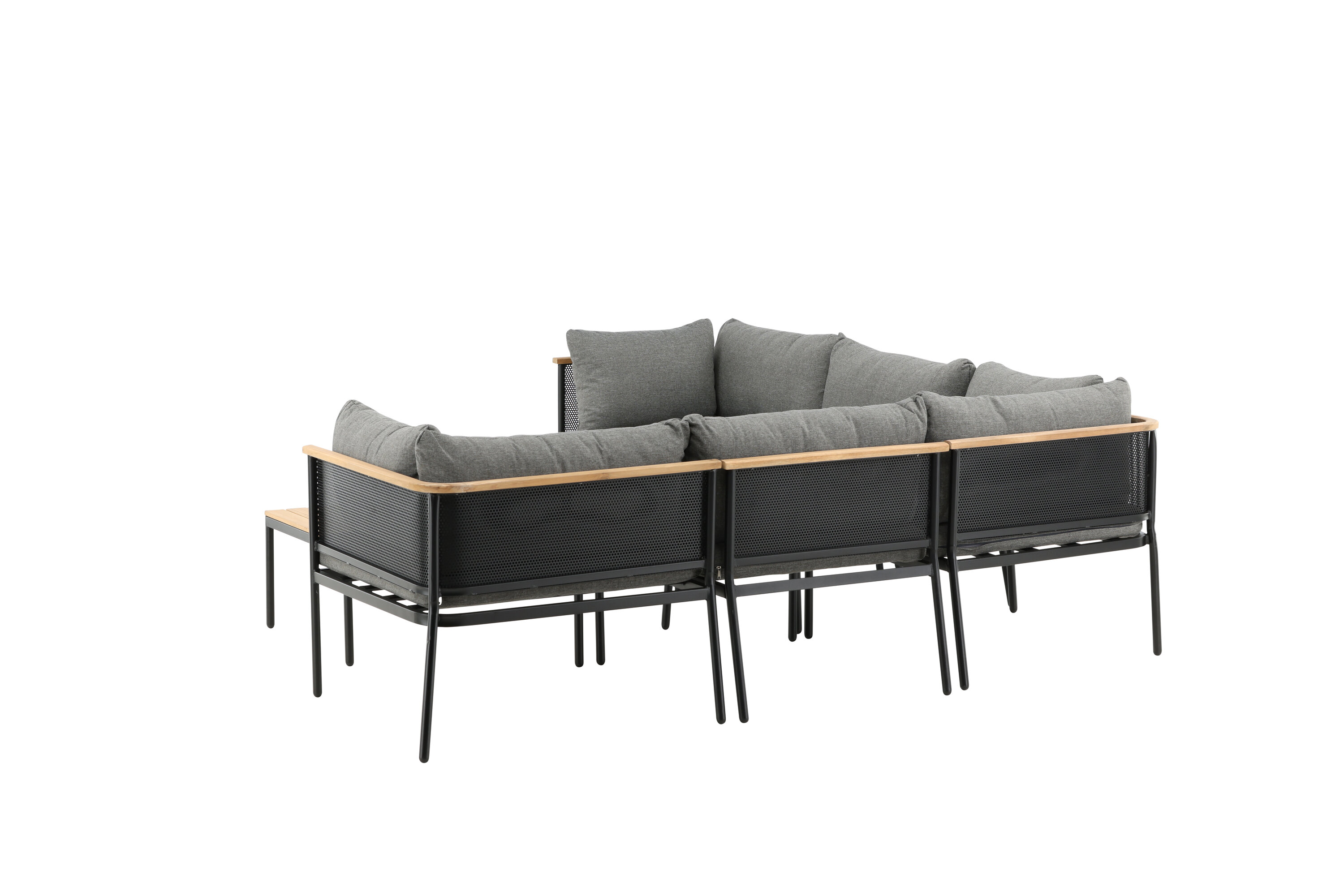 Sofa group in modern stylish design for your patio or patio. The sofa group consists of a corner sofa that is module -based, so you can place it in several ways just as you want it with 3 seats and a corner part. Made of black powder coated metal and details in black metal nets and teak including soft gray cushions as well as a rectangular coffee table with a teak table top. Lighter assembly is required.