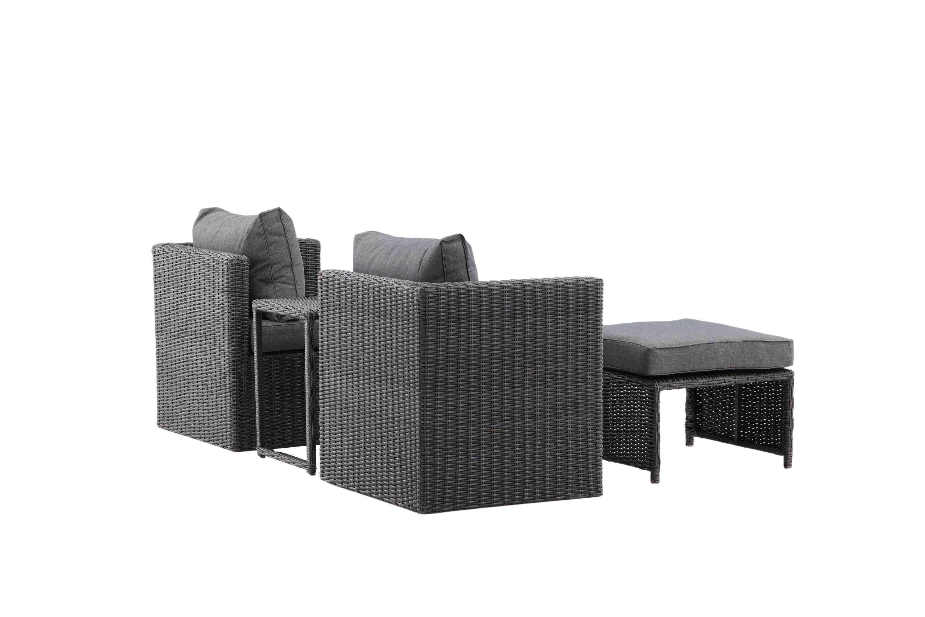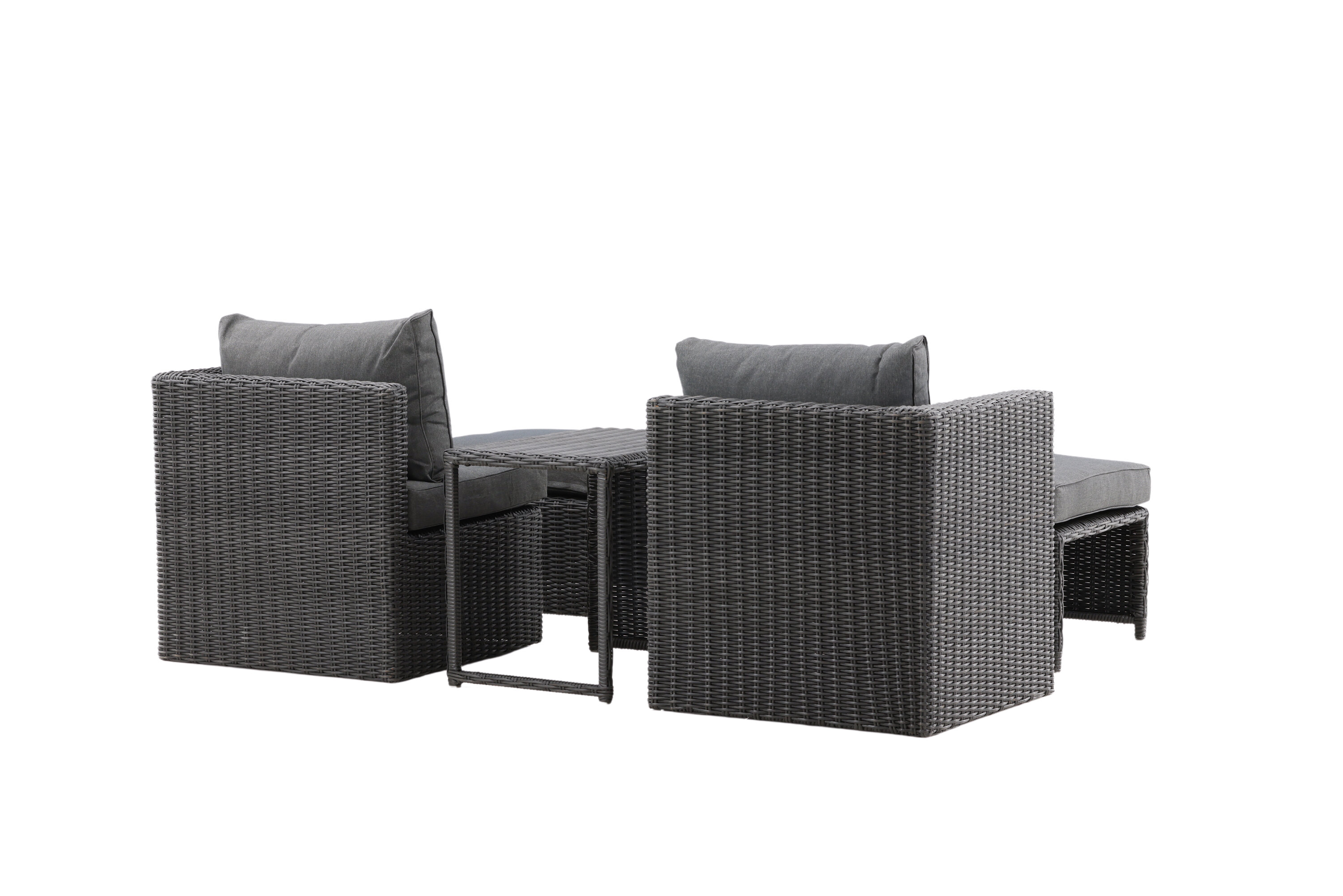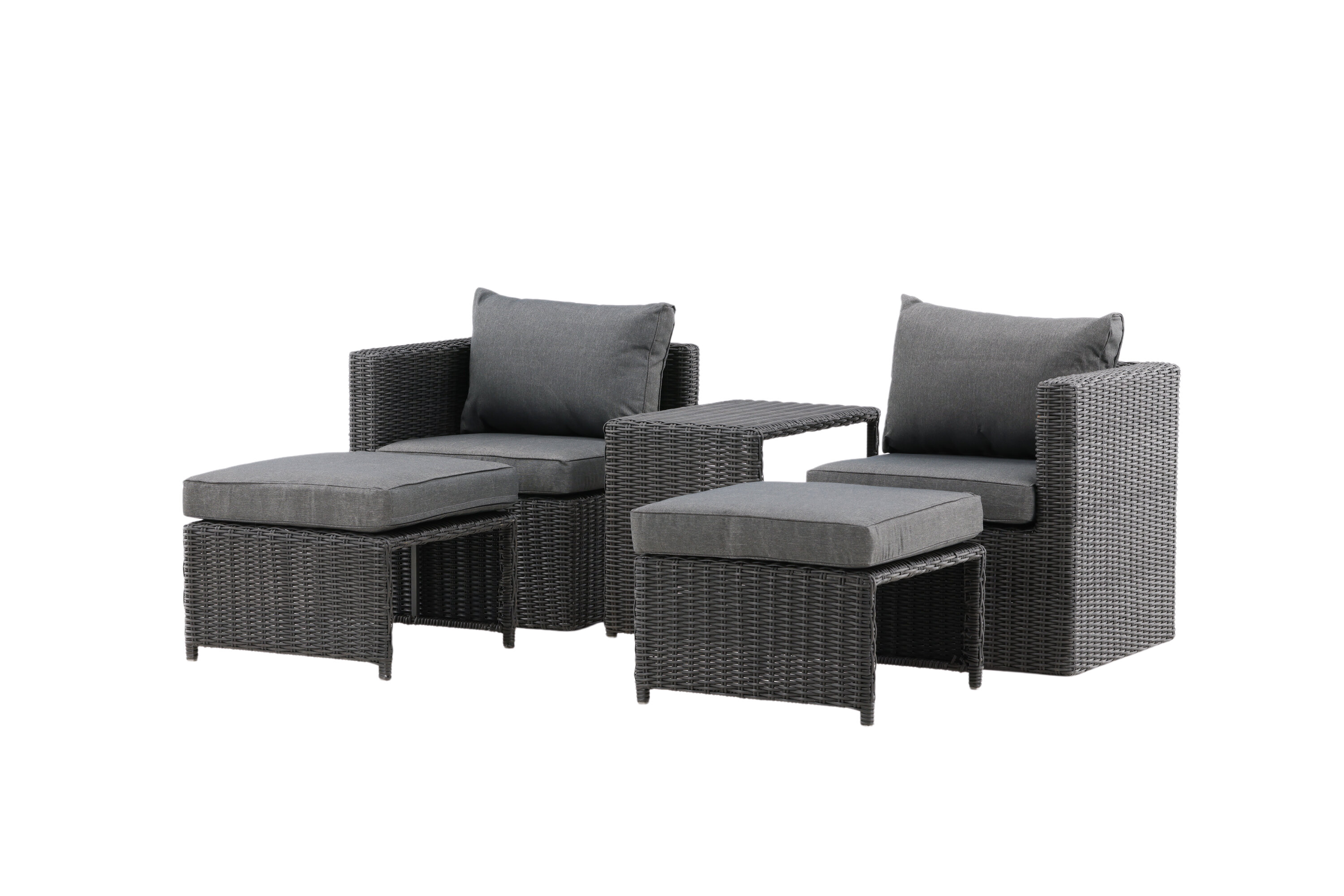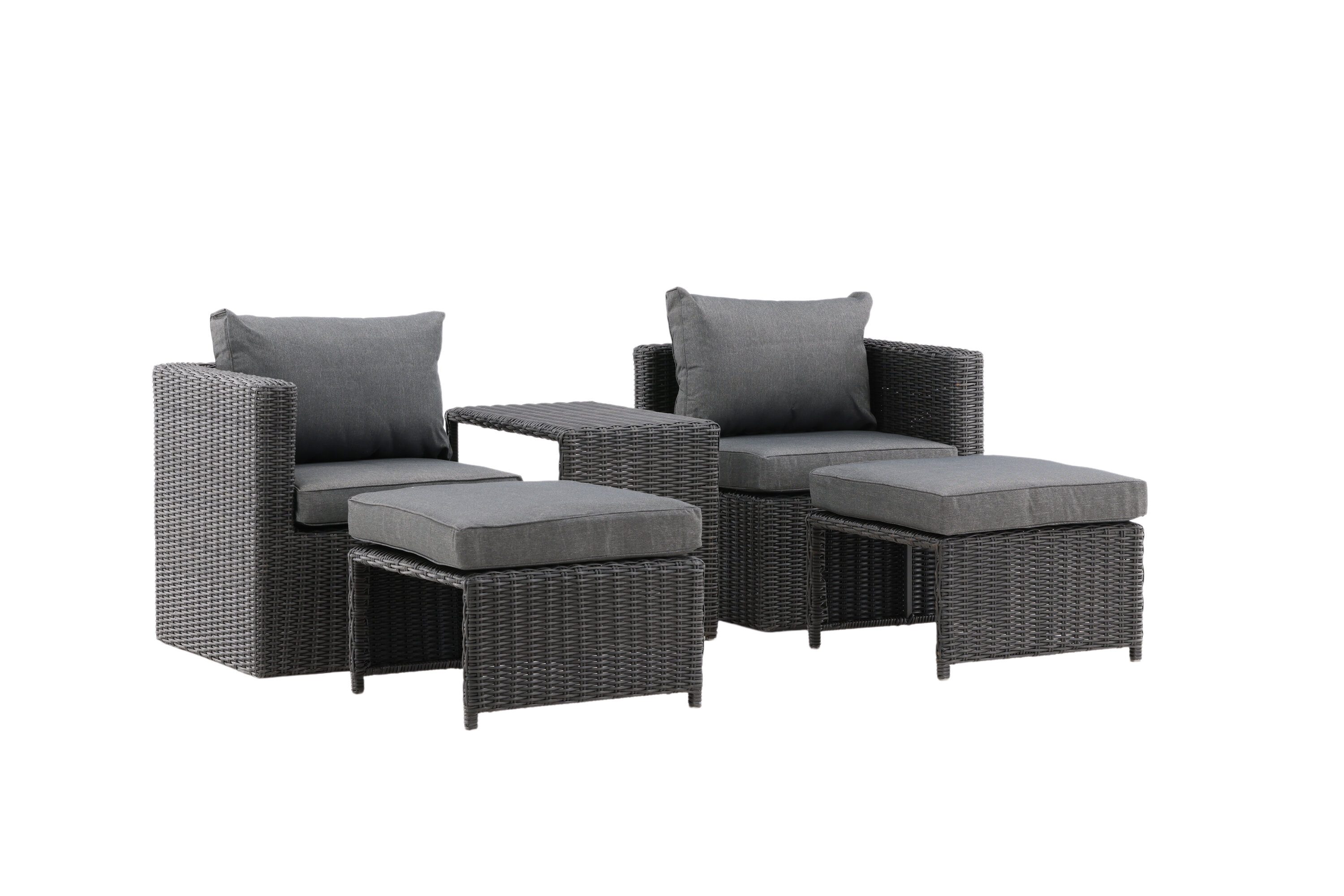 Create the perfect atmosphere on the patio this summer! This inviting sofa group consists of two armchairs with footstools, a smaller table and soft black cushions - all made of timeless black artificial rattan and durable fabric. Here you are offered the clockwise combination of luxurious design and high comfort - enjoy a comfortable time this summer! Care advice: Konstrite is a plastic material that is perfect for our Scandinavian climate. The material is UV-resistant and can withstand weather and wind. The fact that it is UV-resistant means that the furniture does not fade, however, we always recommend storing the furniture under a furniture protection or otherwise dry and cool-to extend the service life.