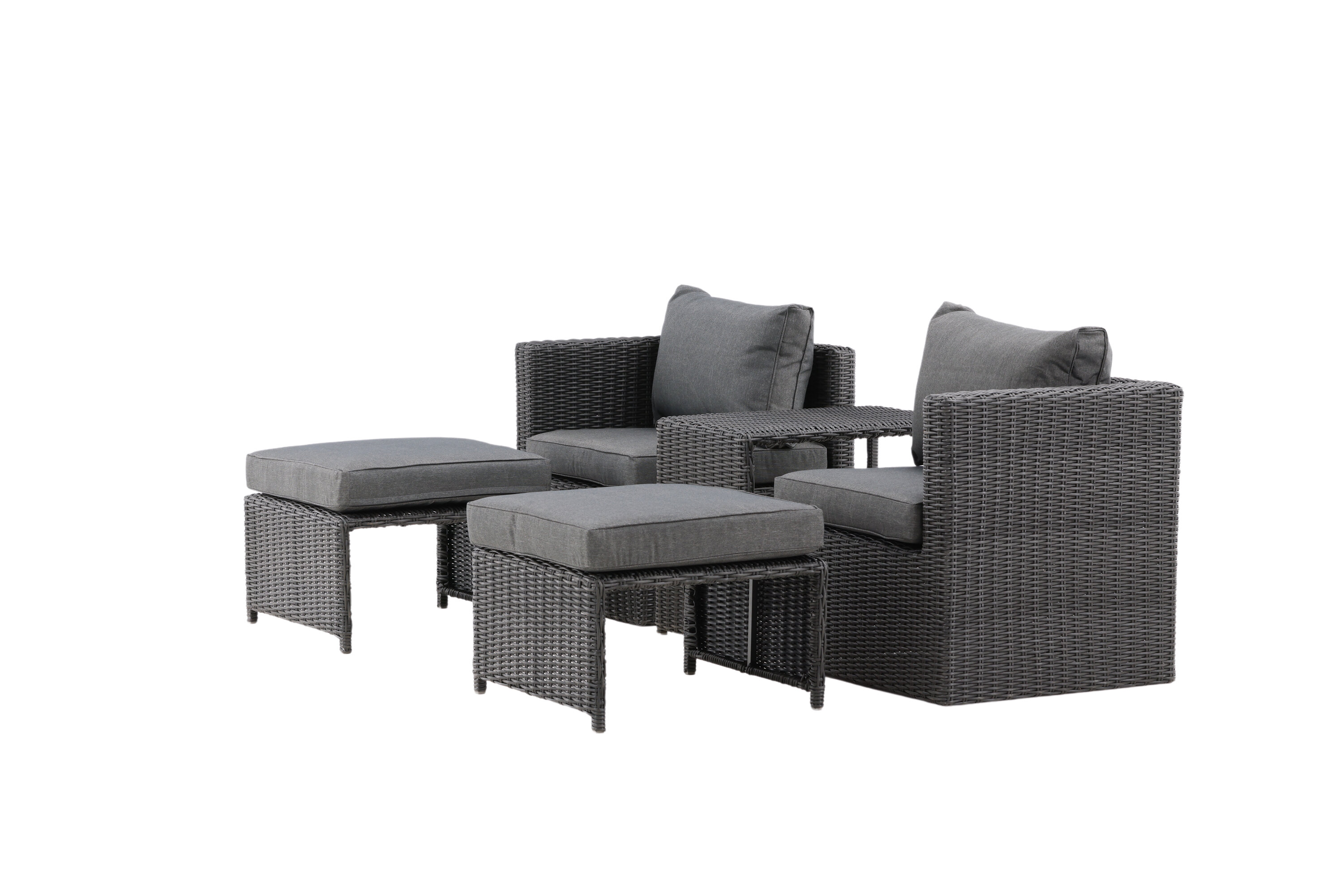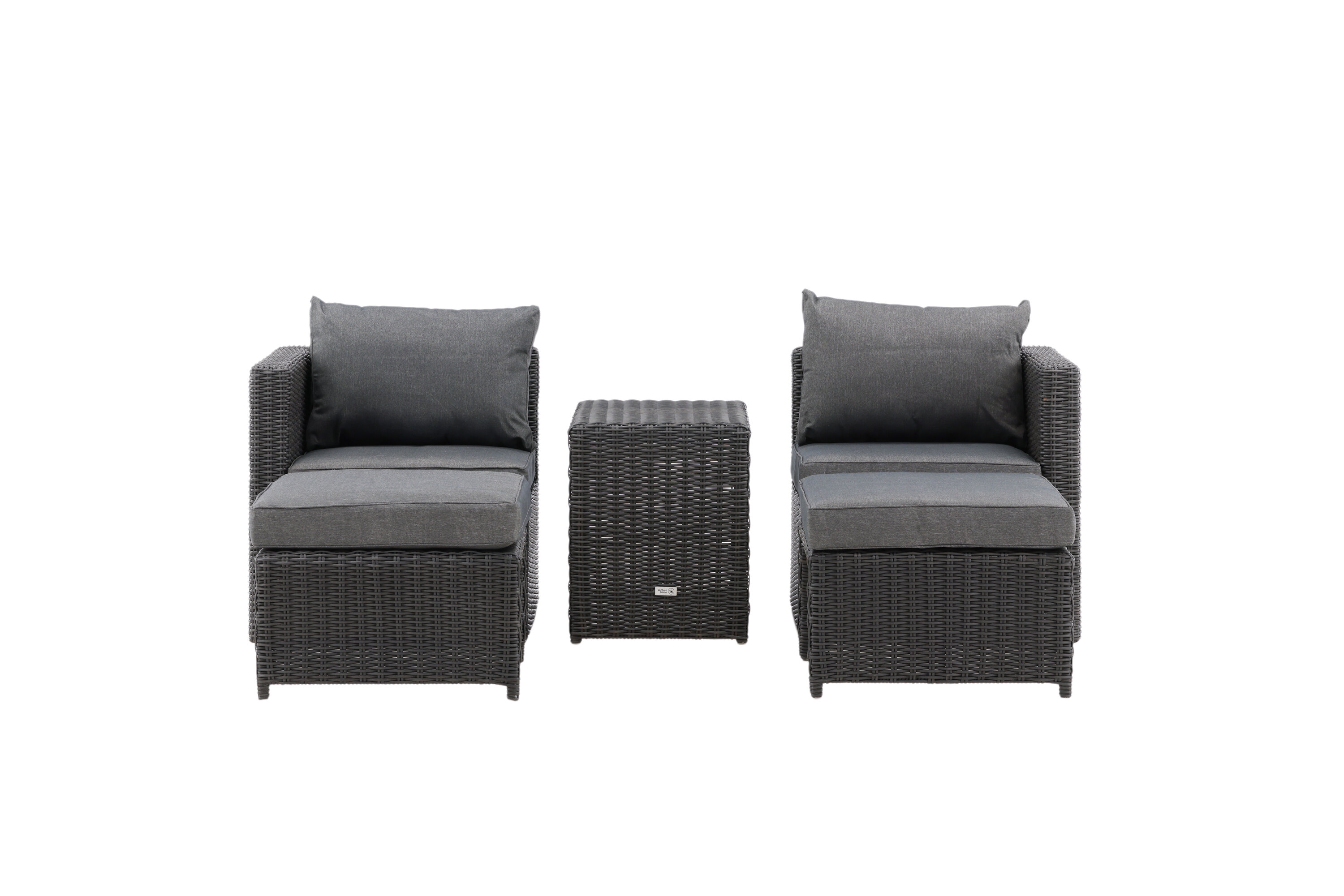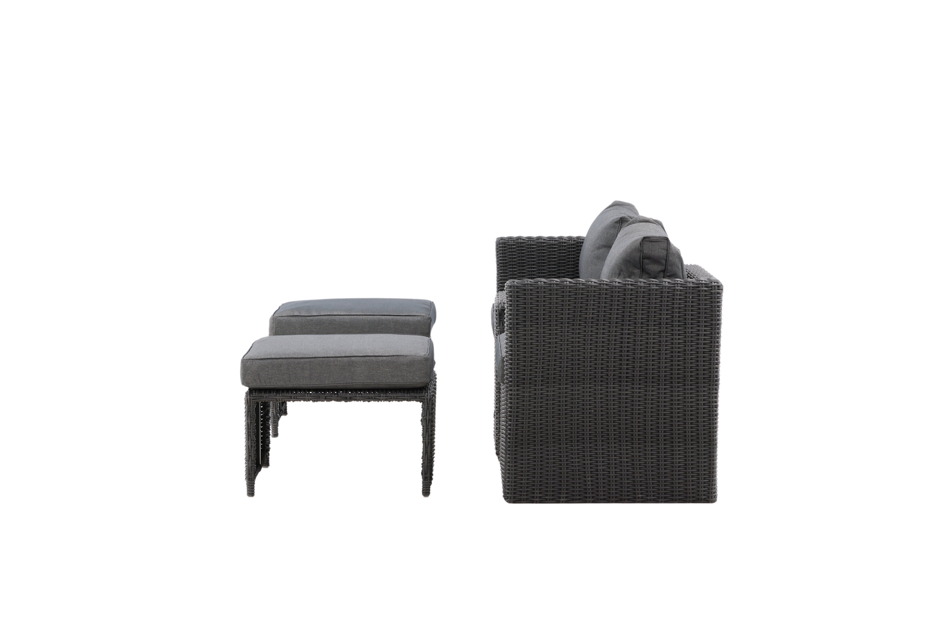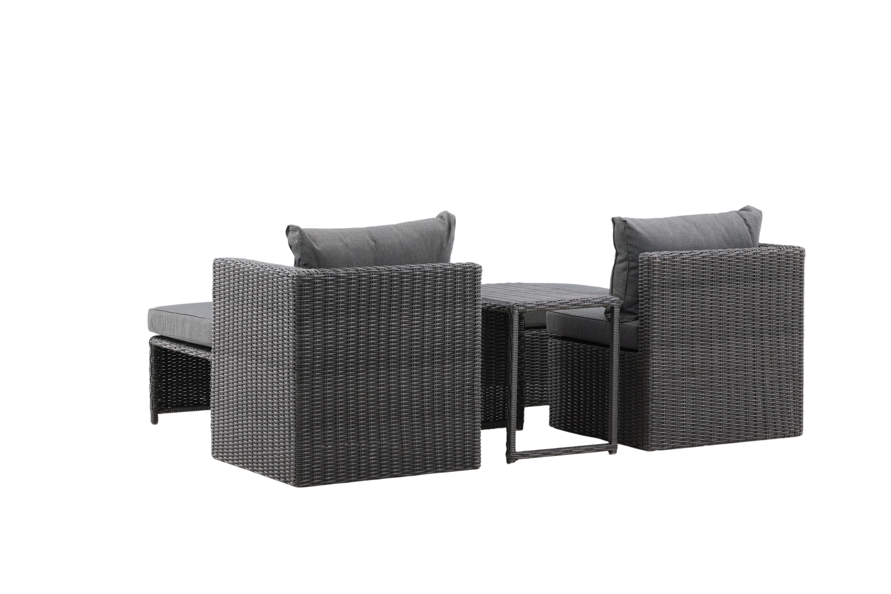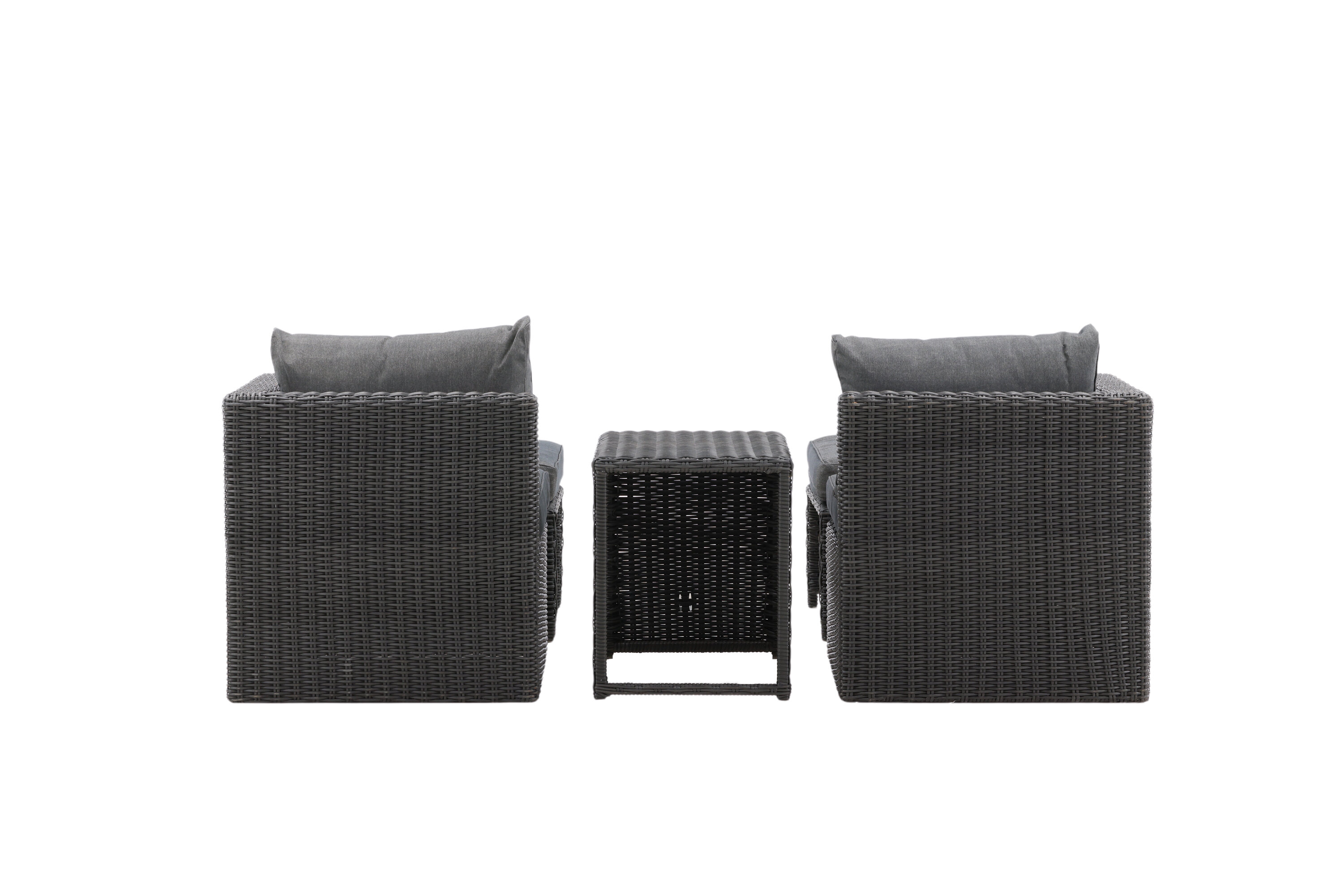 Create the perfect atmosphere on the patio this summer! This inviting sofa group consists of two armchairs with footstools, a smaller table and soft black cushions - all made of timeless black artificial rattan and durable fabric. Here you are offered the clockwise combination of luxurious design and high comfort - enjoy a comfortable time this summer! Care advice: Konstrite is a plastic material that is perfect for our Scandinavian climate. The material is UV-resistant and can withstand weather and wind. The fact that it is UV-resistant means that the furniture does not fade, however, we always recommend storing the furniture under a furniture protection or otherwise dry and cool-to extend the service life.