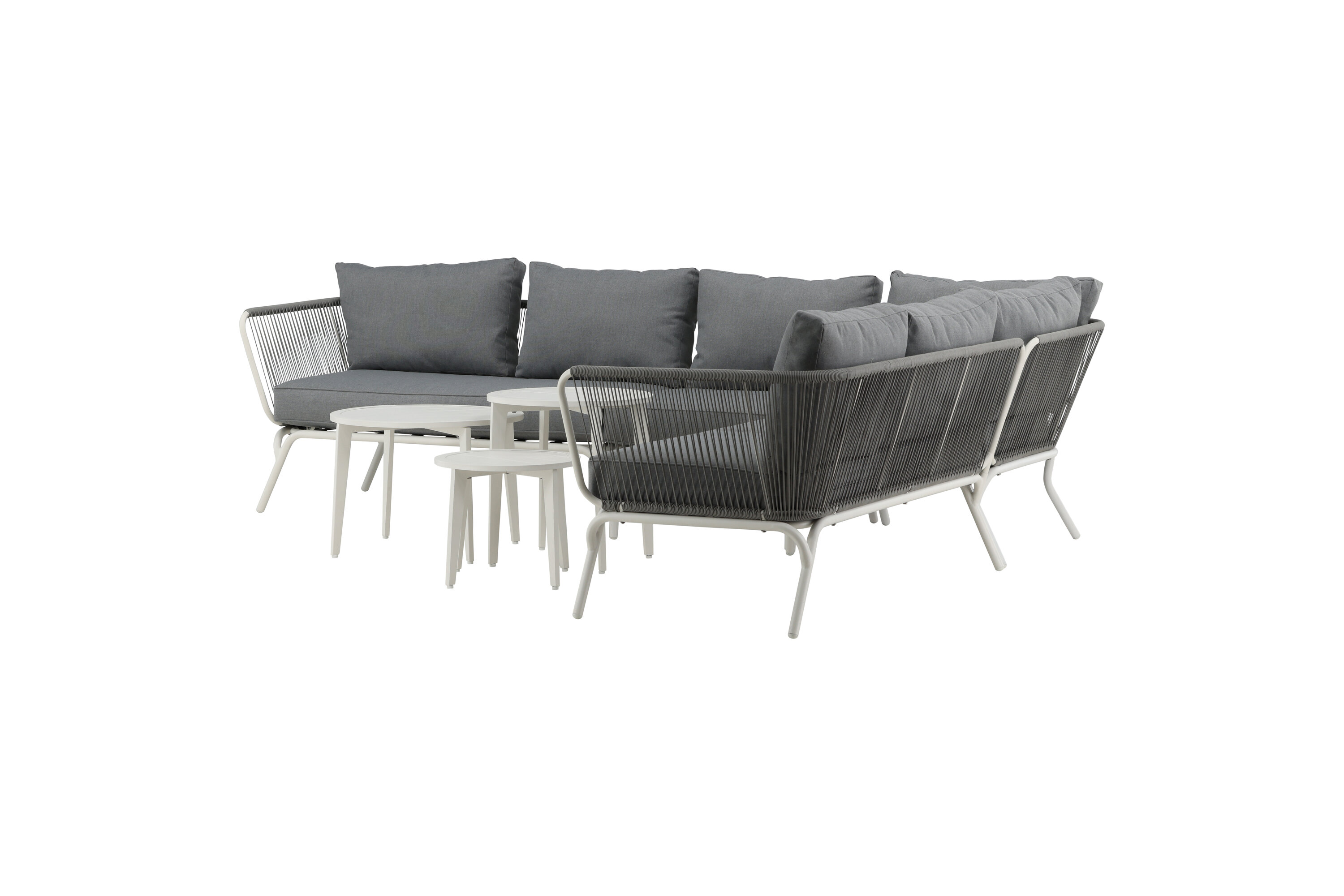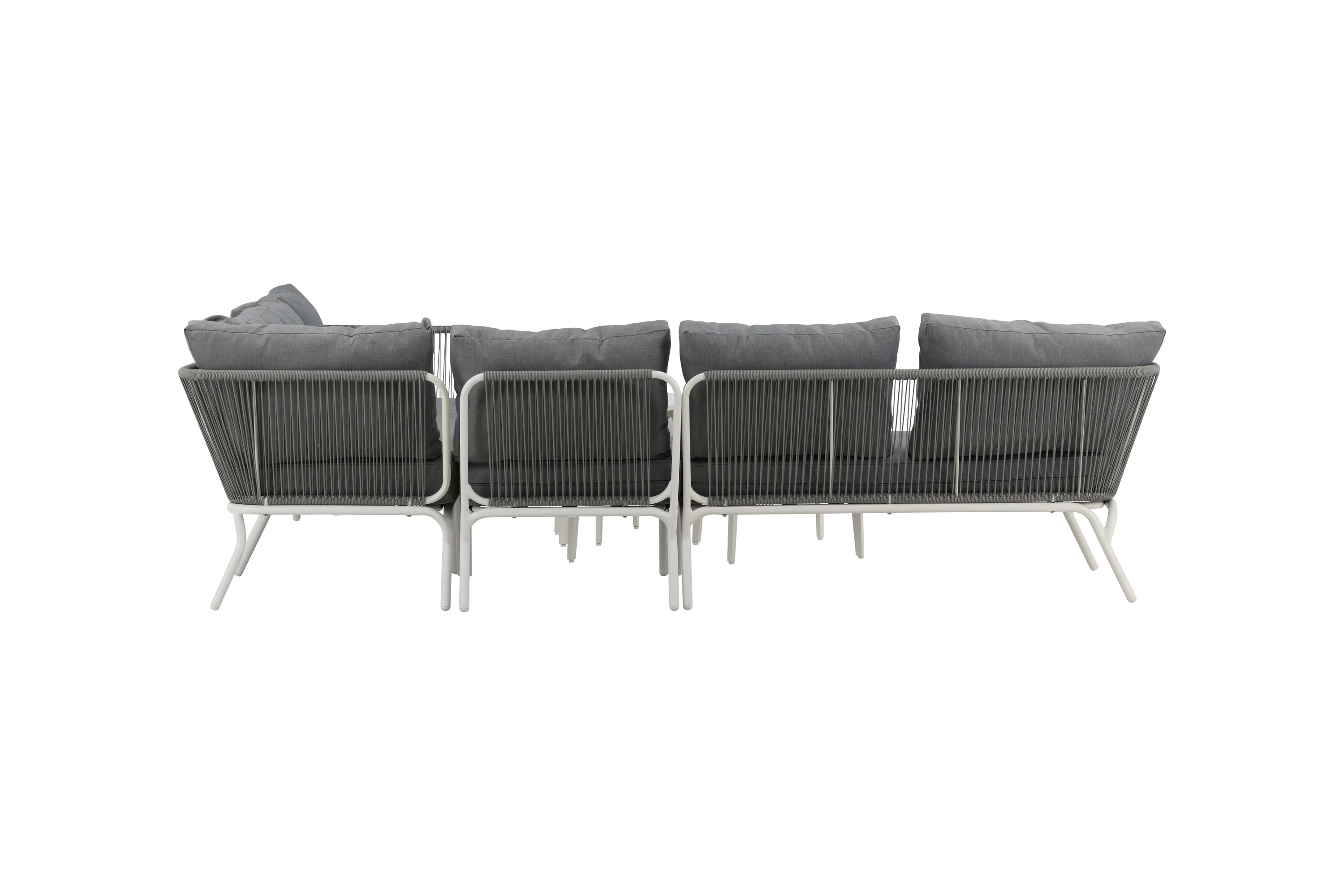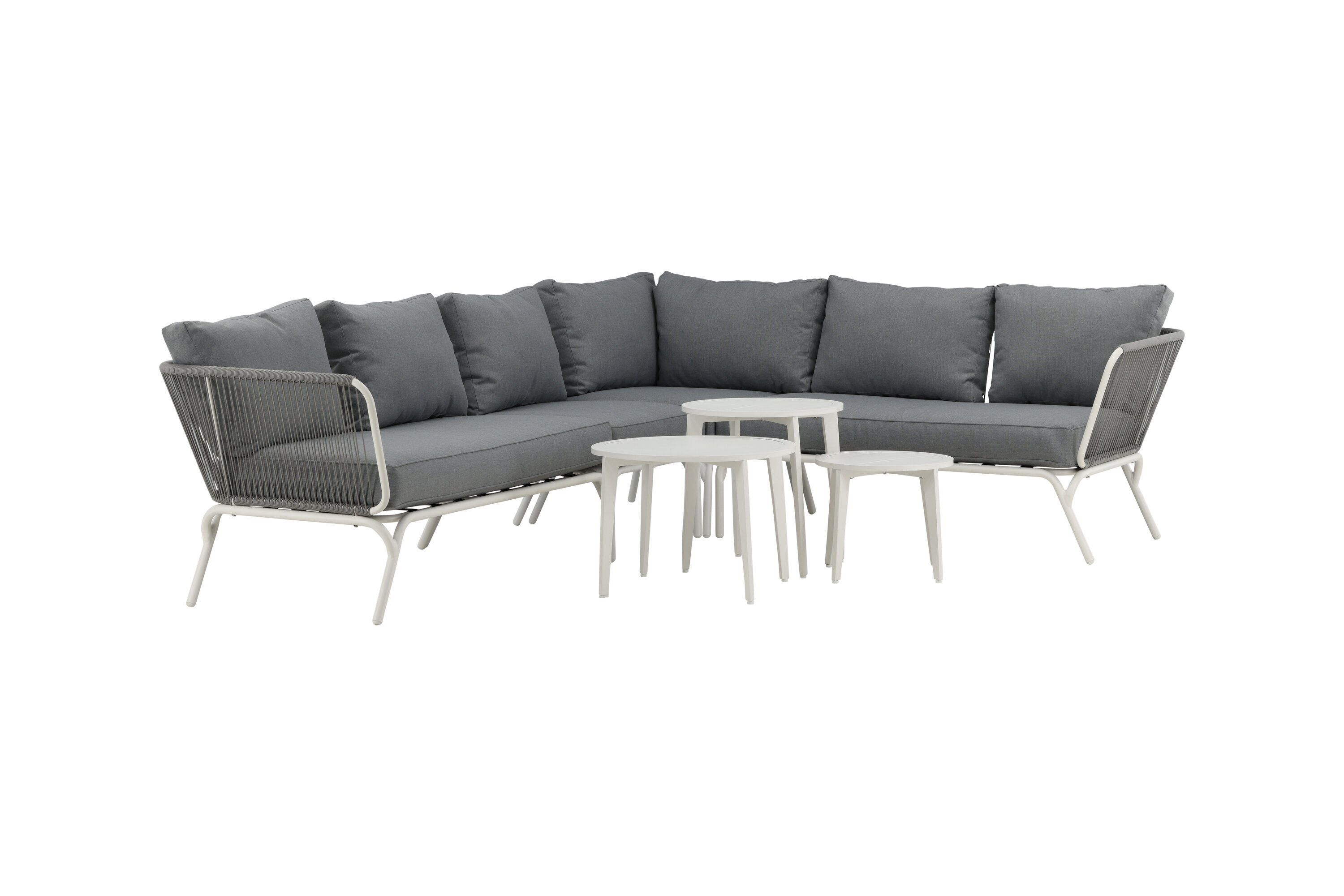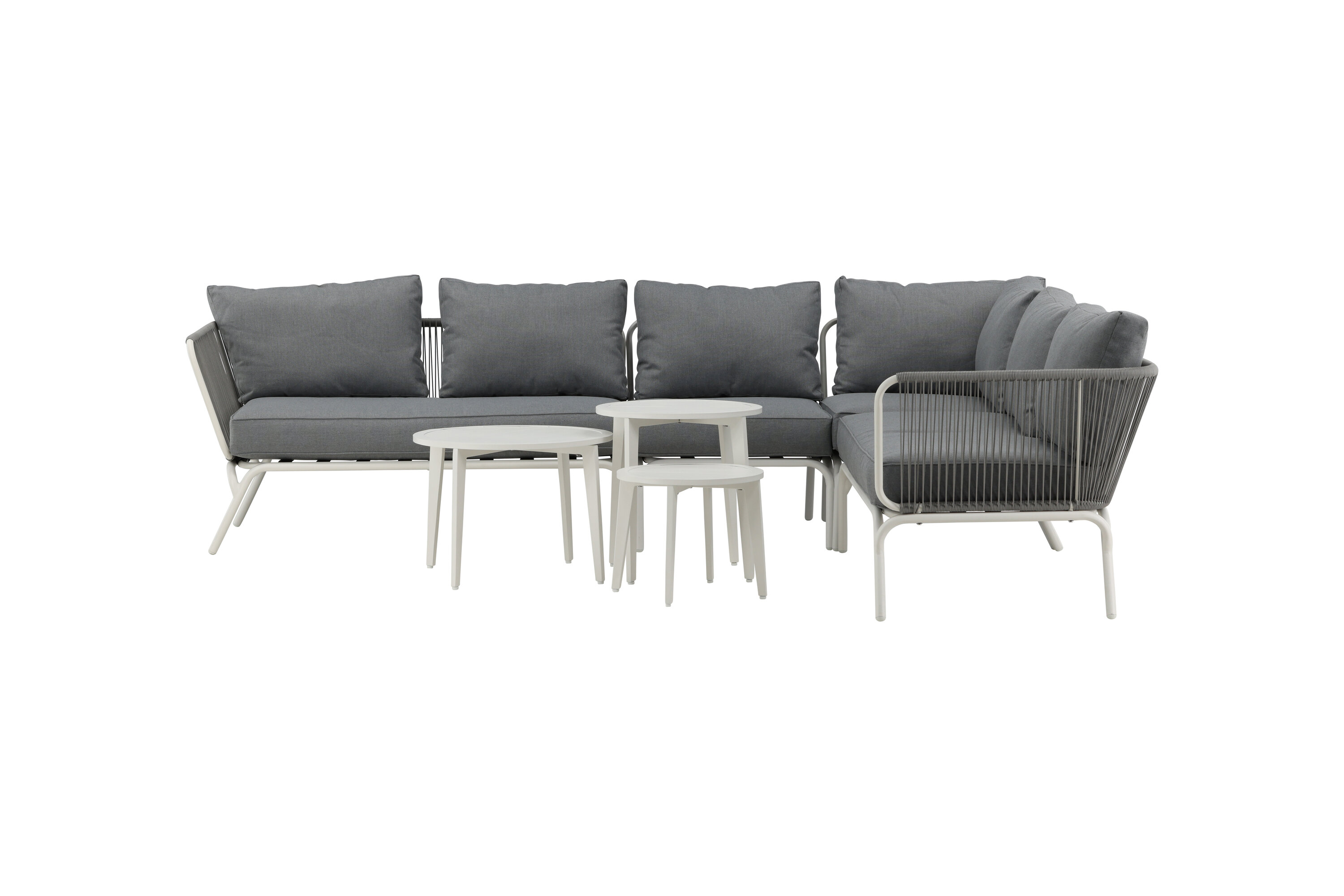 Create a cozy place to gather loved ones around this summer - here you sit relaxed and comfortable for hours! Roxo is a trendy sofa group in stylish design that is great for the patio or outdoor space. The sofa group consists of a corner sofa with 5 sit places and a corner part, made of a durable design in white powder coated metal with a back designed in light gray rope and stylish batch table in three parts in white powder coated metal. Gray soft cushions are included for the sofa group! Care advice: Outdoor furniture in aluminum and stainless steel should be cleaned regularly with water and mild soap. Always rinse thoroughly with plenty of water, which becomes extra important if the furniture is placed at a sea -close distance where salt can be transported through the air.