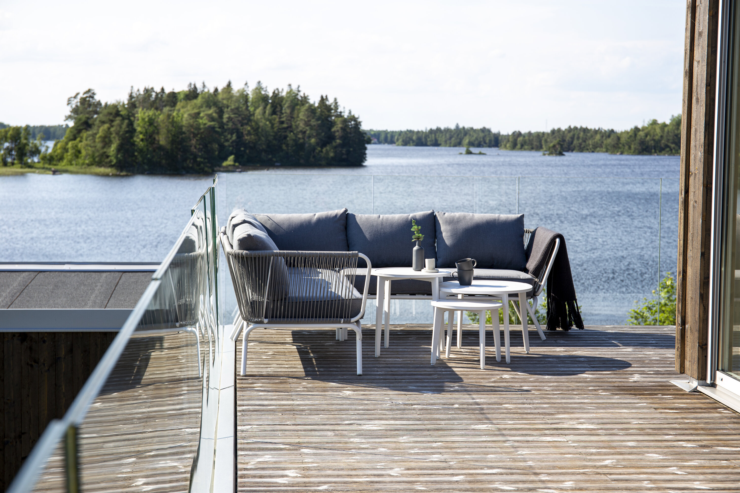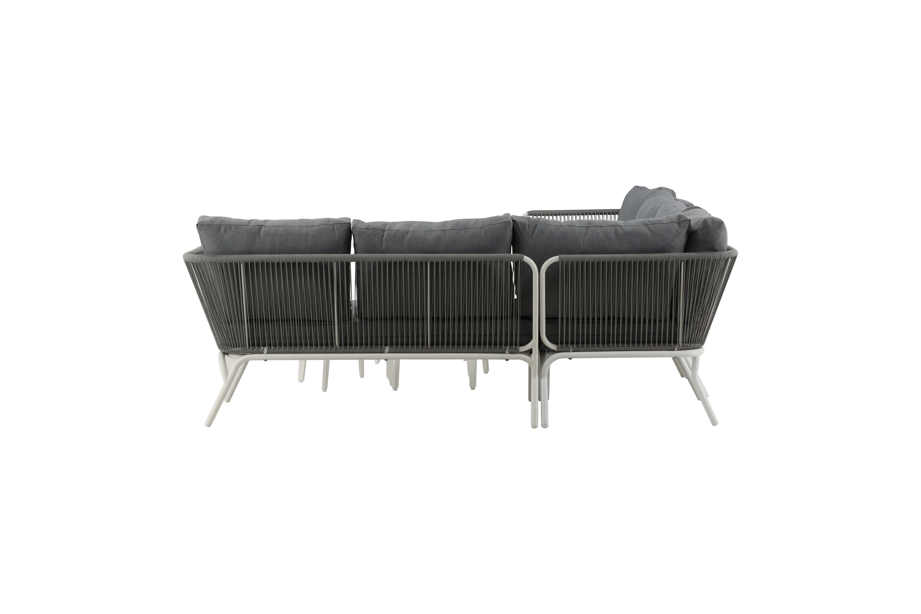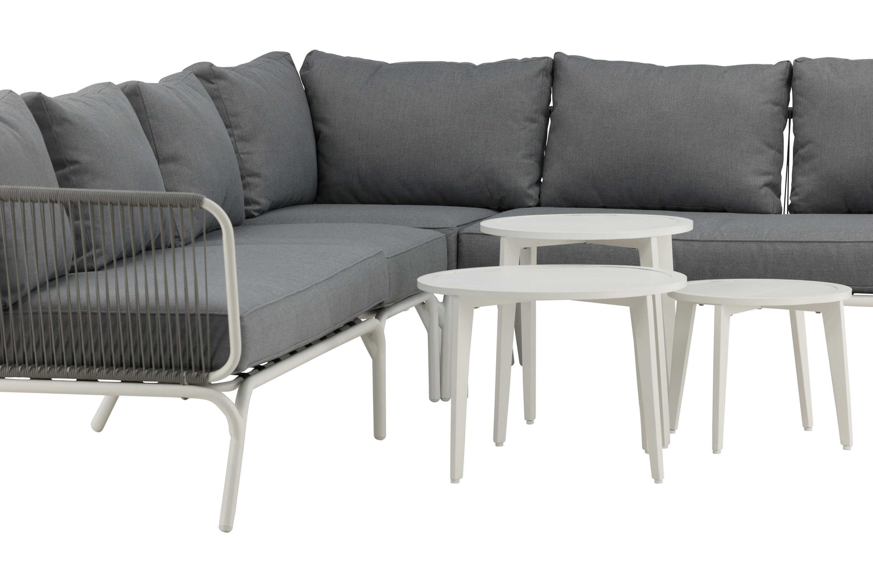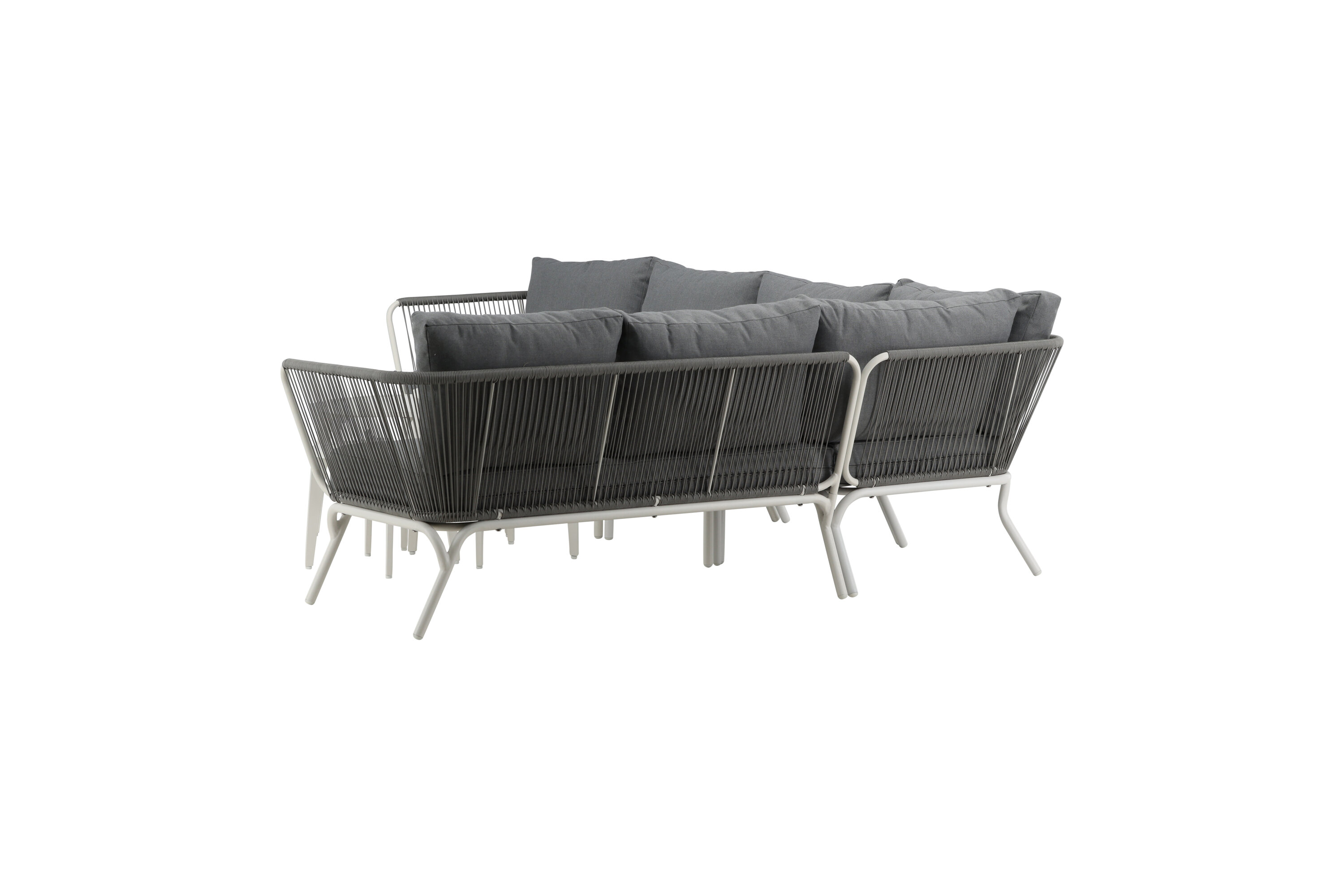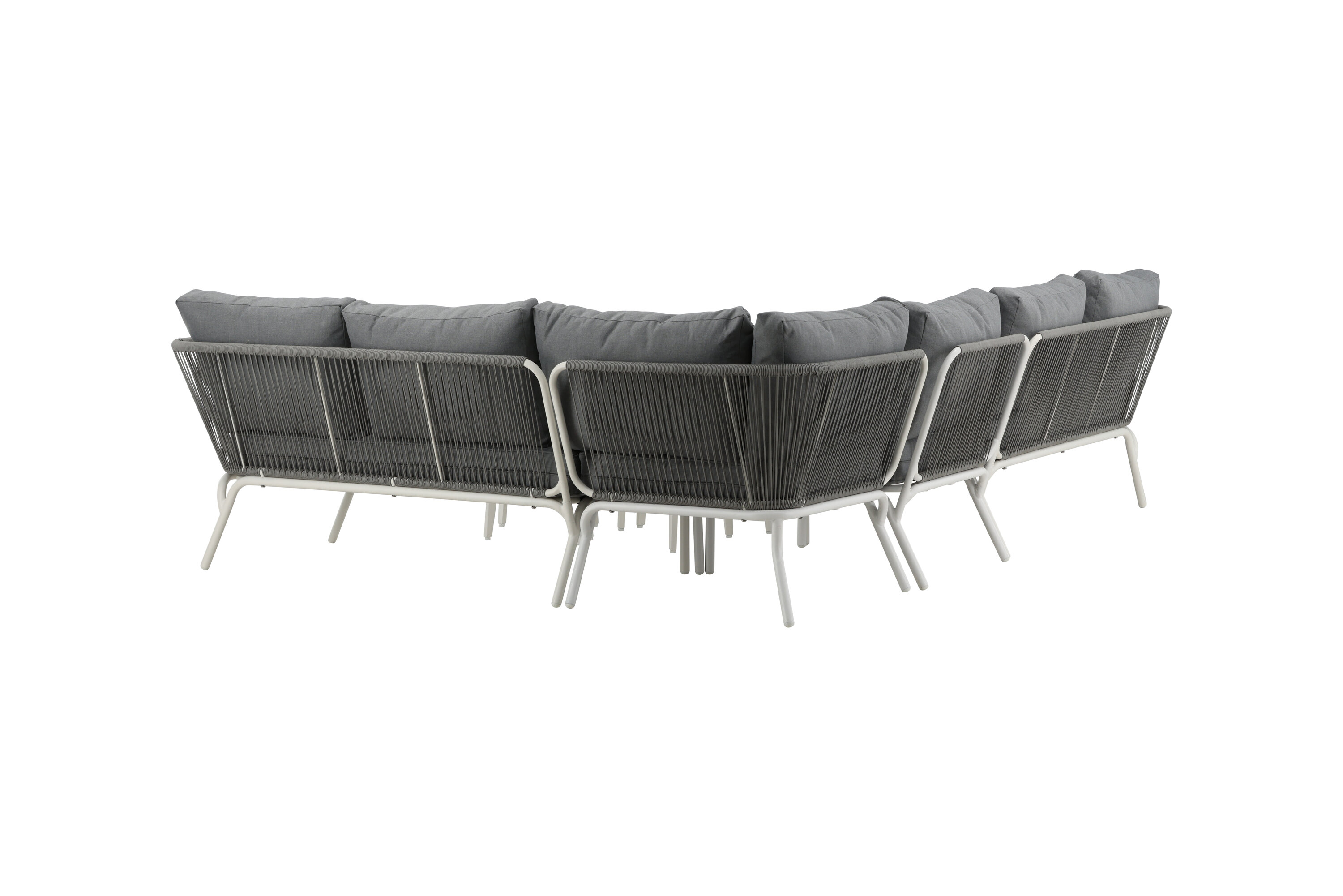 Create a cozy place to gather loved ones around this summer - here you sit relaxed and comfortable for hours! Roxo is a trendy sofa group in stylish design that is great for the patio or outdoor space. The sofa group consists of a corner sofa with 5 sit places and a corner part, made of a durable design in white powder coated metal with a back designed in light gray rope and stylish batch table in three parts in white powder coated metal. Gray soft cushions are included for the sofa group! Care advice: Outdoor furniture in aluminum and stainless steel should be cleaned regularly with water and mild soap. Always rinse thoroughly with plenty of water, which becomes extra important if the furniture is placed at a sea -close distance where salt can be transported through the air.