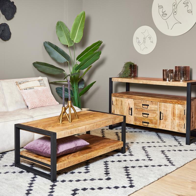 moderne twist. De collectie bestaat uit robuuste tafels, kasten, dressoirs en andere meubels, vaak vervaardigd uit duurzame materialen zoals mangohout en metaal. Dankzij de combinatie van natuurlijke houtstructuren en strakke lijnen passen de meubels perfect in diverse interieurstijlen, van industrieel tot modern en landelijk.