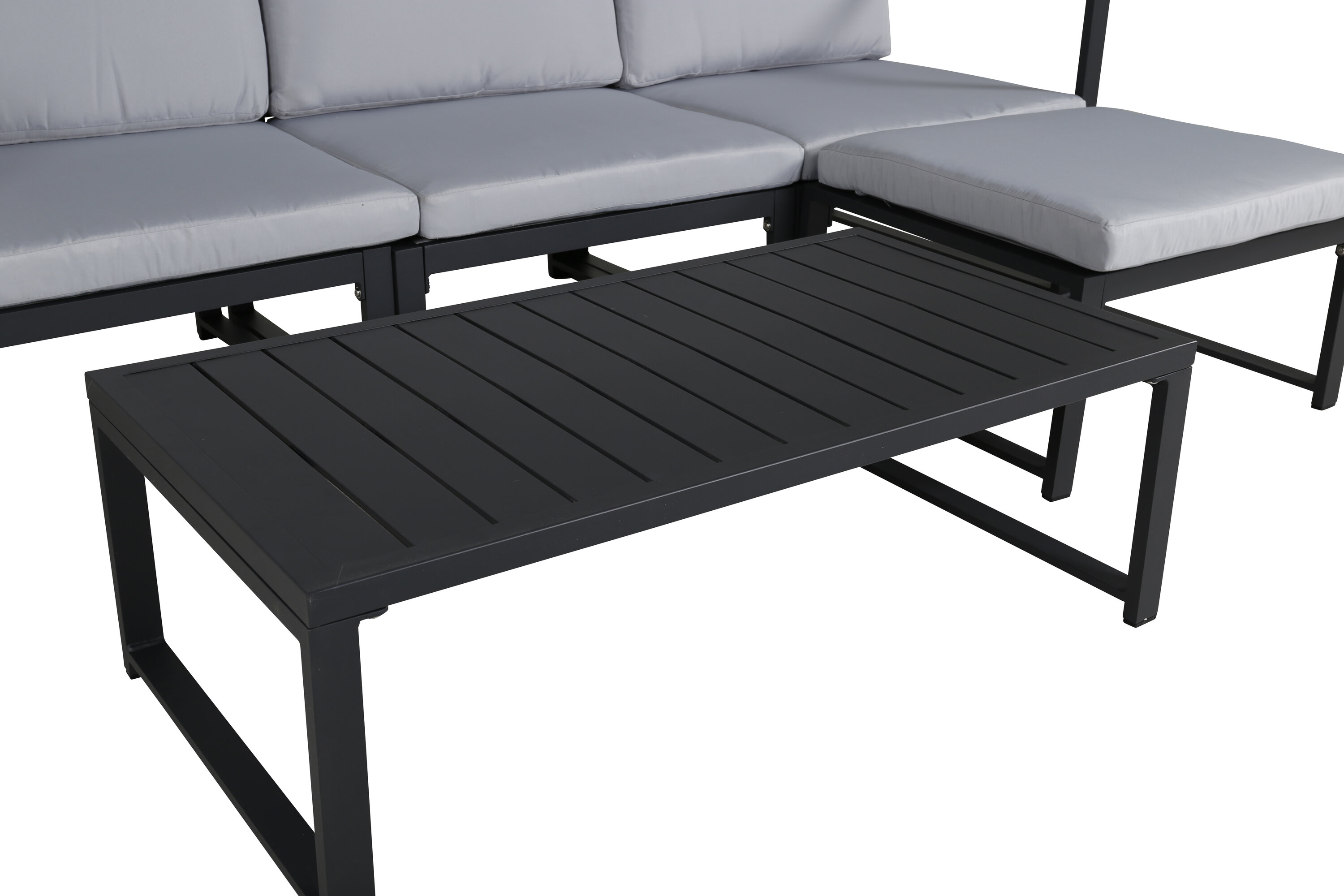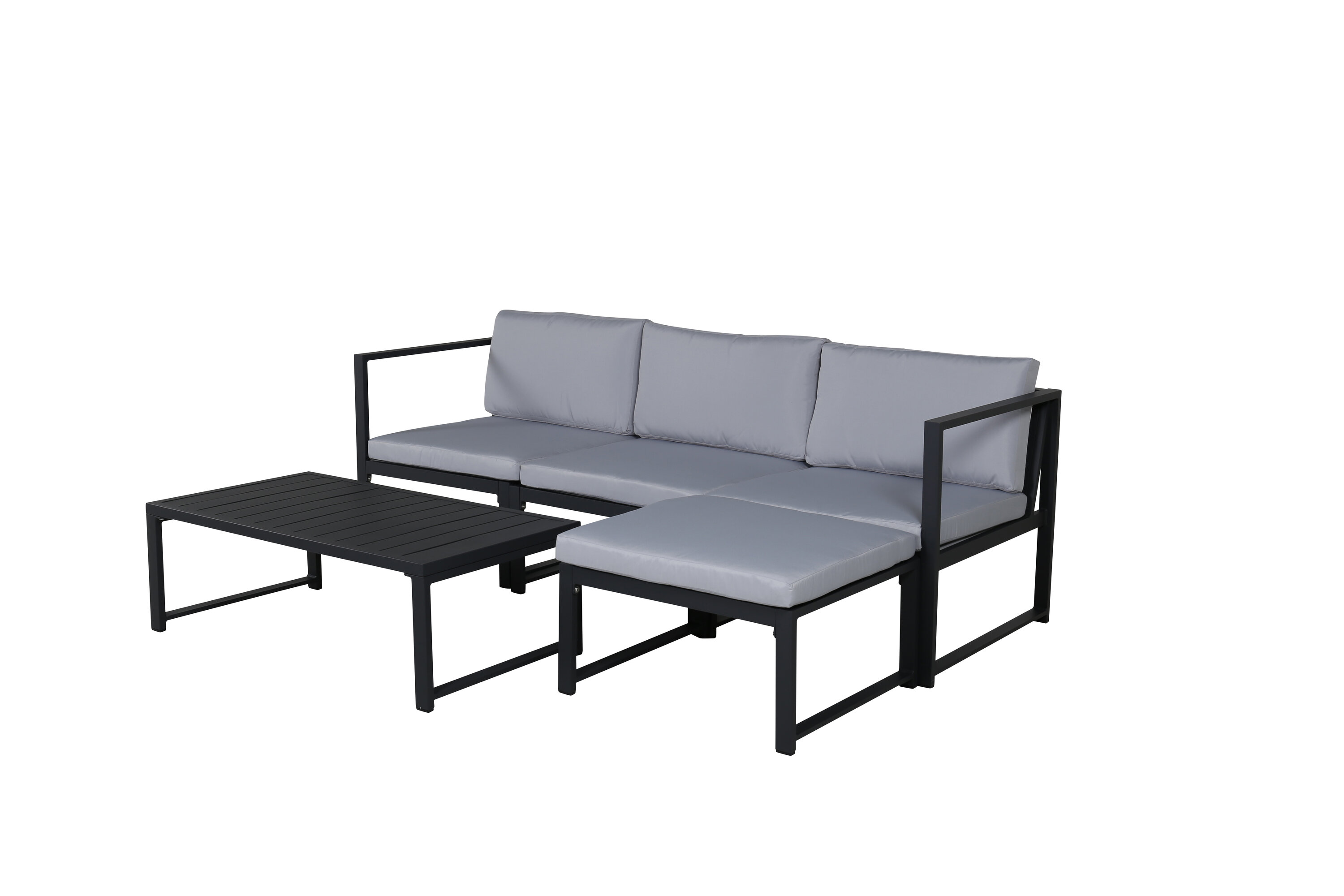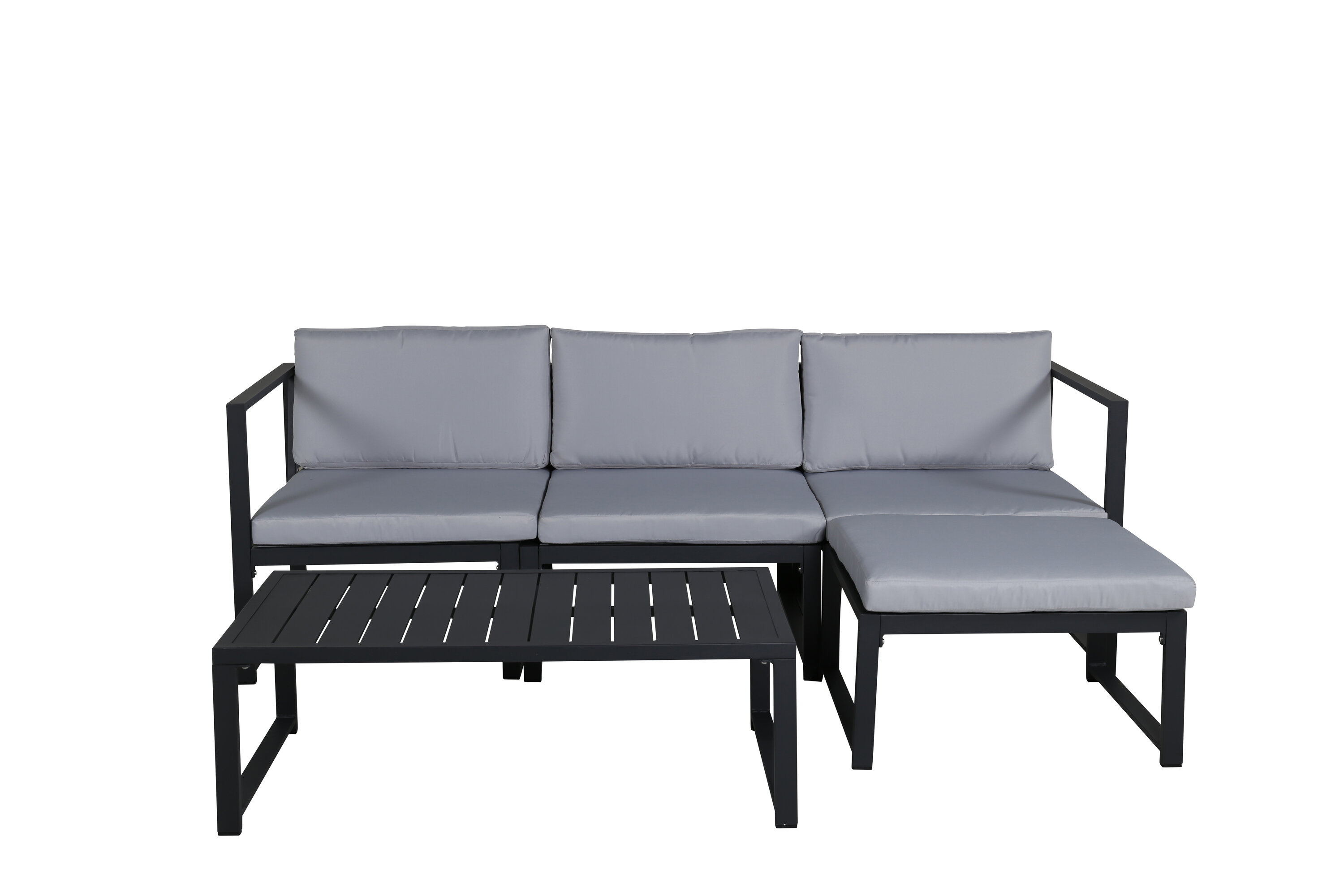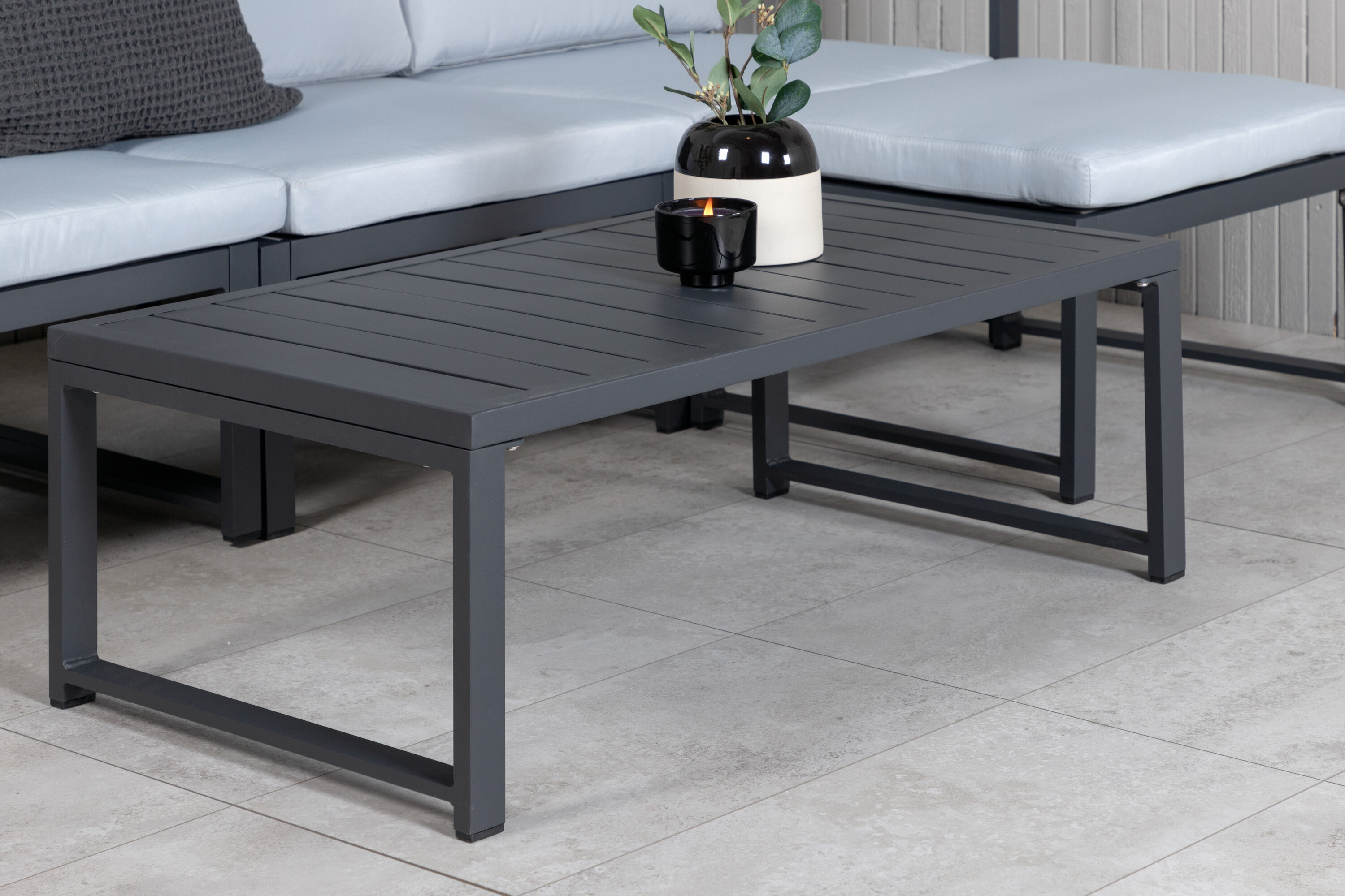 Salvador is a stylish sofa group in a stylish and simple design. The sofa group consists of a three -seater sofa with division and a coffee table. Made of black powder coated metal and aluminum - easy to manage and durable for outdoor use! Soft light gray cushions are included for the sofa group. The sofa is made up of modules that allow it to be adapted just as you want it, perfect for creating your own charming oasis on the patio! Care advice: Outdoor furniture in aluminum and stainless steel should be cleaned regularly with water and mild soap. Always rinse thoroughly with plenty of water, which becomes extra important if the furniture is placed at a sea -close distance where salt can be transported through the air.