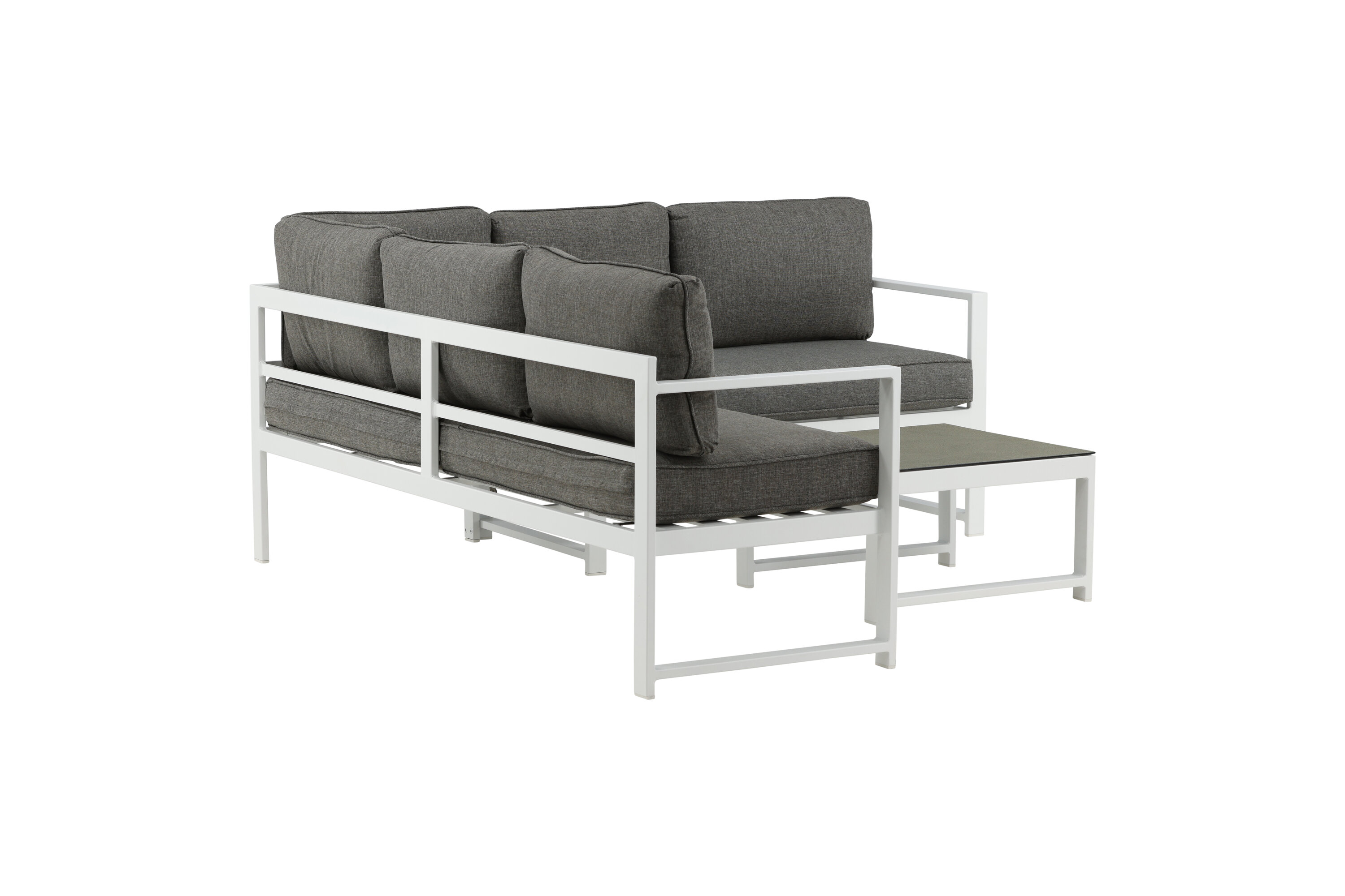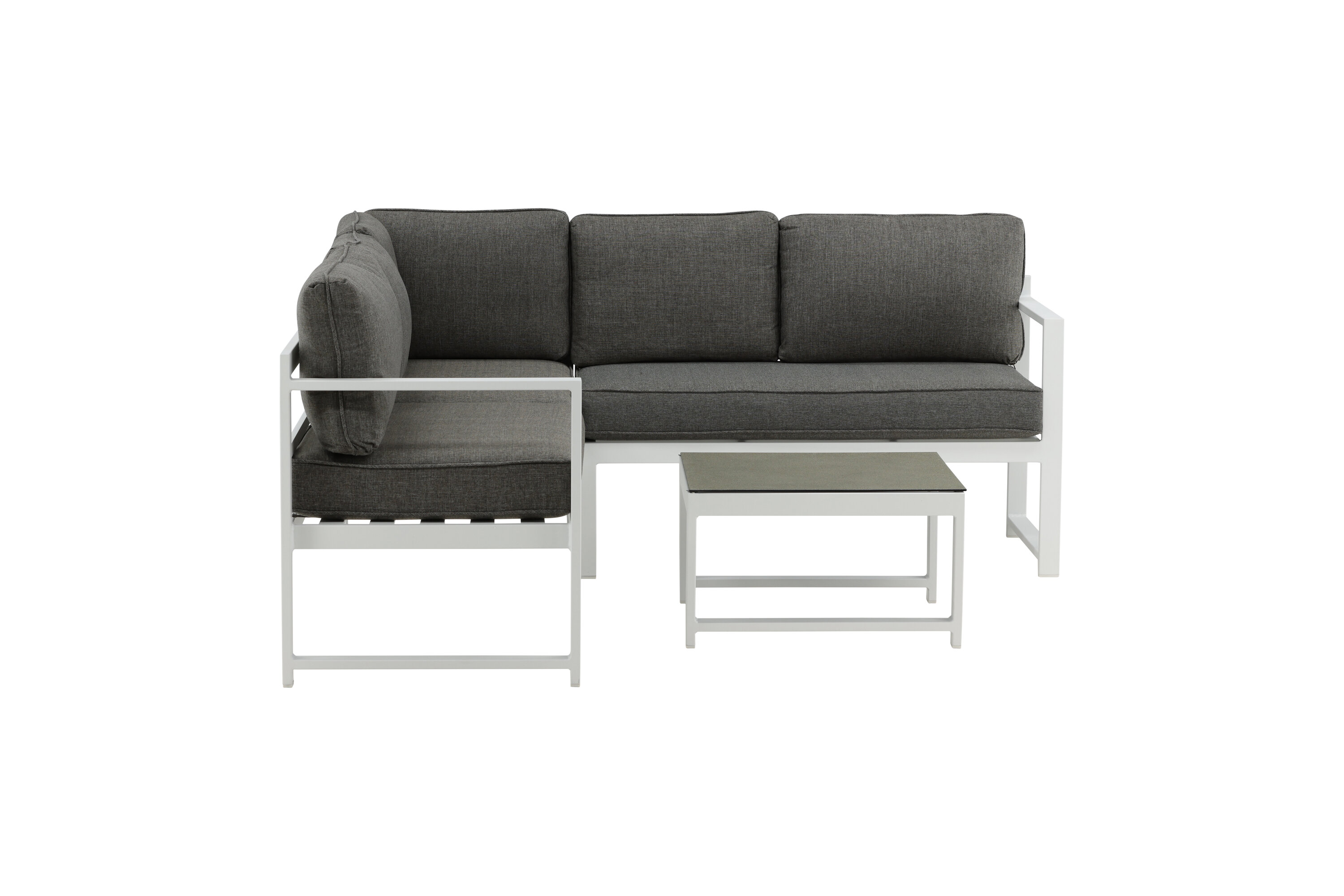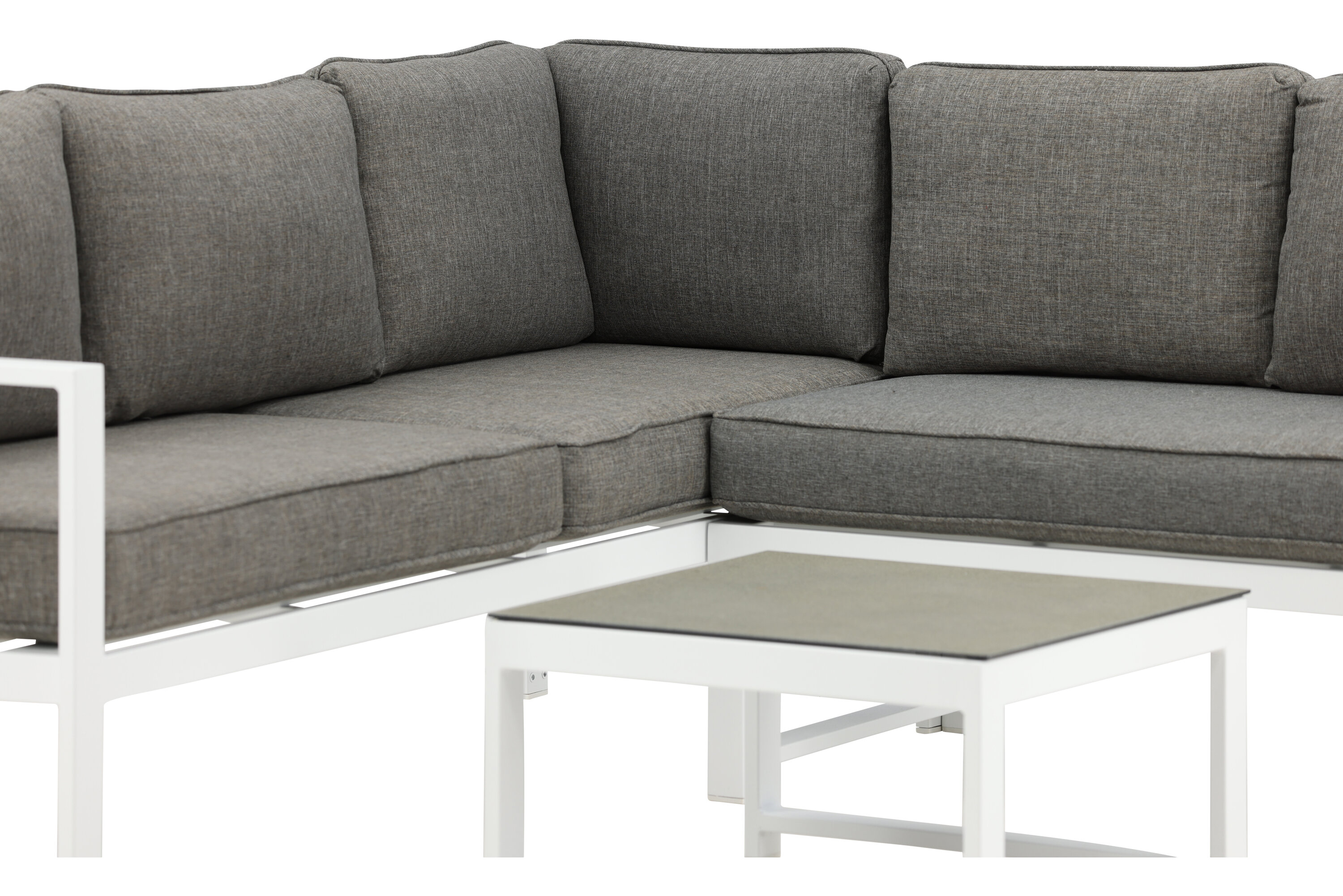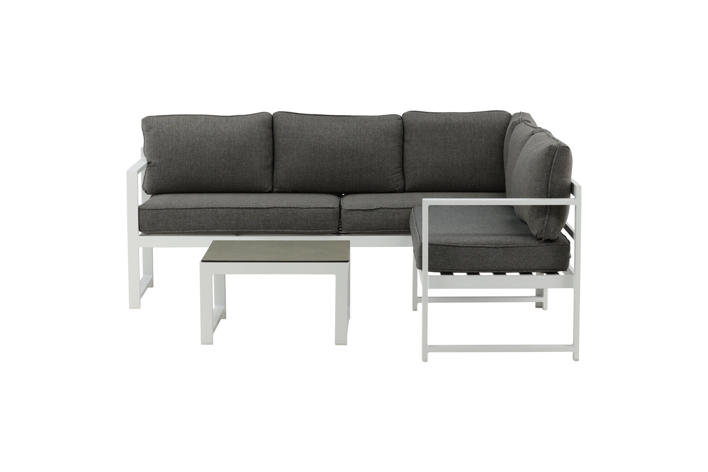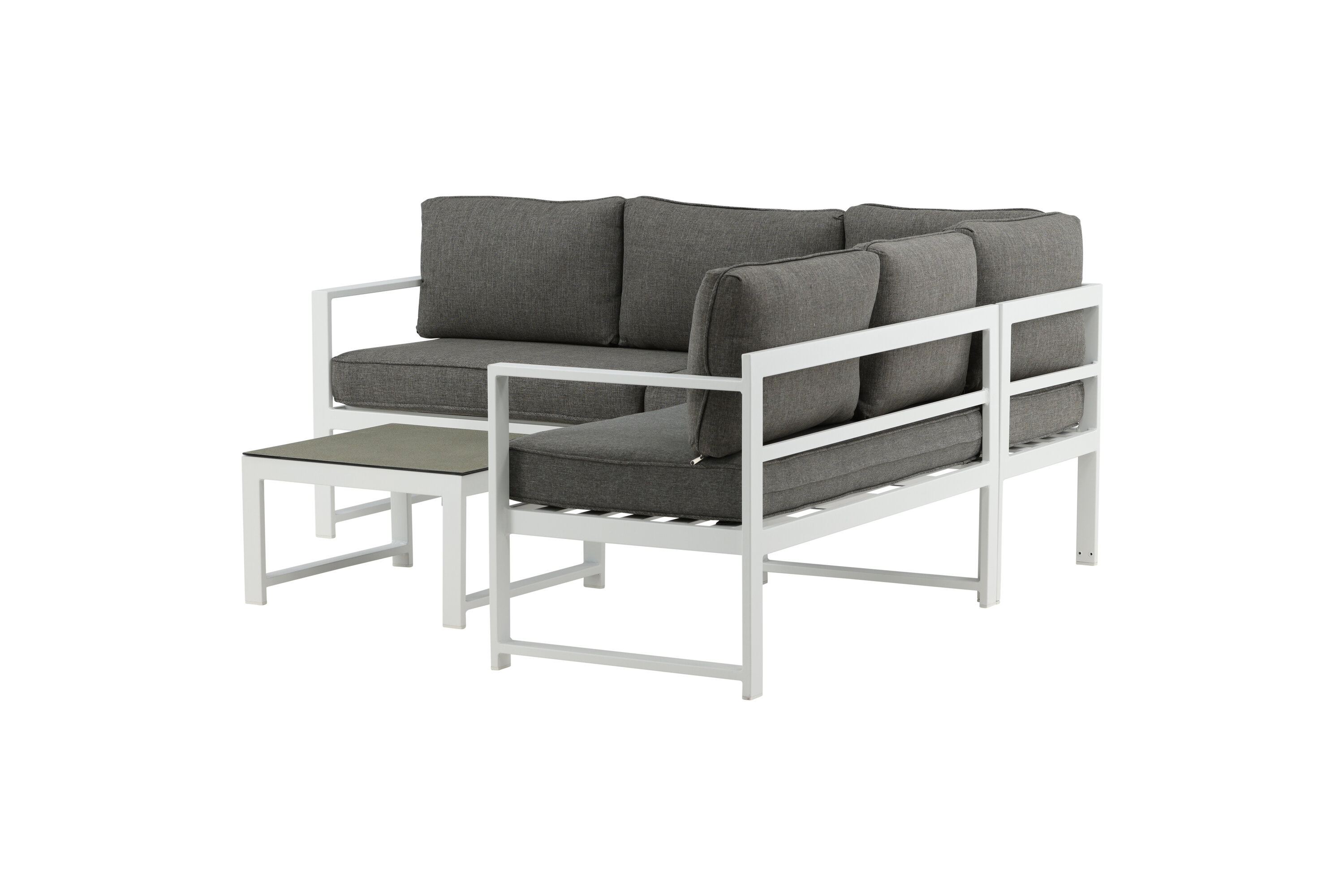 Modern stylish sofa group with a corner sofa for the patio or balcony. Made of white powder coated metal frame with integrated armrests. Including soft gray cushions and a low coffee table in glass with a spruce speech. Lighter assembly is required.