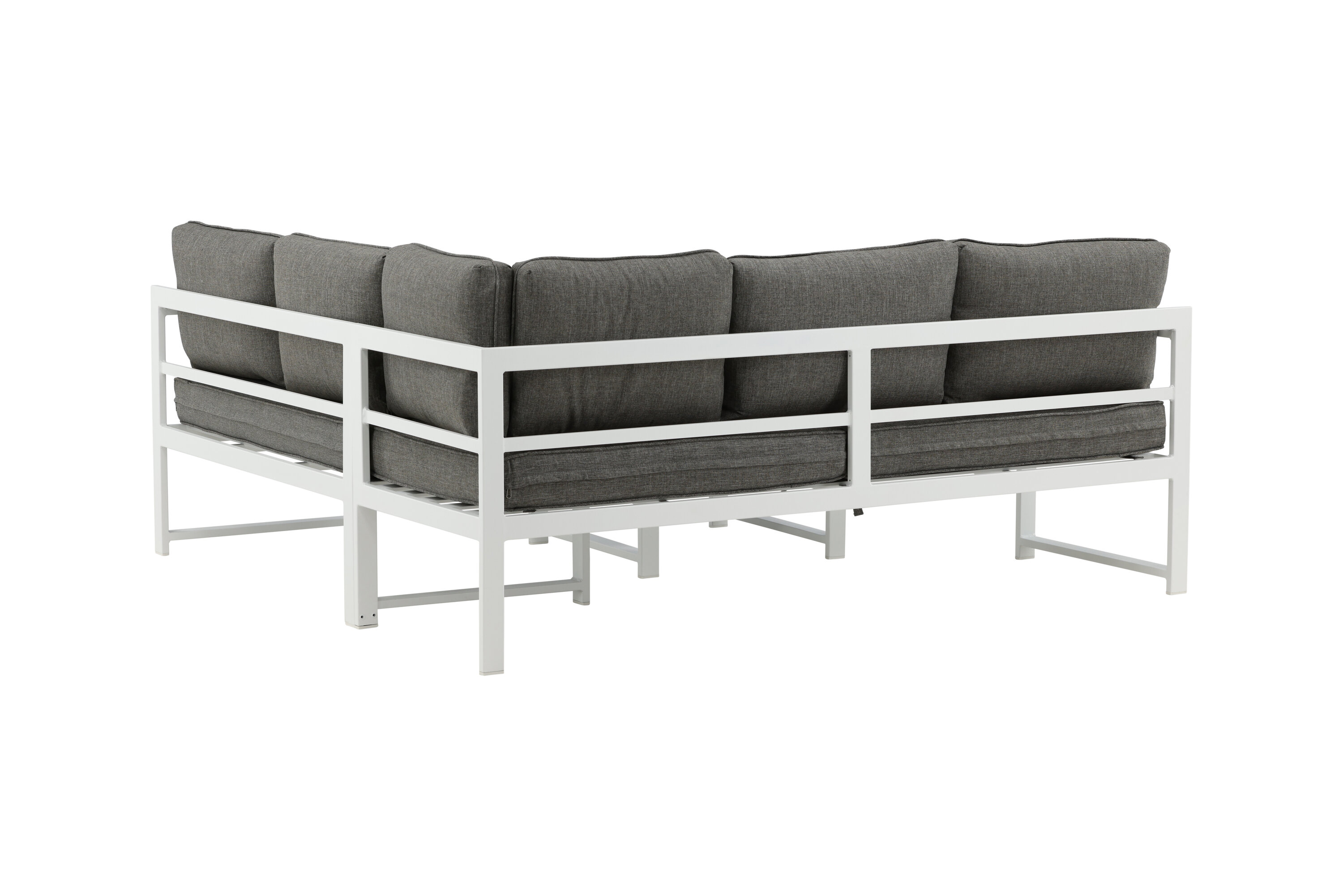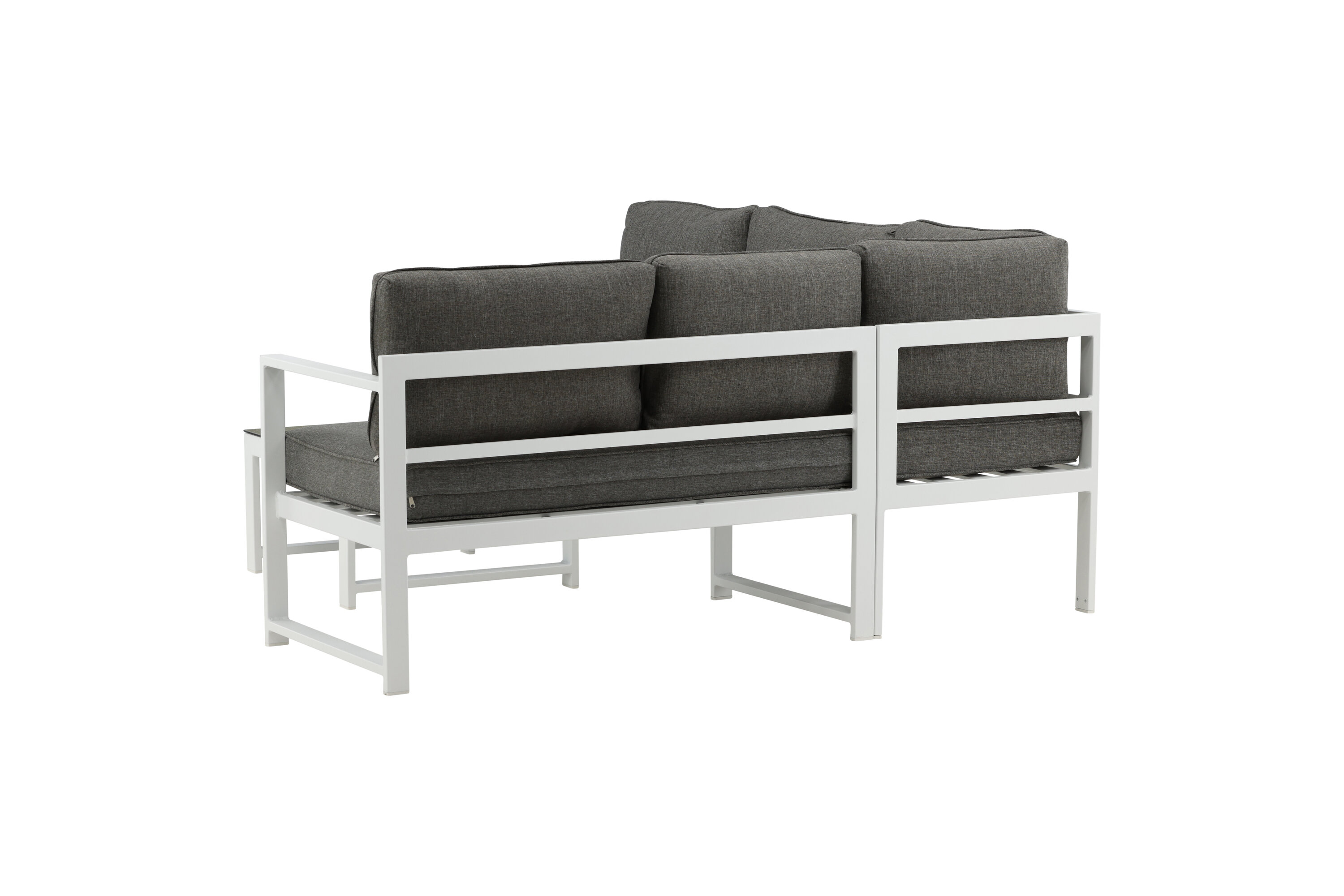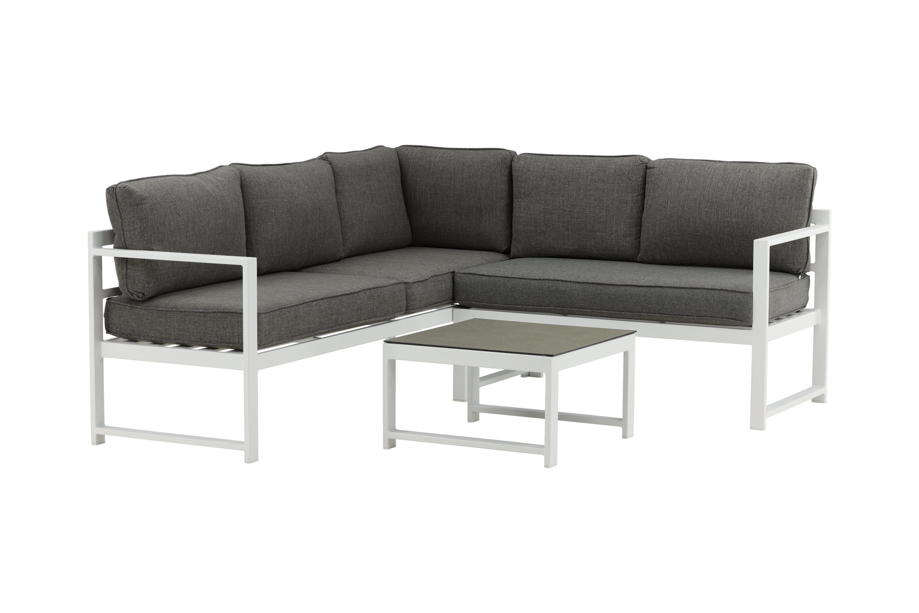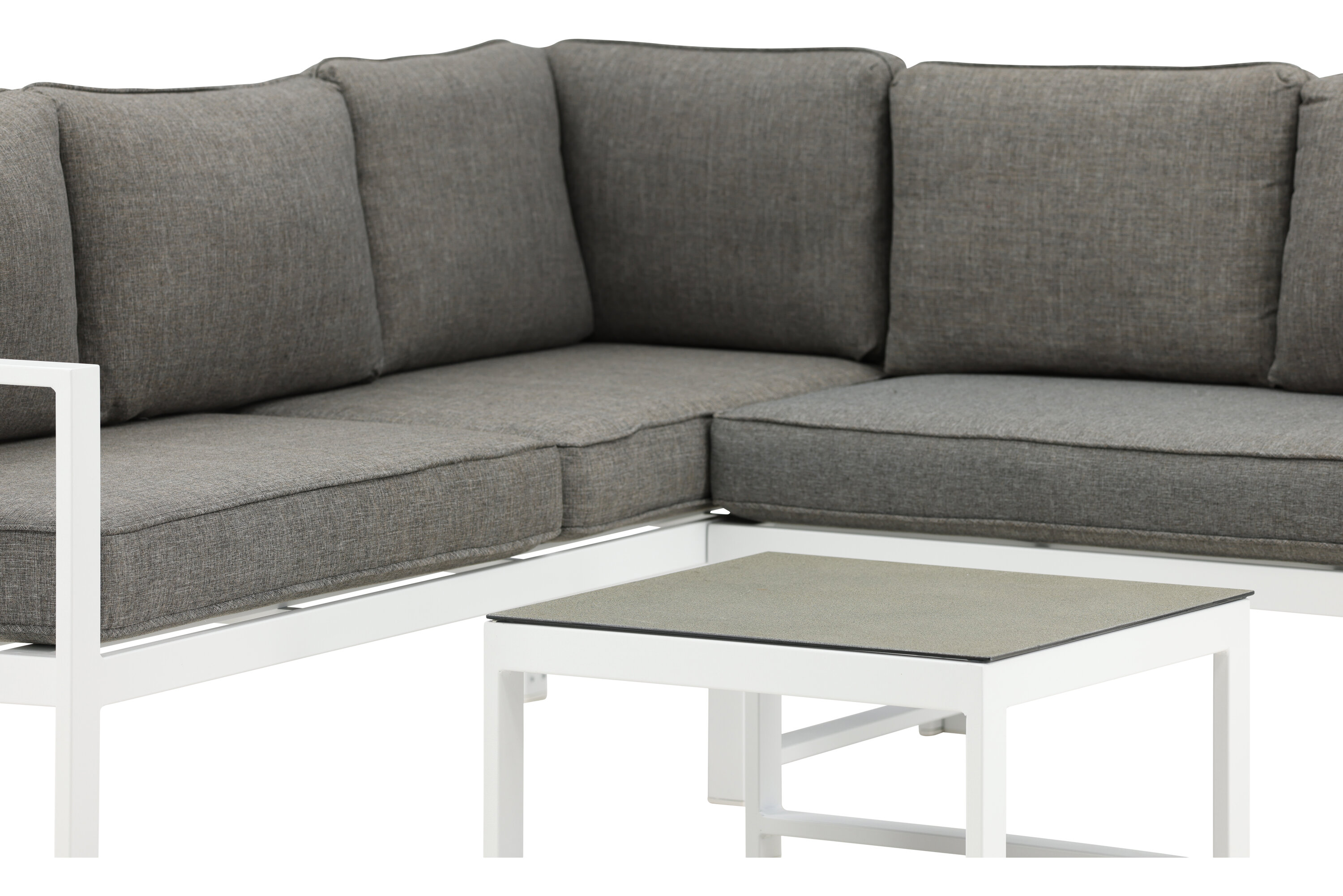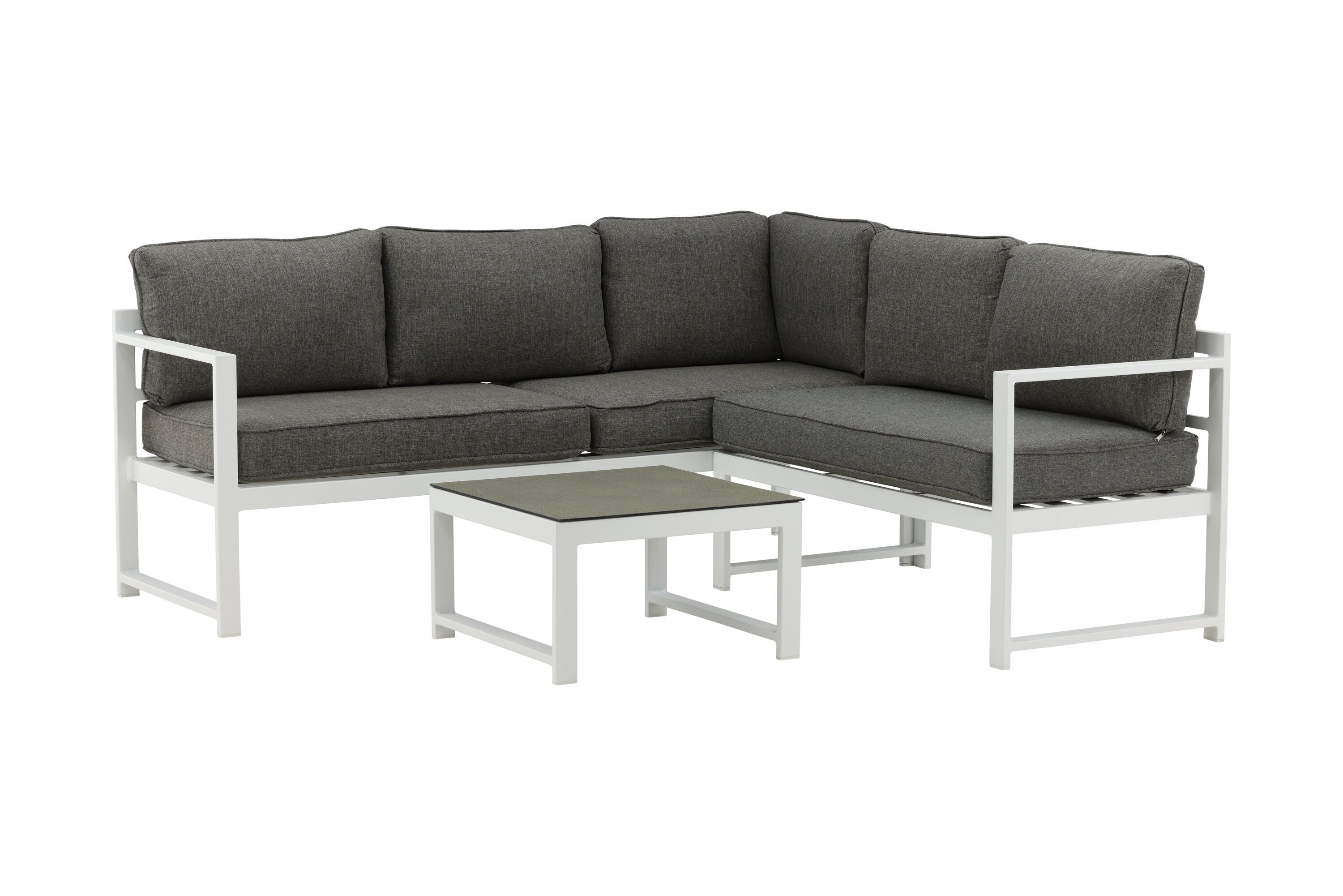 Modern stylish sofa group with a corner sofa for the patio or balcony. Made of white powder coated metal frame with integrated armrests. Including soft gray cushions and a low coffee table in glass with a spruce speech. Lighter assembly is required.