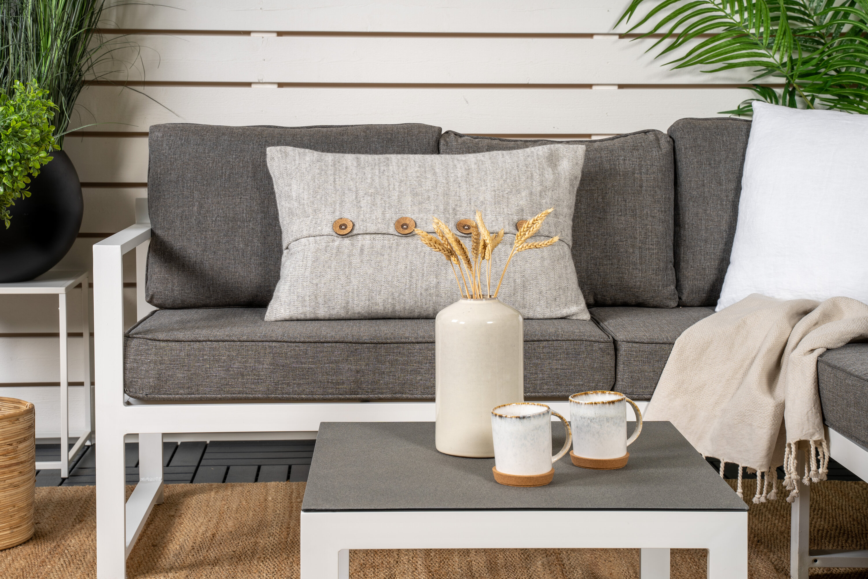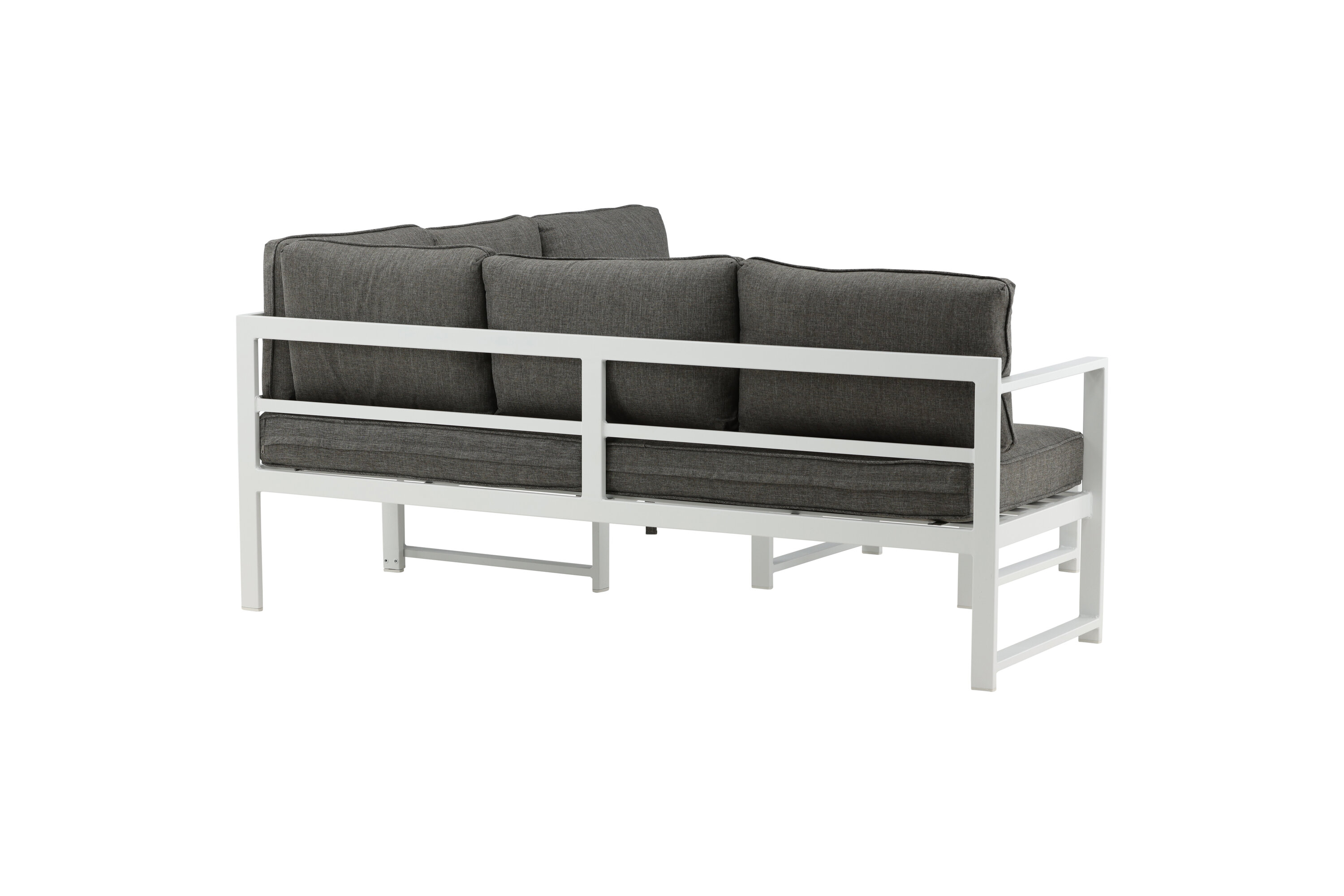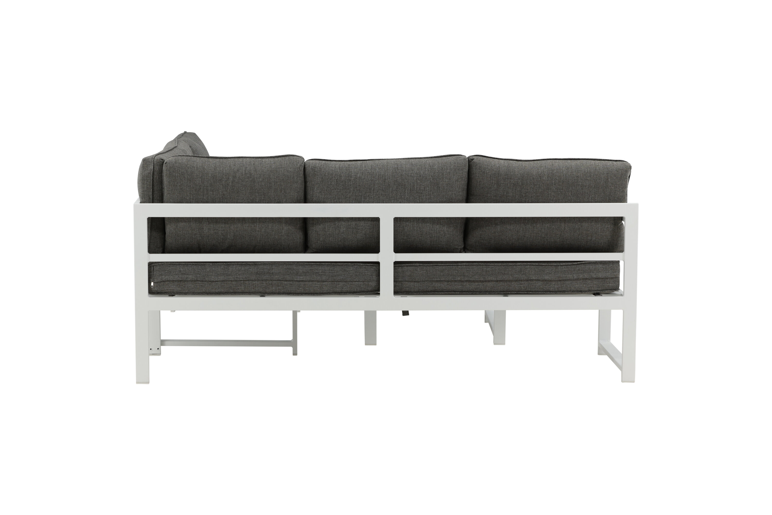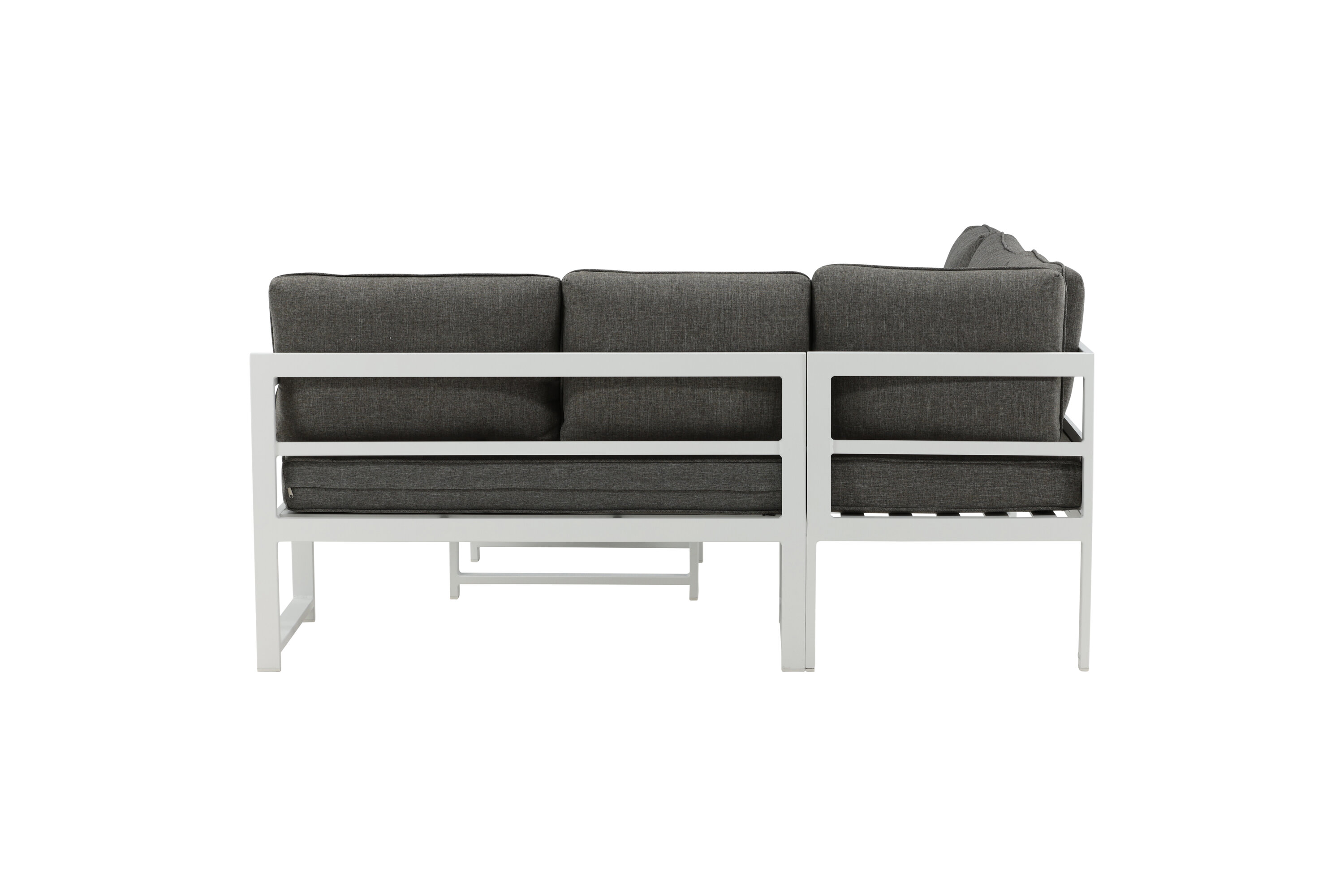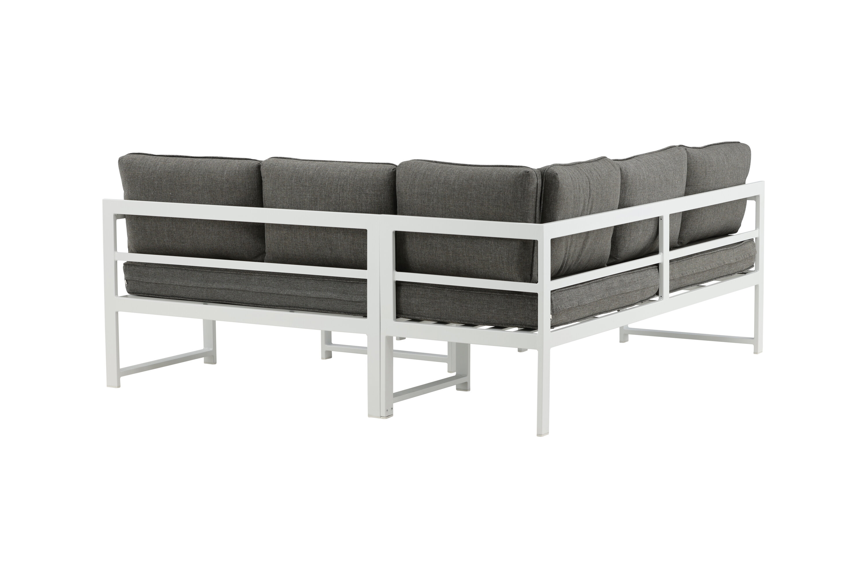 Modern stylish sofa group with a corner sofa for the patio or balcony. Made of white powder coated metal frame with integrated armrests. Including soft gray cushions and a low coffee table in glass with a spruce speech. Lighter assembly is required.