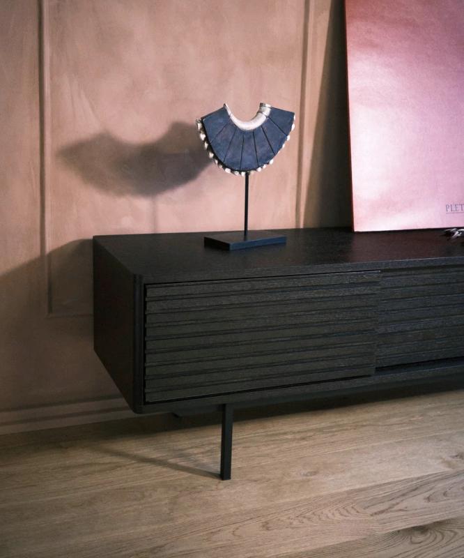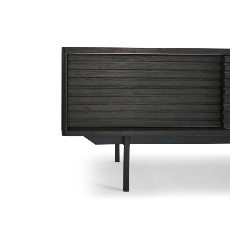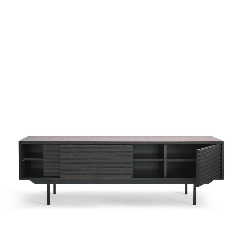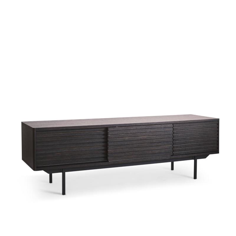 TV bench in smoke stained oak veneered MDF core and matt black powdercoated metal legs. 1 drawer and 2 sliding doors that closes off two compartments each with moveable shelves. | TV bench in smoke stained oak veneered MDF core and matt black powdercoated metal legs. 1 drawer and 2 sliding doors that closes off two compartments each with moveable shelves.