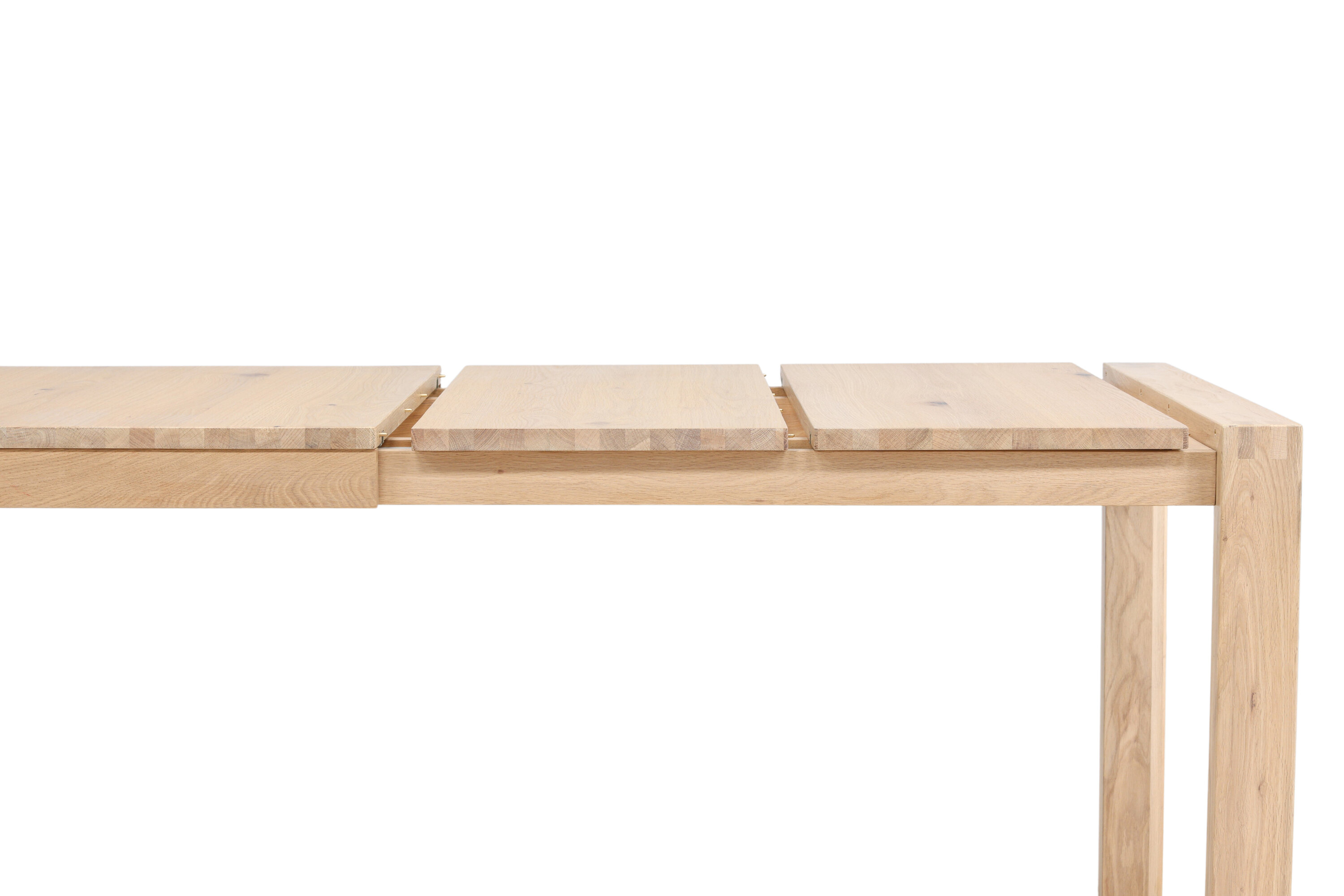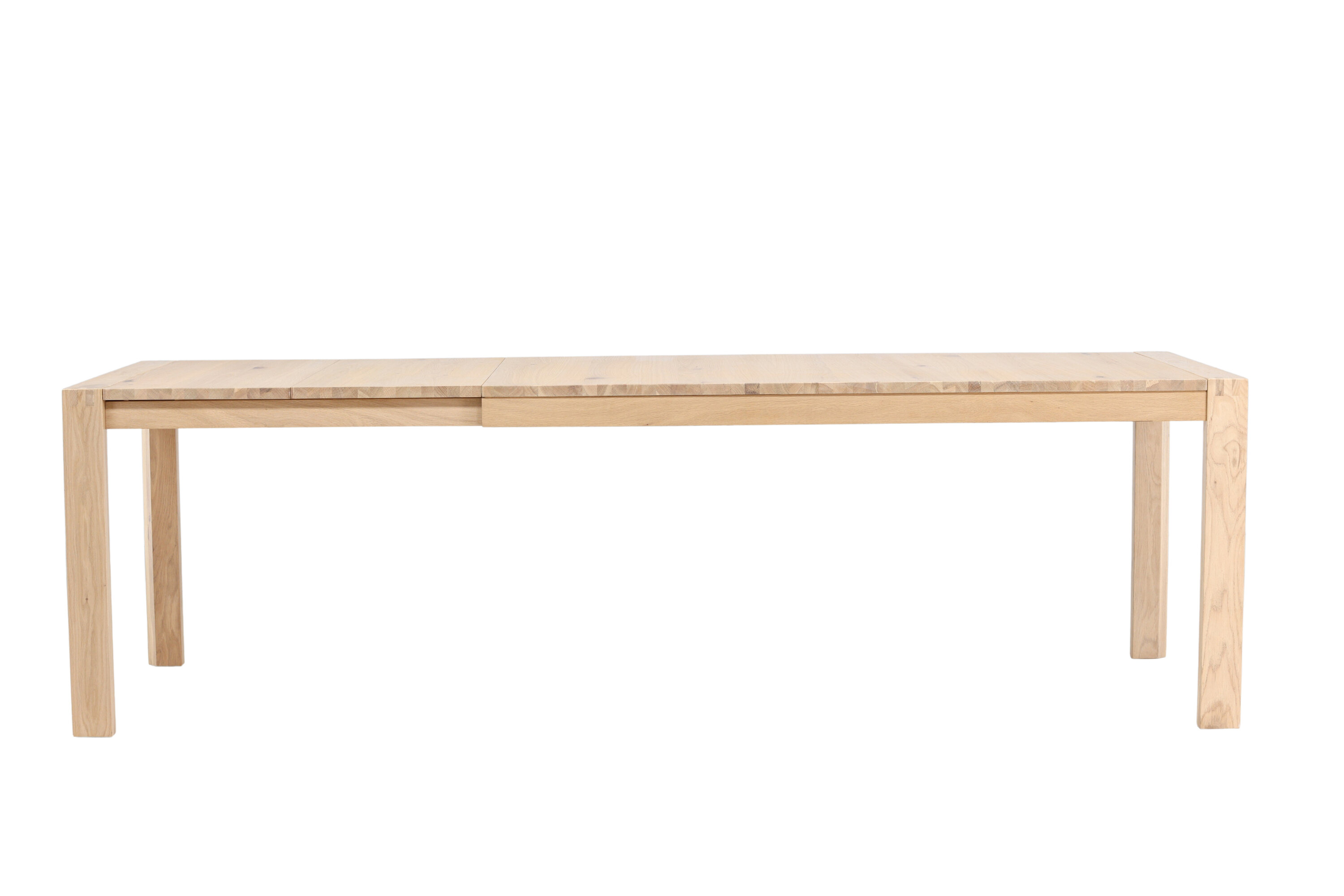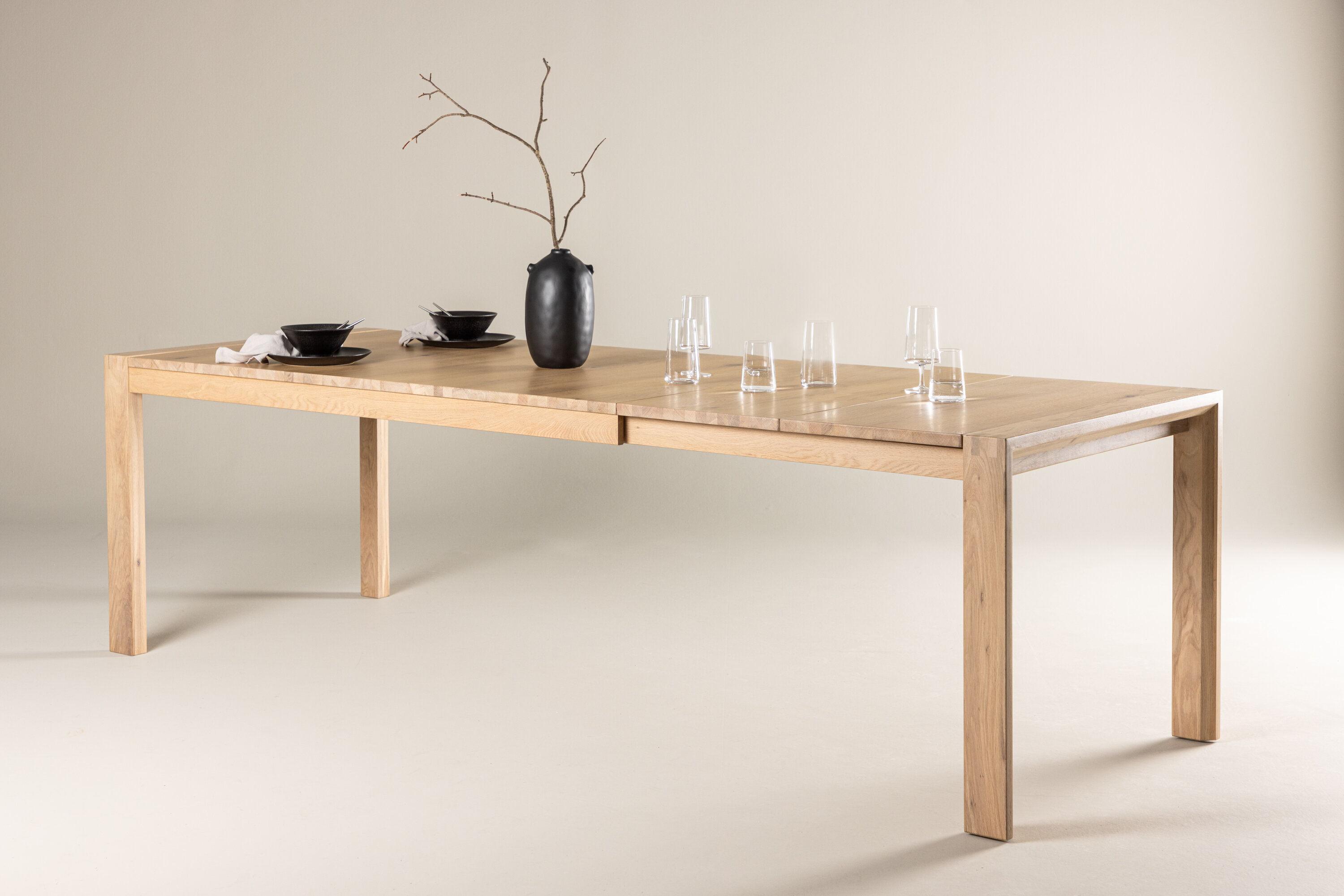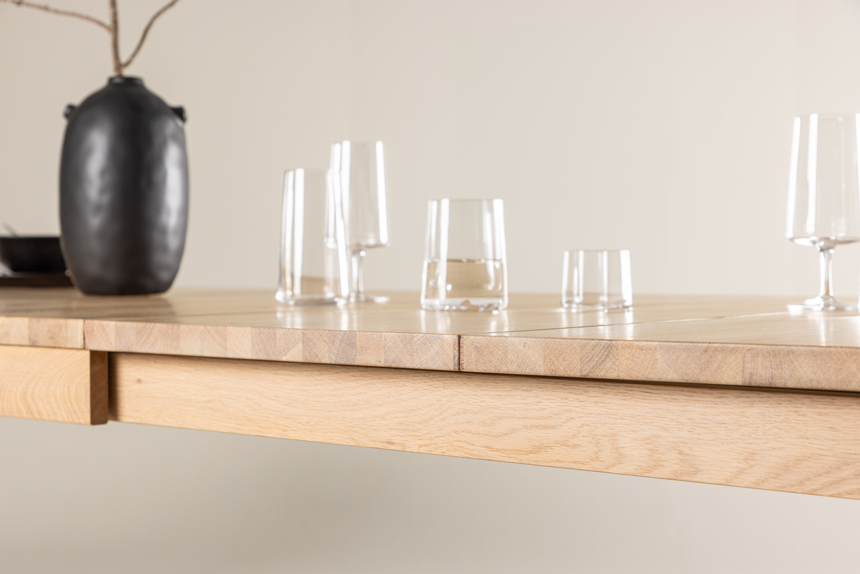 Slider, een stijlvolle en uitschuifbare eettafel in licht eiken look die gegarandeerd een succes zal zijn, zowel in het dagelijks leven als bij feestdiners! Het strakke Noordse design creëert een moderne blikvanger in je huis. Hier krijg je een neutrale en charmante eettafel die in de meeste woningen en huishoudens past. Nodig uit voor vele gezellige maaltijden in de toekomst! Zorgadvies: Voor de dagelijkse reiniging van houten meubels binnenshuis is een droge doek de beste oplossing. Bij vlekken gebruik een vochtige doek, niet doorweken - en direct drogen. Zowel oplosmiddelen als bleekmiddelen dienen vermeden te worden omdat ze de afwerking van het oppervlak kunnen aantasten. Bescherm het oppervlak gerust met onderzetters om vlekken van gemorste vloeistoffen en warme voorwerpen te voorkomen.
