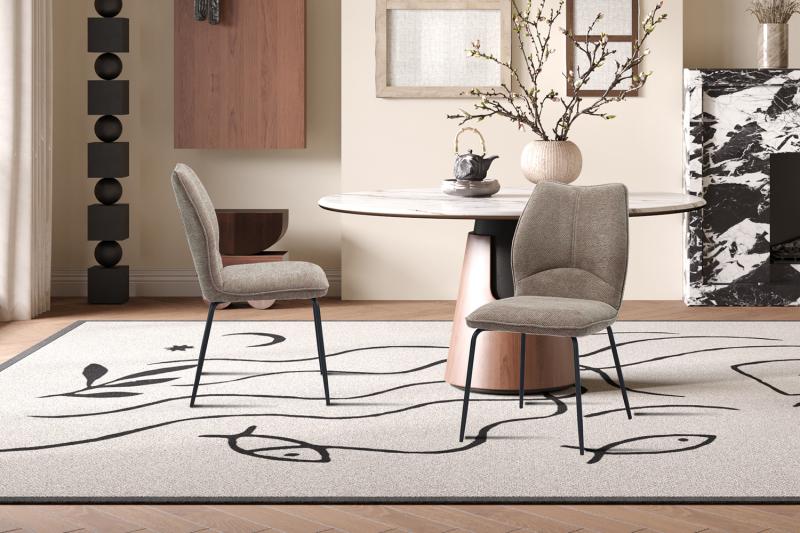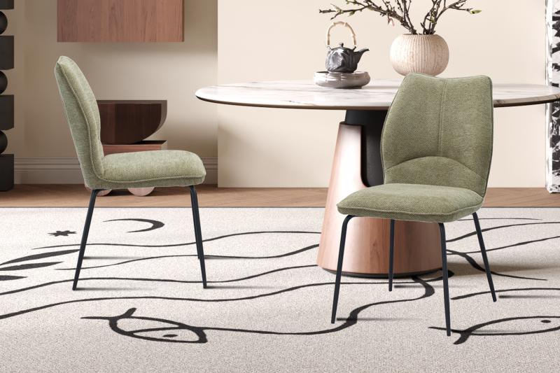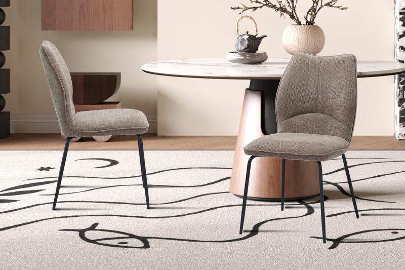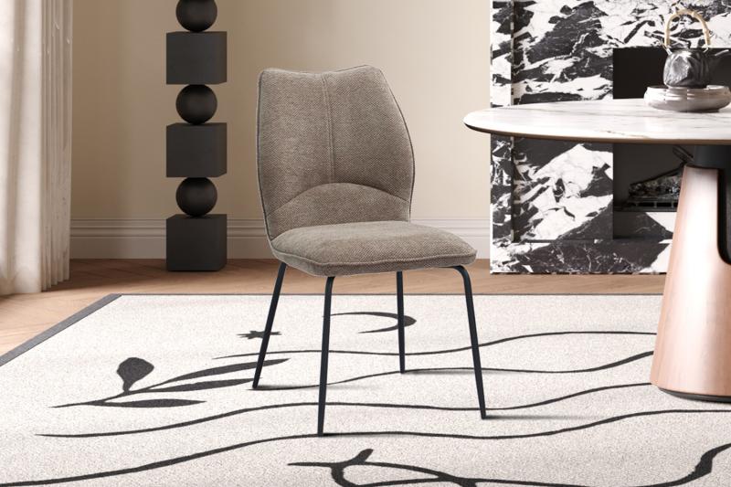 De combinatie van zachte stof en stevige, gepoedercoate metalen poten zorgt voor zowel comfort als duurzaamheid. Het hoogwaardige materiaal garandeert jarenlang gebruiksplezier, terwijl de stoel uitnodigt tot ontspannen zitten.