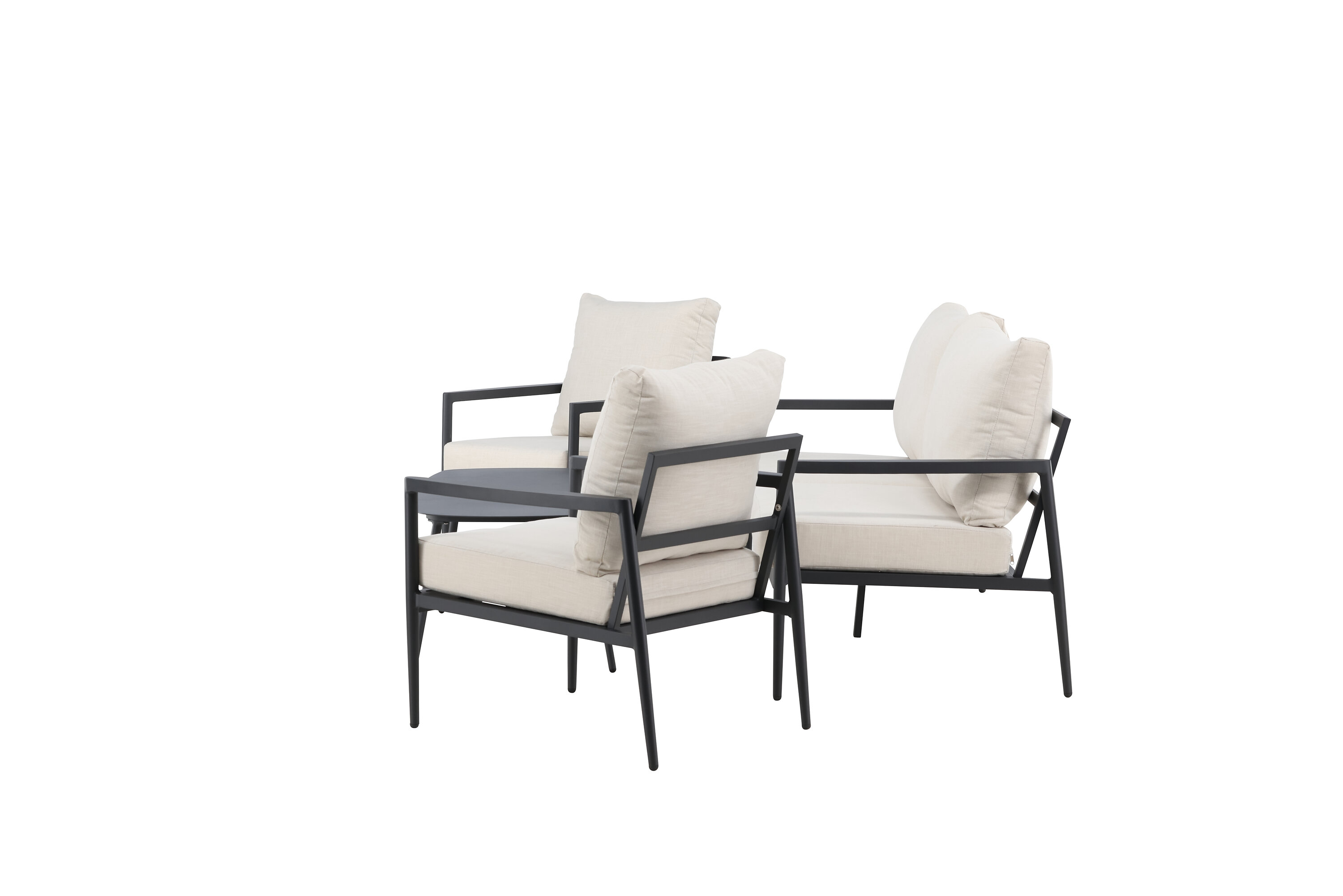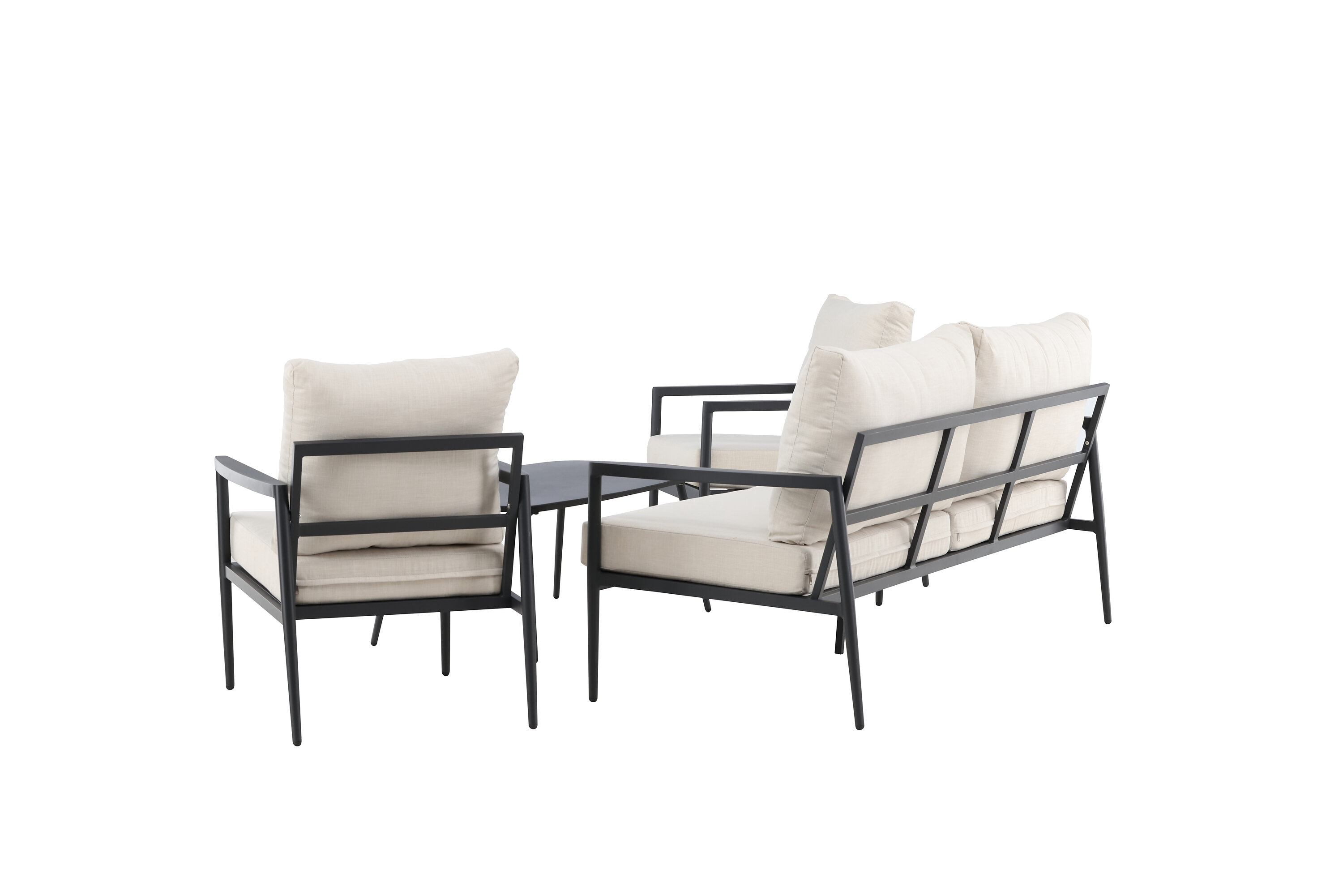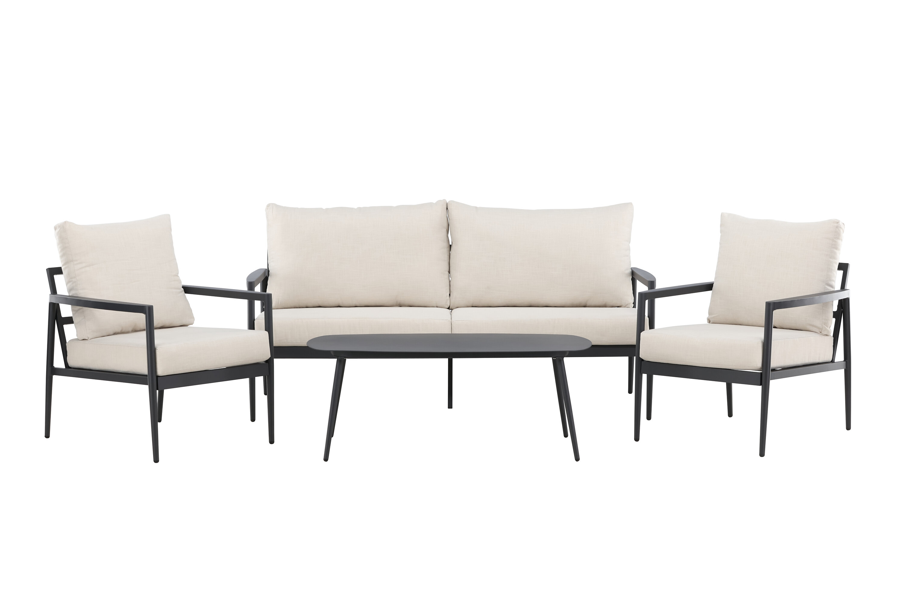 Taromina is een stijlvol meubelset dat functionaliteit en design combineert, perfect voor het creëren van een harmonieuze sfeer op uw terras, balkon of tuin. Het set bestaat uit een comfortabele bank, twee fauteuils en een praktische tafel - allemaal met een frame van elegant zwart aluminium, wat een moderne en verfijnde uitstraling biedt. De zachte kussens van beige polyester vullen het ontwerp aan en bieden hoog comfort voor lange momenten van ontspanning of gezellige bijeenkomsten. De tafel biedt een praktische oppervlakte die even geschikt is voor het serveren als voor decoratieve details. Met zijn tijdloze ontwerp en duurzame materialen is Taromina de perfecte keuze voor degenen die stijl en comfort willen combineren in hun buitenomgeving.