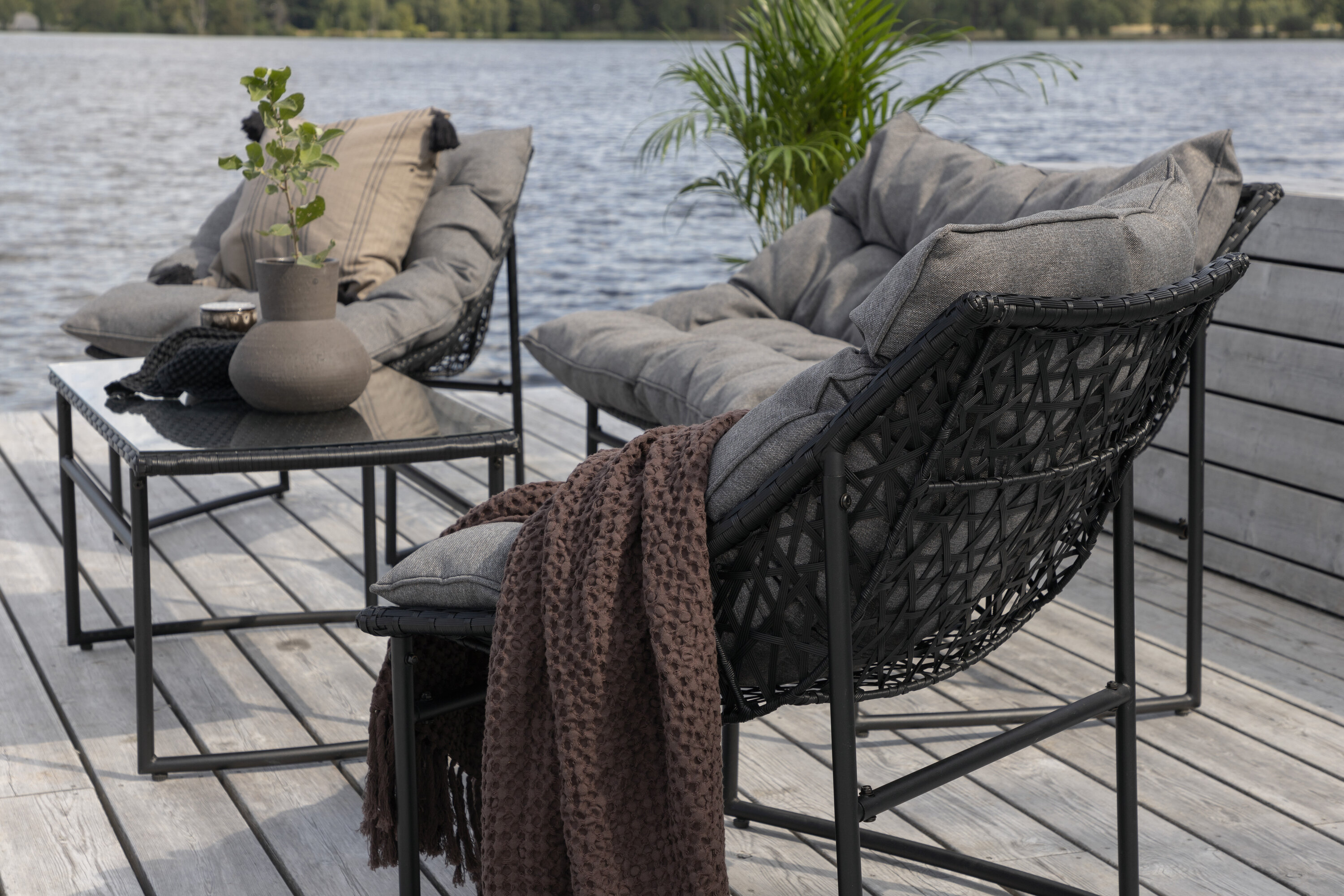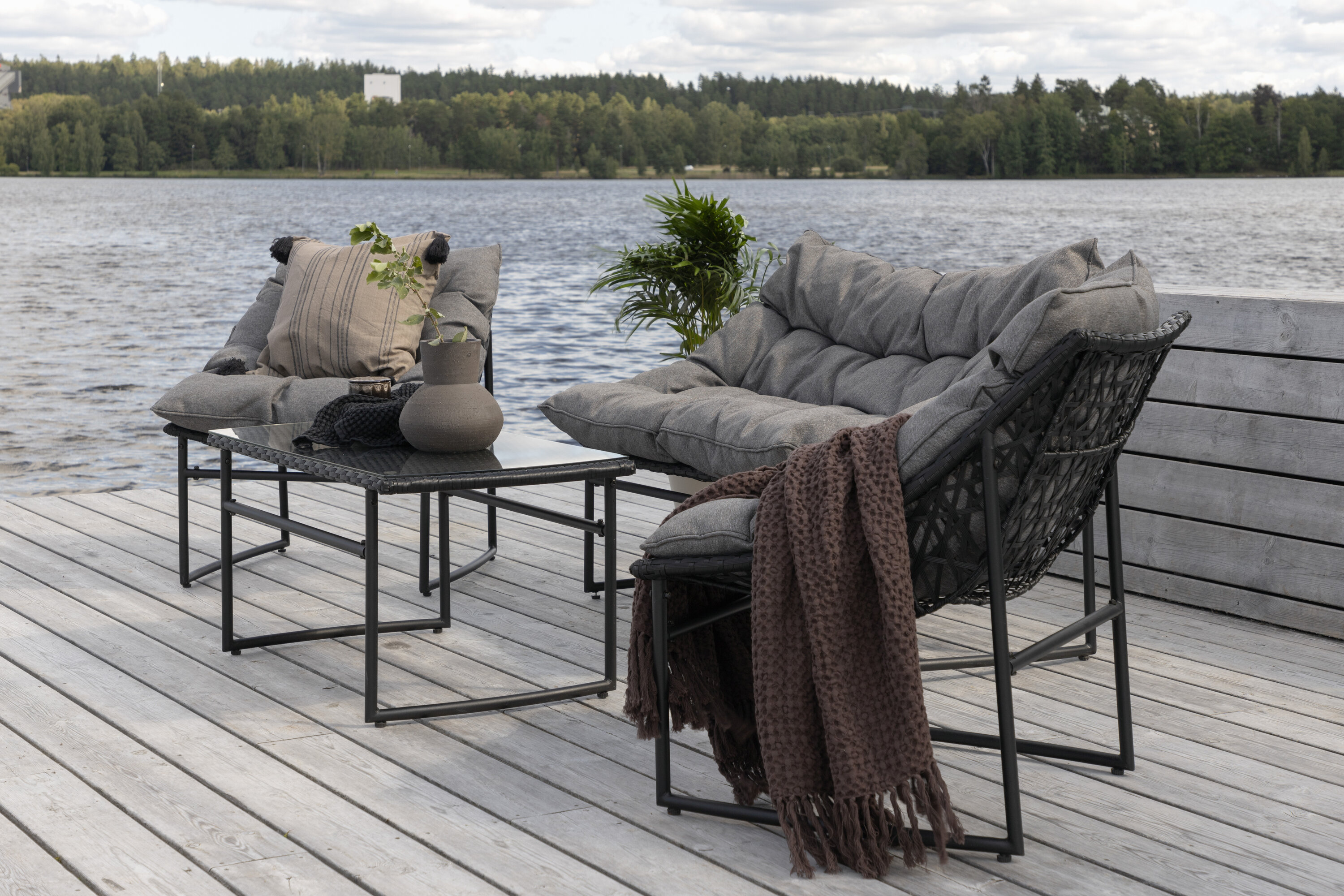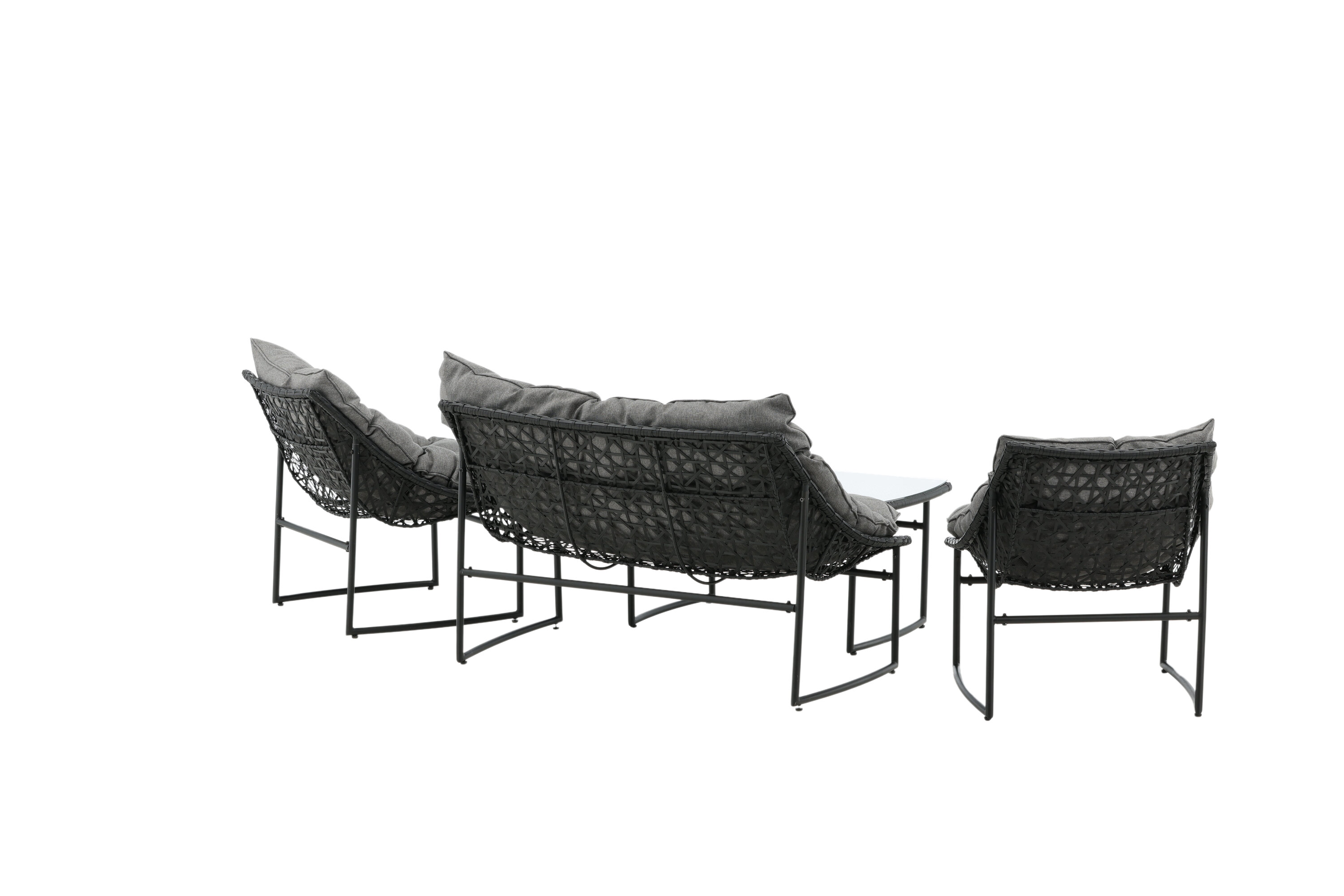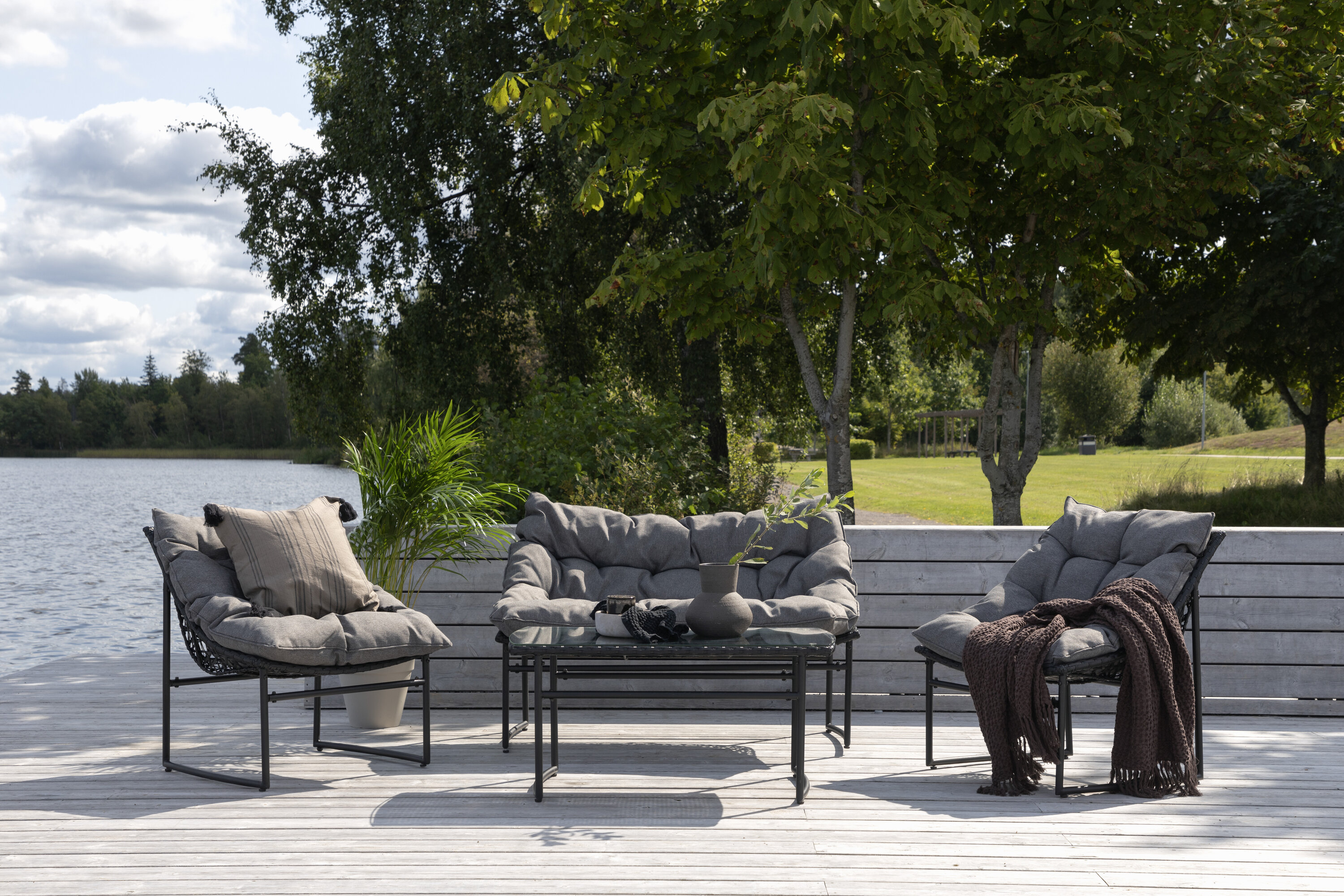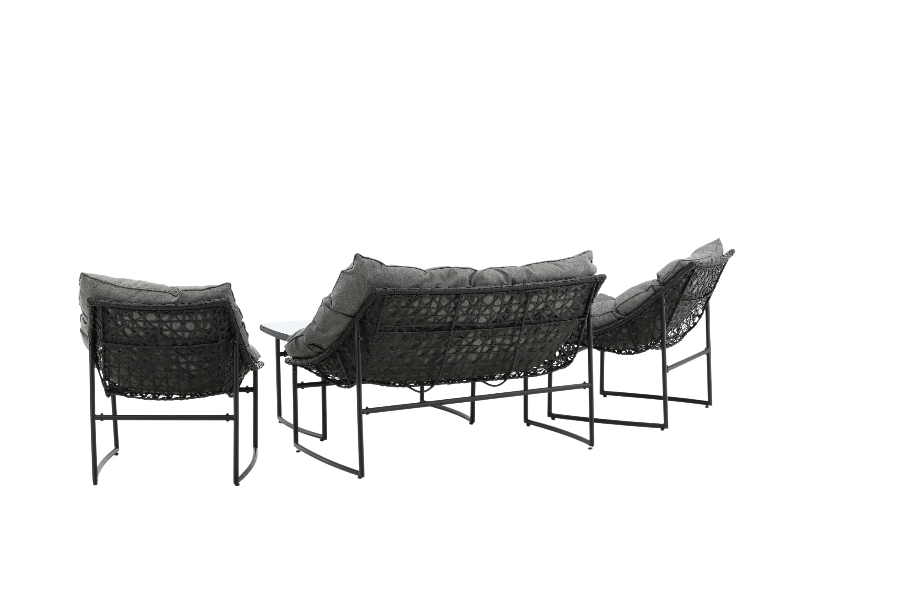 Welcome home to a relaxing and eye -catching sofa group in trendy design! Tina sofa group is a nice and stylish group in black with associated table with a glass top plate. Durable cushions in gray are included and the group holds a total of 4 sitting guests.