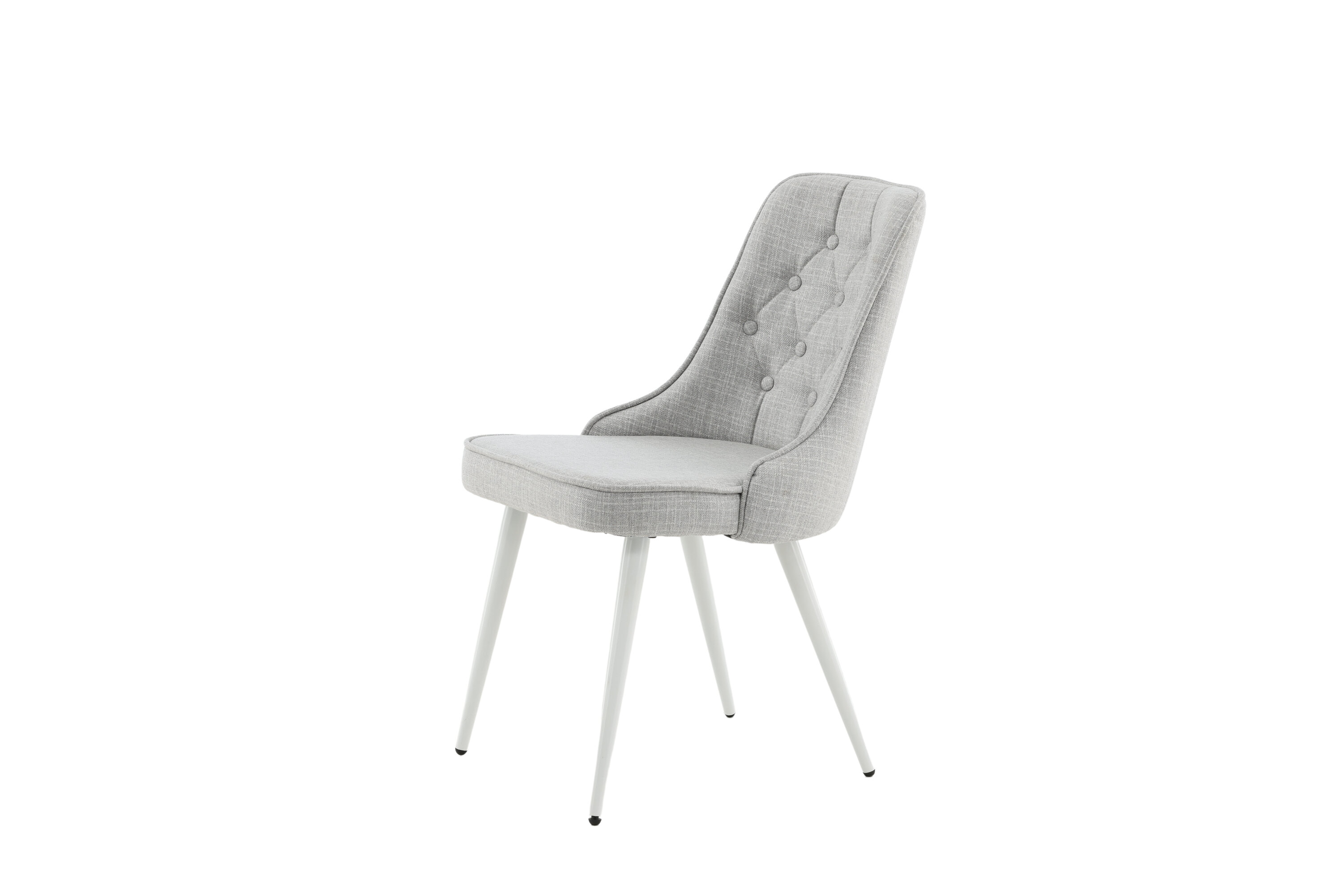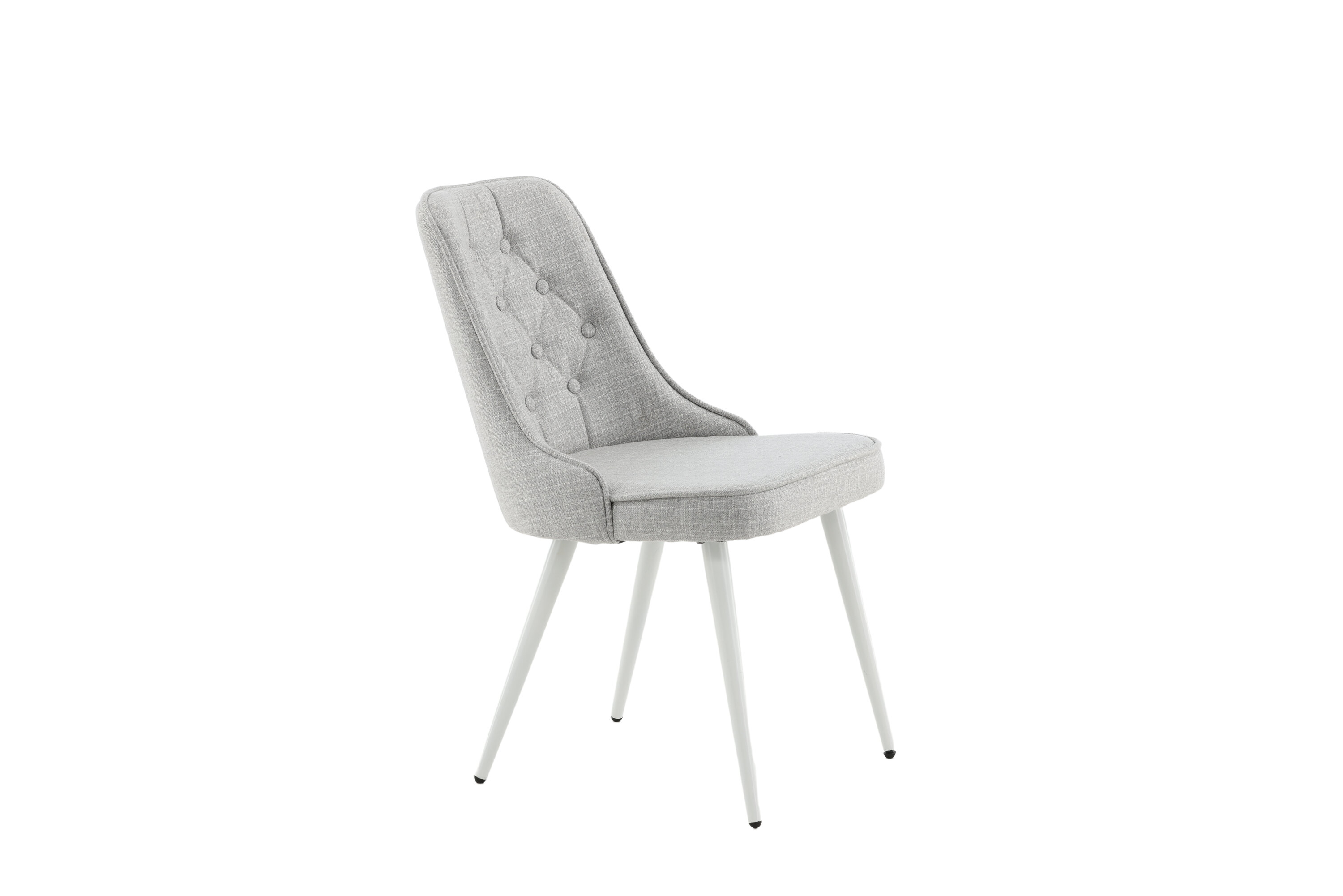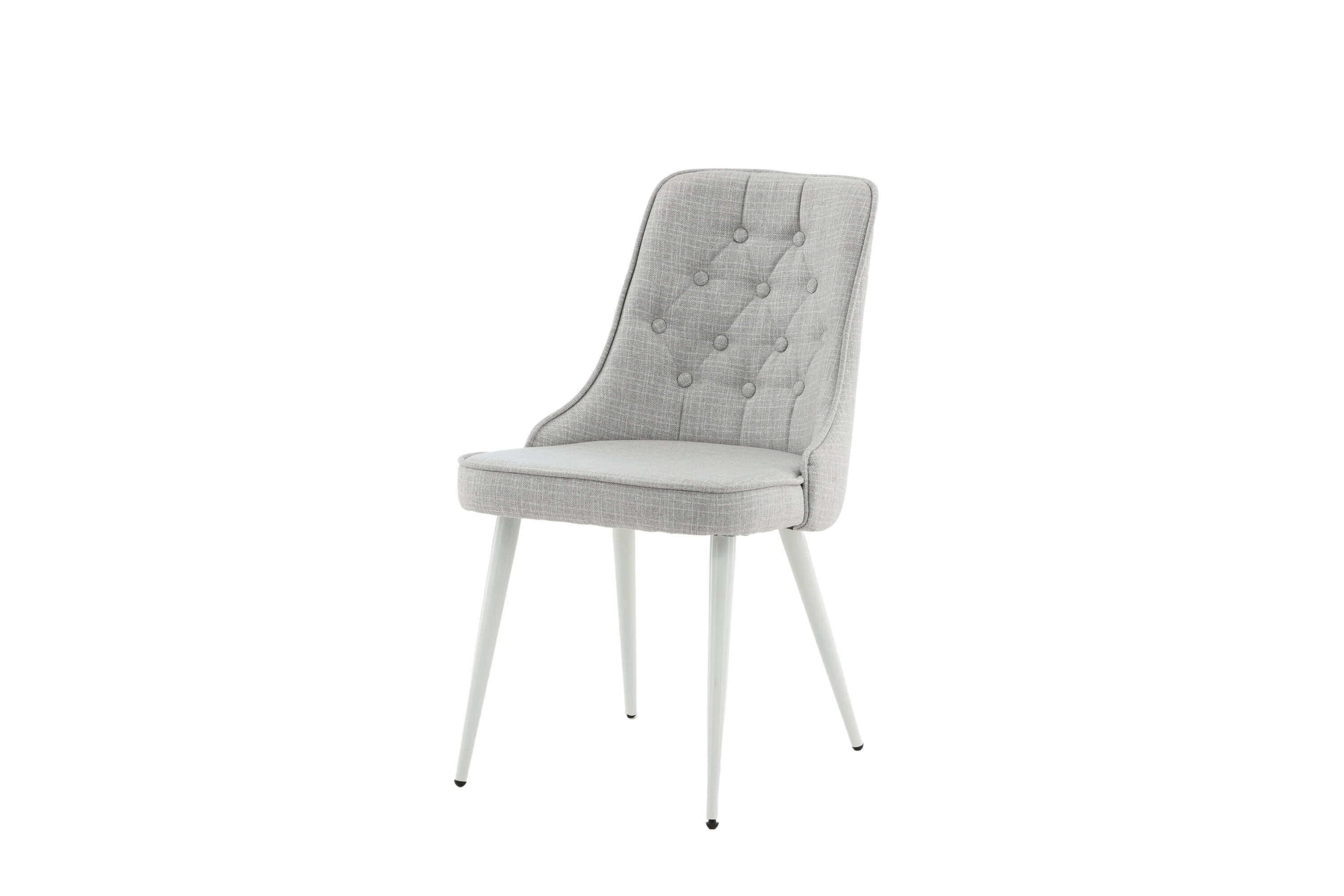 Comfortable, stylish and durable dining chair from the series Velvet Luxury! The chair has a fully dressed design in slender gray polyester fabric with buttons and decorative stitch in the back which turns into a nice detail. Legs in white powder coated metal and soft padding in the back and seat for extra comfort. Lighter assembly is required. Create a pompous eye -catcher in the living room! Care advice: Use textile spray to impregnate the textile before you start using it, it will also make any dirt and stains easier to remove in the future. Remove stains right away, do not rub but tried to suck up gently with a cloth.