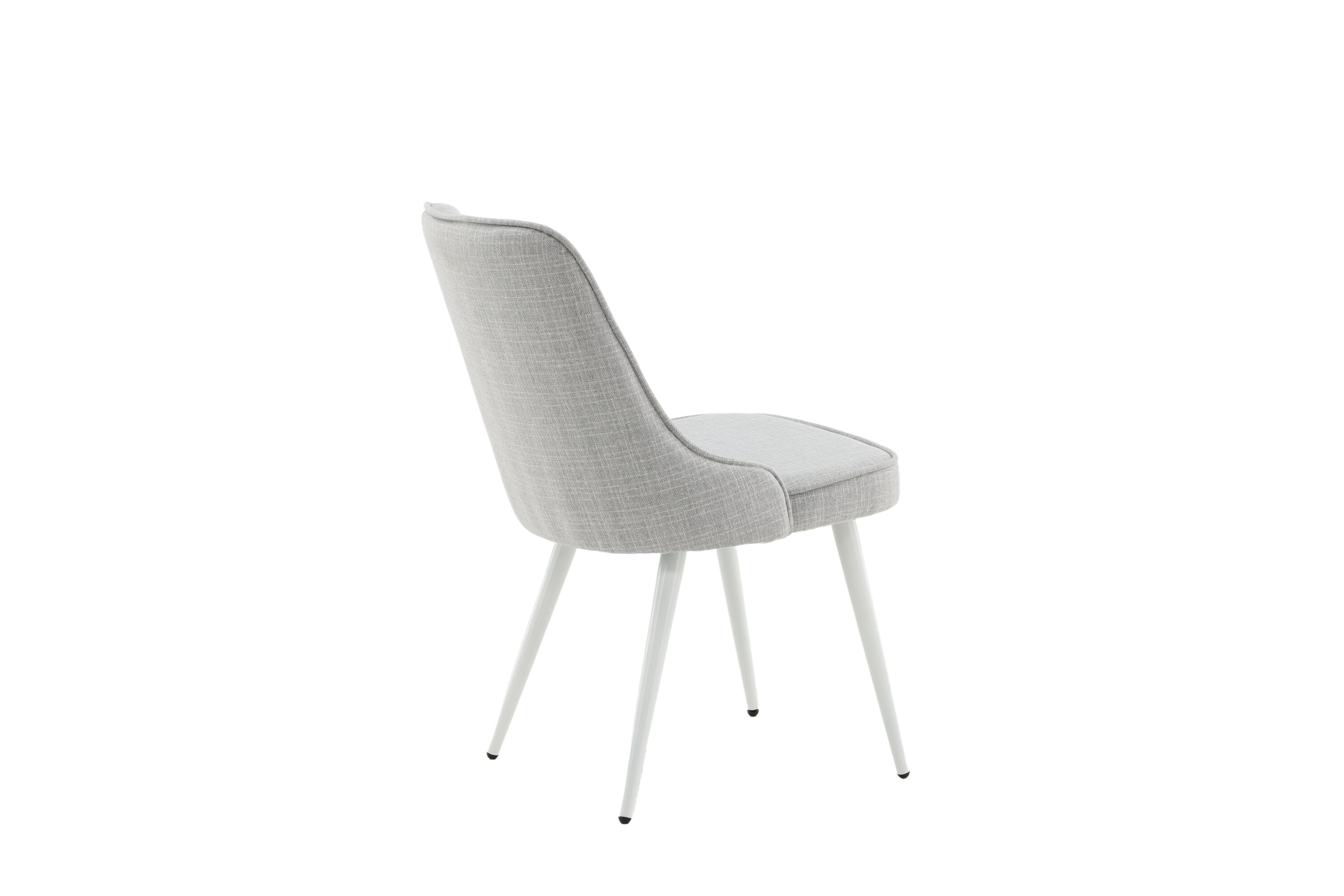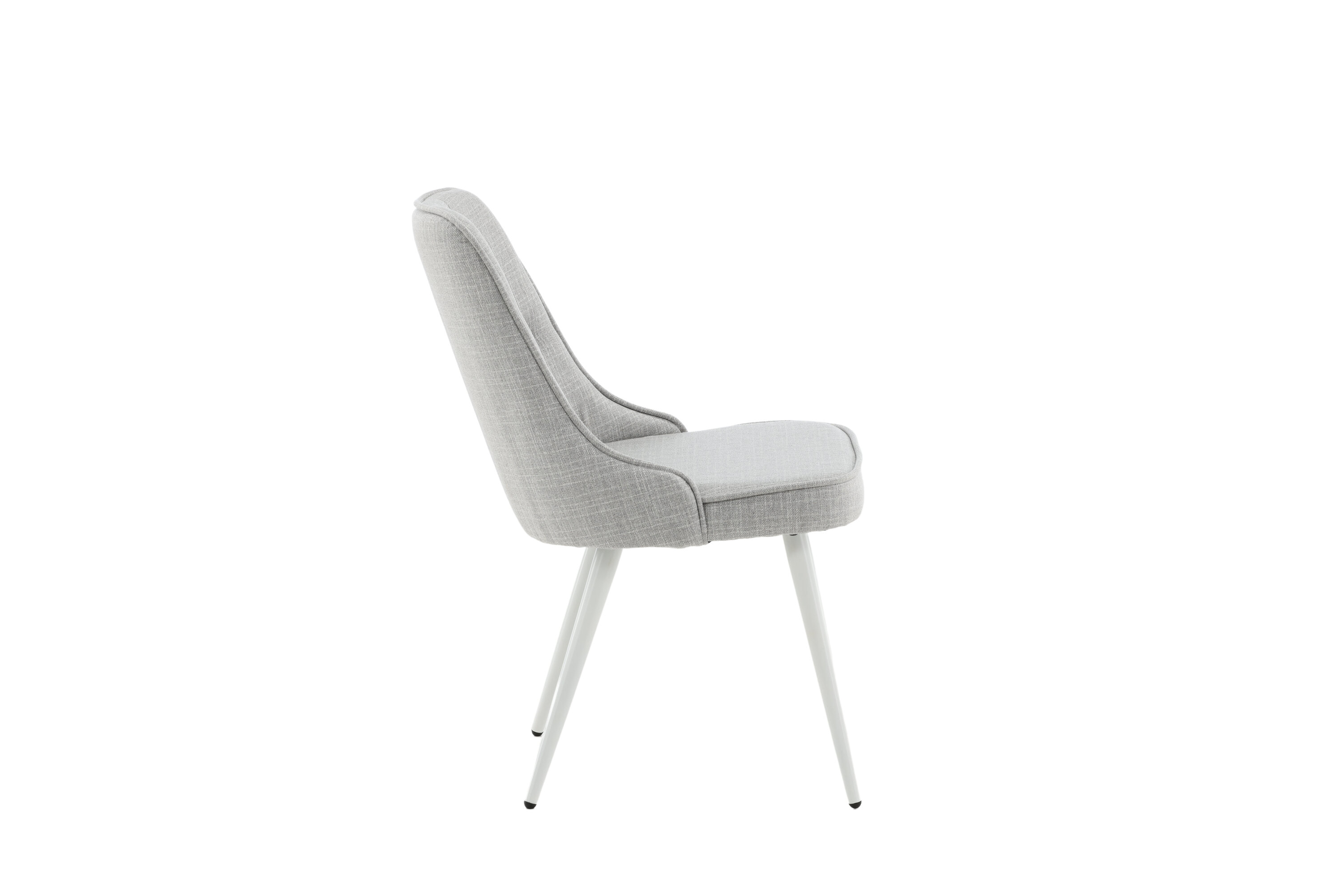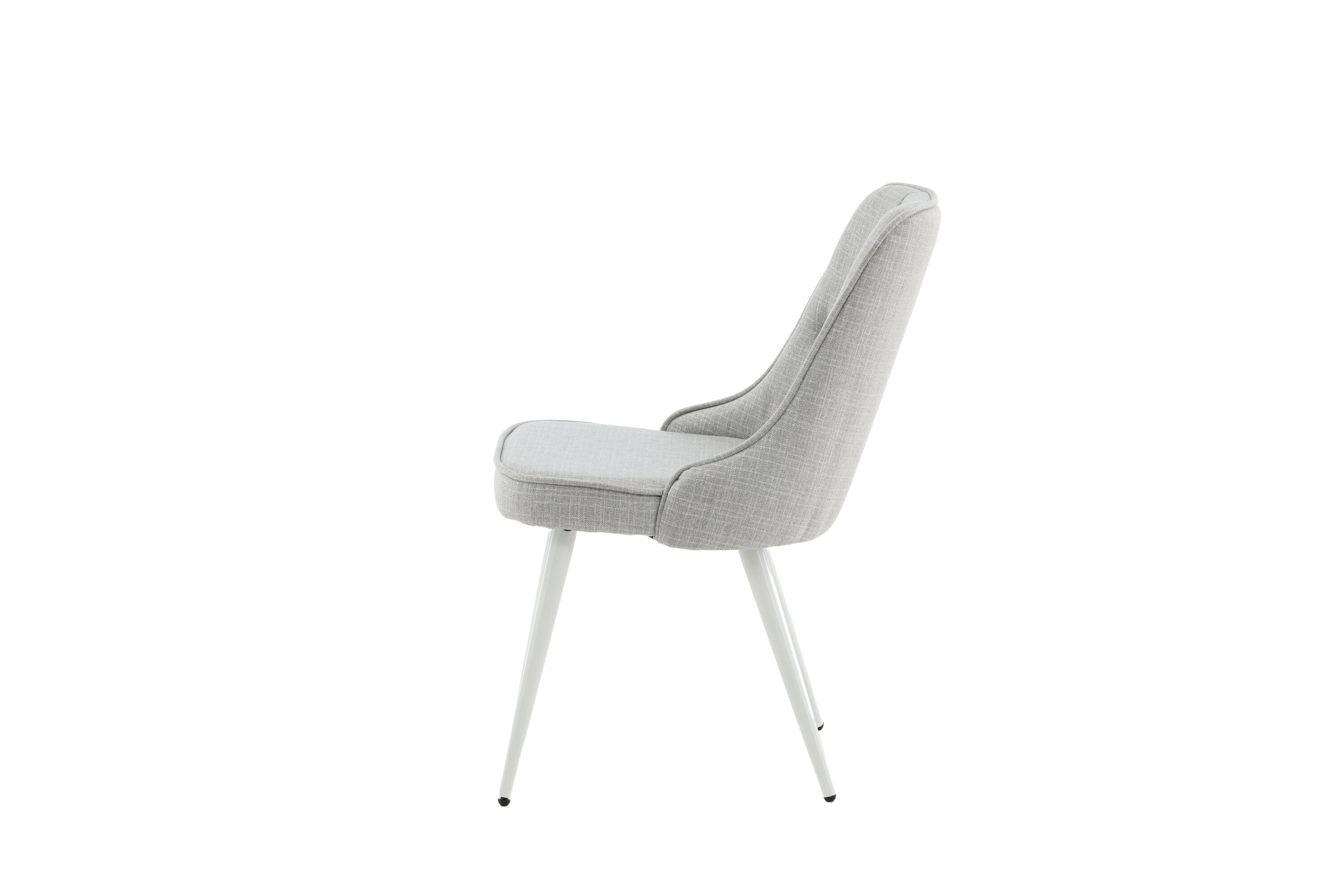 Comfortable, stylish and durable dining chair from the series Velvet Luxury! The chair has a fully dressed design in slender gray polyester fabric with buttons and decorative stitch in the back which turns into a nice detail. Legs in white powder coated metal and soft padding in the back and seat for extra comfort. Lighter assembly is required. Create a pompous eye -catcher in the living room! Care advice: Use textile spray to impregnate the textile before you start using it, it will also make any dirt and stains easier to remove in the future. Remove stains right away, do not rub but tried to suck up gently with a cloth.