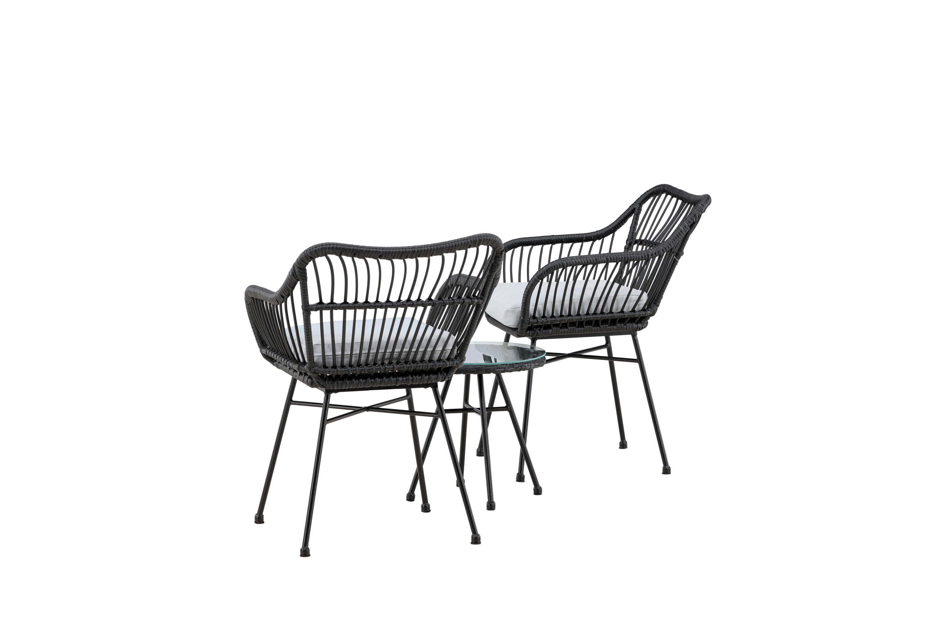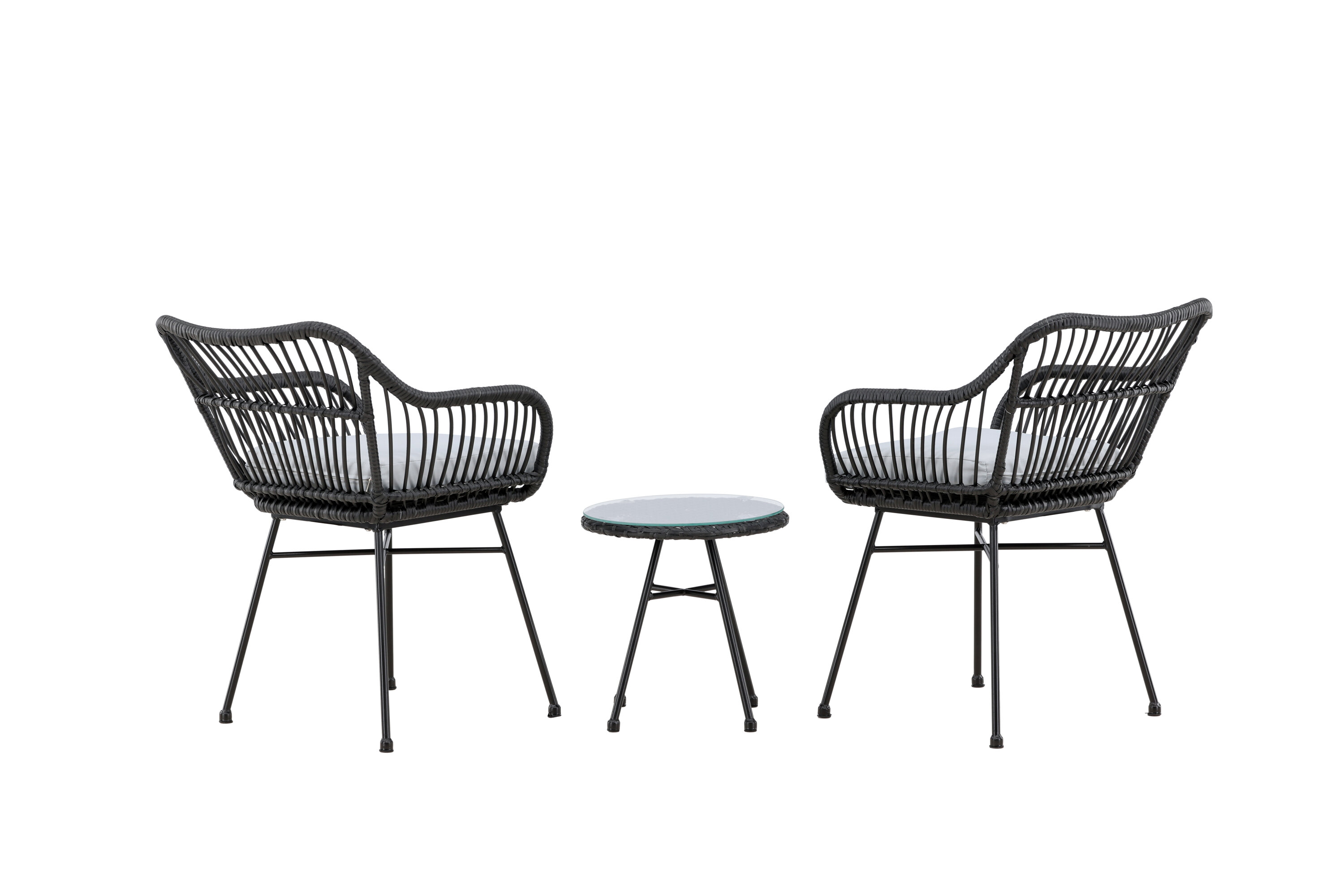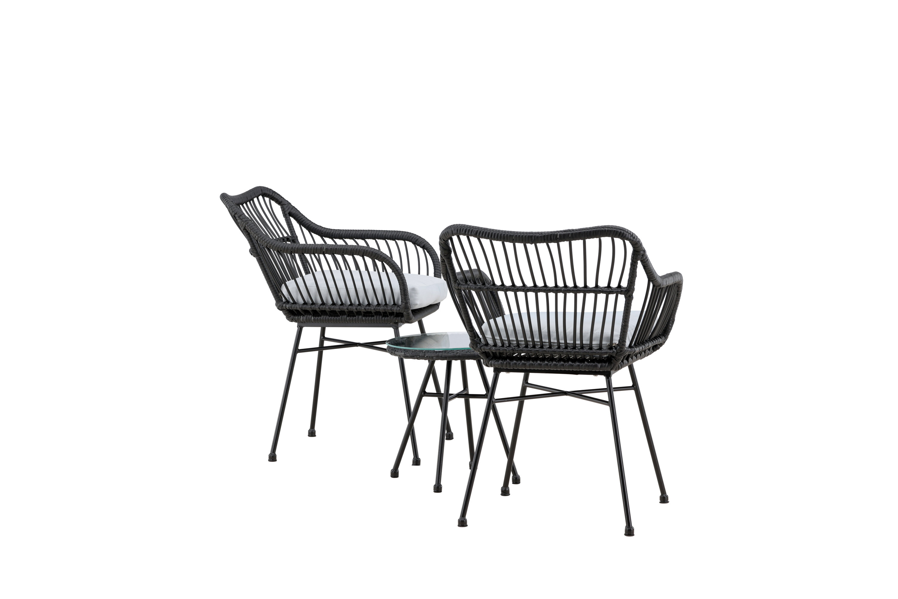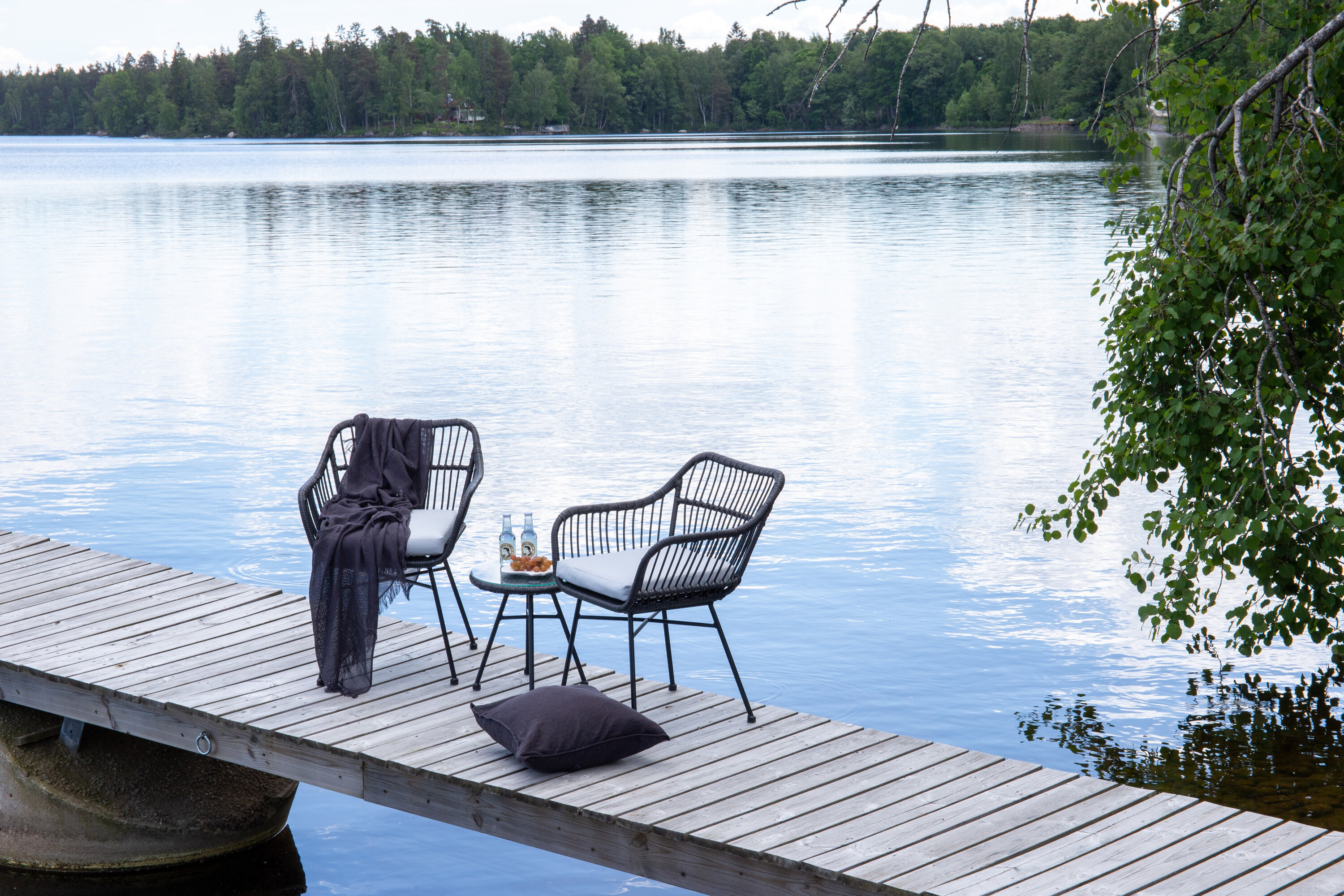 Viga, our stylish balcony set in modern design that fits perfectly on the glazed patio. The furniture group consists of two frame armchairs with a black frame stand in powder coated metal as well as back and seat designed in a stylish pretty pattern of black nature queen. Including white cushions and a coffee table with details in black nature queen and a glass table top. Furnish the patio with a balcony set that is guaranteed to extend the late summer evenings with loved ones! Care advice: A natural material that is incredibly neat and trendy, however, not very weather resistant. Cutting furniture should preferably not stand outdoors but should be placed in dry spaces. Avoid large temperature differences. The easiest cleaning is done with a damp cloth.