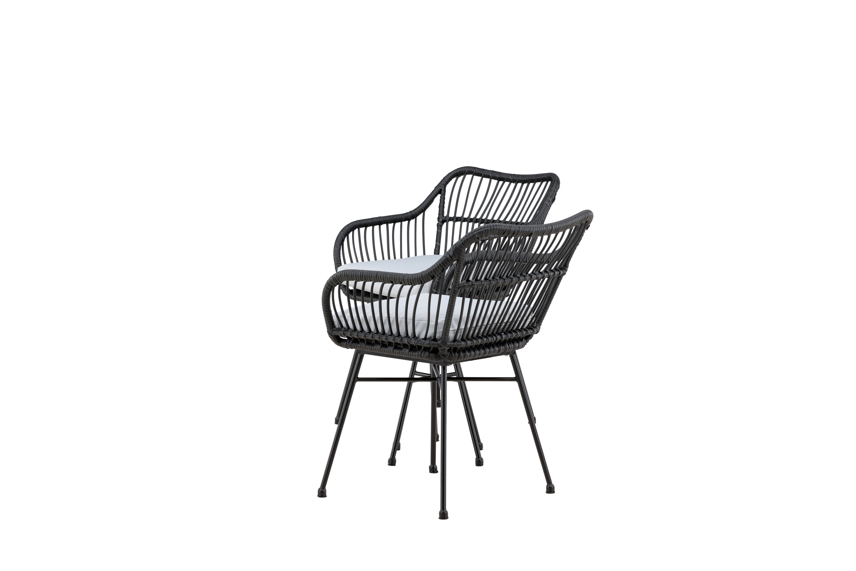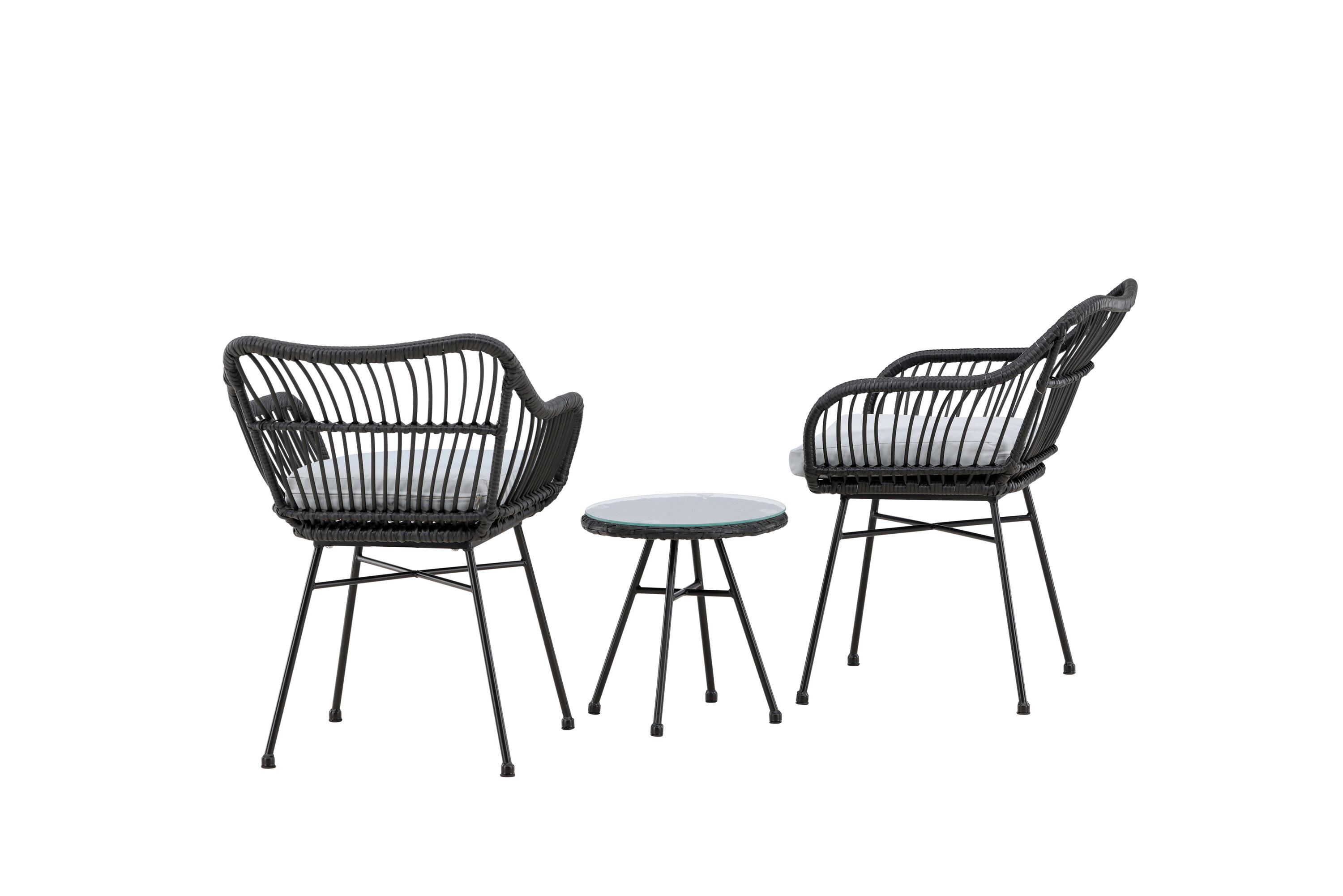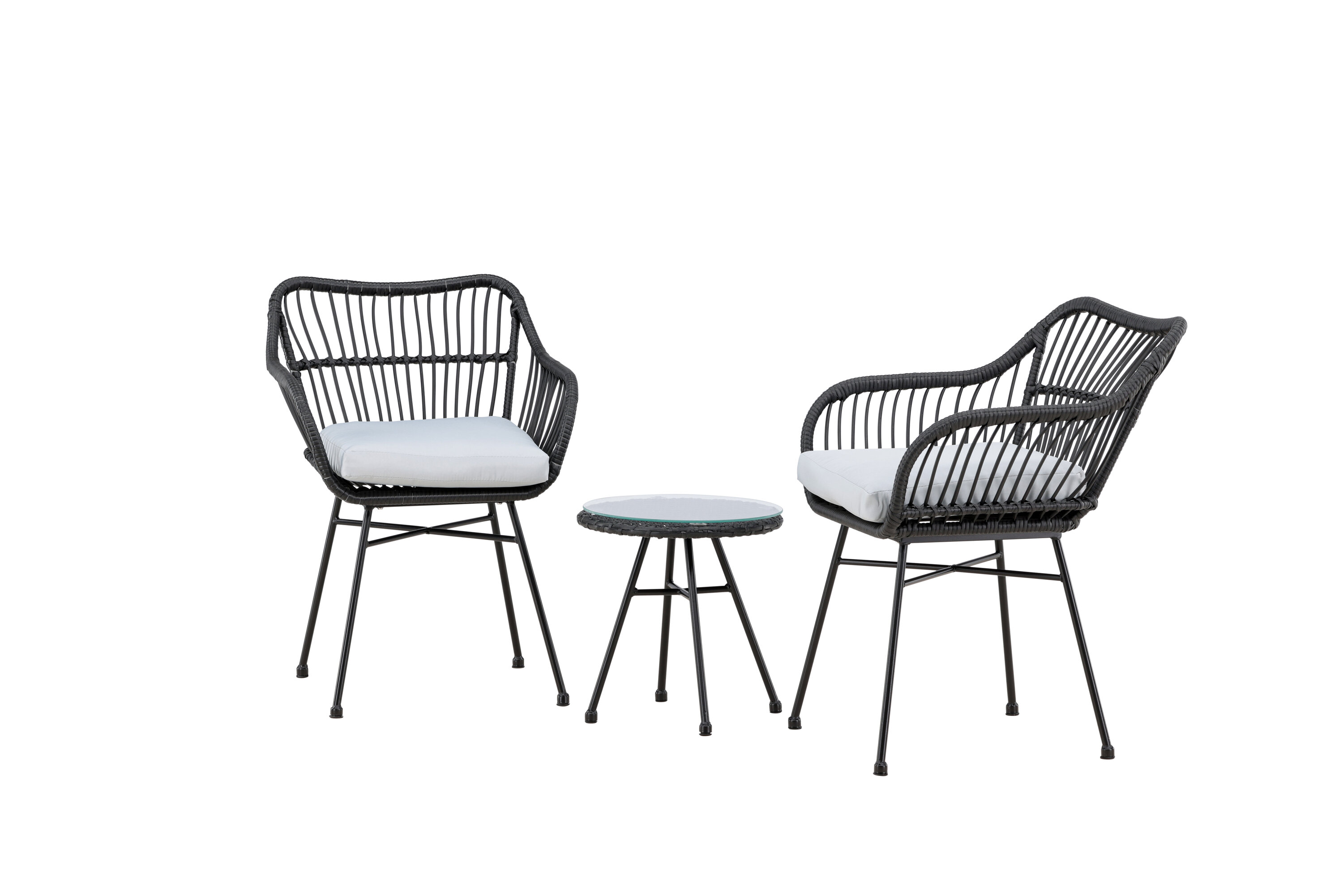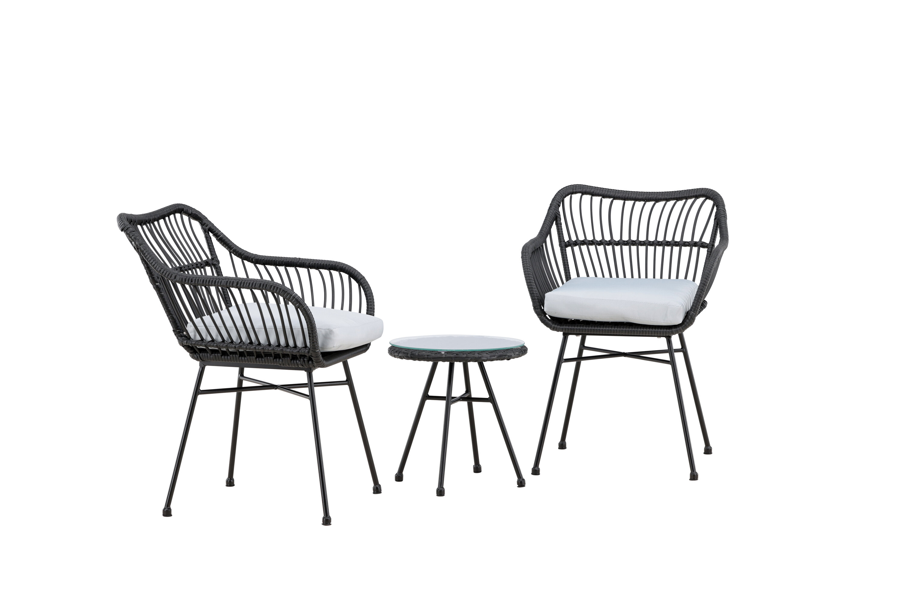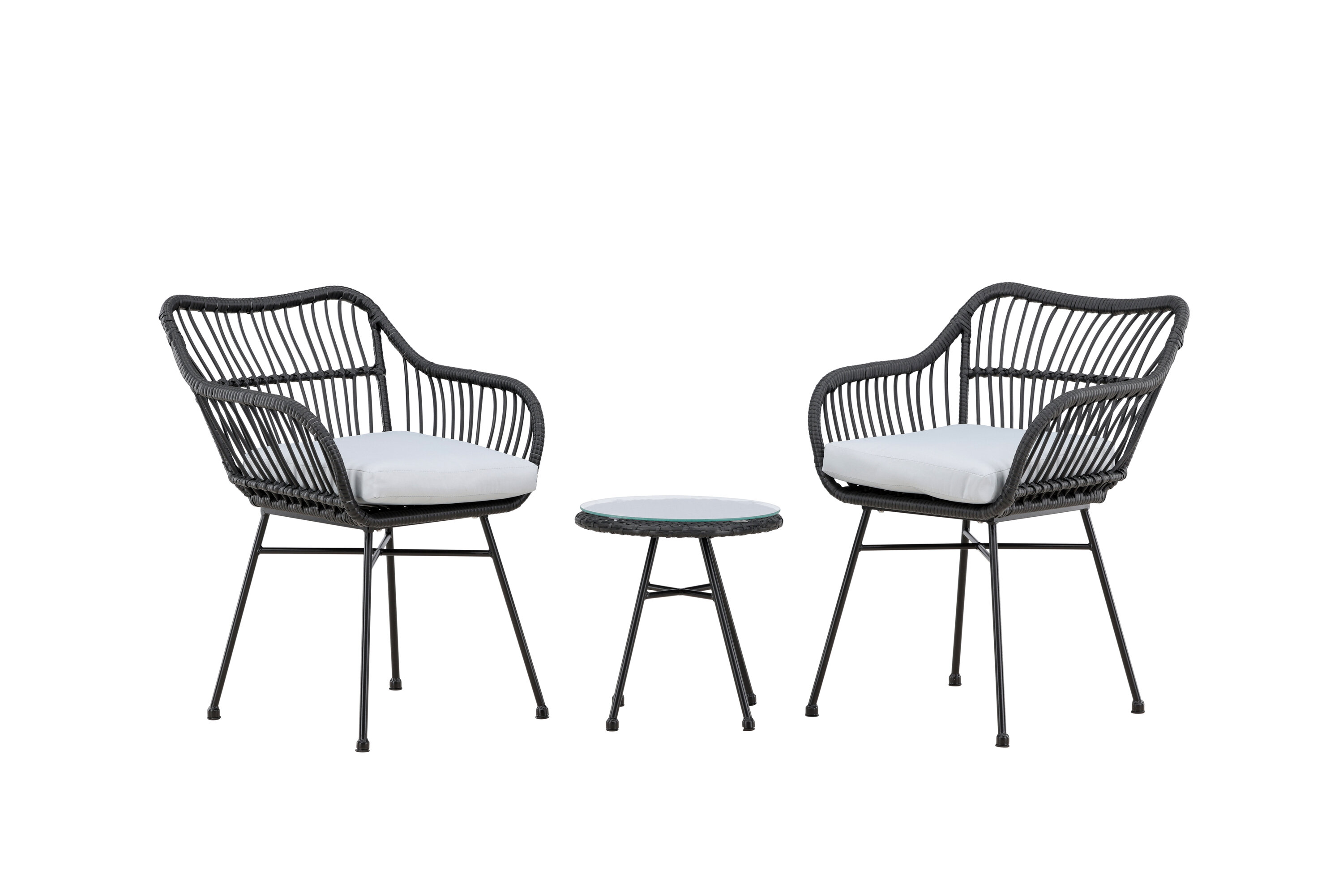 Viga, our stylish balcony set in modern design that fits perfectly on the glazed patio. The furniture group consists of two frame armchairs with a black frame stand in powder coated metal as well as back and seat designed in a stylish pretty pattern of black nature queen. Including white cushions and a coffee table with details in black nature queen and a glass table top. Furnish the patio with a balcony set that is guaranteed to extend the late summer evenings with loved ones! Care advice: A natural material that is incredibly neat and trendy, however, not very weather resistant. Cutting furniture should preferably not stand outdoors but should be placed in dry spaces. Avoid large temperature differences. The easiest cleaning is done with a damp cloth.