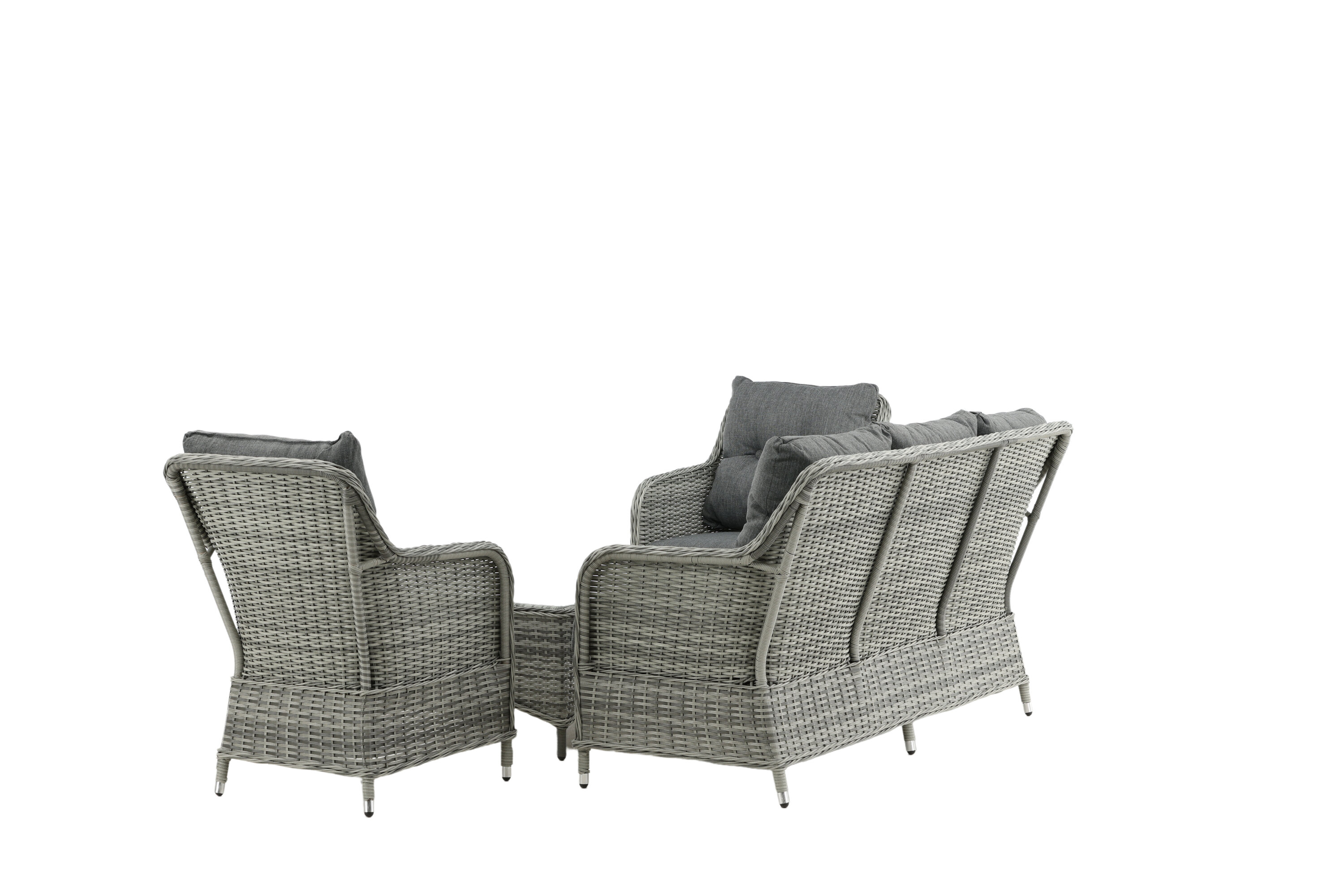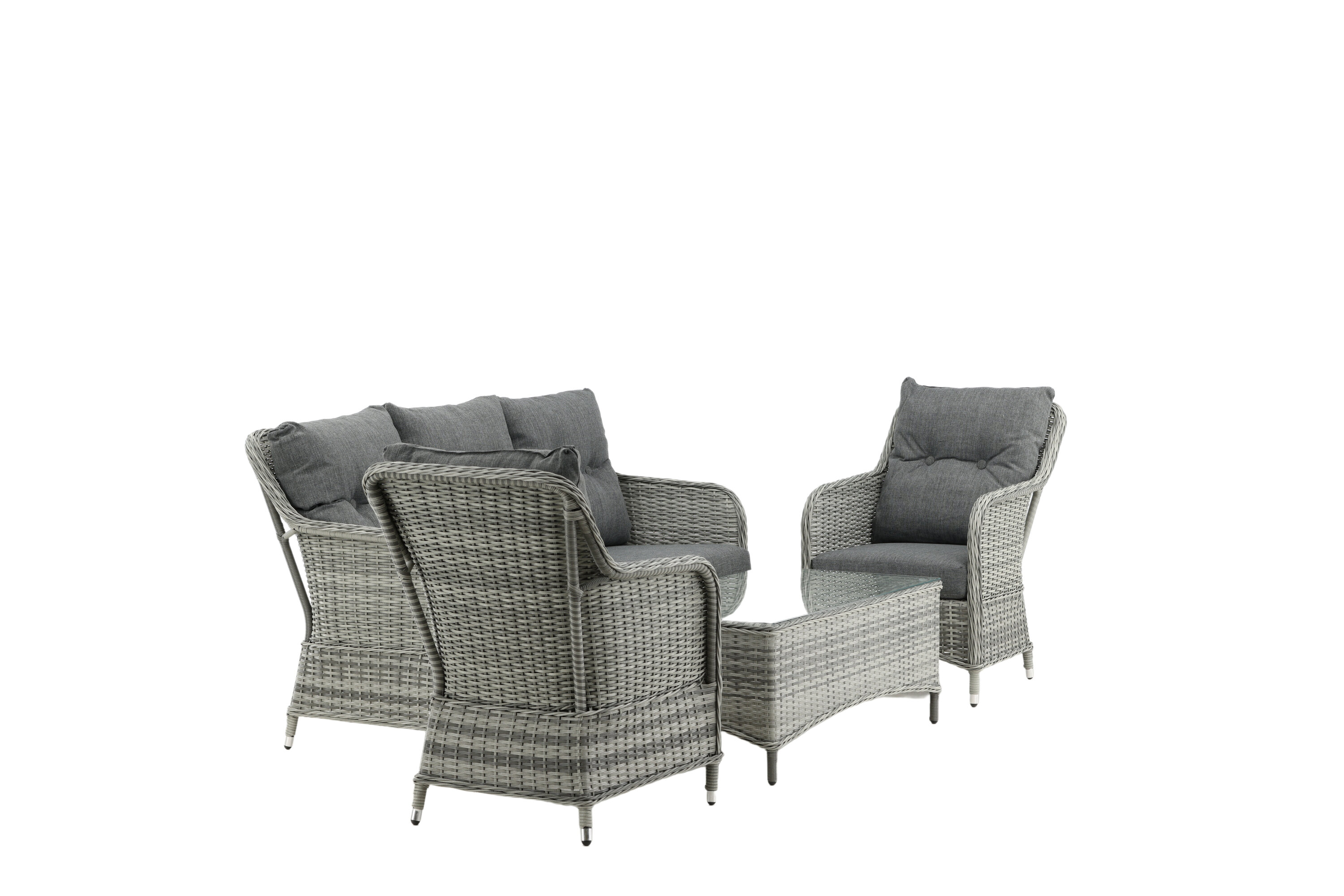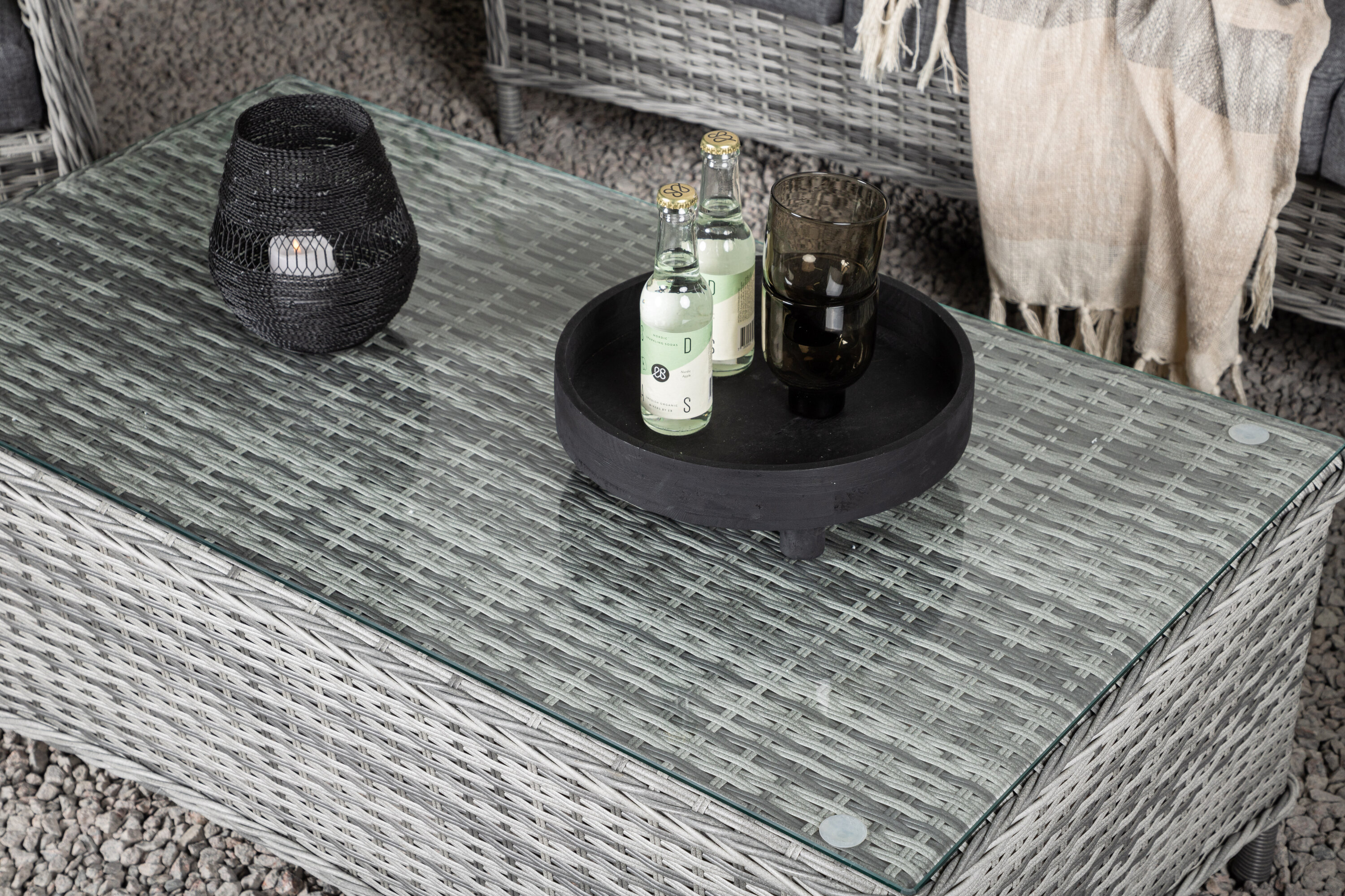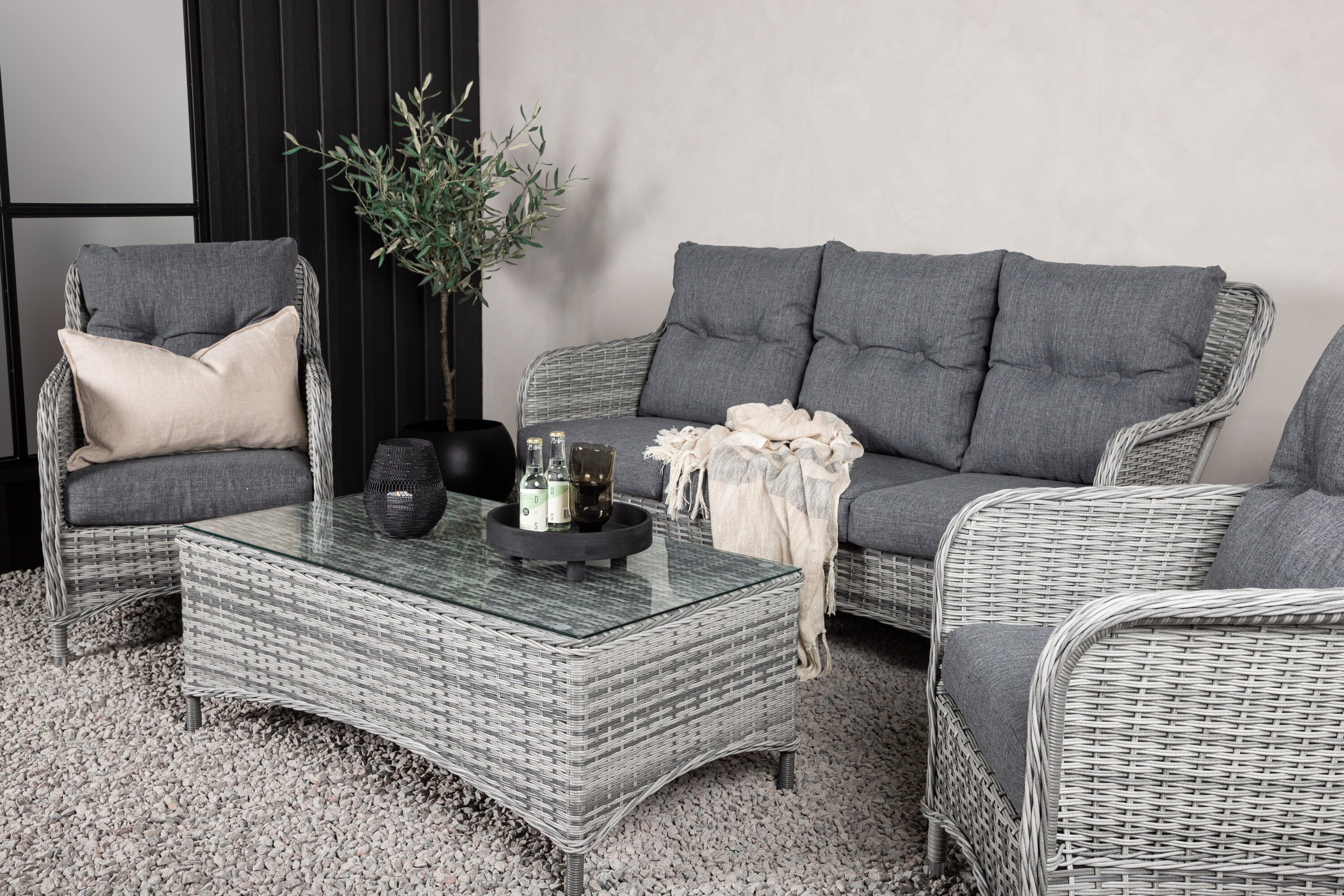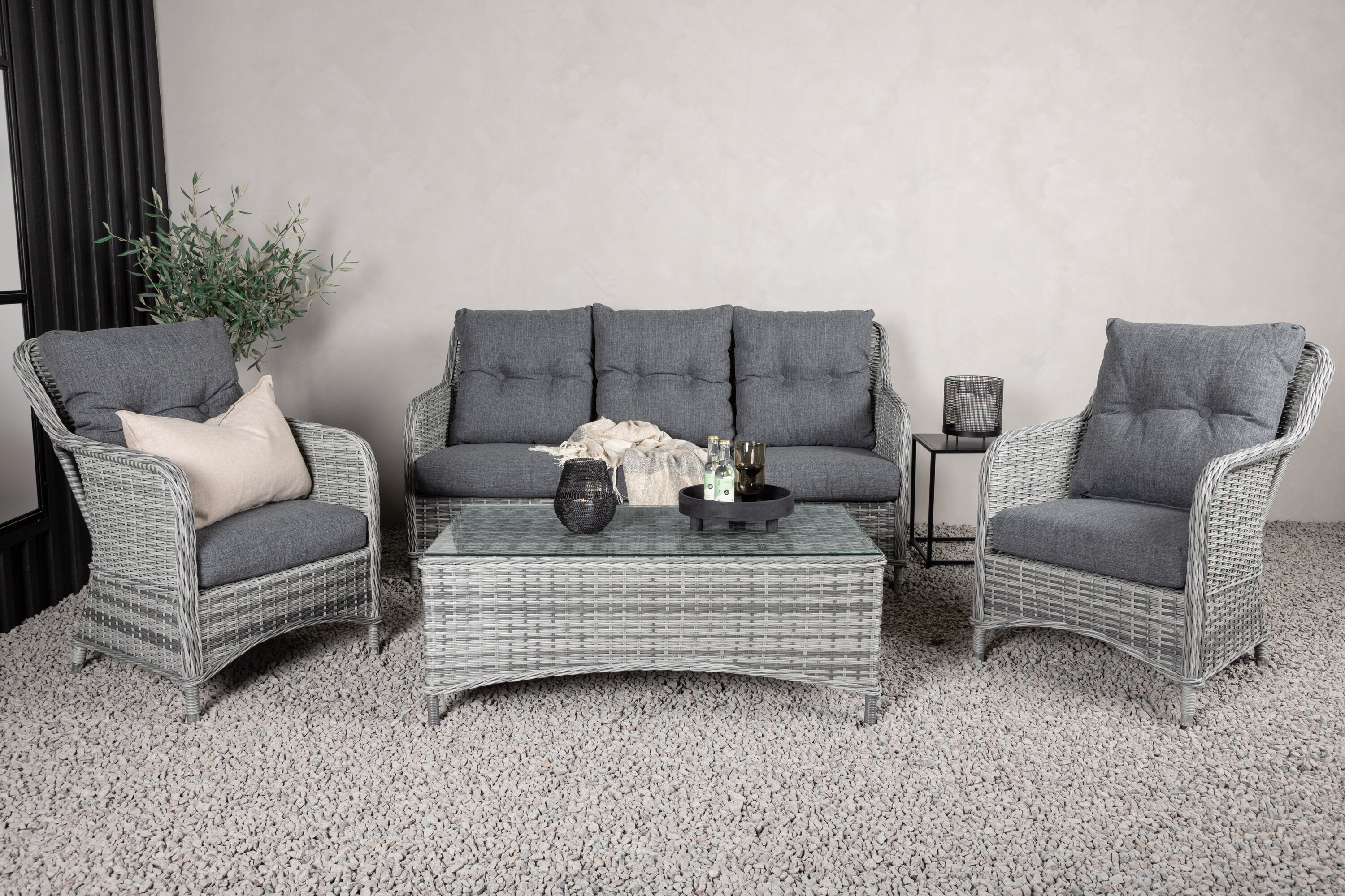 Vikelund is an exclusive sofa group in convenient design that combines timeless design with good comfort to your patio. The sofa group consists of a three -seat sofa, two frame armchairs including soft, thick dark gray pickled cushions and a lower coffee table with a glass table. Made of light gray artificial rattan with an aluminum frame. Here you and your guests can enjoy late summer evenings! Care advice: Konstrite is a plastic material that is perfect for our Scandinavian climate. The material is UV-resistant and can withstand weather and wind. The fact that it is UV-resistant means that the furniture does not fade, however, we always recommend storing the furniture under a furniture protection or otherwise dry and cool-to extend the service life.