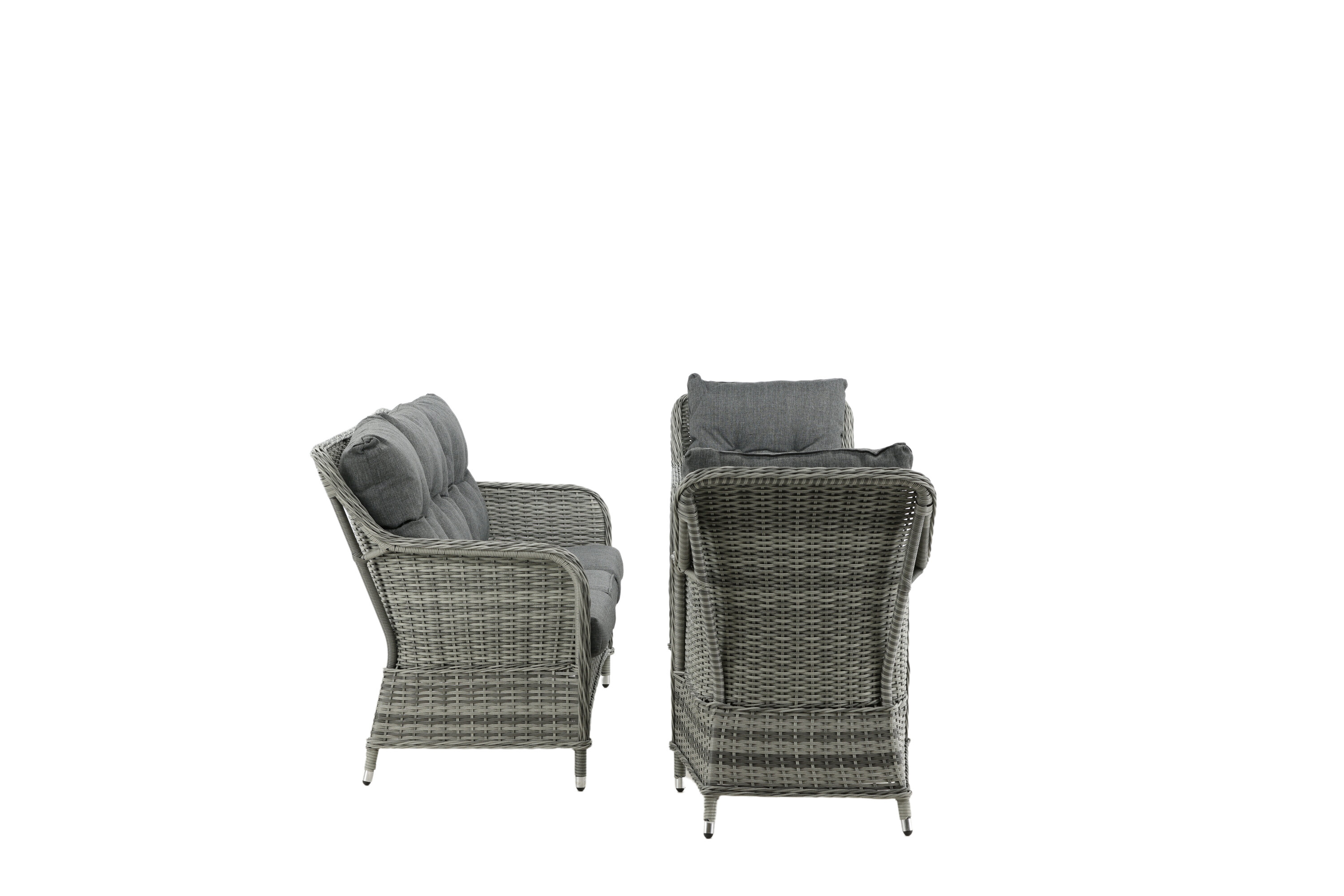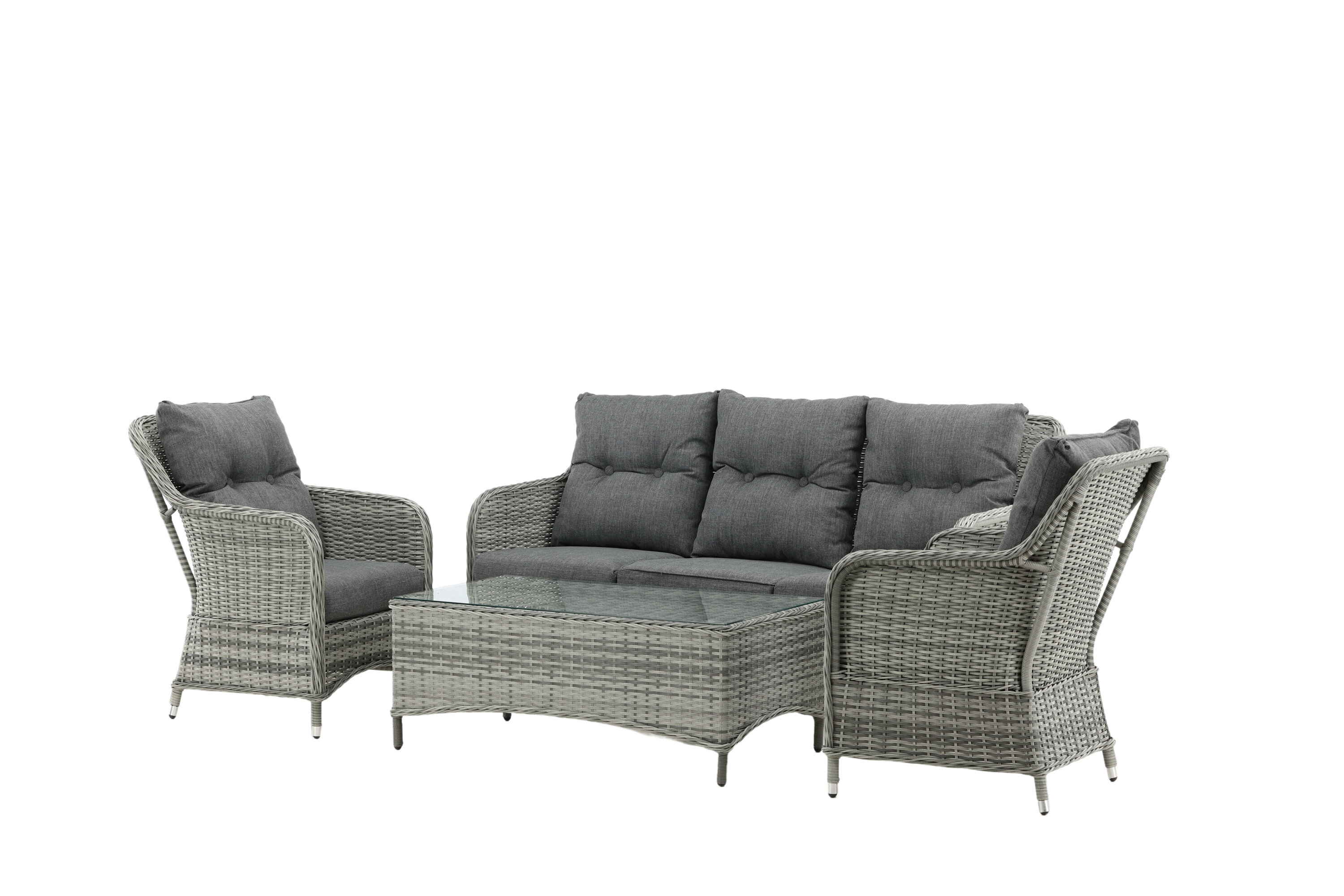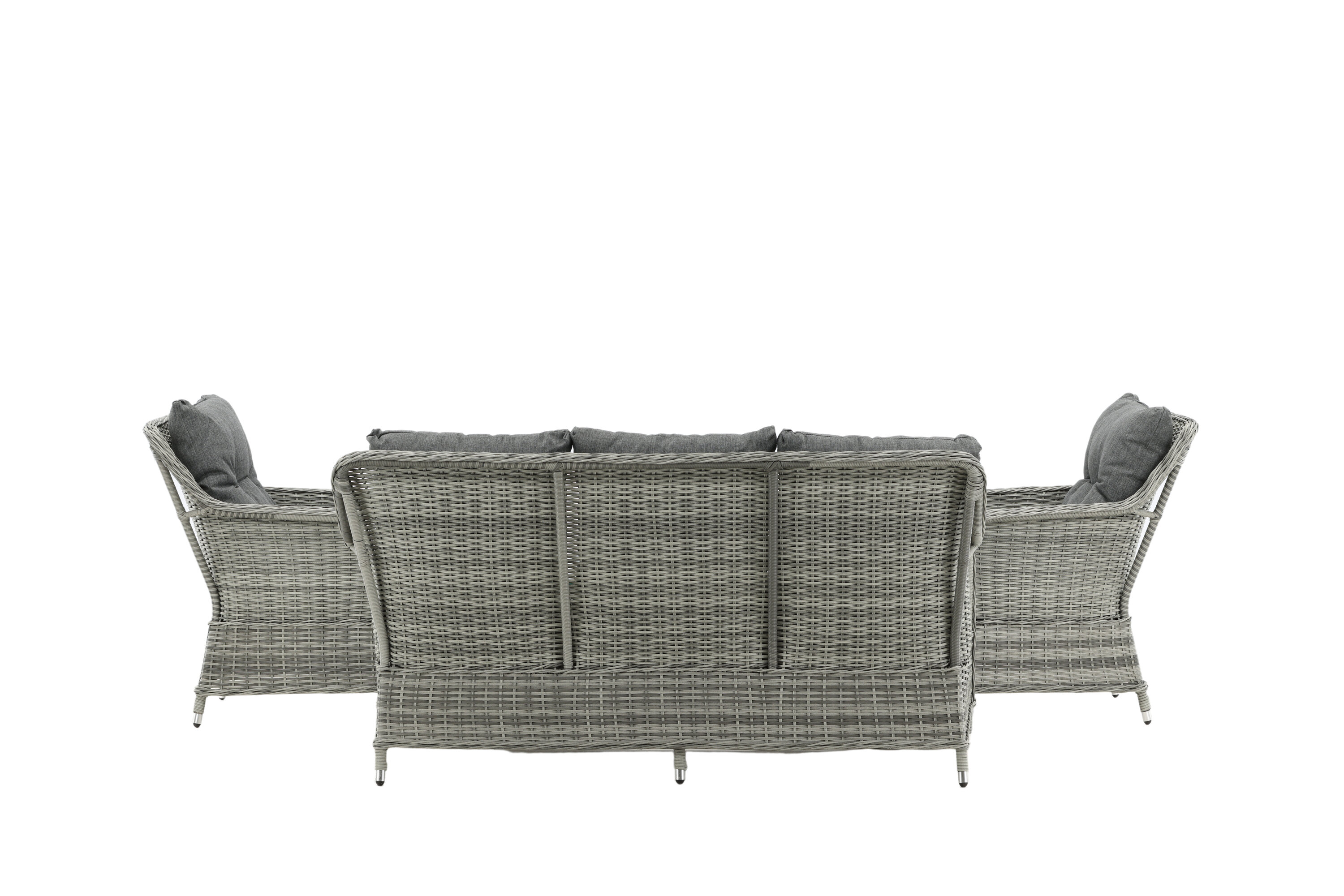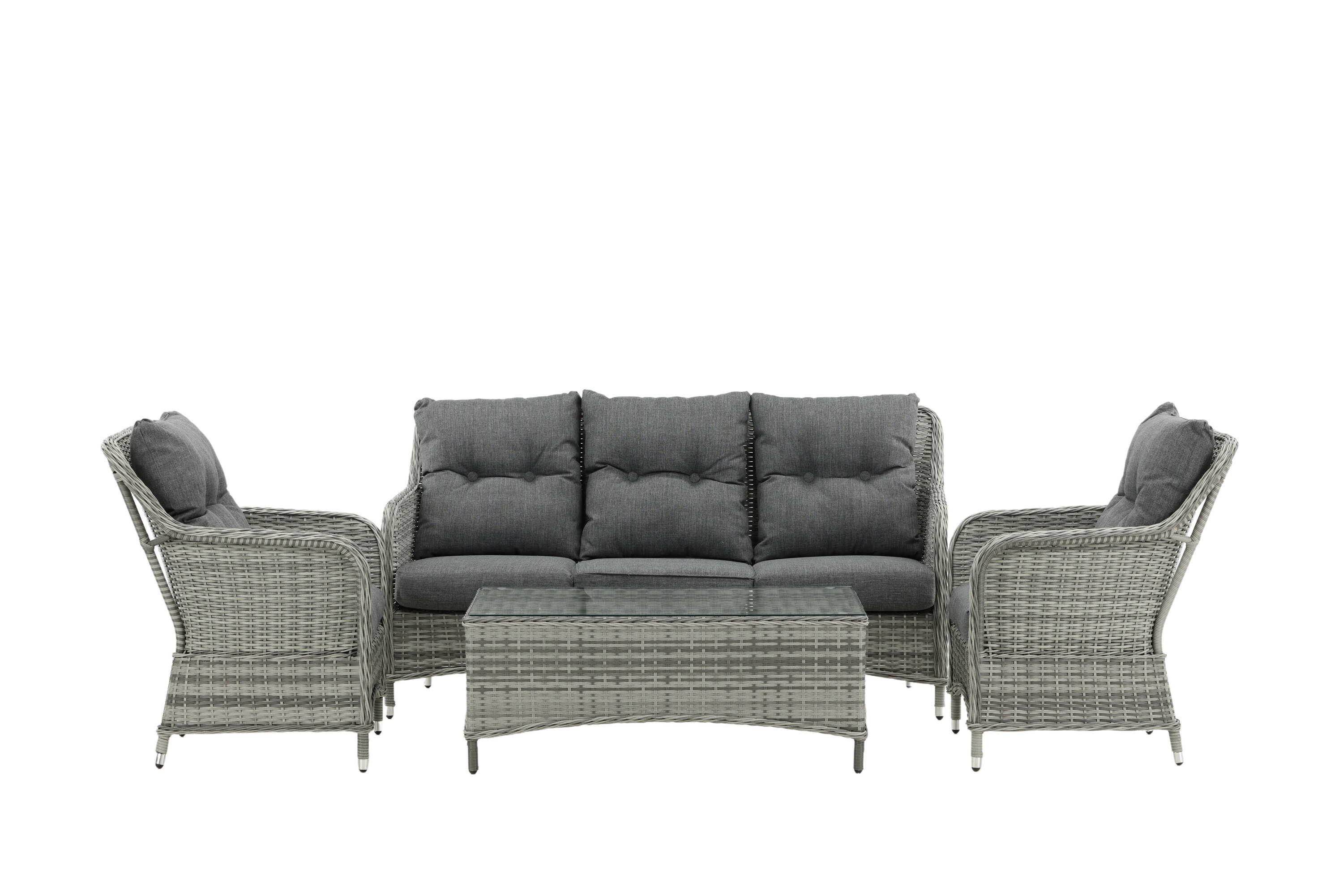 Vikelund is an exclusive sofa group in convenient design that combines timeless design with good comfort to your patio. The sofa group consists of a three -seat sofa, two frame armchairs including soft, thick dark gray pickled cushions and a lower coffee table with a glass table. Made of light gray artificial rattan with an aluminum frame. Here you and your guests can enjoy late summer evenings! Care advice: Konstrite is a plastic material that is perfect for our Scandinavian climate. The material is UV-resistant and can withstand weather and wind. The fact that it is UV-resistant means that the furniture does not fade, however, we always recommend storing the furniture under a furniture protection or otherwise dry and cool-to extend the service life.