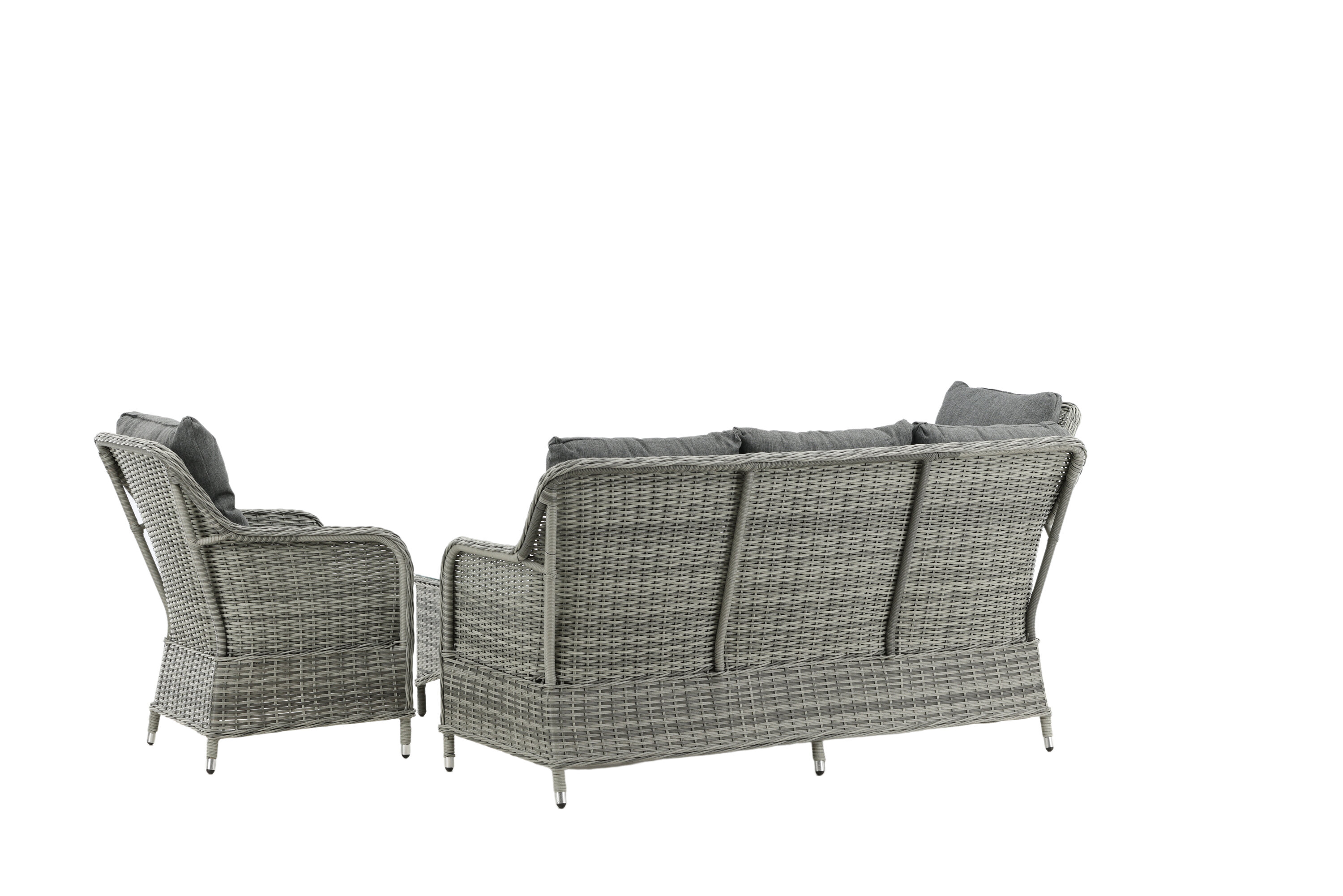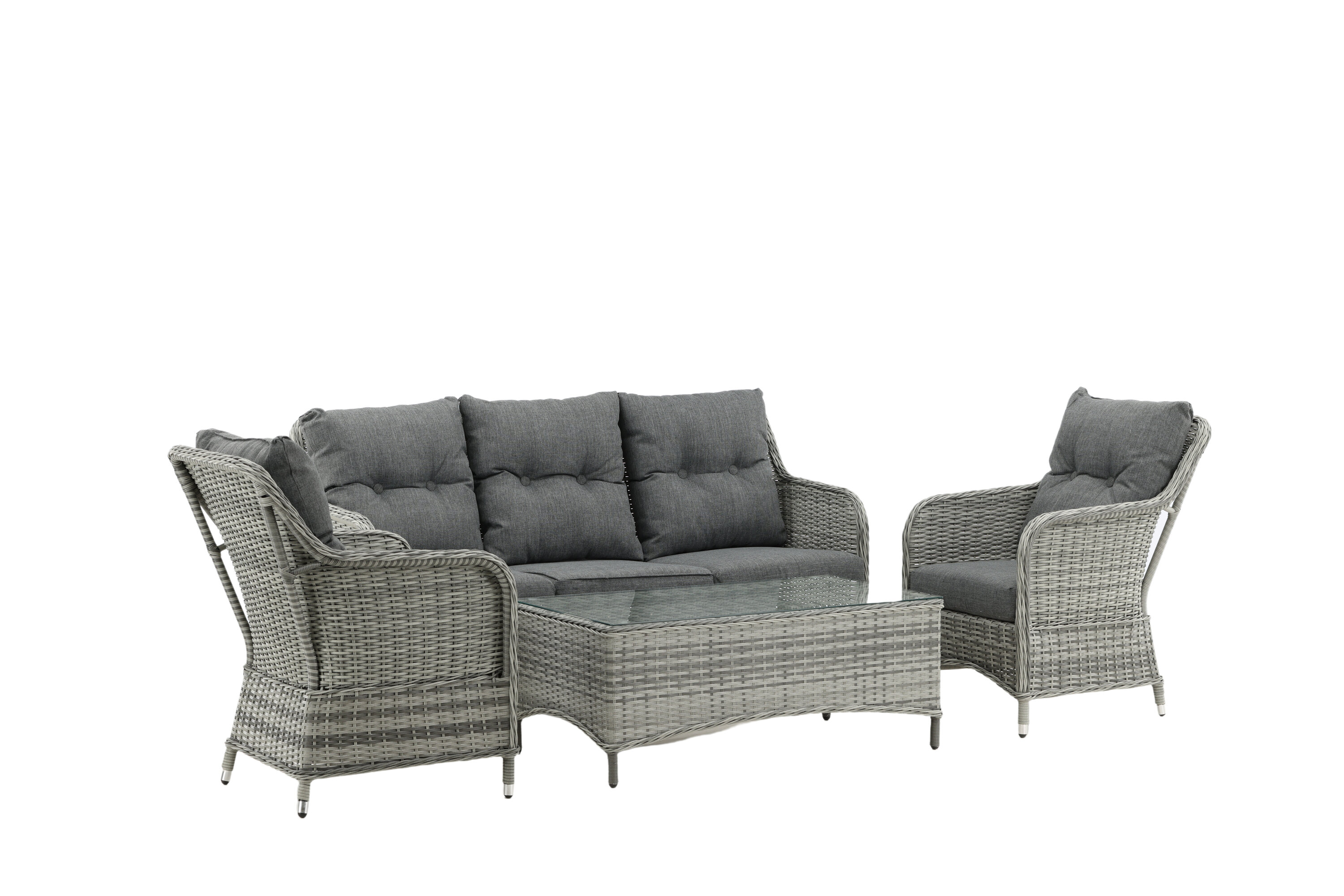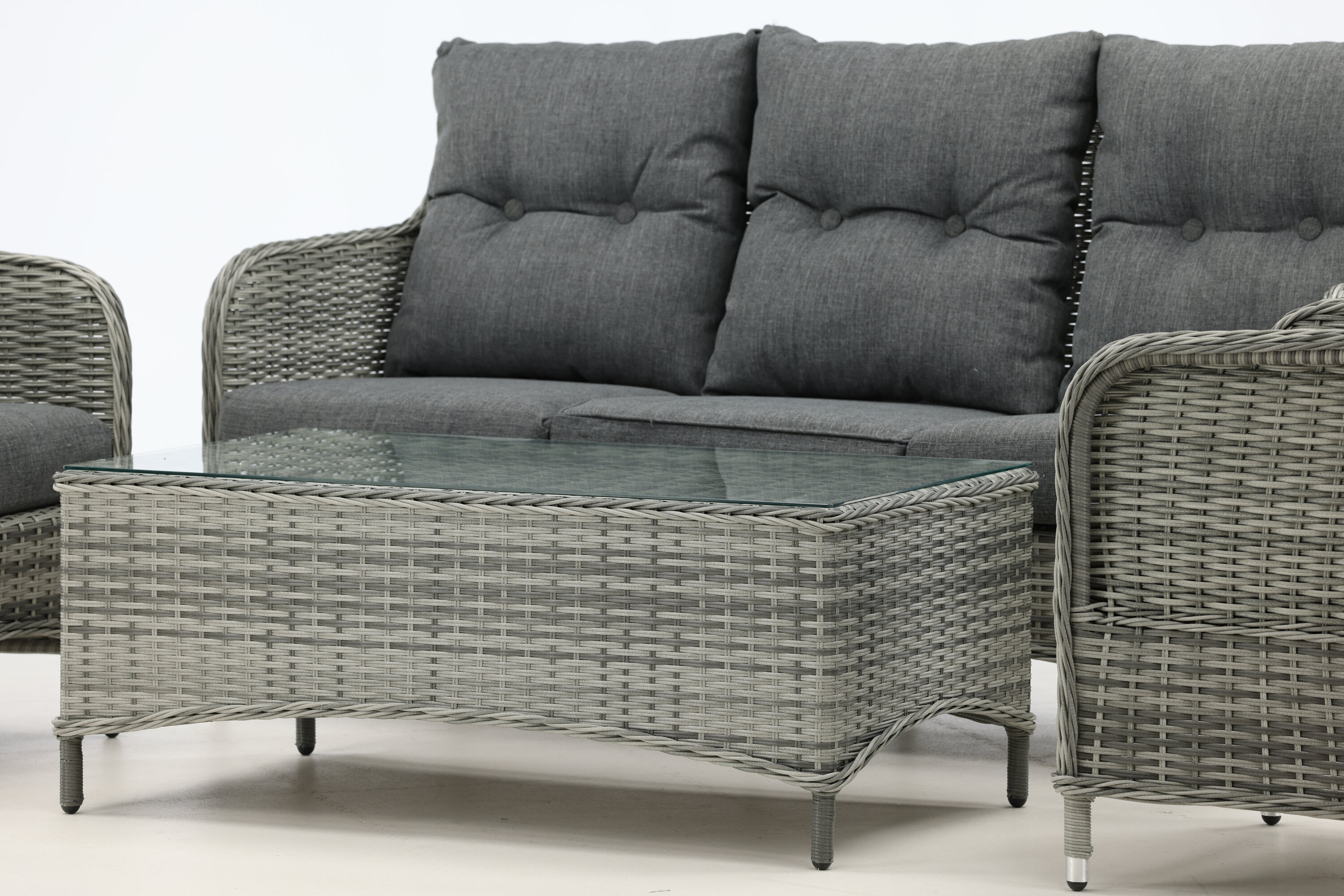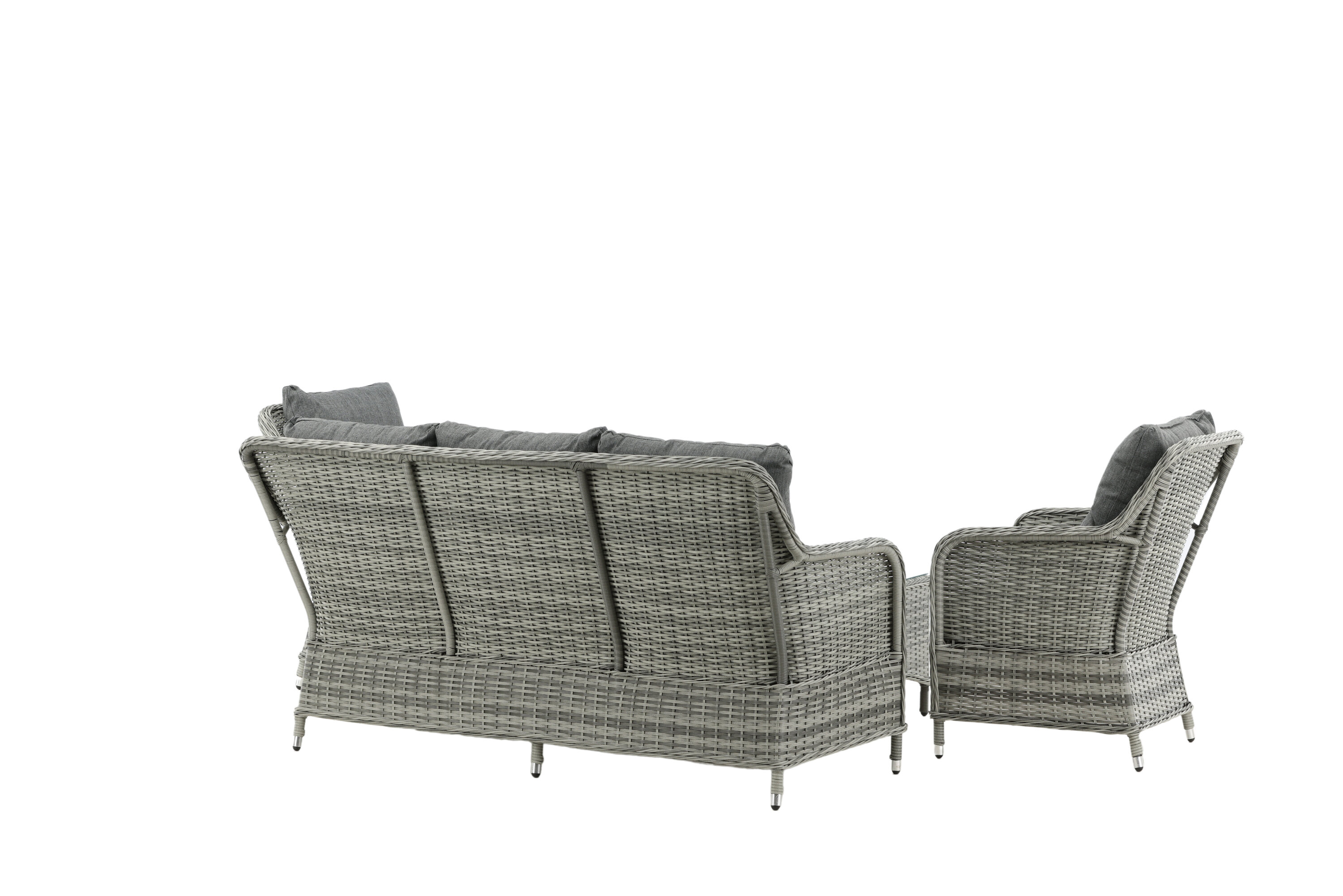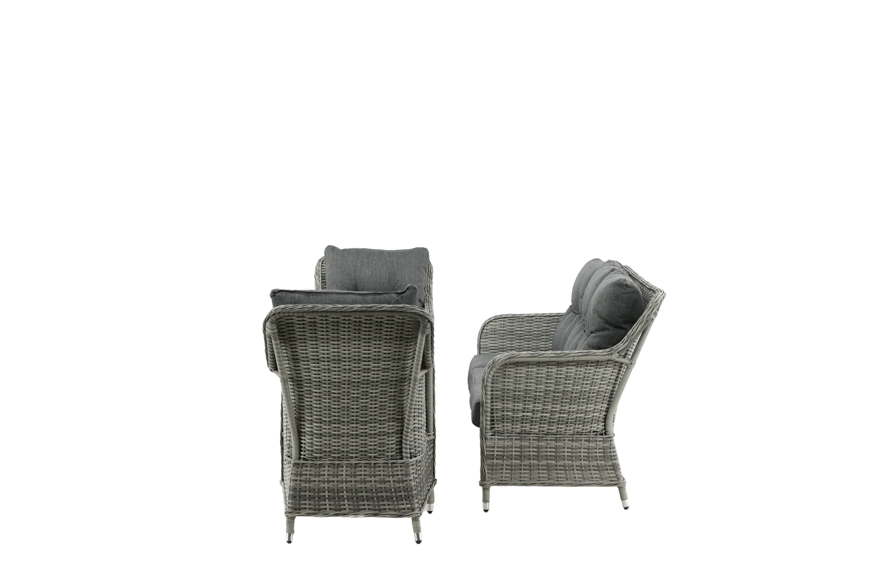 Vikelund is an exclusive sofa group in convenient design that combines timeless design with good comfort to your patio. The sofa group consists of a three -seat sofa, two frame armchairs including soft, thick dark gray pickled cushions and a lower coffee table with a glass table. Made of light gray artificial rattan with an aluminum frame. Here you and your guests can enjoy late summer evenings! Care advice: Konstrite is a plastic material that is perfect for our Scandinavian climate. The material is UV-resistant and can withstand weather and wind. The fact that it is UV-resistant means that the furniture does not fade, however, we always recommend storing the furniture under a furniture protection or otherwise dry and cool-to extend the service life.