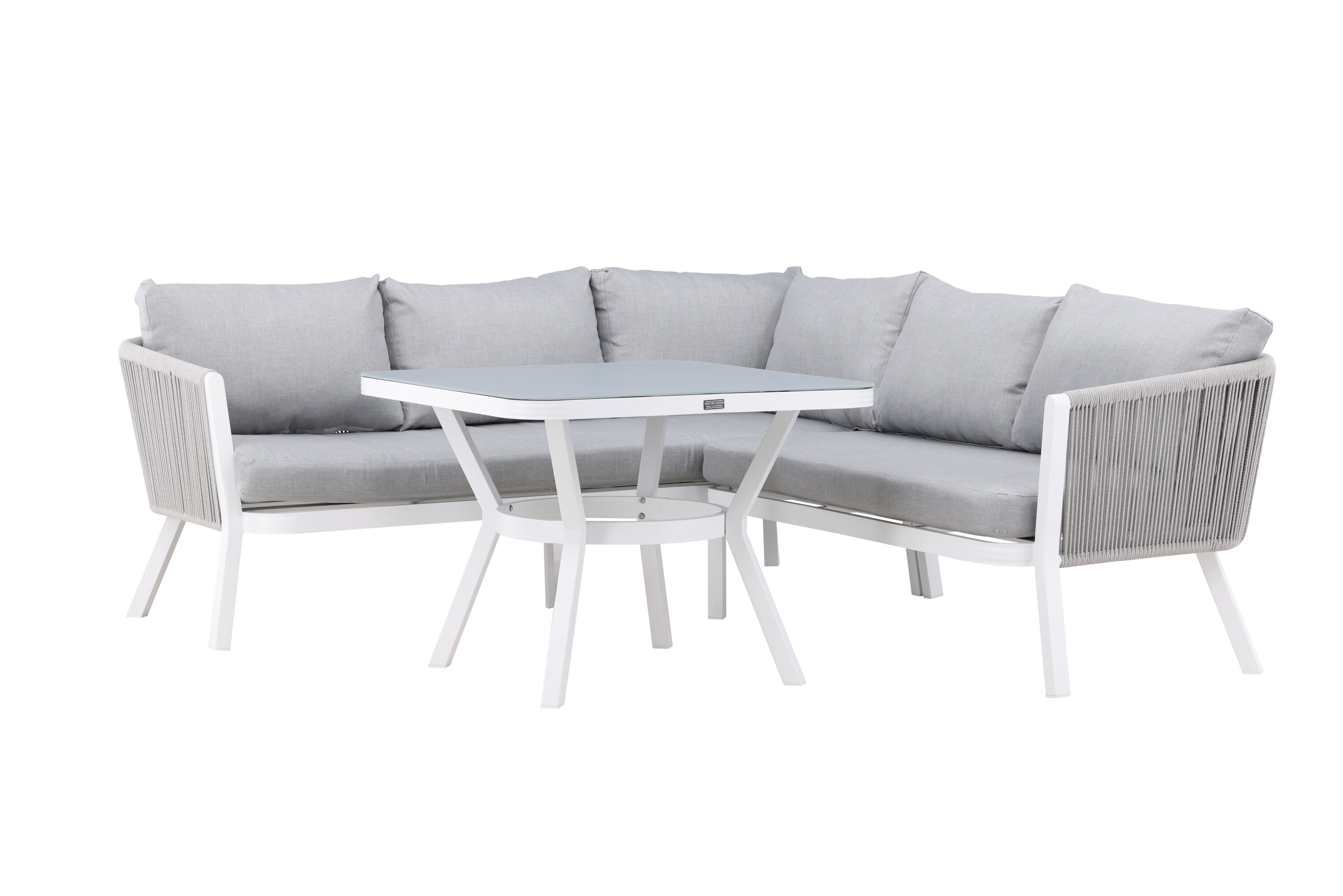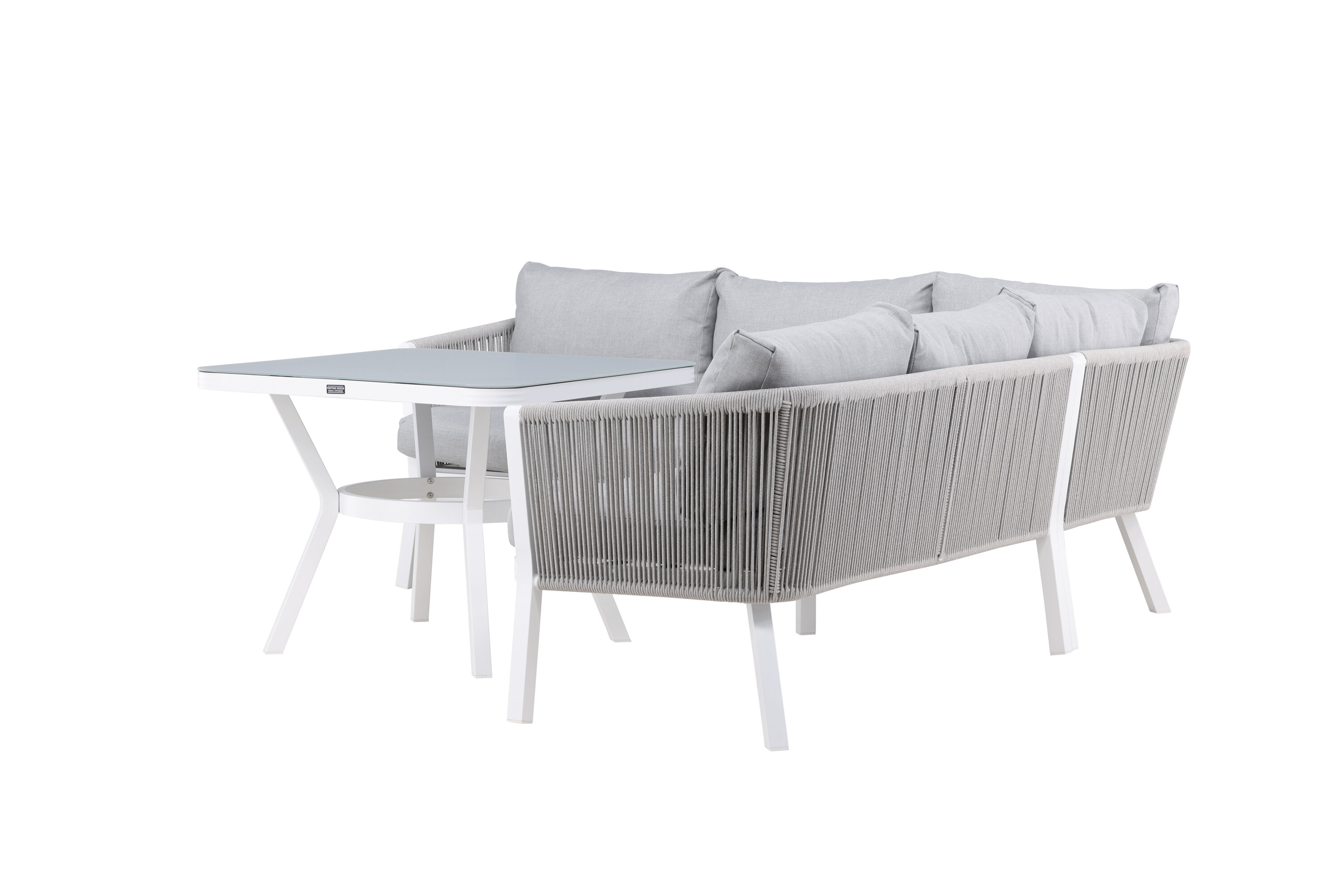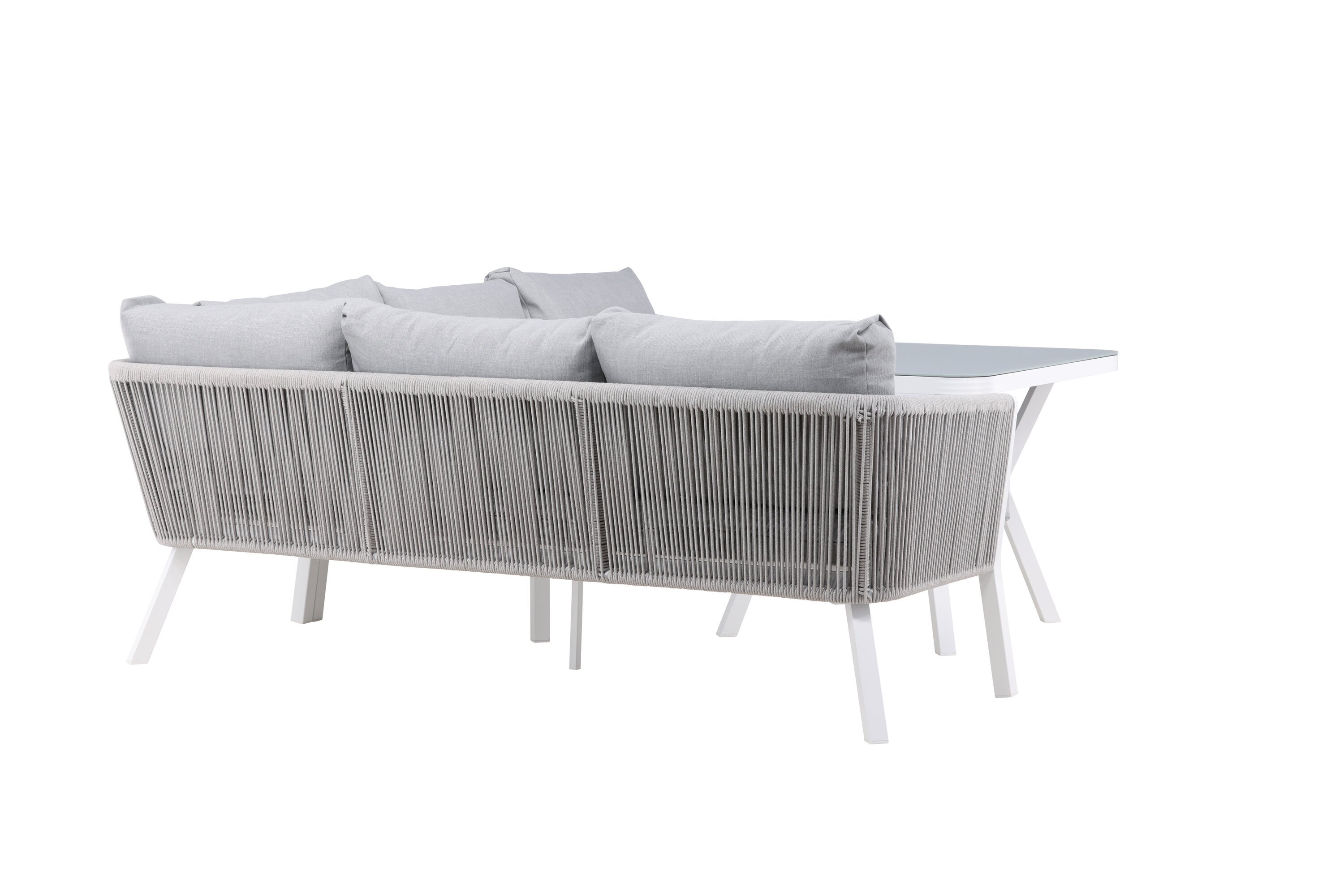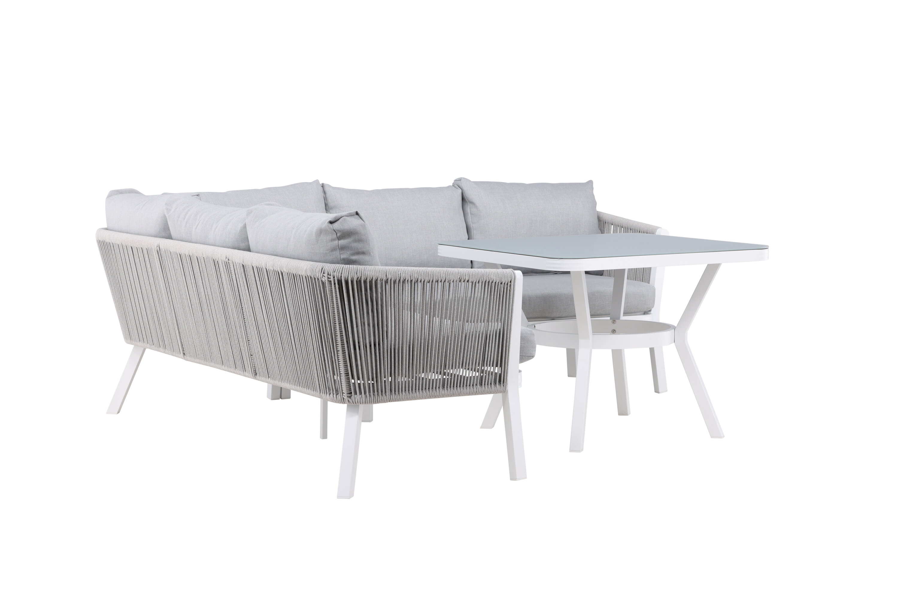 Virya sofa group is a nice and stylish group in white aluminum with associated tables that have a glass top plate. Durable cushions in gray are included and the group holds a total of 5 sitting guests. Table Dimensions: 90x90x67 cm. Sofa Dimensions: 206x220x71.5 cm. SITTING: 183.5x65x34 cm. Easier mounting is required. Invite family and friends for comfortable and pleasant moments this summer! Care advice: Outdoor furniture in aluminum and stainless steel should be cleaned regularly with water and mild soap. Always rinse thoroughly with plenty of water, which becomes extra important if the furniture is placed at a sea -close distance where salt can be transported through the air.