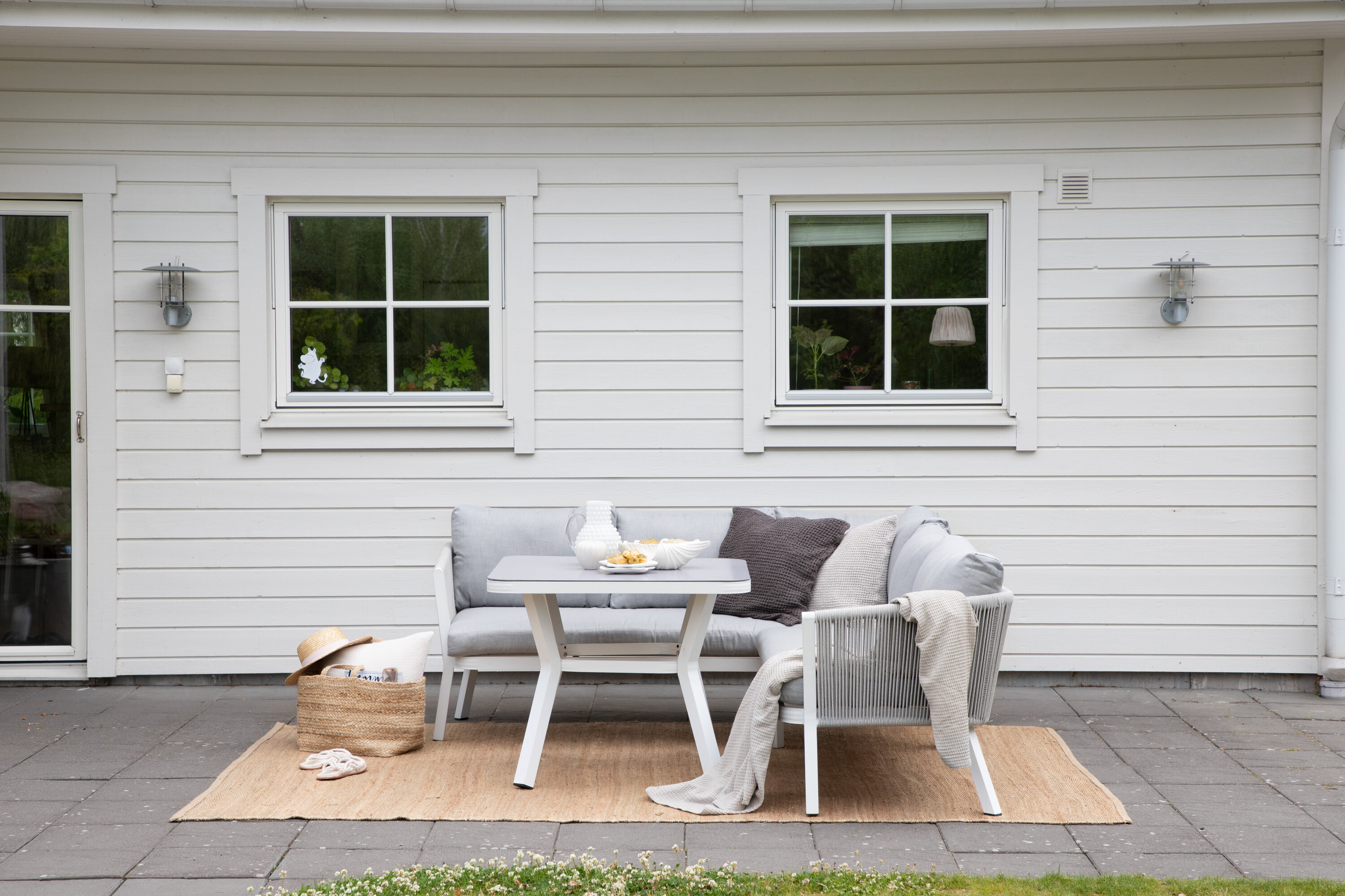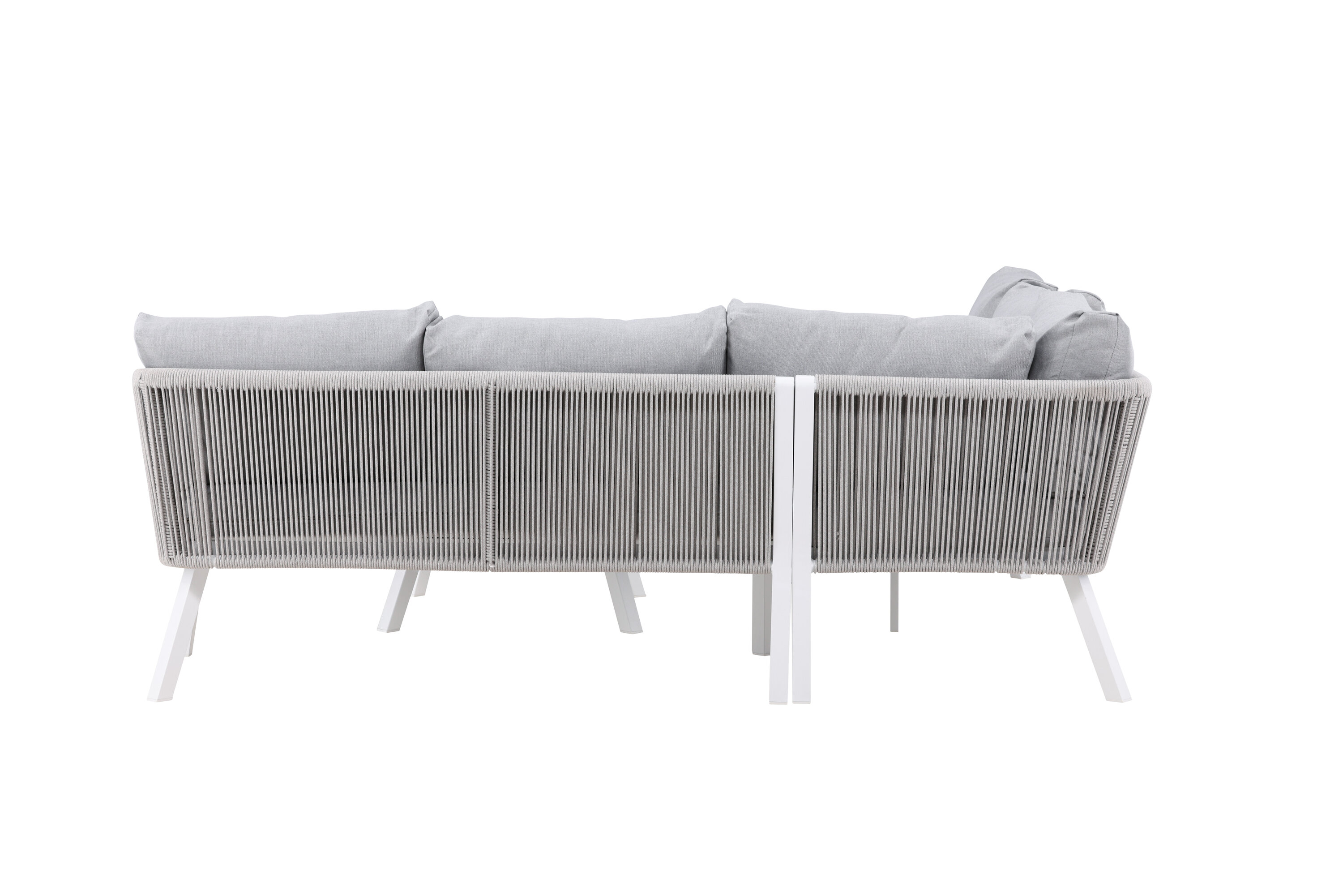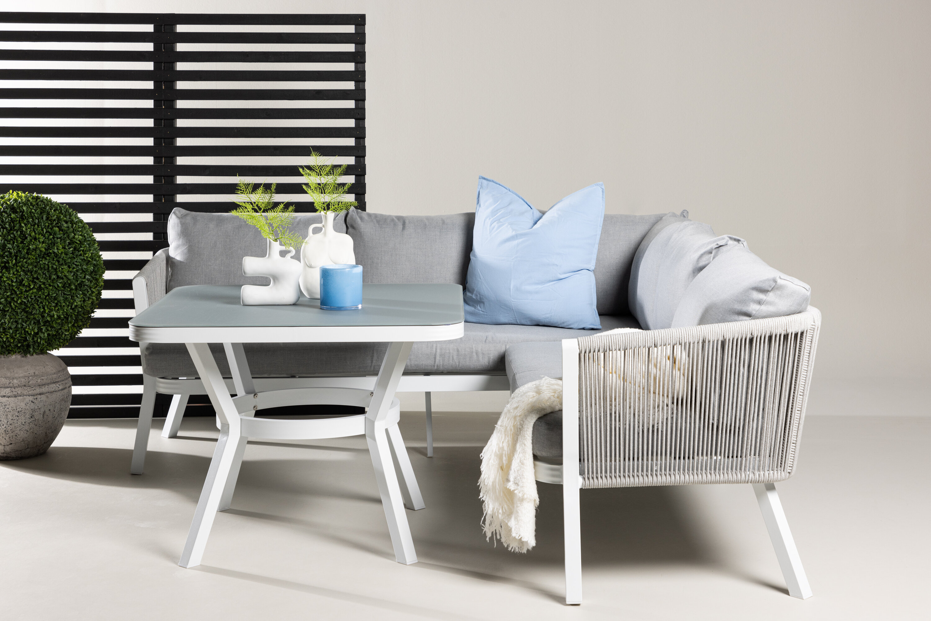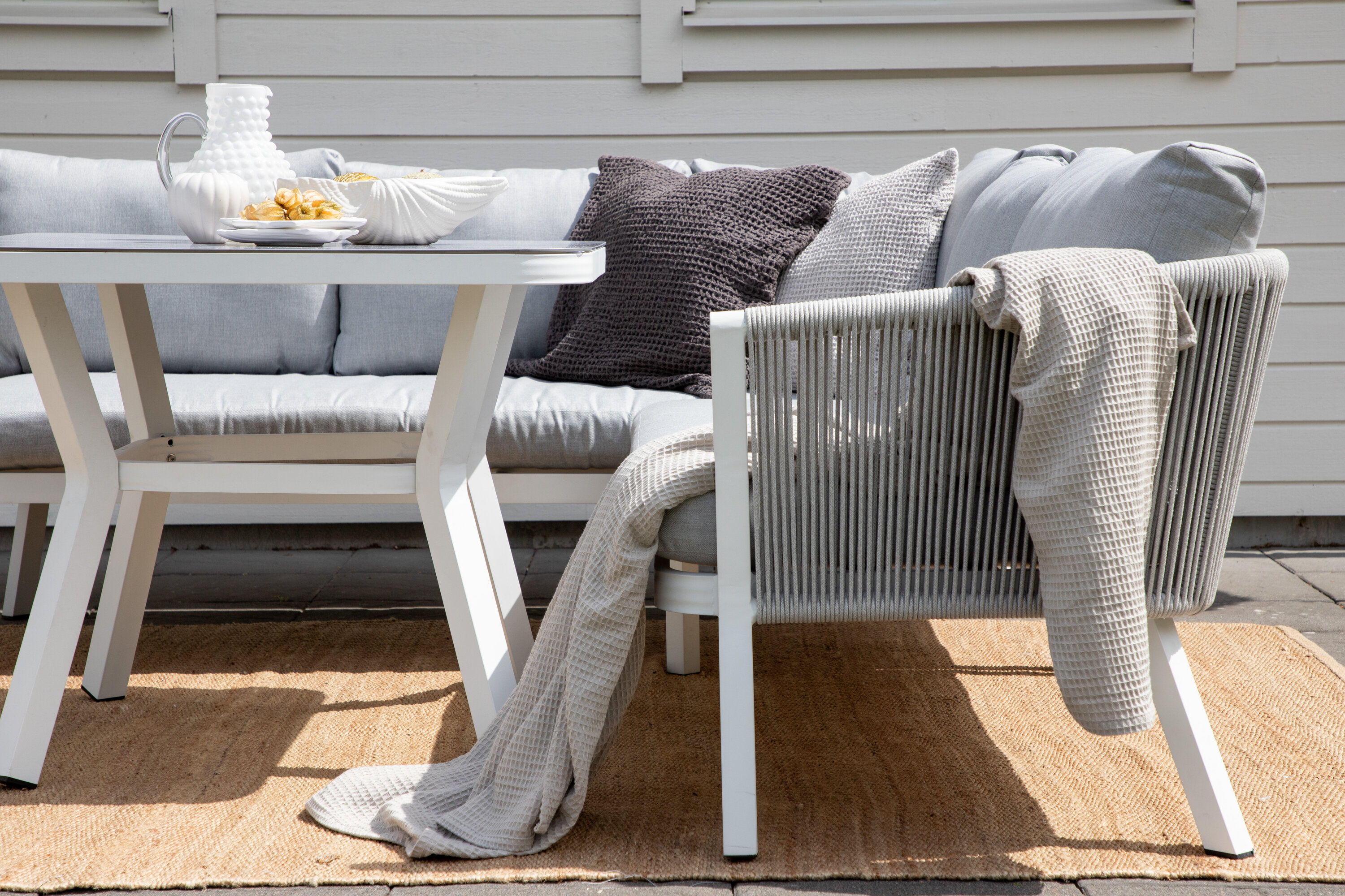 Virya sofa group is a nice and stylish group in white aluminum with associated tables that have a glass top plate. Durable cushions in gray are included and the group holds a total of 5 sitting guests. Table Dimensions: 90x90x67 cm. Sofa Dimensions: 206x220x71.5 cm. SITTING: 183.5x65x34 cm. Easier mounting is required. Invite family and friends for comfortable and pleasant moments this summer! Care advice: Outdoor furniture in aluminum and stainless steel should be cleaned regularly with water and mild soap. Always rinse thoroughly with plenty of water, which becomes extra important if the furniture is placed at a sea -close distance where salt can be transported through the air.