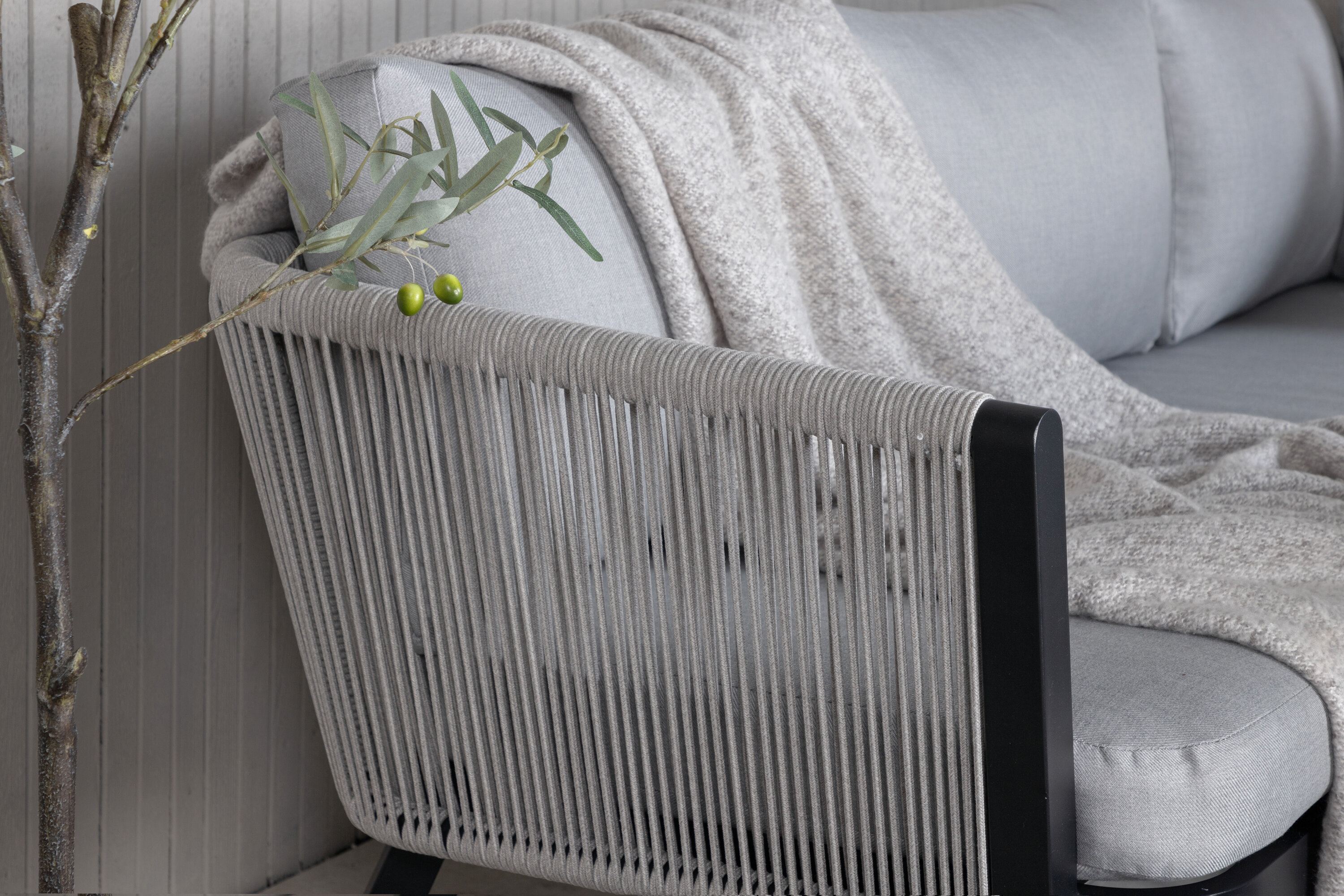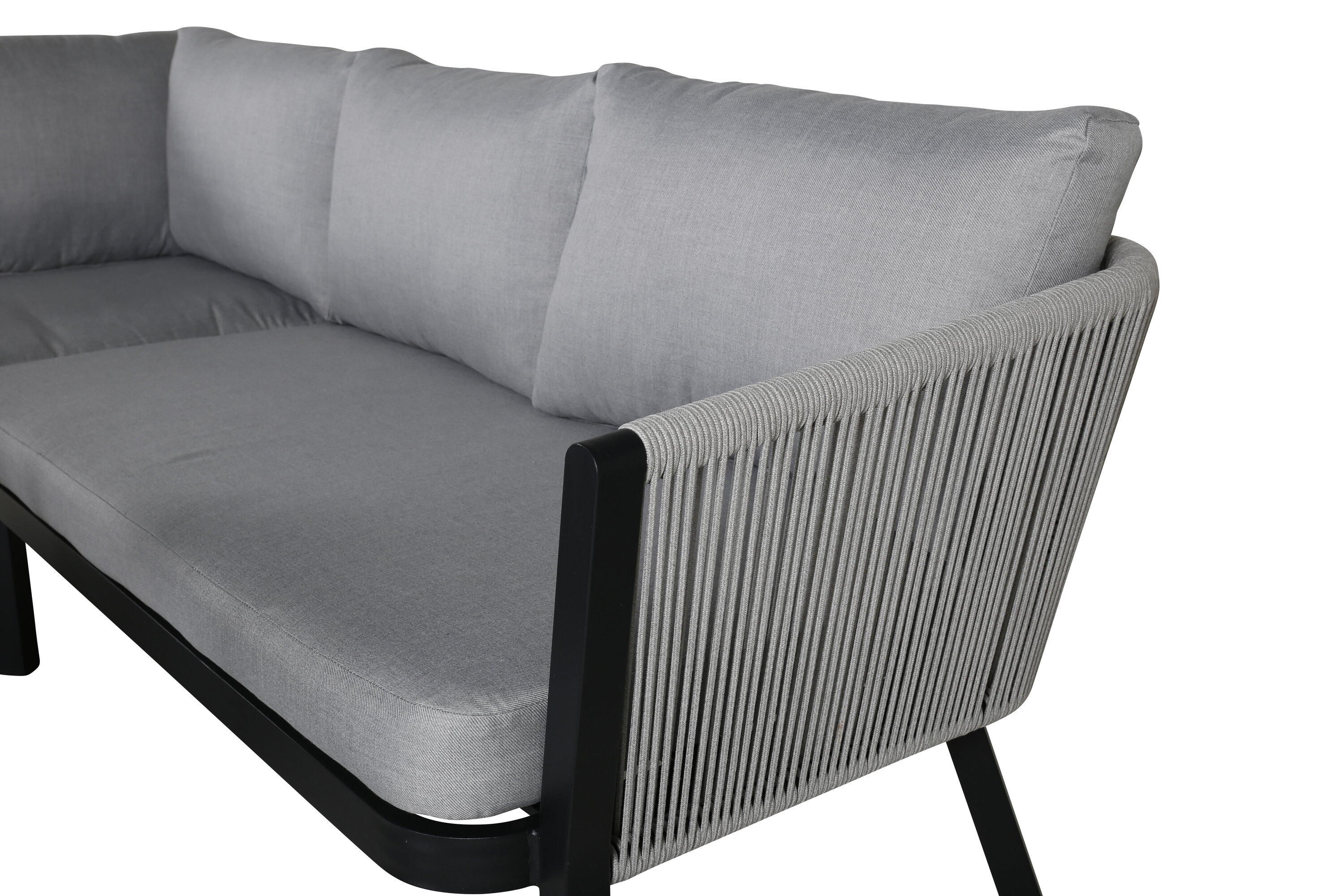 Virya is a modern sofa group, with a focus on comfort and design that is guaranteed to make a success on the patio this summer! The furniture group consists of a corner sofa made of a durable design in black powder coated metal with a back designed in light gray rope, as well as a rectangular high coffee table with a table top in gray finish that matches the ropes and the shade of the cushions and creates an exclusive whole. Soft, light gray cushions are included for the sofa group! Care advice: Our ropes are quality -spun polyester rope that is easy to clean. The furniture is treated to pass 500-2000 hours. We recommend soap and water for cleaning. Allow to air dry. For the areas that are more difficult to access, a small brush can be used carefully. Never use high pressure washer or strong chemicals to clean the rope. & nbsp;