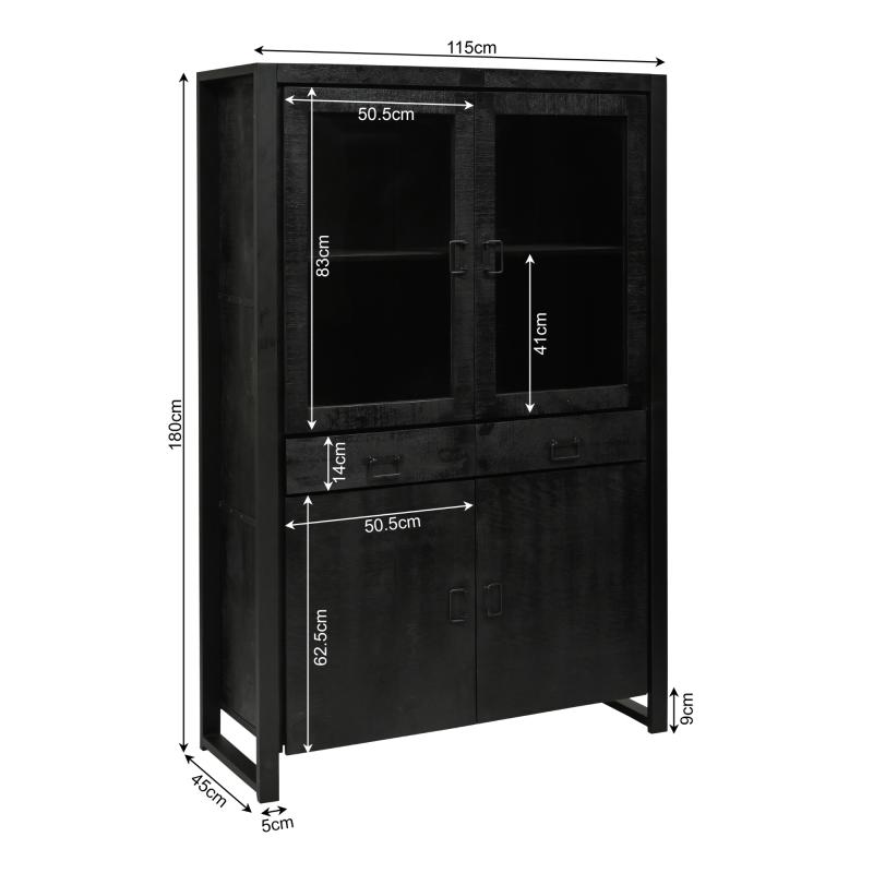 Vitrinekast Boaz Zwart is uitgevoerd in het mangohout. Het metalen frame en de metalen handgrepen zijn afgewerkt met een zwarte lak. Dit model is voorzien van twee lades en vier deuren. Achter de zittende deuren handige legplanken. De vitrinekast is ingelegd met verschillende stroken zwart gelakt hout, waar het meubel zijn moderne karakter heeft om te danken.