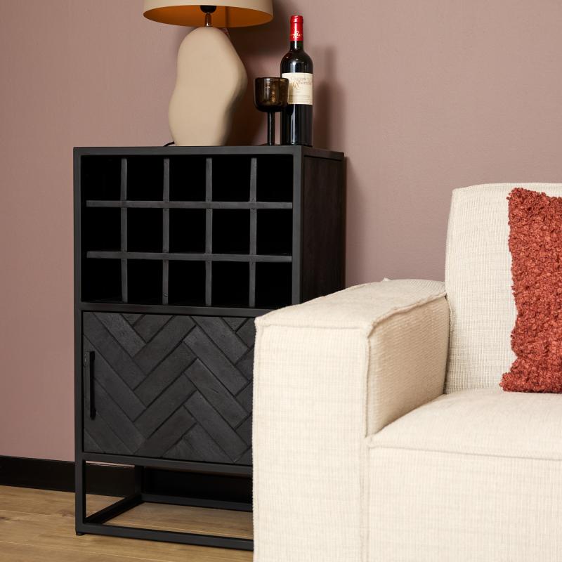 Wijnkast 'New York' is gemaakt van mangohout. De kast is uitgevoerd in gezandstraald mangoehout en behandeld met een zwarte lak. Het metalen frame en de metalen handgrepen zijn afgewerkt met een zwarte lak. Dit model is voorzien van één deur en een 15 vakken voor wijnflessen. De deur is voorzien van een ingelegd visgraatpatroon.